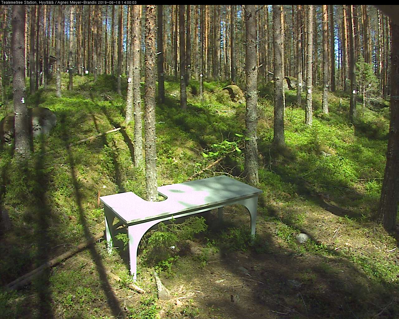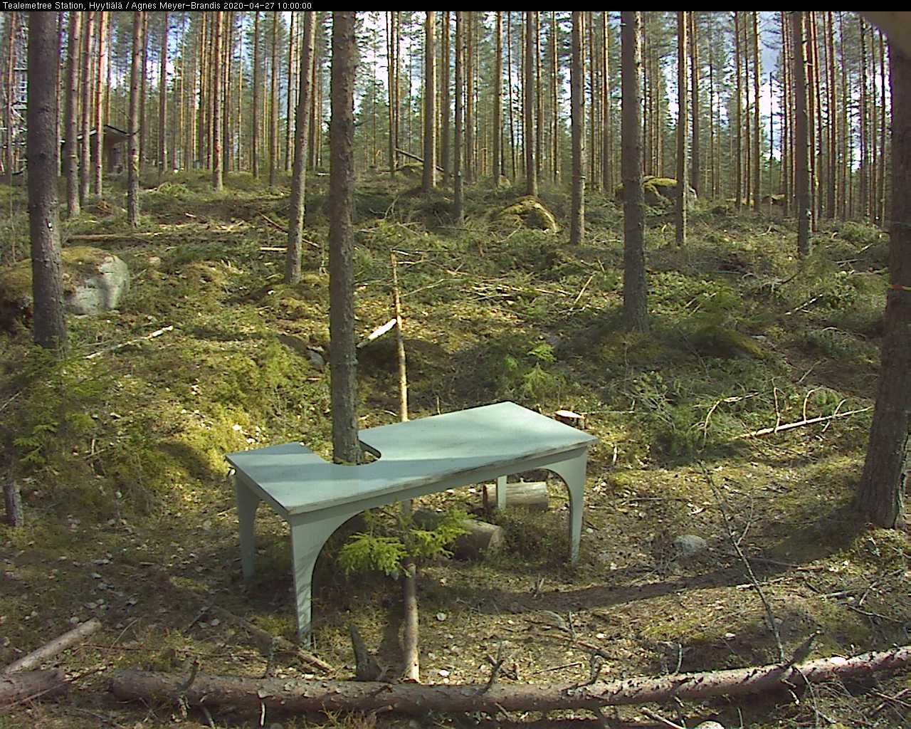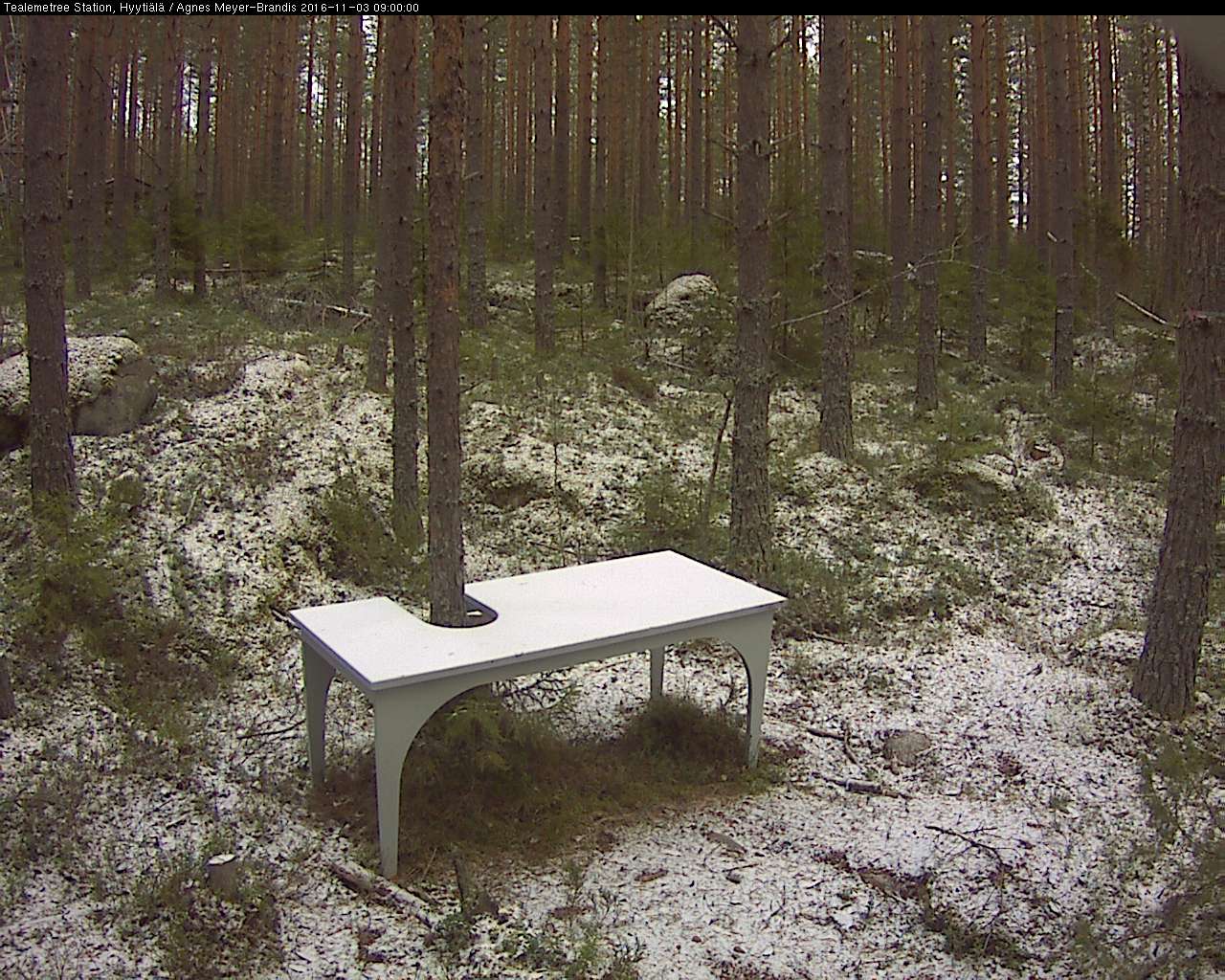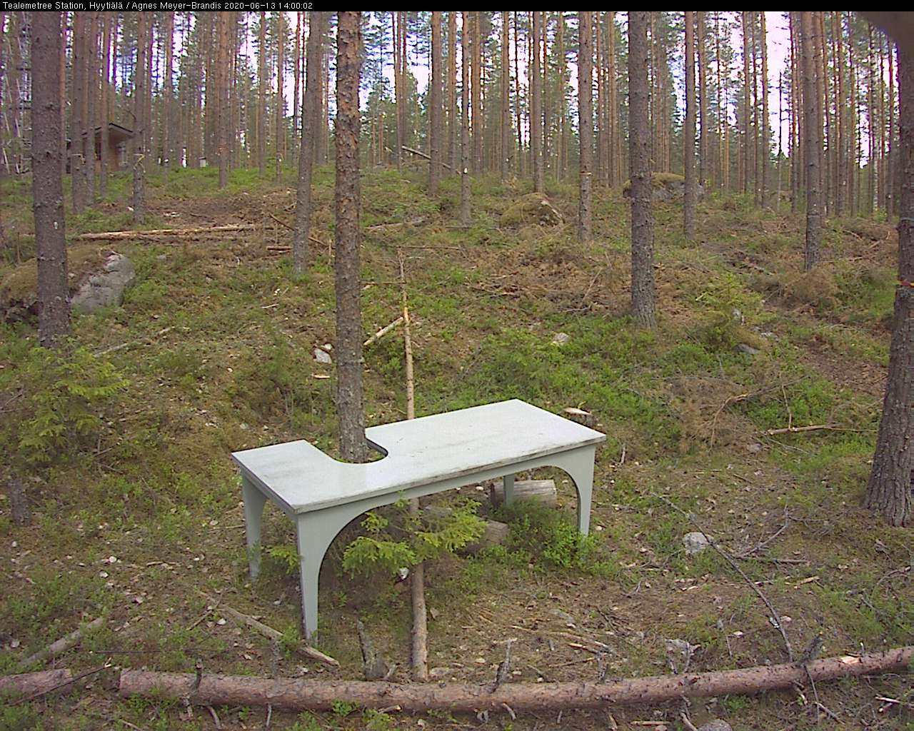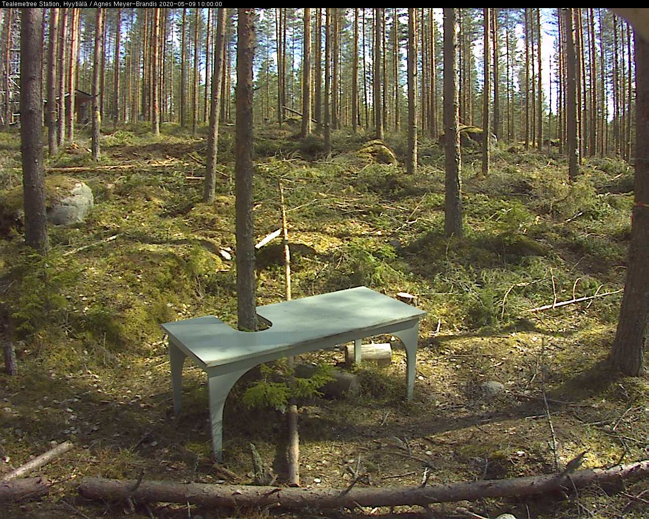 Agnes Meyer-Brandiksen työ Hyytiälässä alkoi tutustumalla aseman muihin tutkijoihin. Pystyäkseen tapaamaan ihmisiä metsässä, hän rakensi pöydän, josta muodostui kohtauspiste ja paikka teehetkille Agneksen ja puun kanssa.