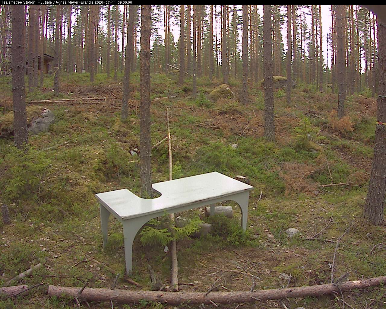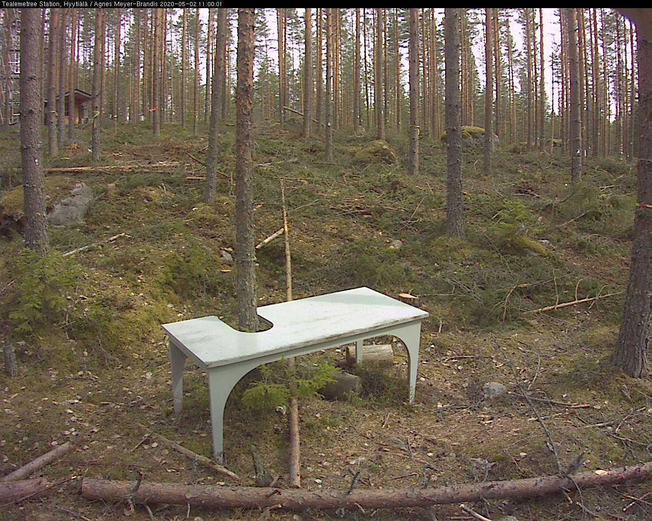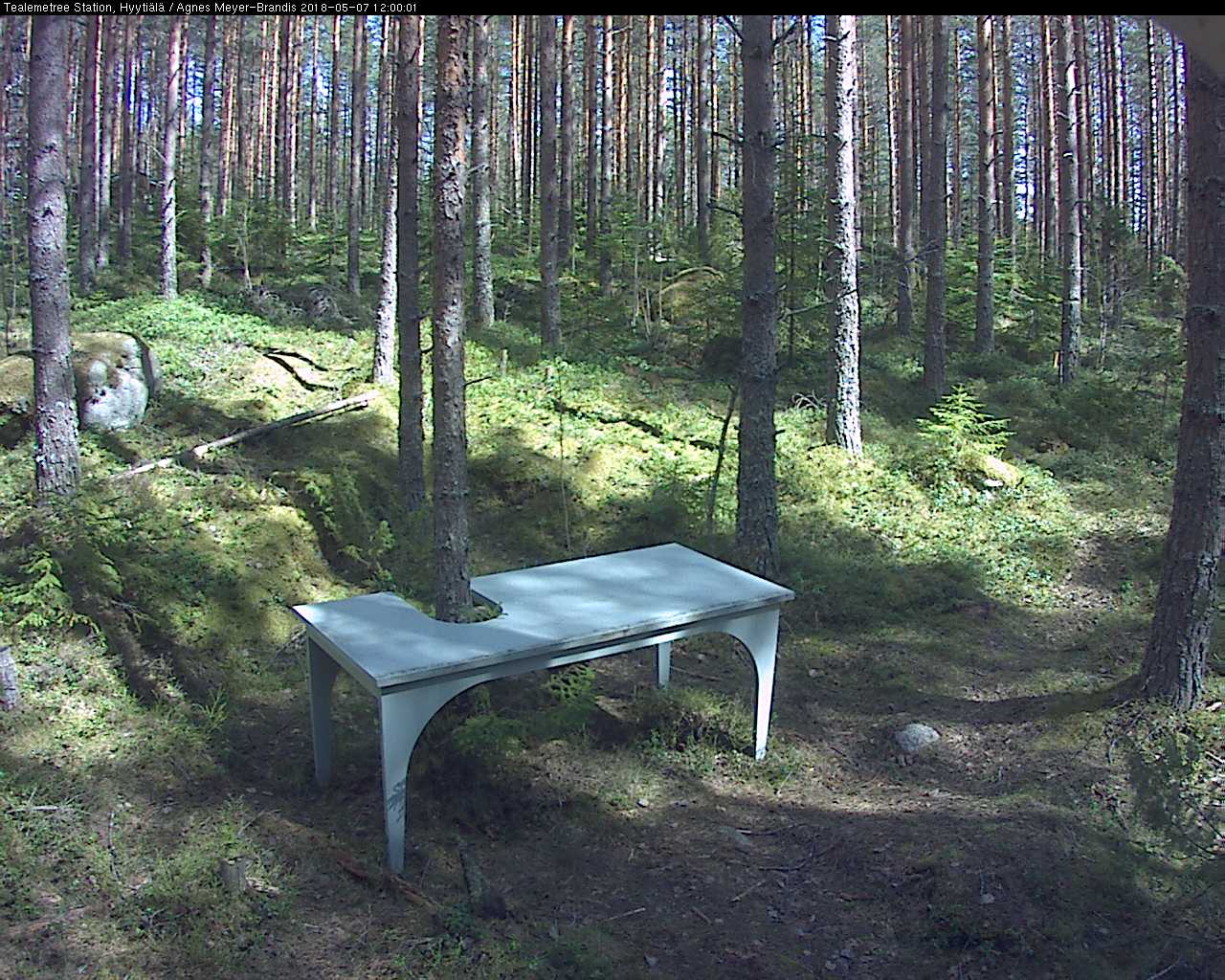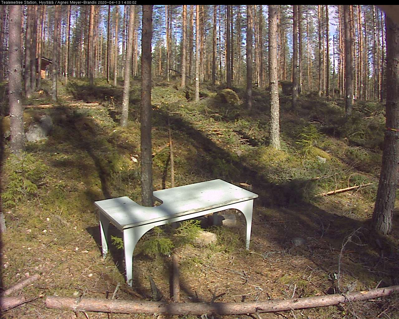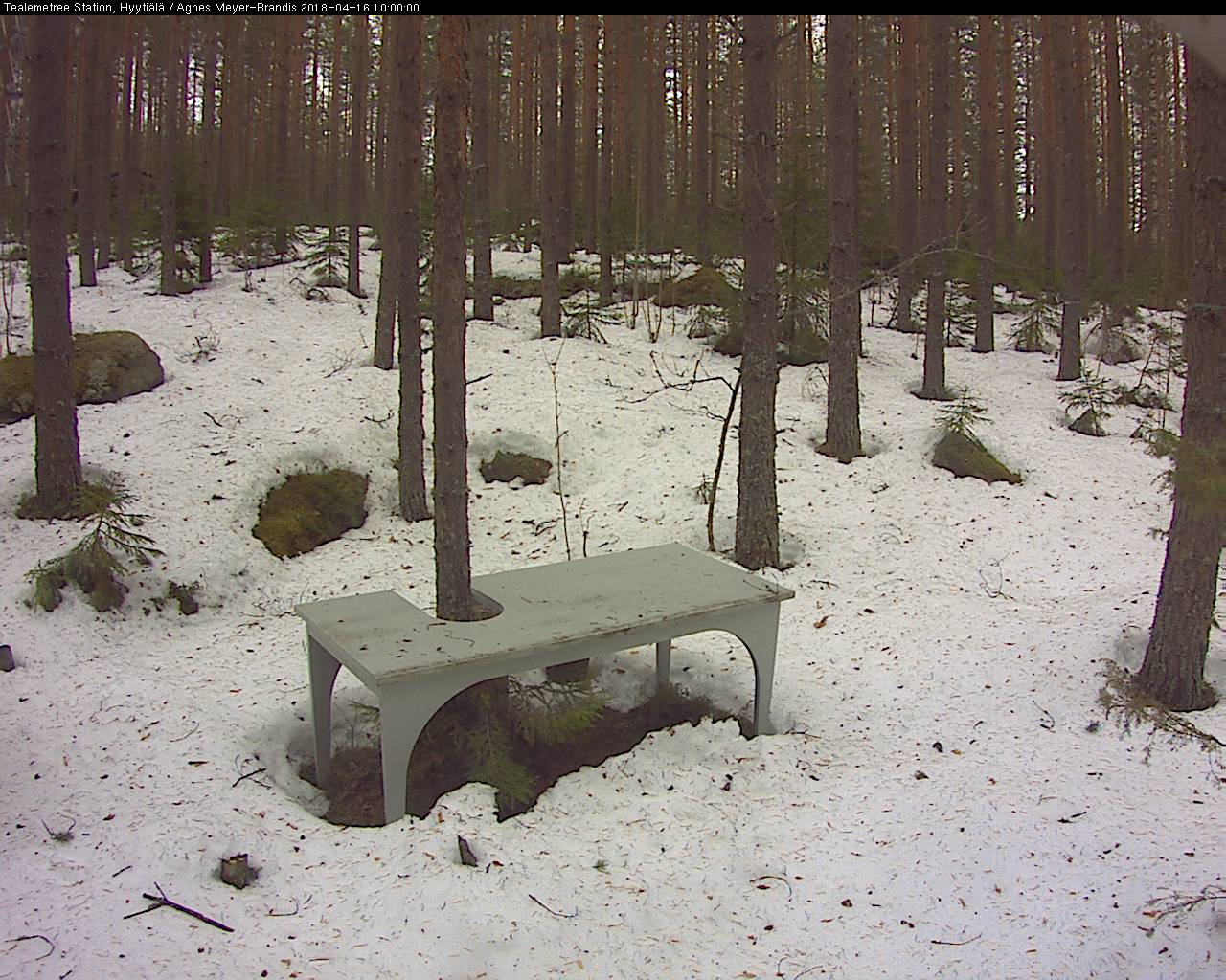 Agnes Meyer-Brandiksen työ Hyytiälässä alkoi tutustumalla aseman muihin tutkijoihin. Pystyäkseen tapaamaan ihmisiä metsässä, hän rakensi pöydän, josta muodostui kohtauspiste ja paikka teehetkille Agneksen ja puun kanssa.