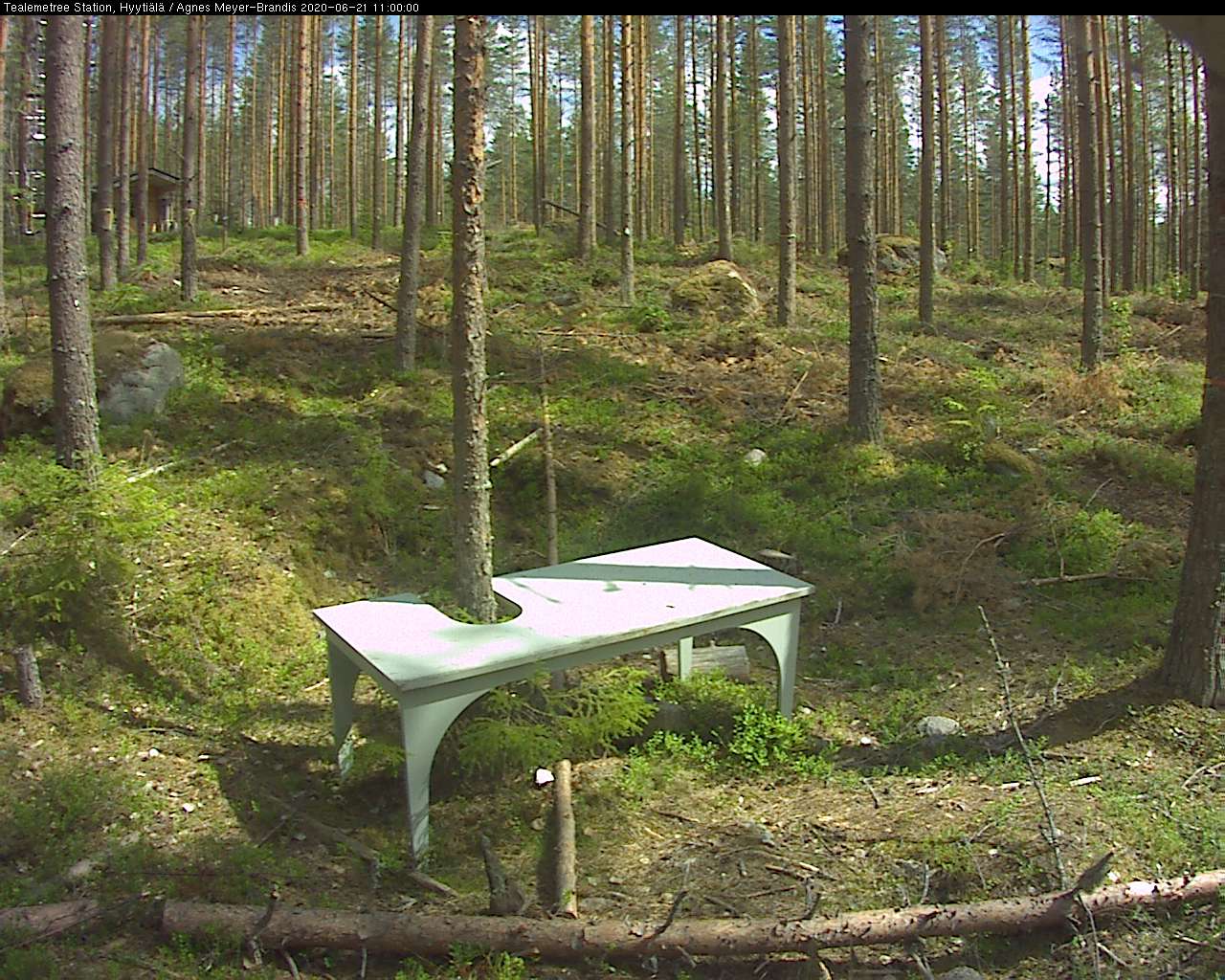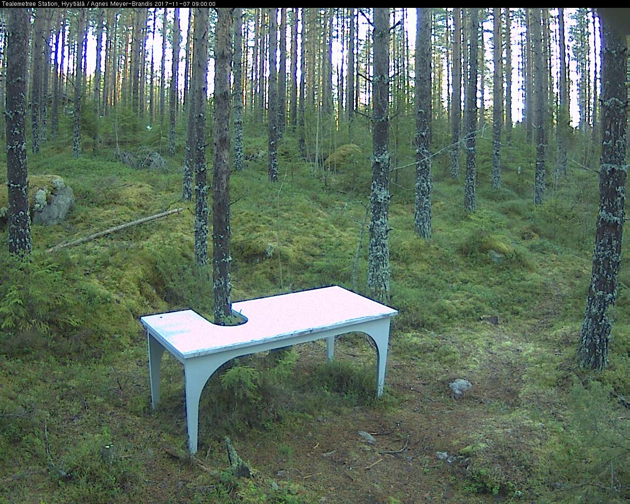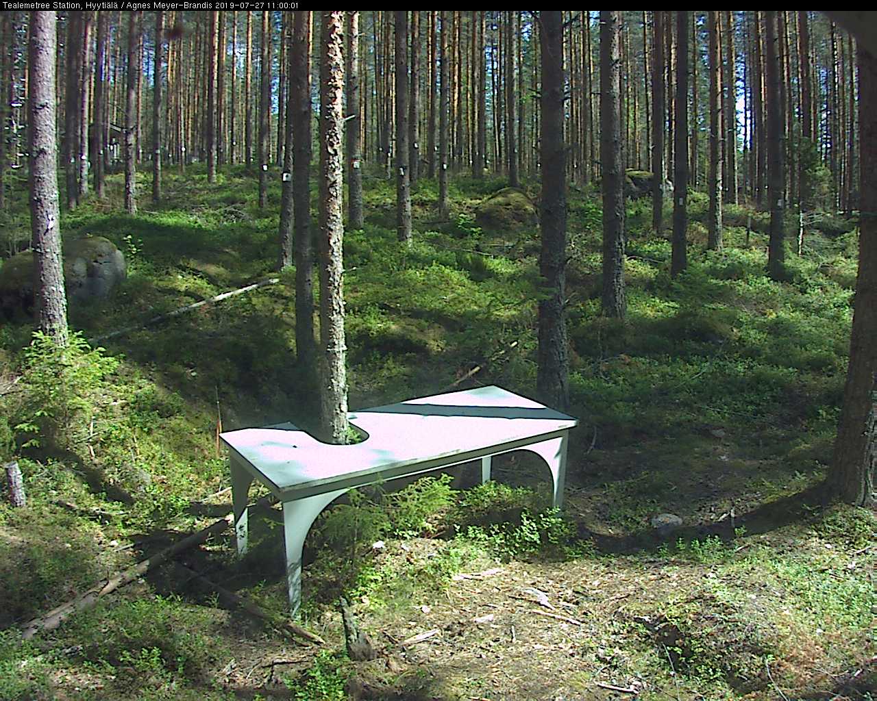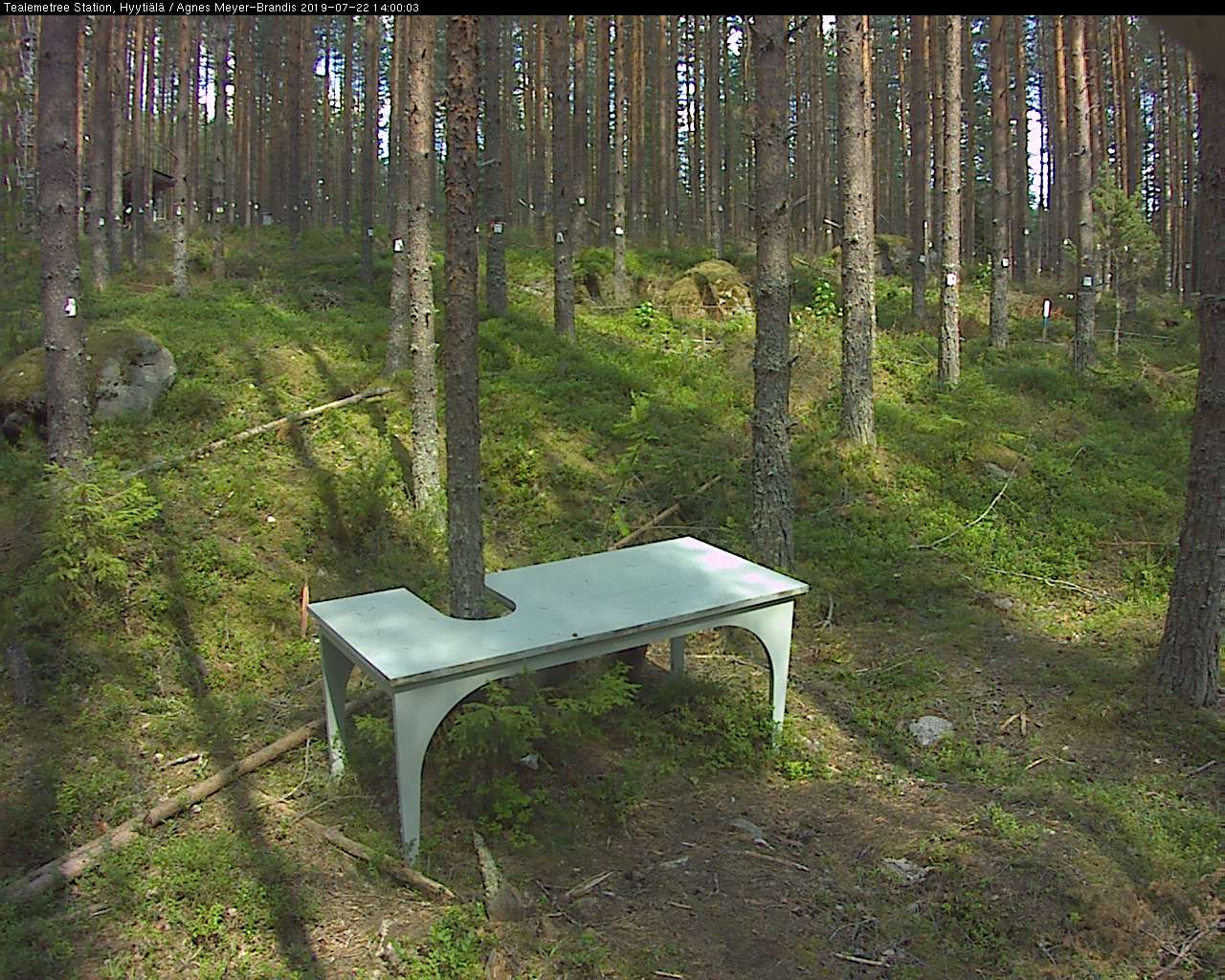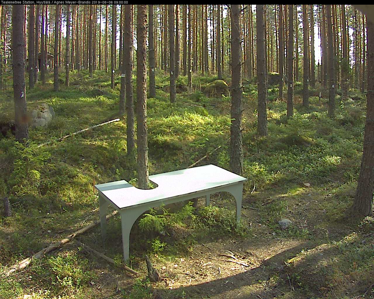 Agnes Meyer-Brandiksen työ Hyytiälässä alkoi tutustumalla aseman muihin tutkijoihin. Pystyäkseen tapaamaan ihmisiä metsässä, hän rakensi pöydän, josta muodostui kohtauspiste ja paikka teehetkille Agneksen ja puun kanssa.