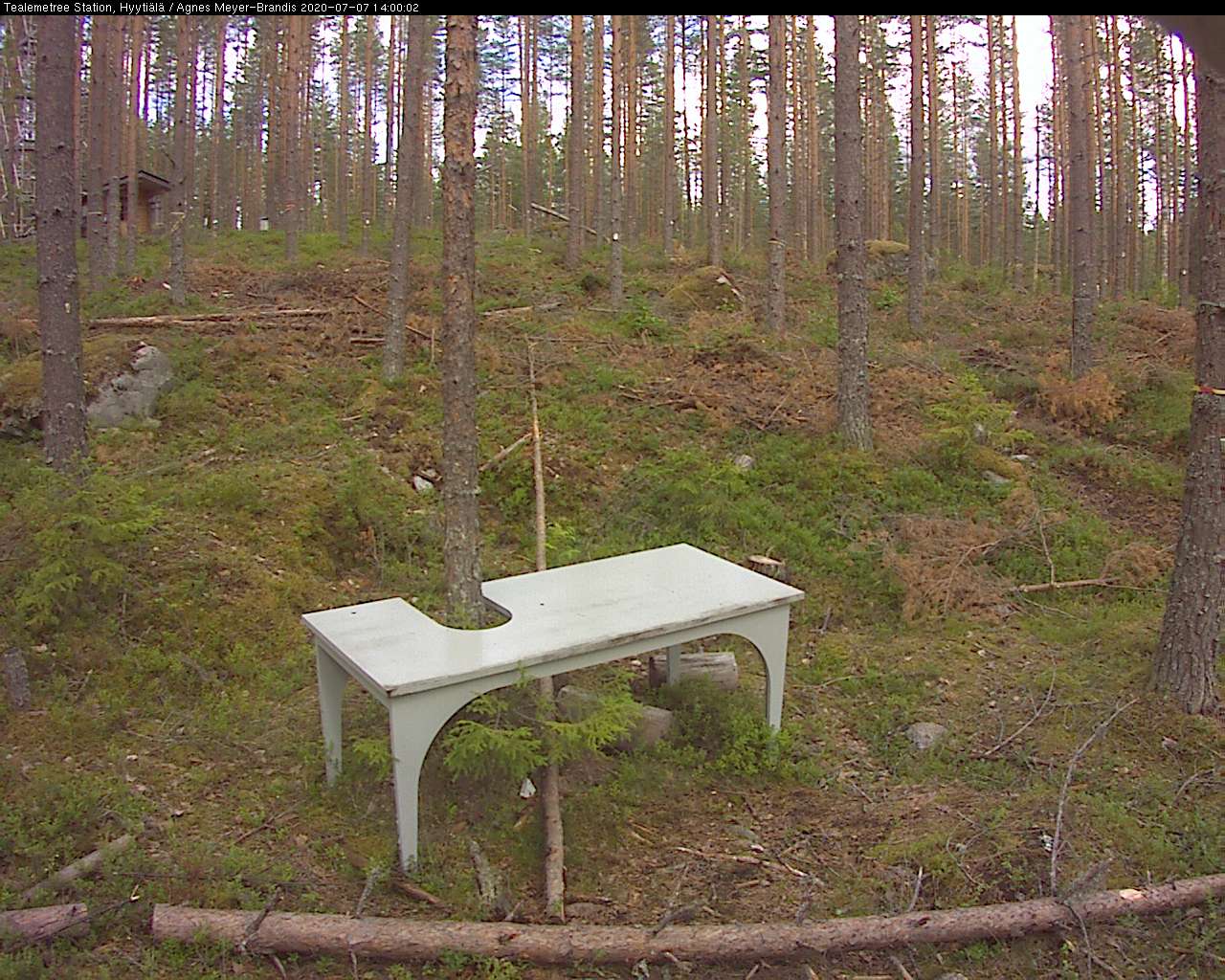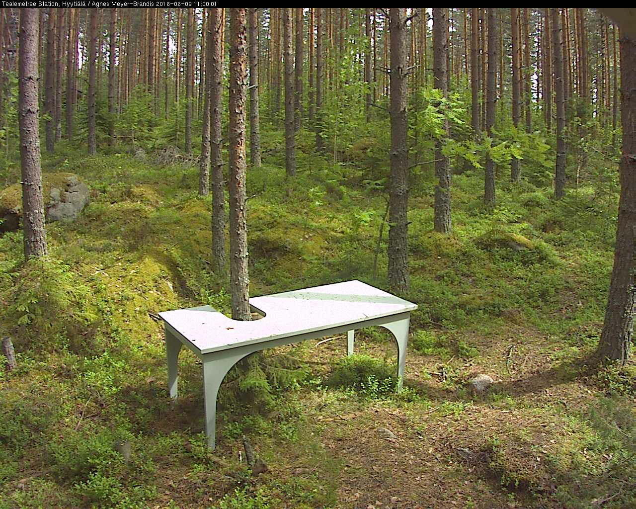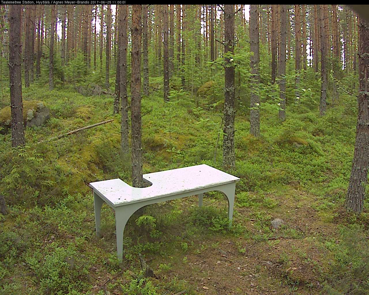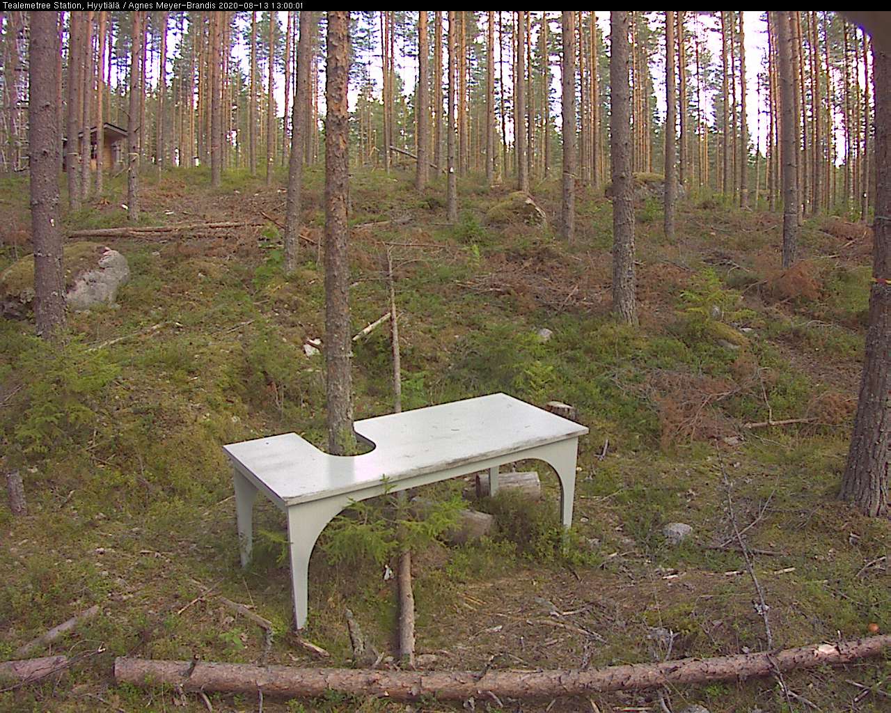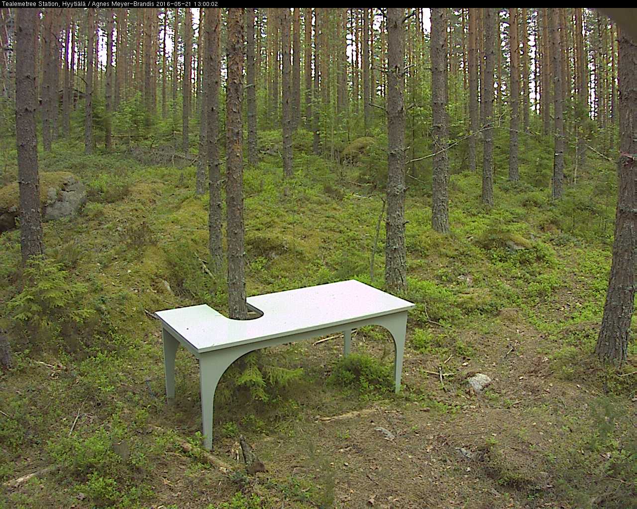 Agnes Meyer-Brandiksen työ Hyytiälässä alkoi tutustumalla aseman muihin tutkijoihin. Pystyäkseen tapaamaan ihmisiä metsässä, hän rakensi pöydän, josta muodostui kohtauspiste ja paikka teehetkille Agneksen ja puun kanssa.