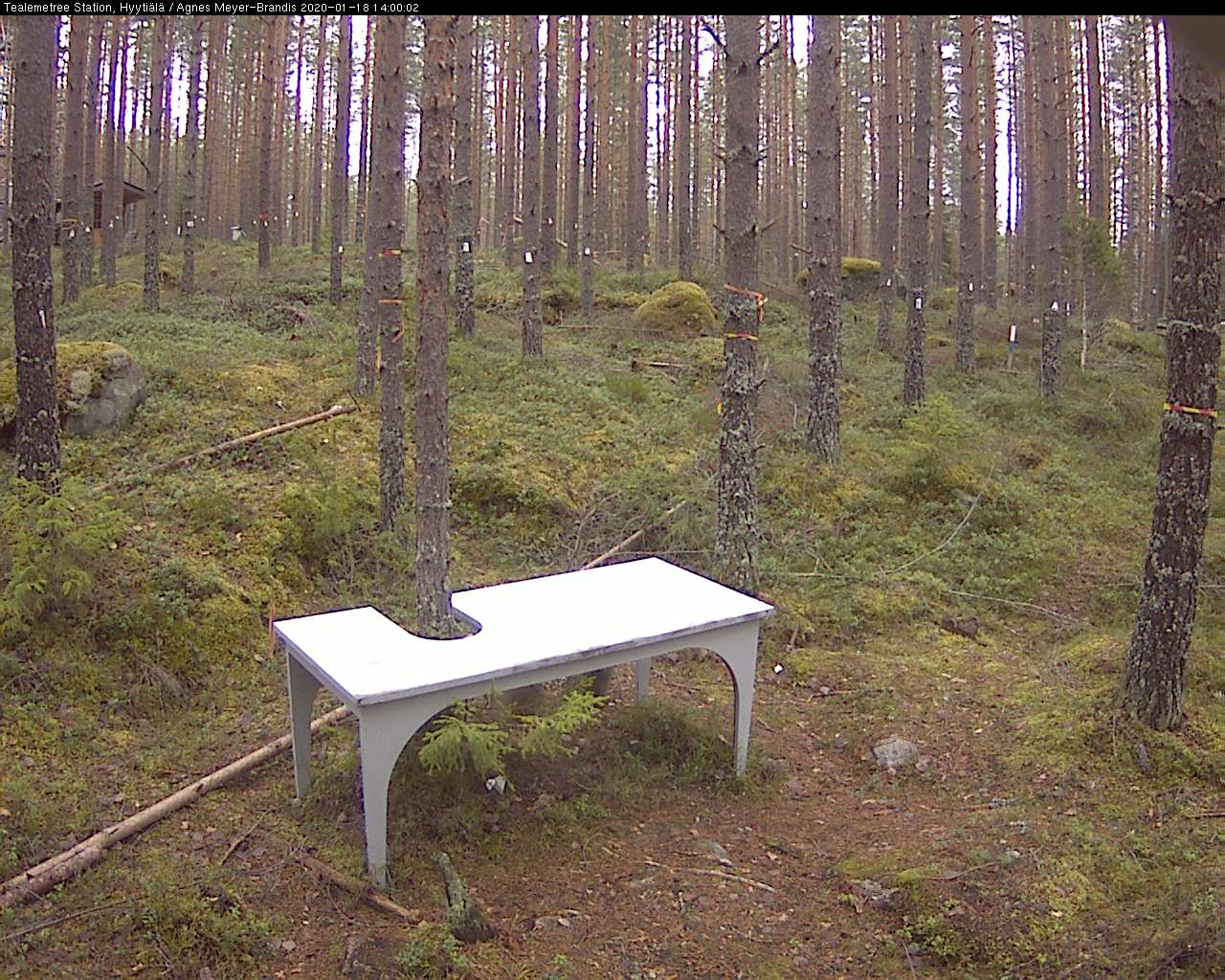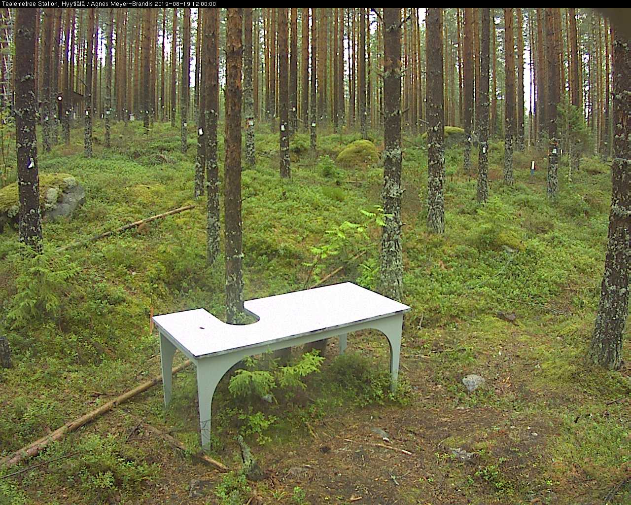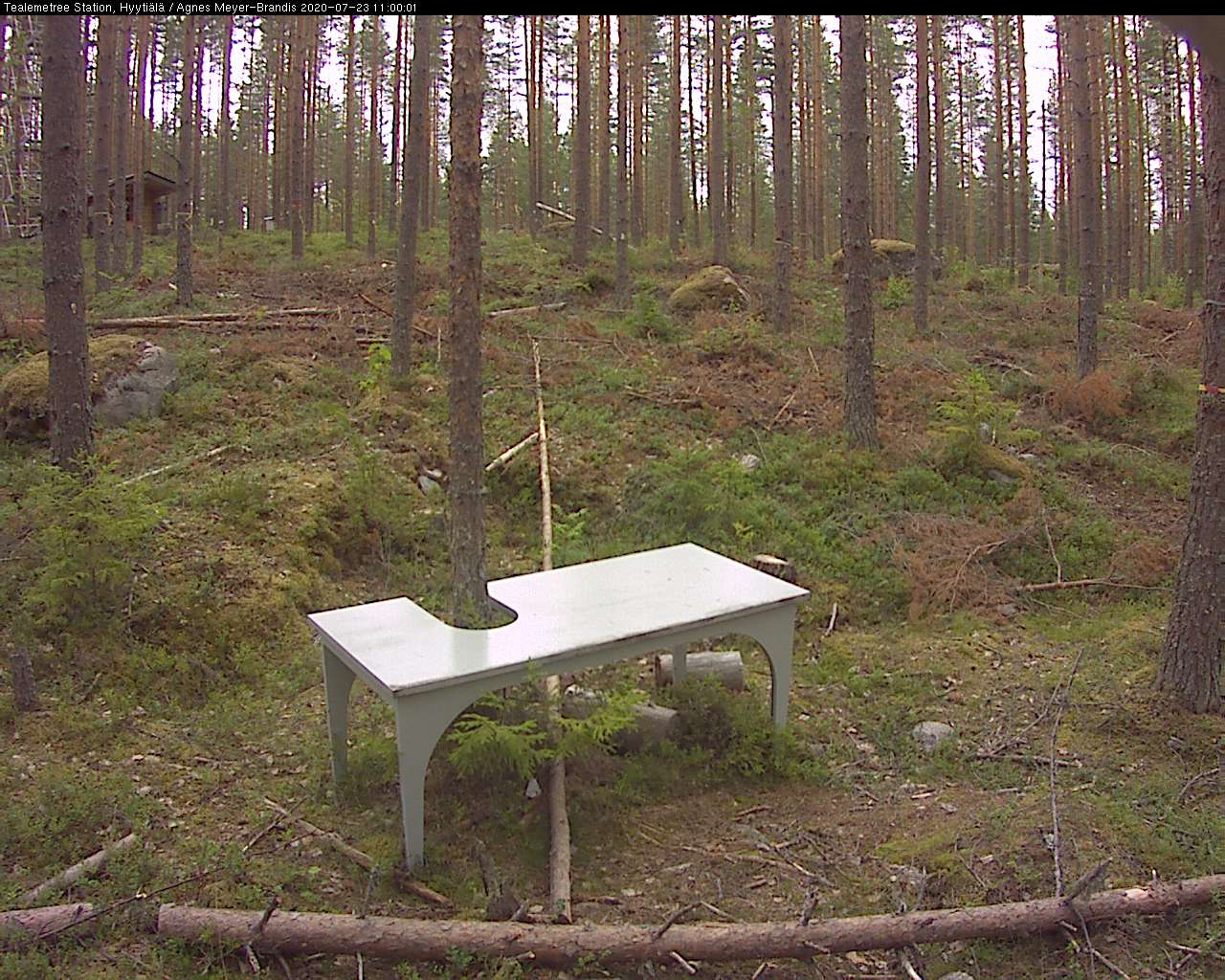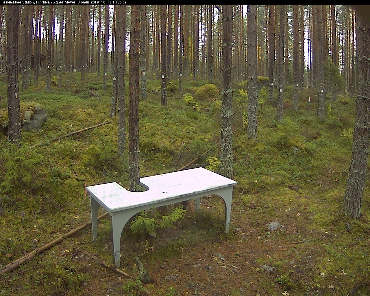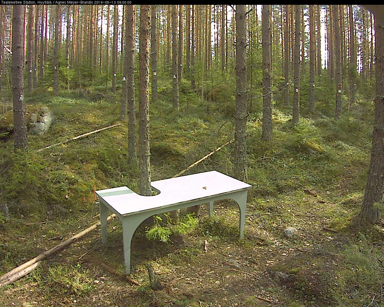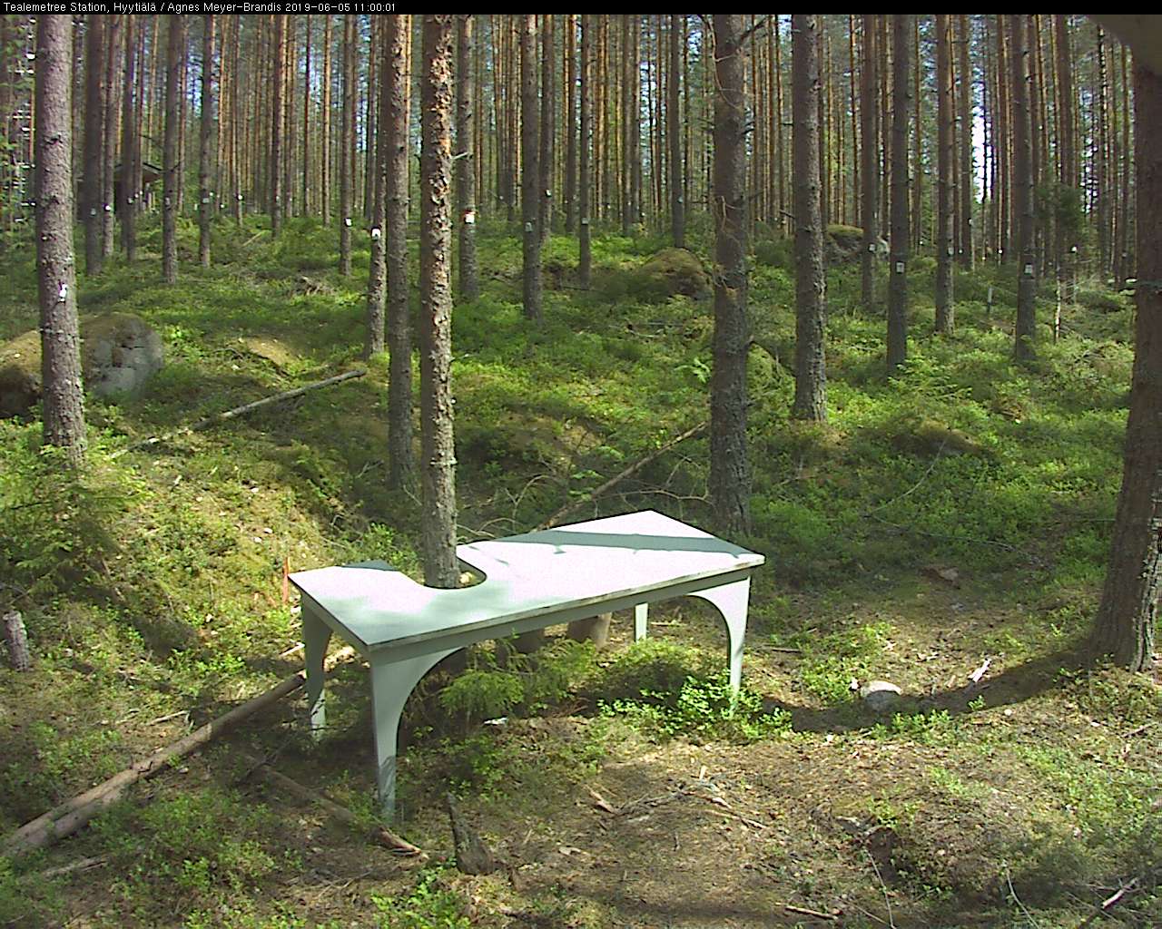 Agnes Meyer-Brandiksen työ Hyytiälässä alkoi tutustumalla aseman muihin tutkijoihin. Pystyäkseen tapaamaan ihmisiä metsässä, hän rakensi pöydän, josta muodostui kohtauspiste ja paikka teehetkille Agneksen ja puun kanssa.