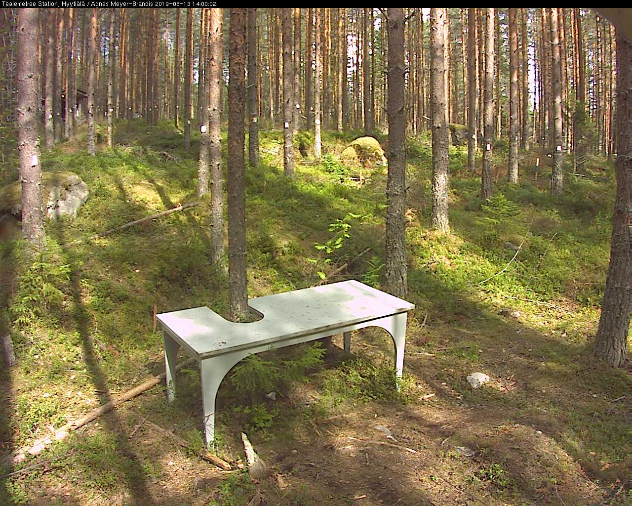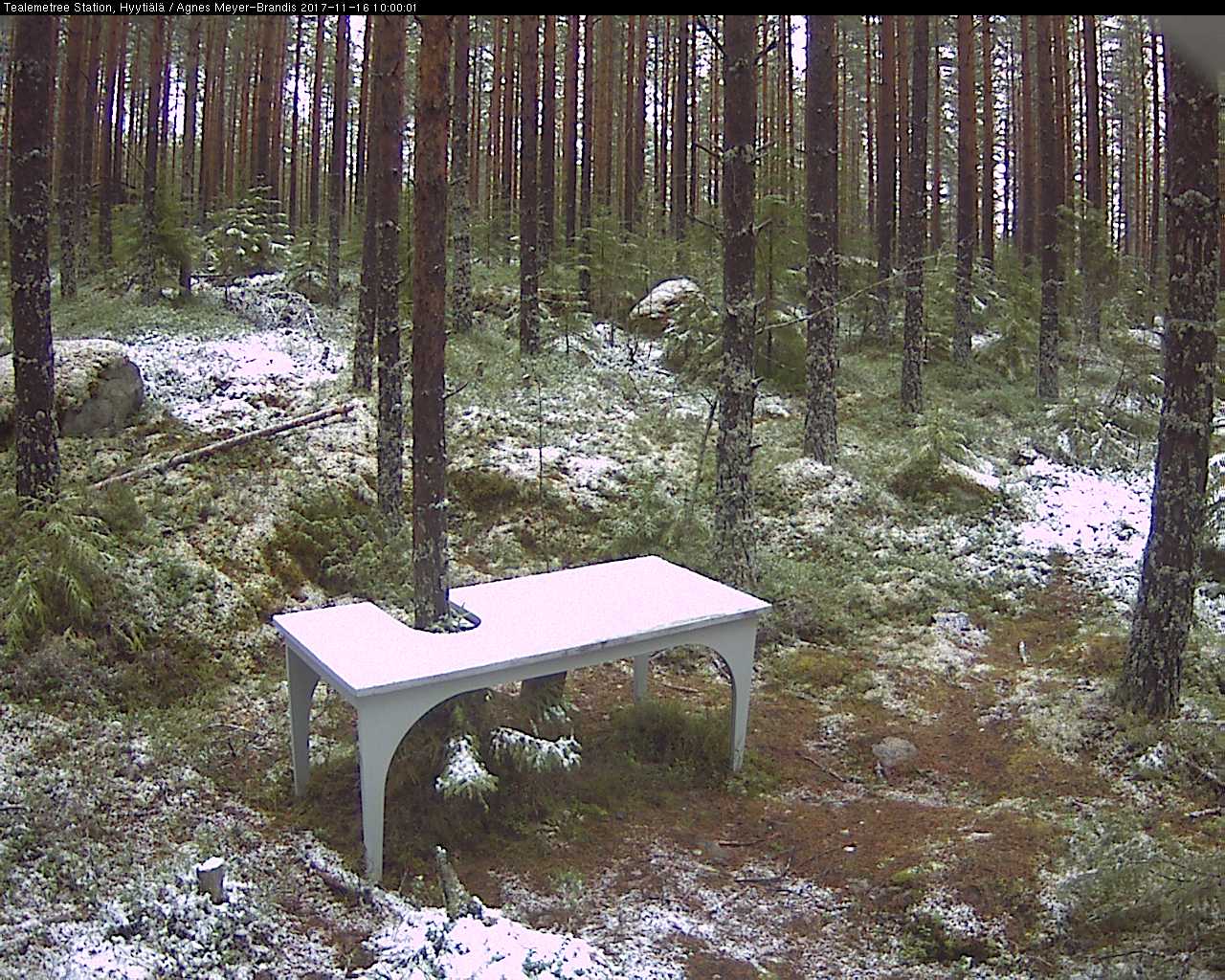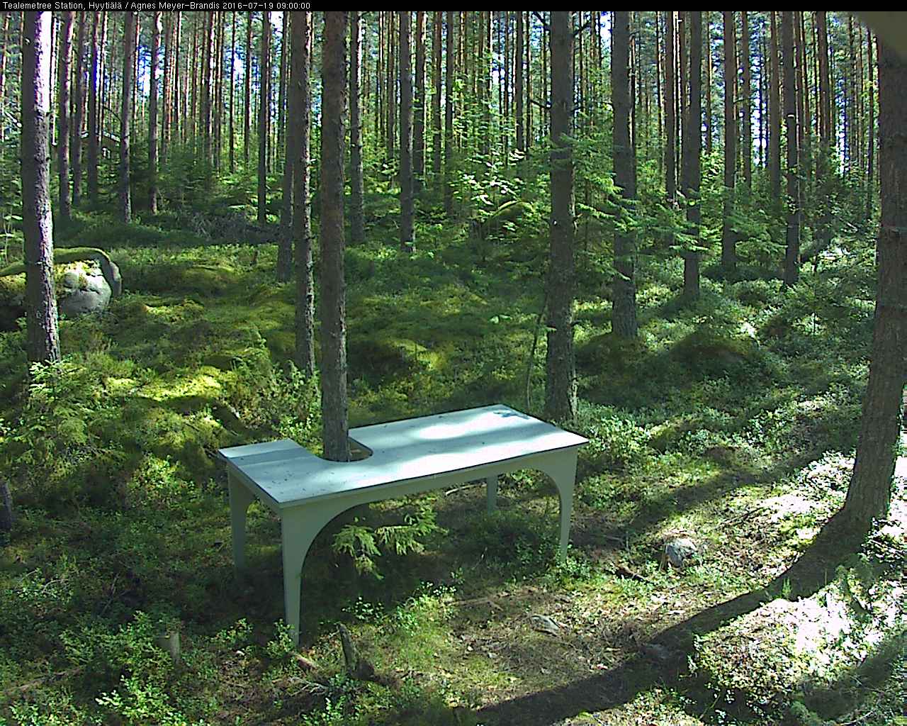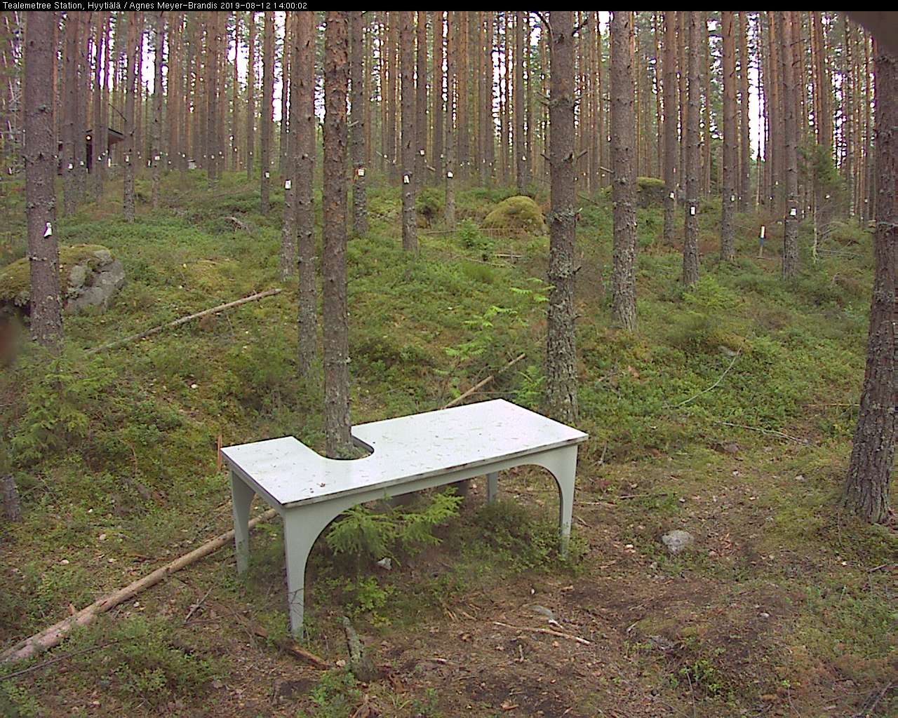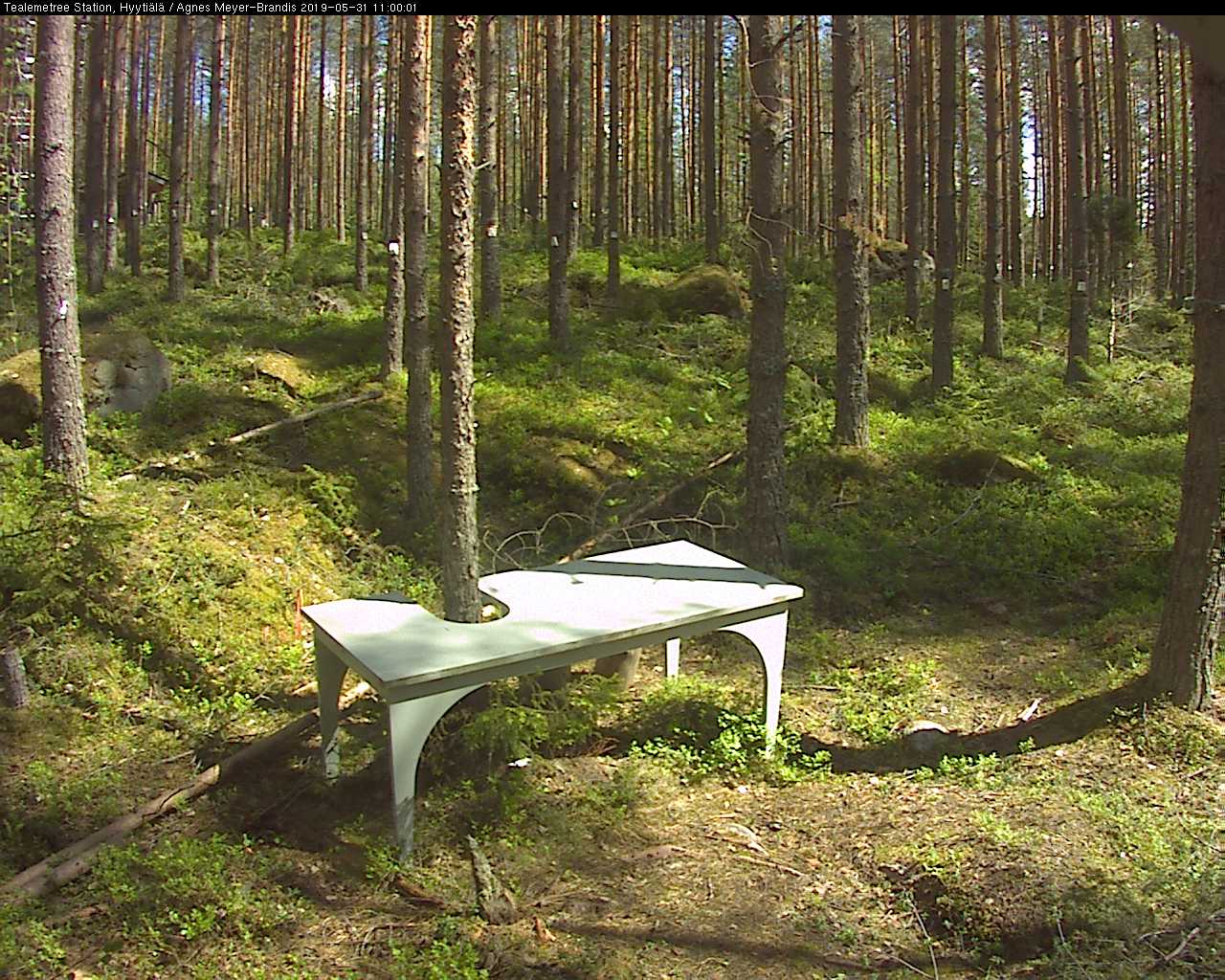 Agnes Meyer-Brandiksen työ Hyytiälässä alkoi tutustumalla aseman muihin tutkijoihin. Pystyäkseen tapaamaan ihmisiä metsässä, hän rakensi pöydän, josta muodostui kohtauspiste ja paikka teehetkille Agneksen ja puun kanssa.
