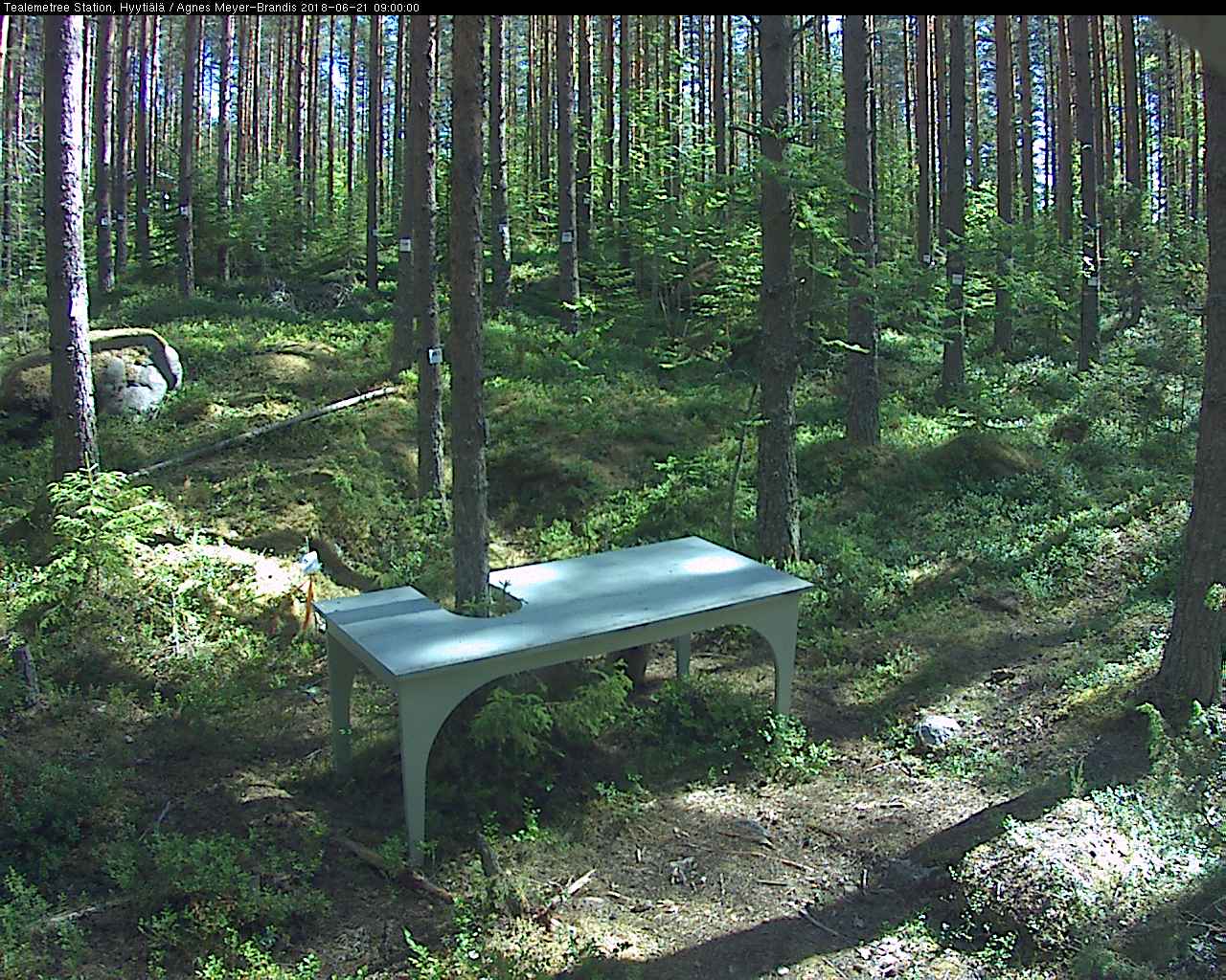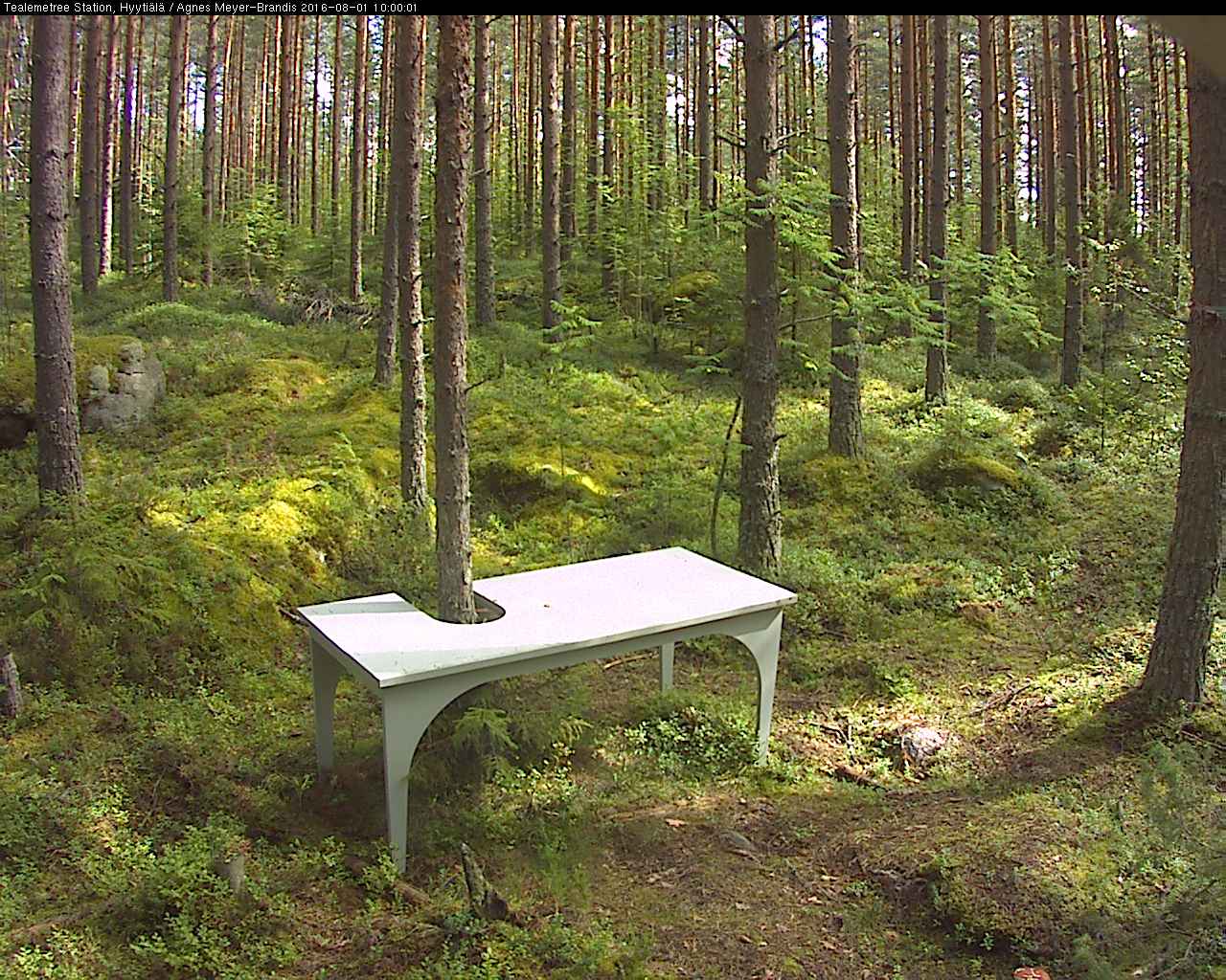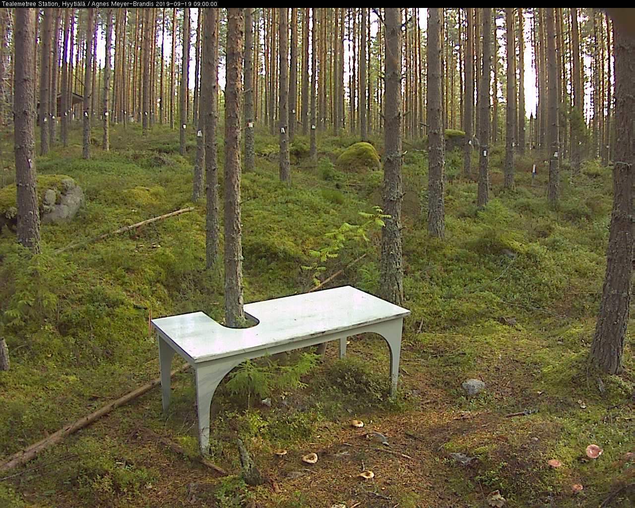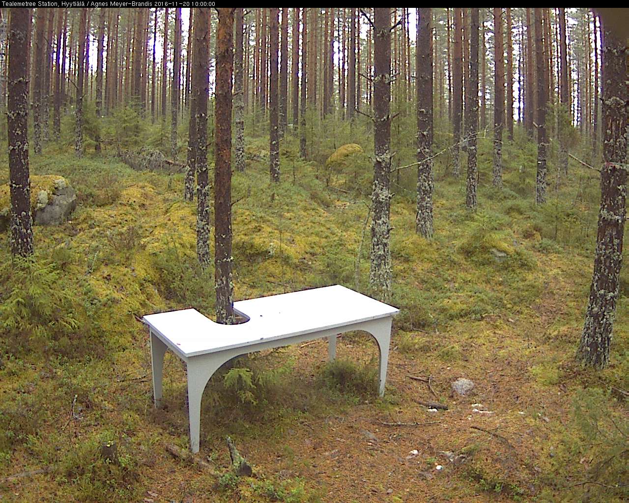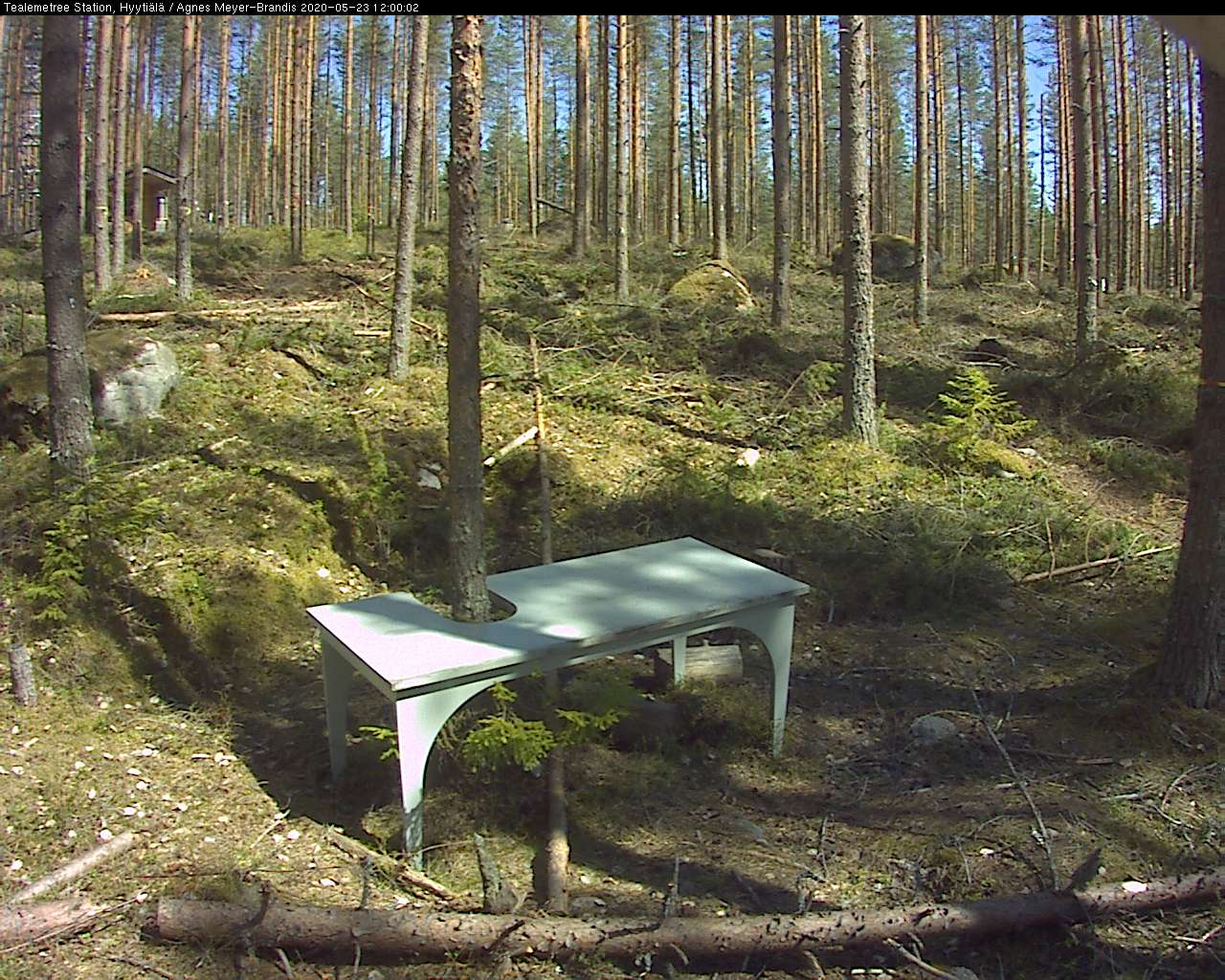 Agnes Meyer-Brandiksen työ Hyytiälässä alkoi tutustumalla aseman muihin tutkijoihin. Pystyäkseen tapaamaan ihmisiä metsässä, hän rakensi pöydän, josta muodostui kohtauspiste ja paikka teehetkille Agneksen ja puun kanssa.