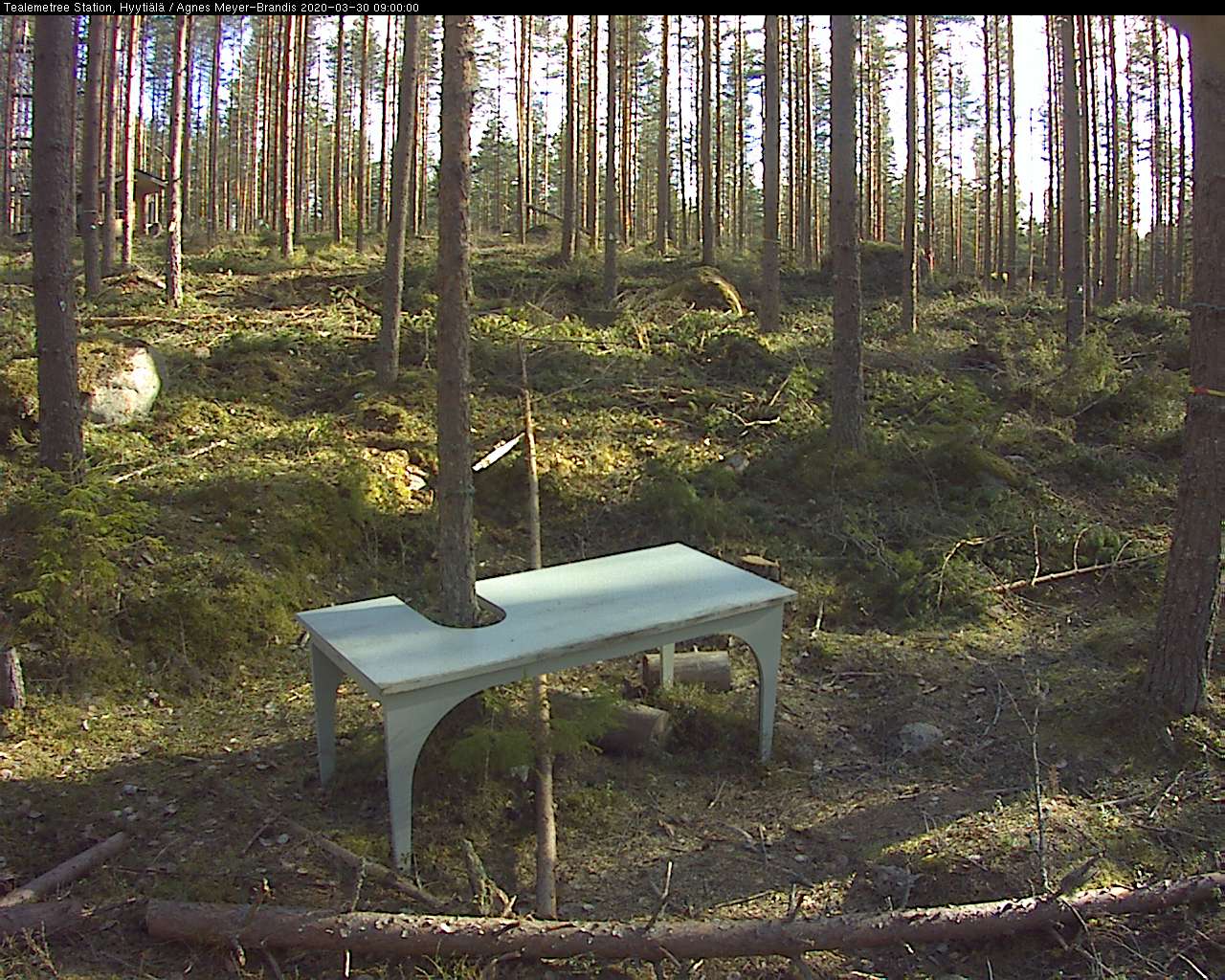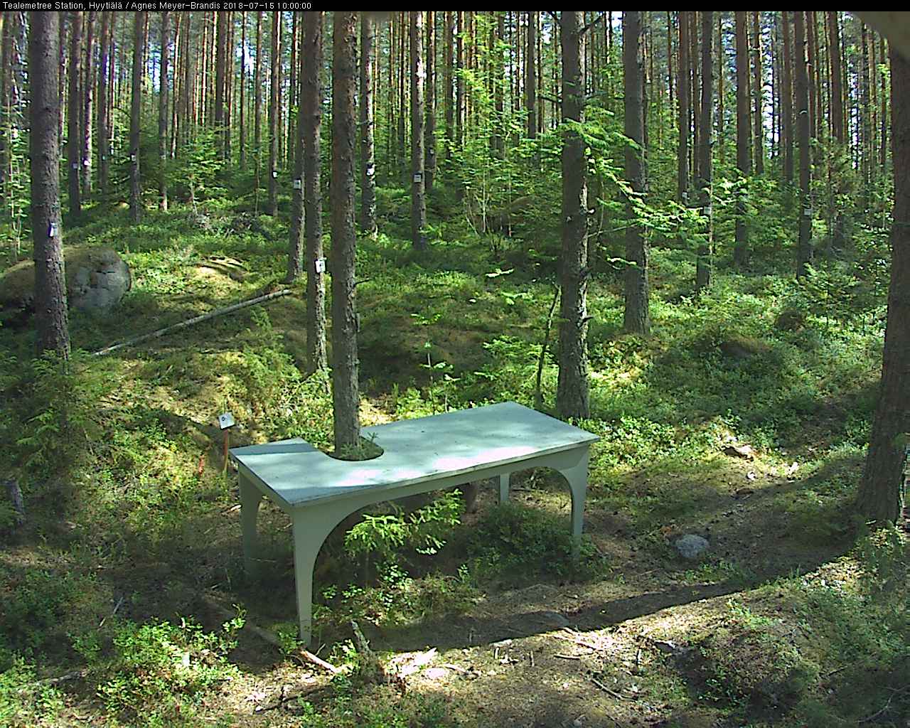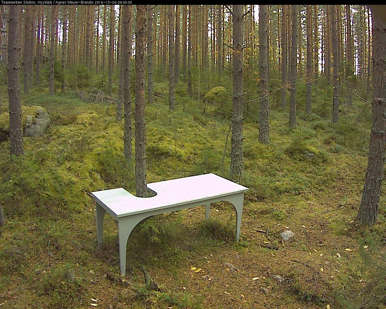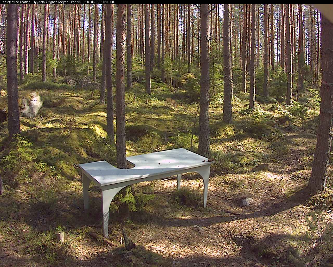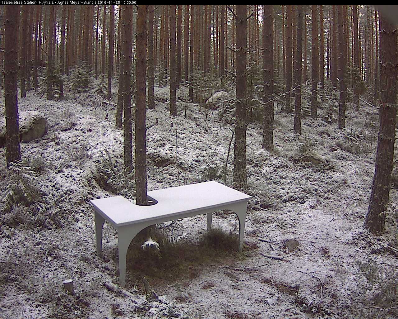 Agnes Meyer-Brandiksen työ Hyytiälässä alkoi tutustumalla aseman muihin tutkijoihin. Pystyäkseen tapaamaan ihmisiä metsässä, hän rakensi pöydän, josta muodostui kohtauspiste ja paikka teehetkille Agneksen ja puun kanssa.