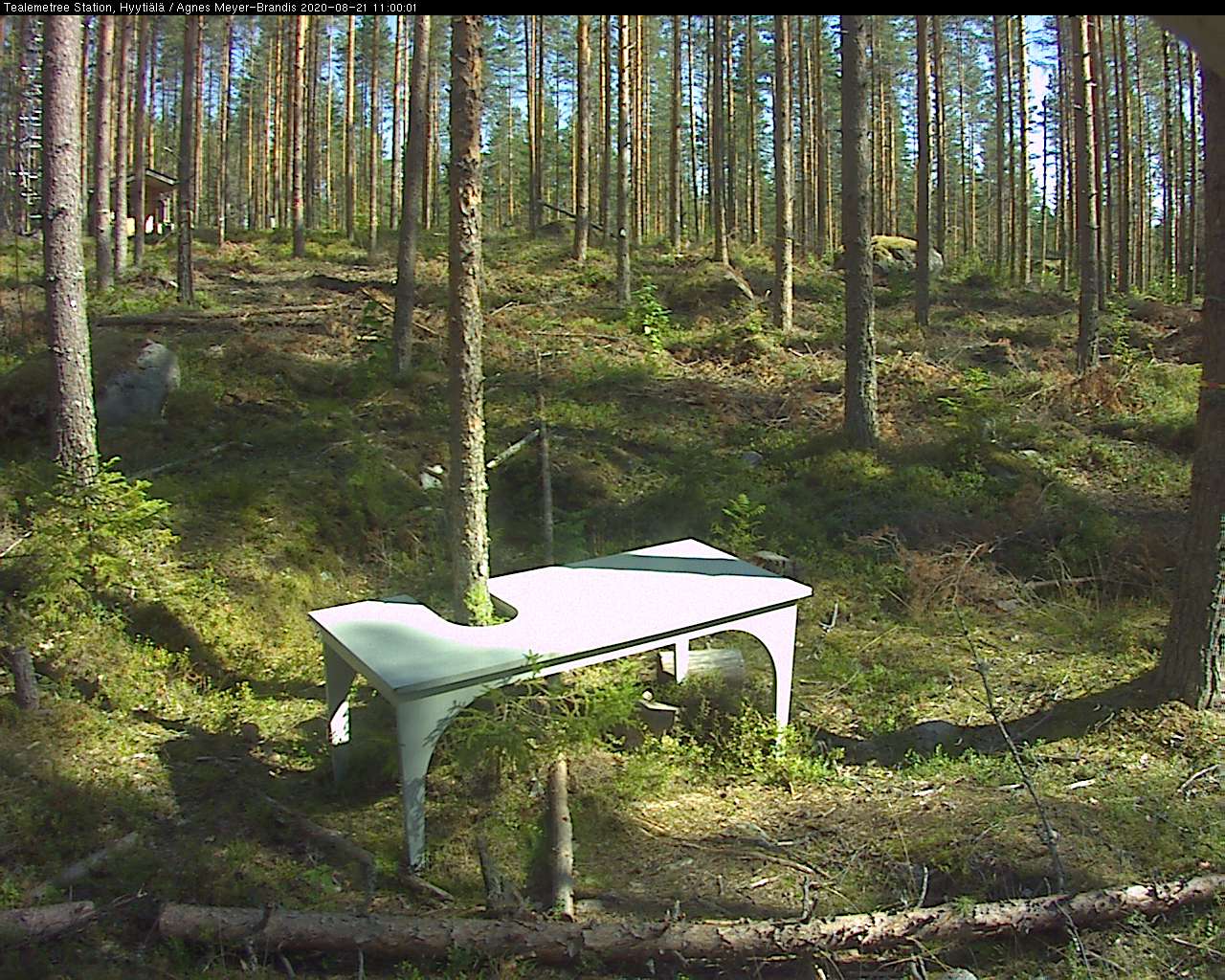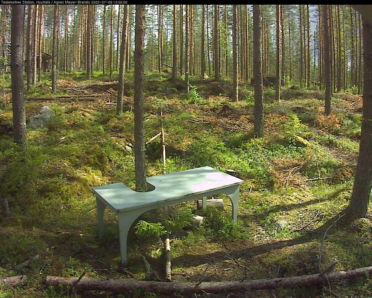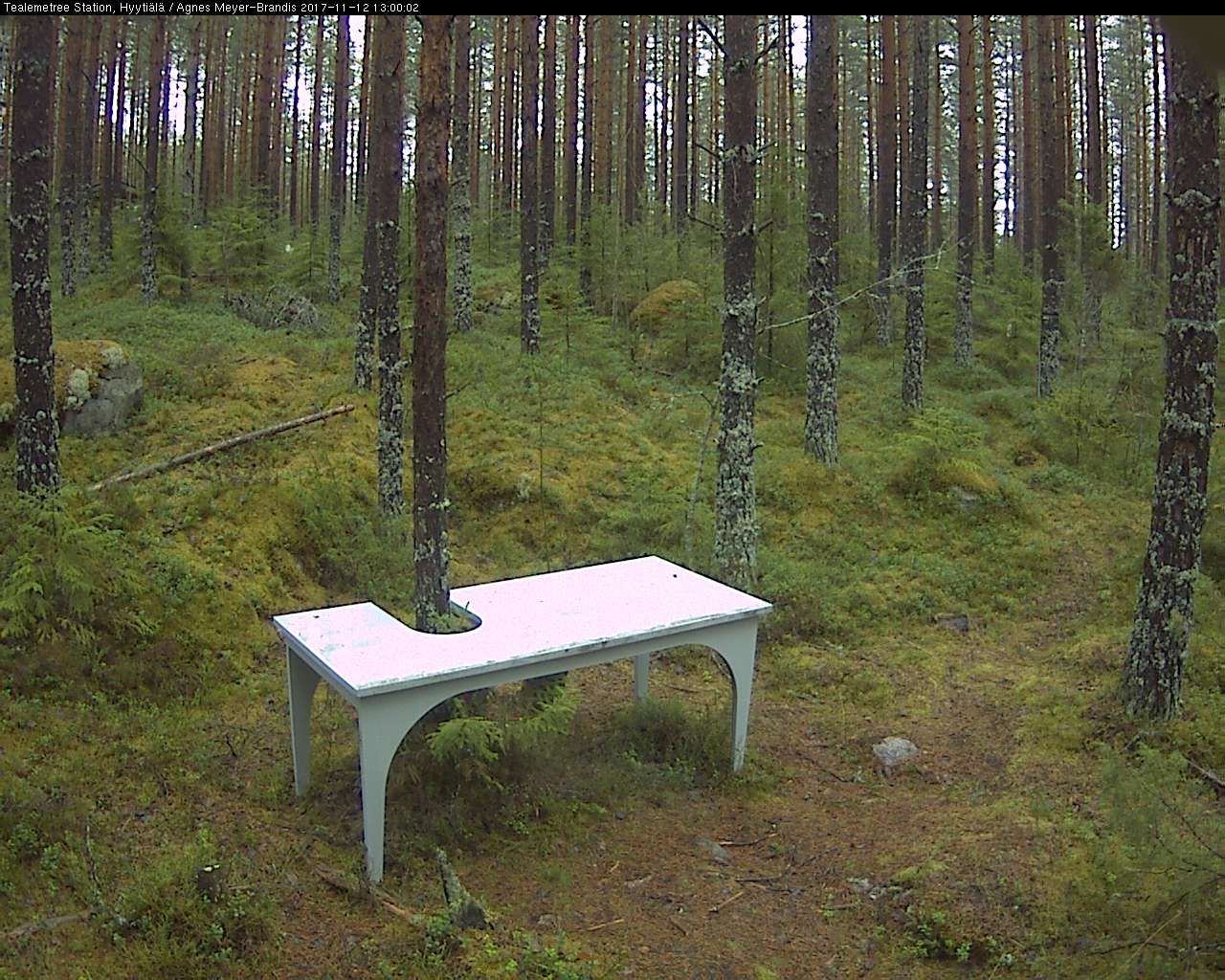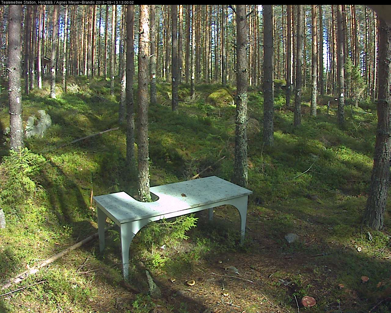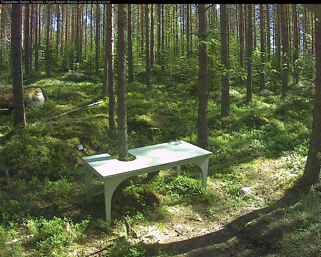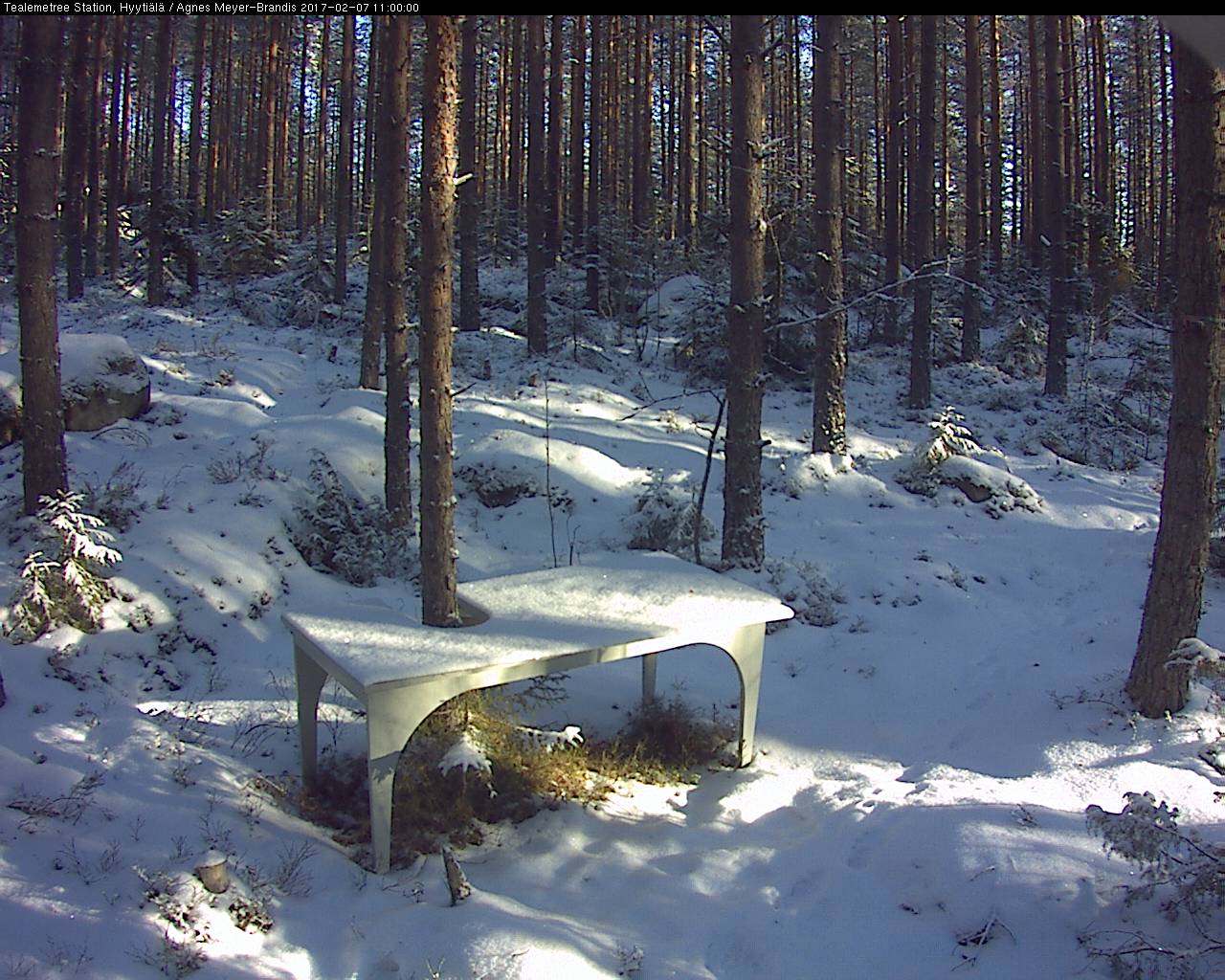 Agnes Meyer-Brandiksen työ Hyytiälässä alkoi tutustumalla aseman muihin tutkijoihin. Pystyäkseen tapaamaan ihmisiä metsässä, hän rakensi pöydän, josta muodostui kohtauspiste ja paikka teehetkille Agneksen ja puun kanssa.