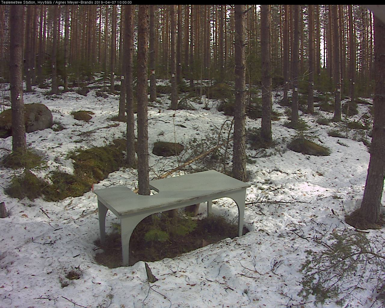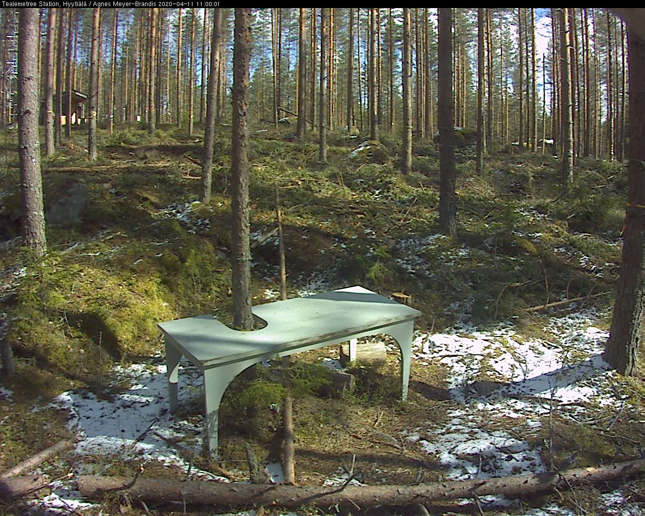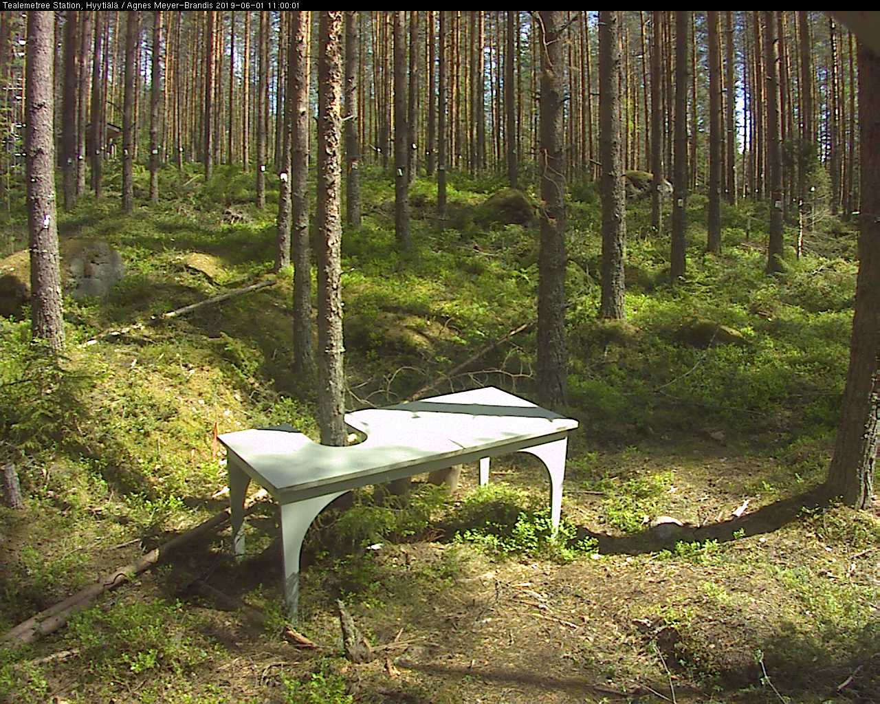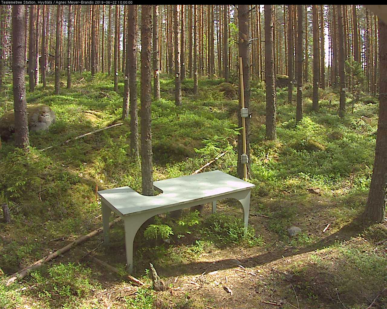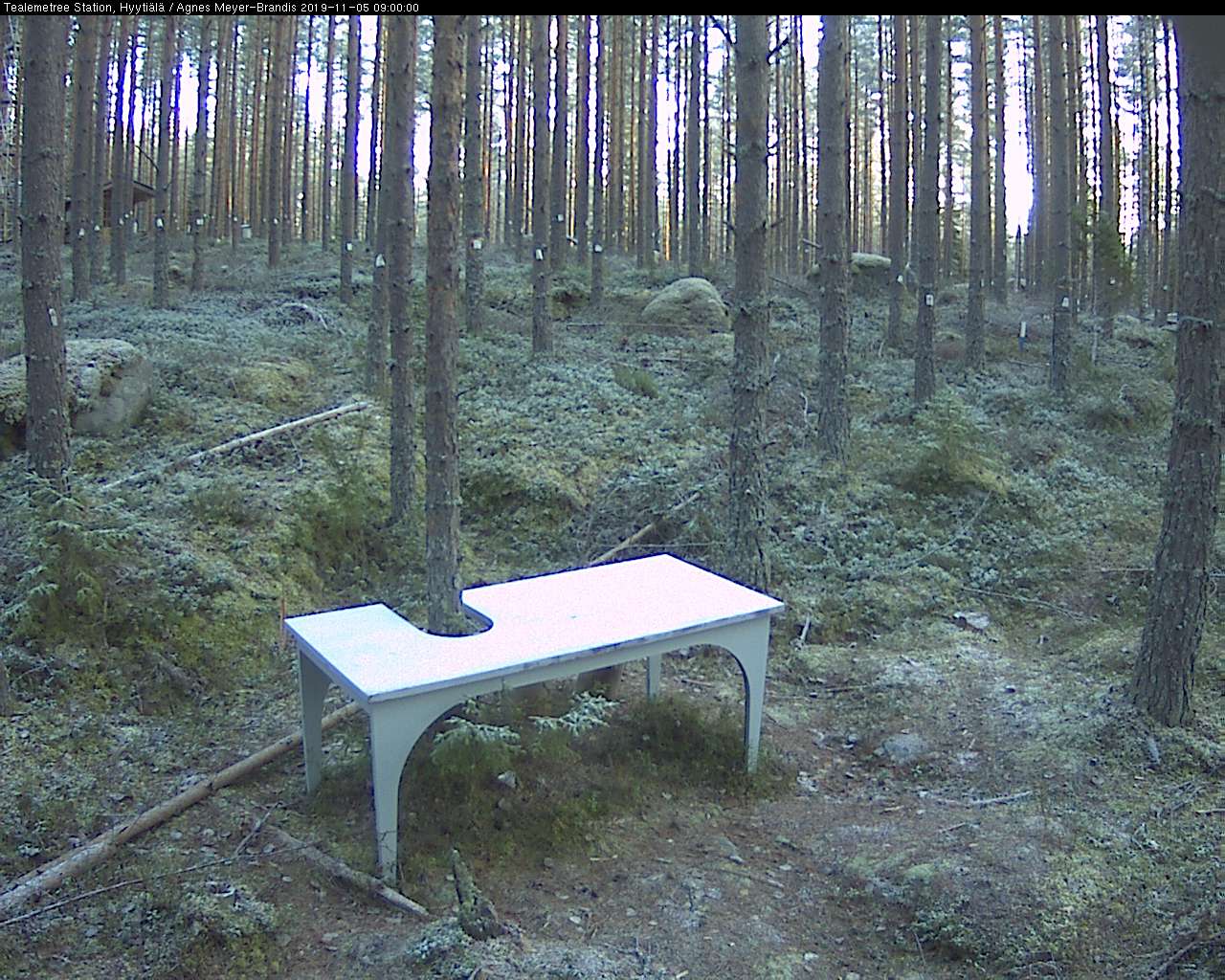 Agnes Meyer-Brandiksen työ Hyytiälässä alkoi tutustumalla aseman muihin tutkijoihin. Pystyäkseen tapaamaan ihmisiä metsässä, hän rakensi pöydän, josta muodostui kohtauspiste ja paikka teehetkille Agneksen ja puun kanssa.