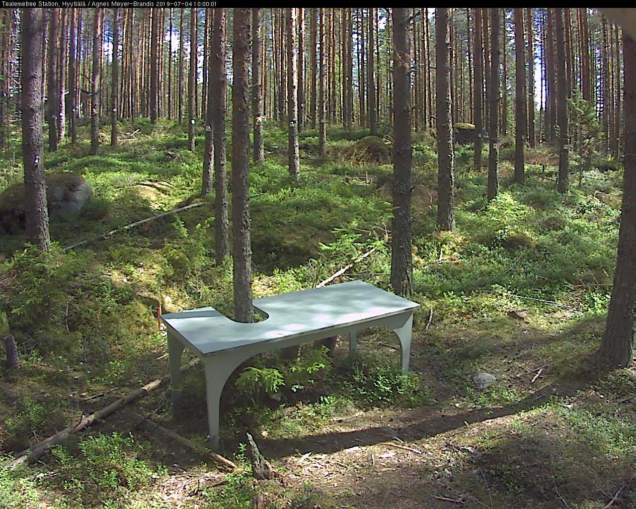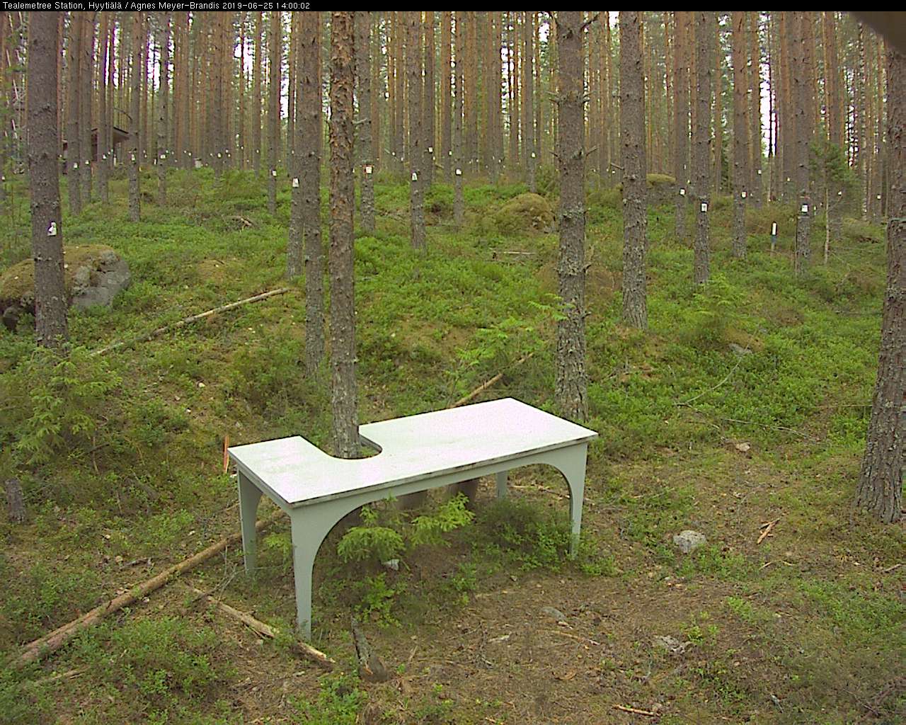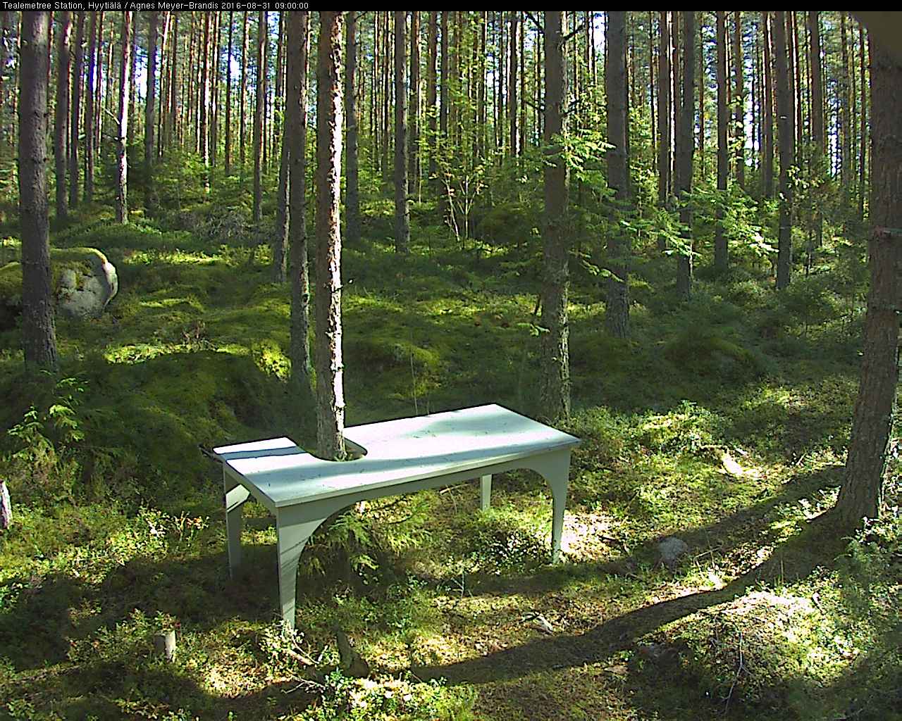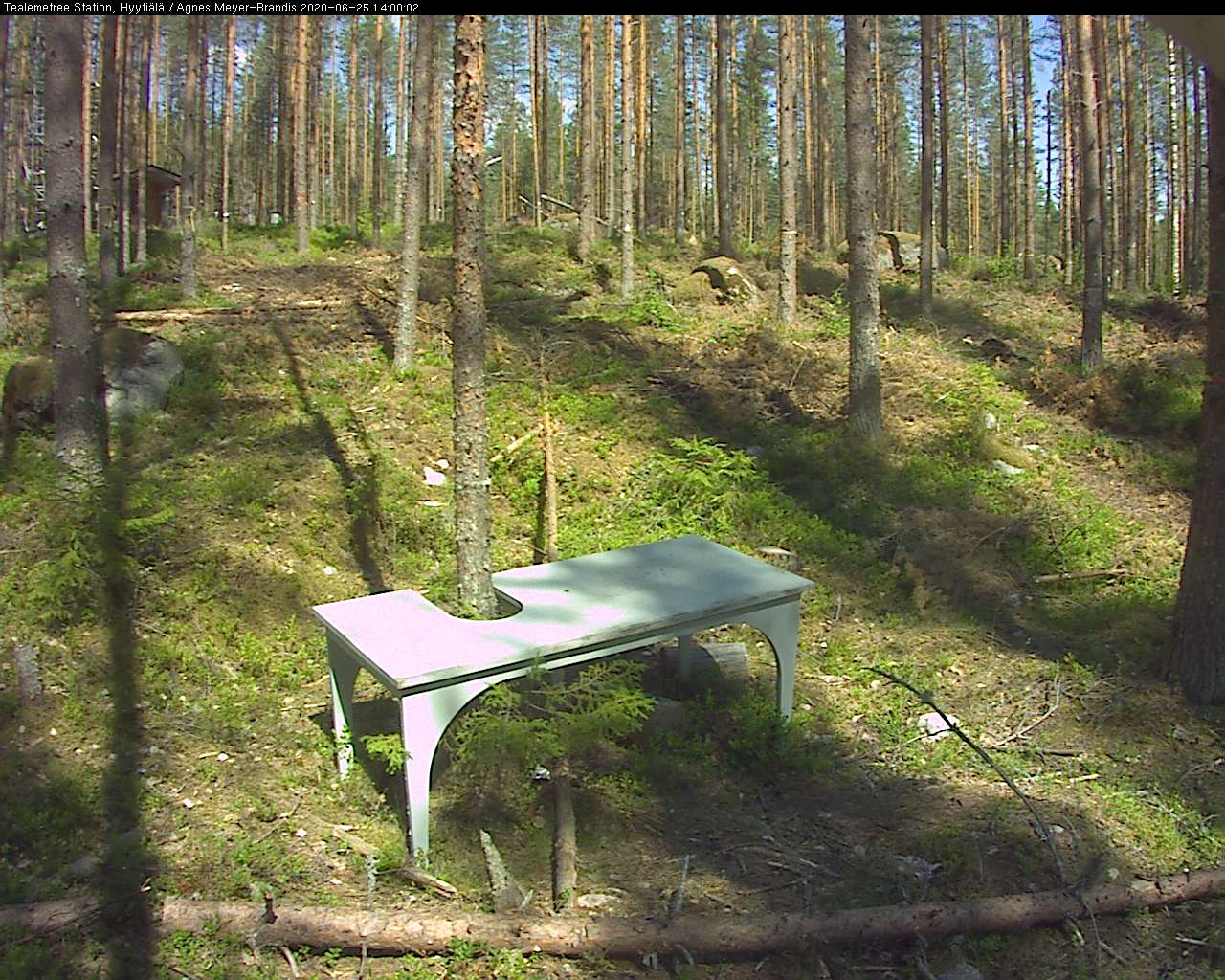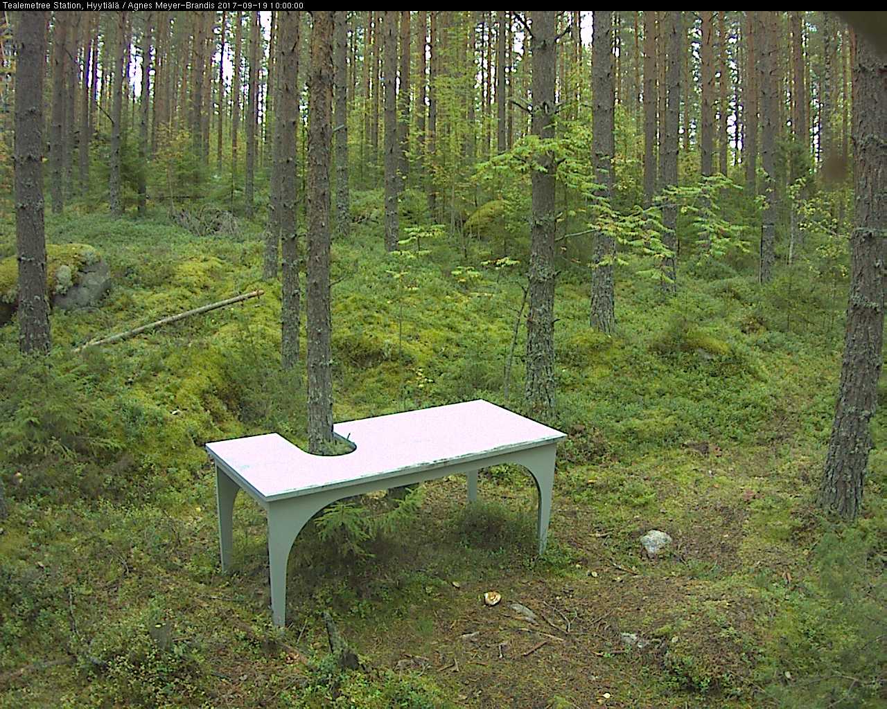 Agnes Meyer-Brandiksen työ Hyytiälässä alkoi tutustumalla aseman muihin tutkijoihin. Pystyäkseen tapaamaan ihmisiä metsässä, hän rakensi pöydän, josta muodostui kohtauspiste ja paikka teehetkille Agneksen ja puun kanssa.
