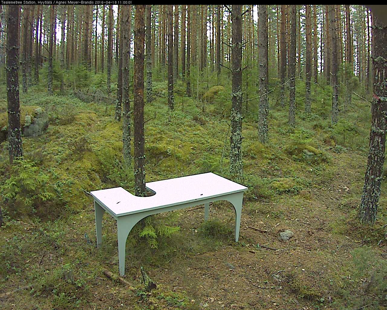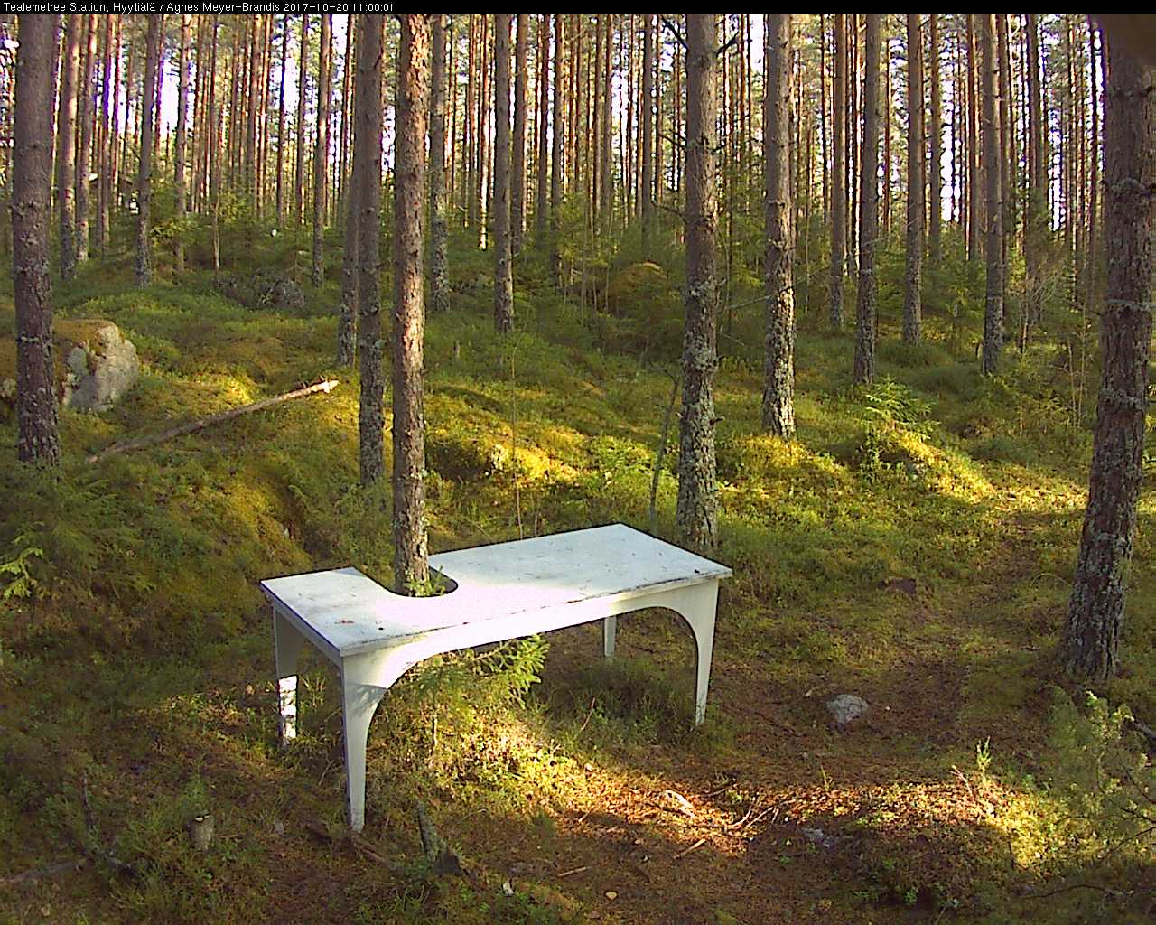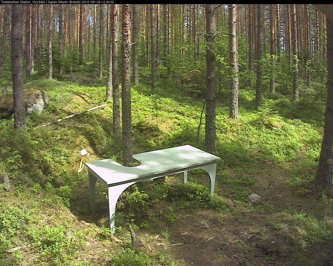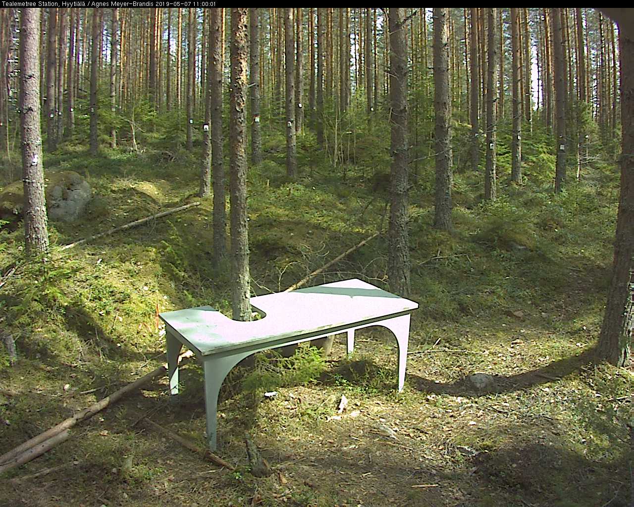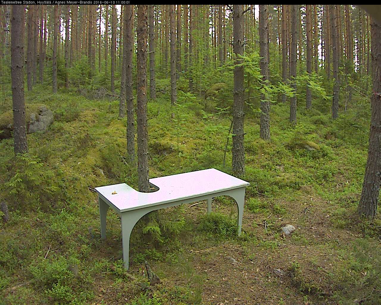 Agnes Meyer-Brandiksen työ Hyytiälässä alkoi tutustumalla aseman muihin tutkijoihin. Pystyäkseen tapaamaan ihmisiä metsässä, hän rakensi pöydän, josta muodostui kohtauspiste ja paikka teehetkille Agneksen ja puun kanssa.