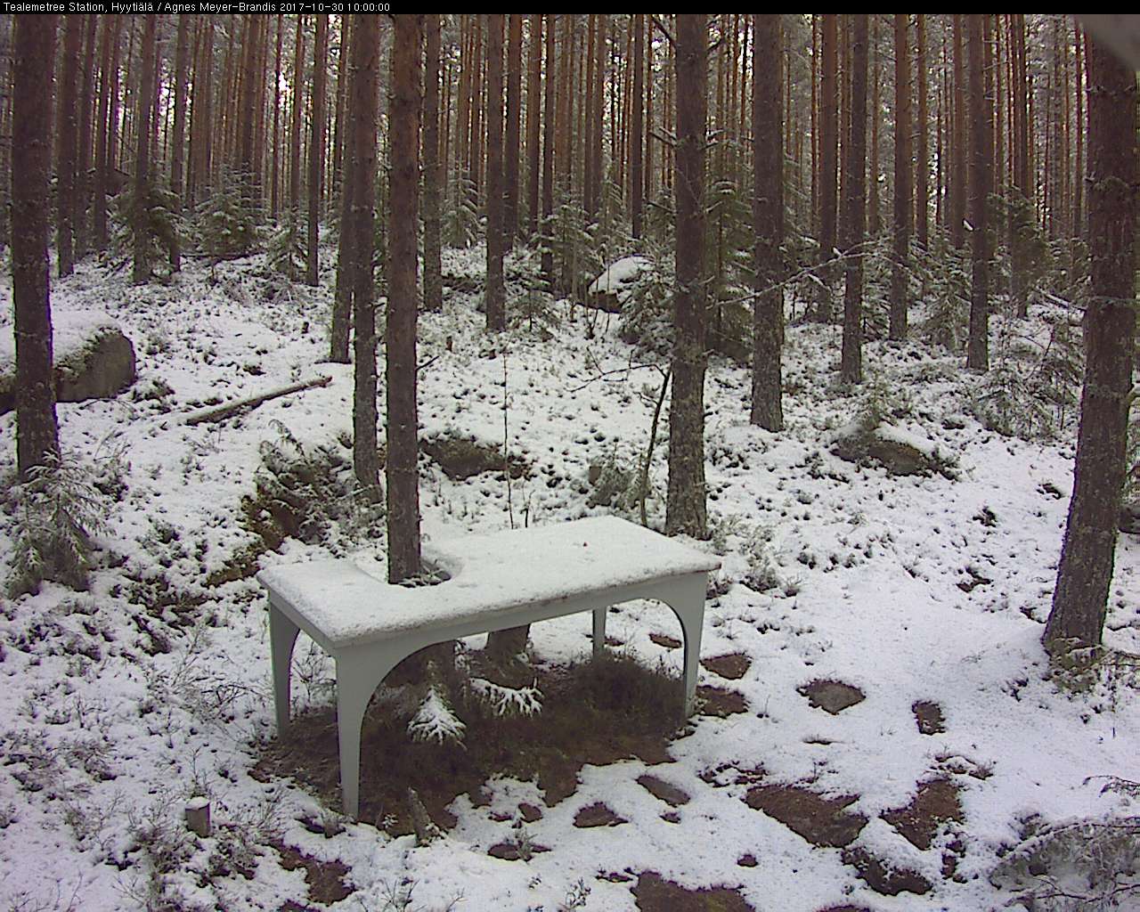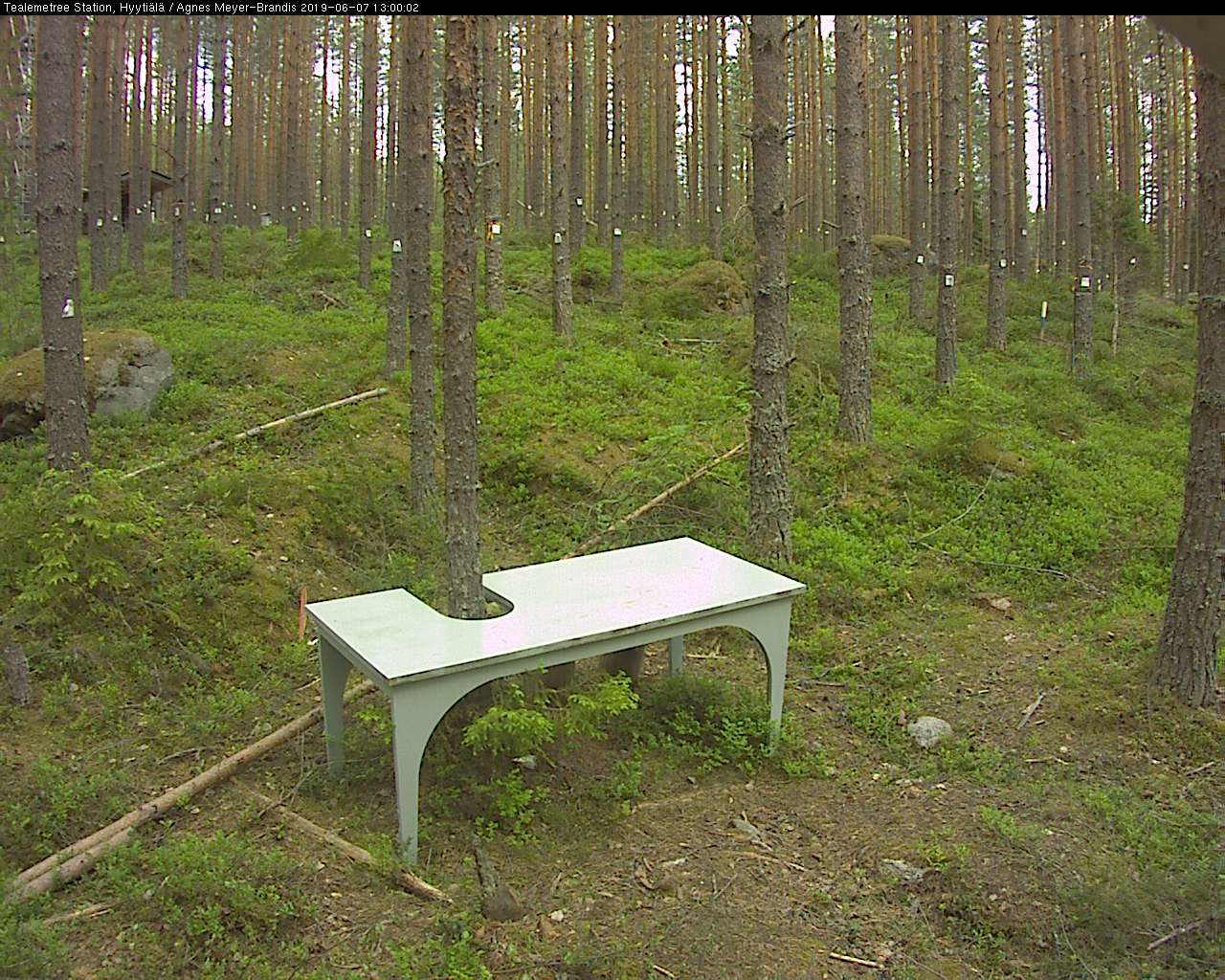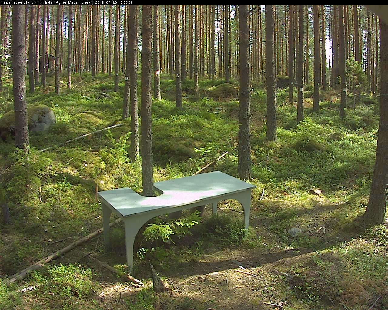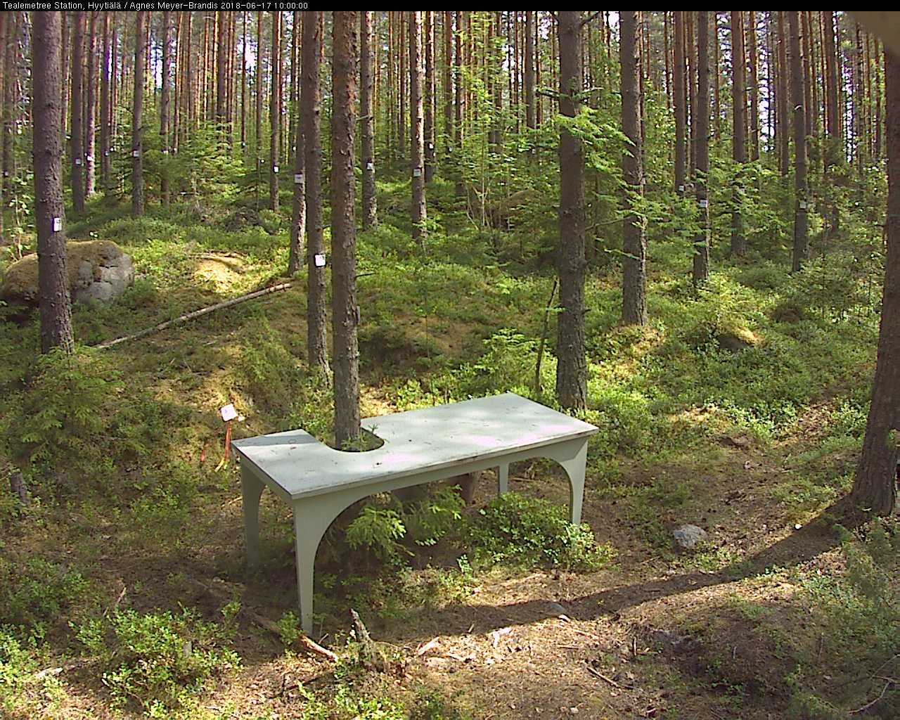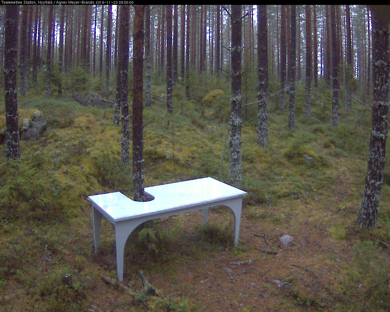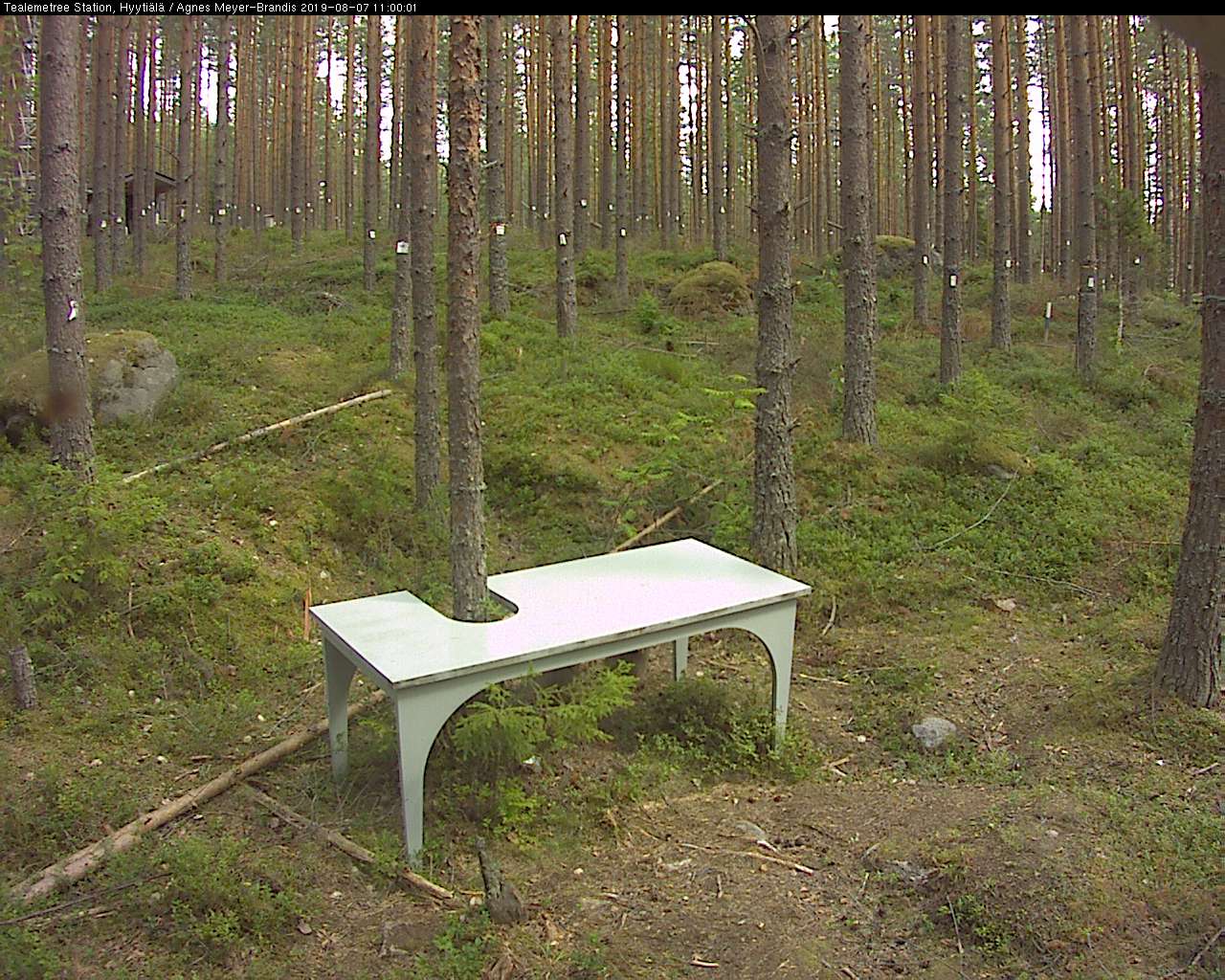 Agnes Meyer-Brandiksen työ Hyytiälässä alkoi tutustumalla aseman muihin tutkijoihin. Pystyäkseen tapaamaan ihmisiä metsässä, hän rakensi pöydän, josta muodostui kohtauspiste ja paikka teehetkille Agneksen ja puun kanssa.