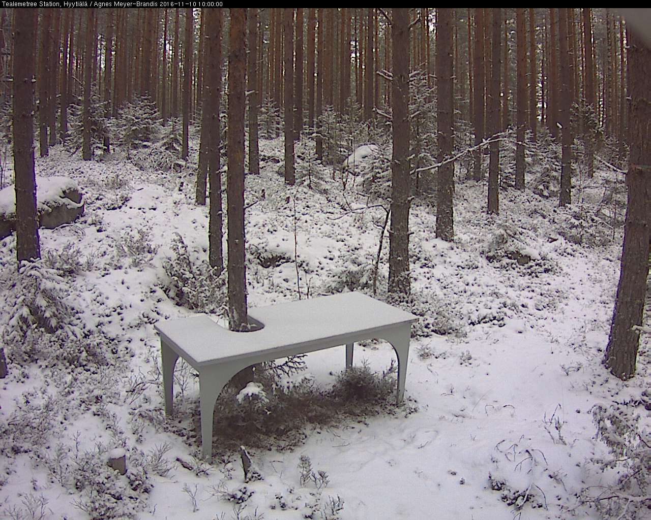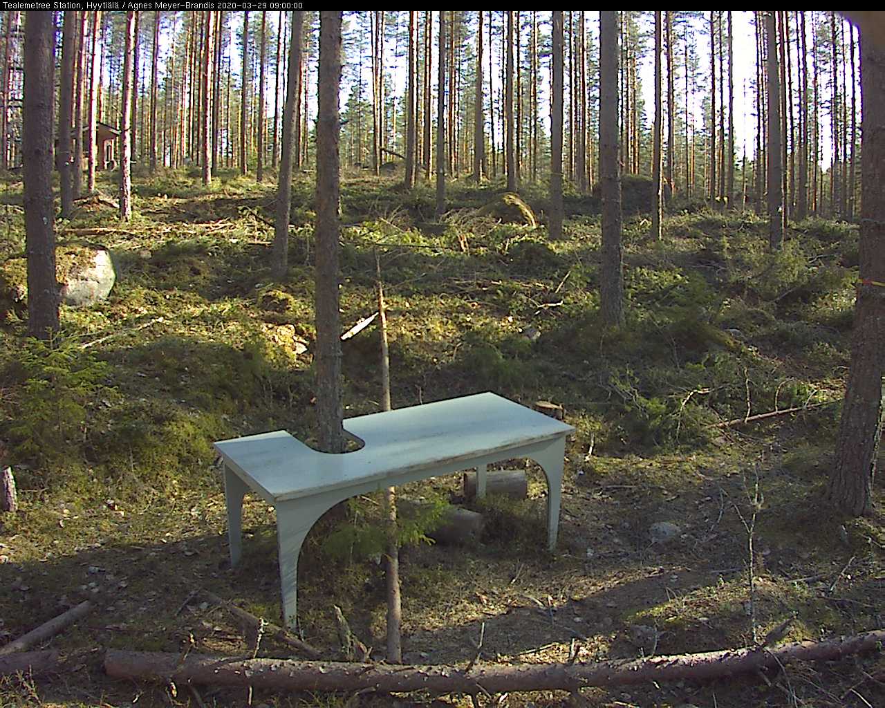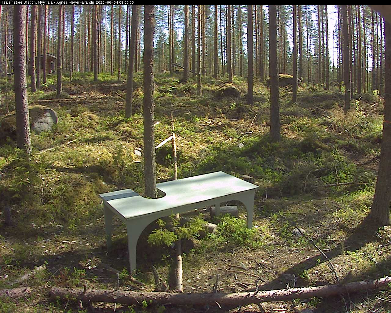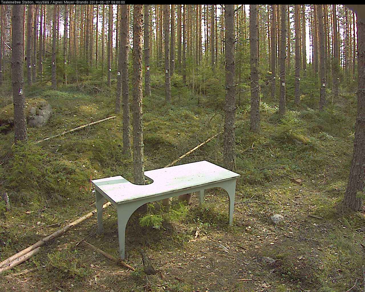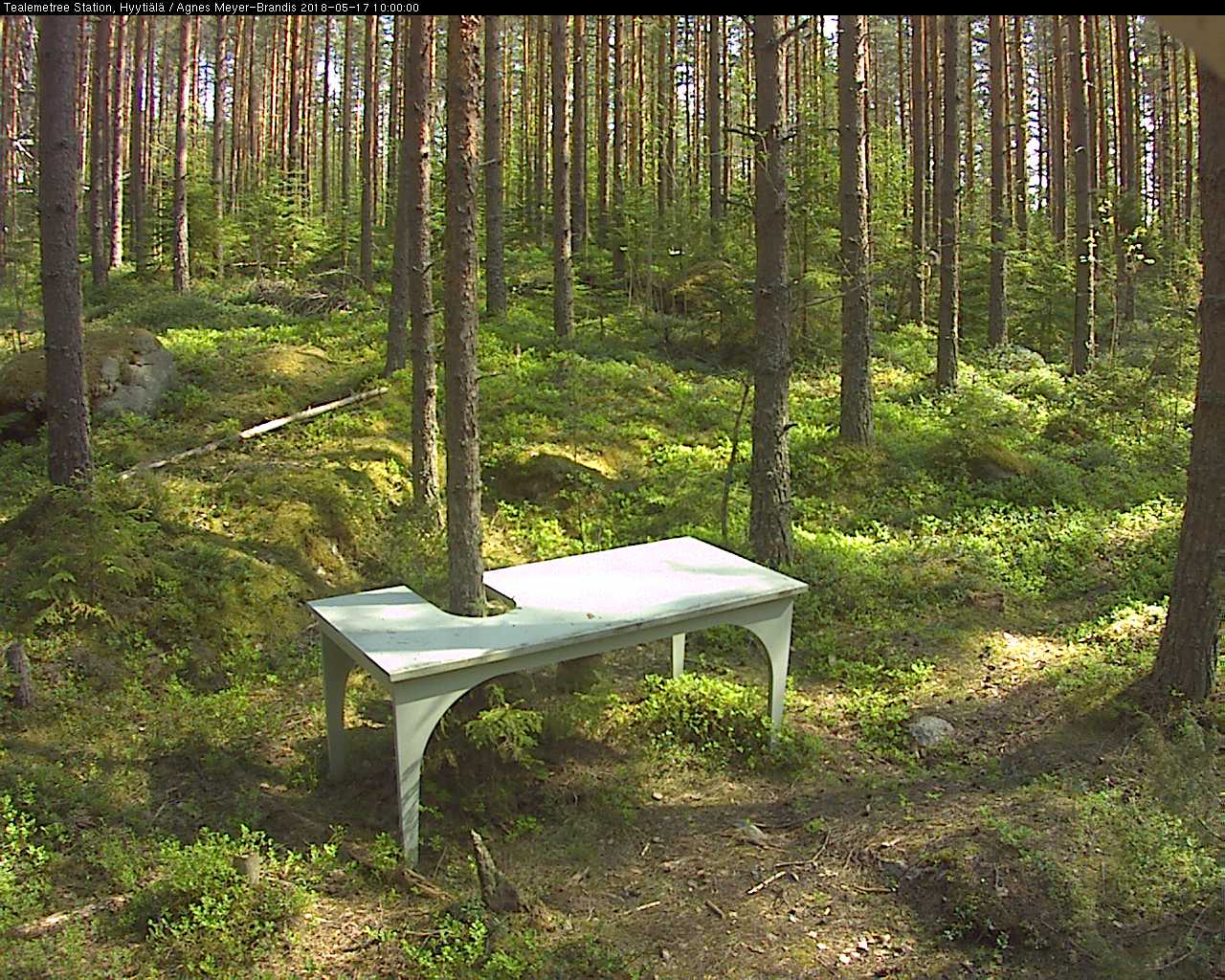 Agnes Meyer-Brandiksen työ Hyytiälässä alkoi tutustumalla aseman muihin tutkijoihin. Pystyäkseen tapaamaan ihmisiä metsässä, hän rakensi pöydän, josta muodostui kohtauspiste ja paikka teehetkille Agneksen ja puun kanssa.