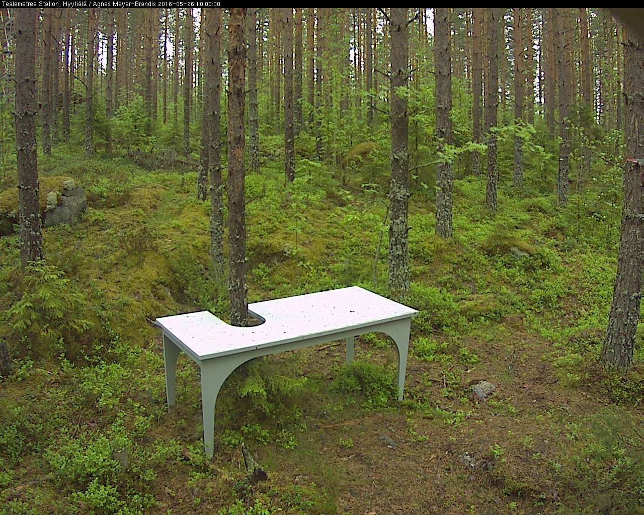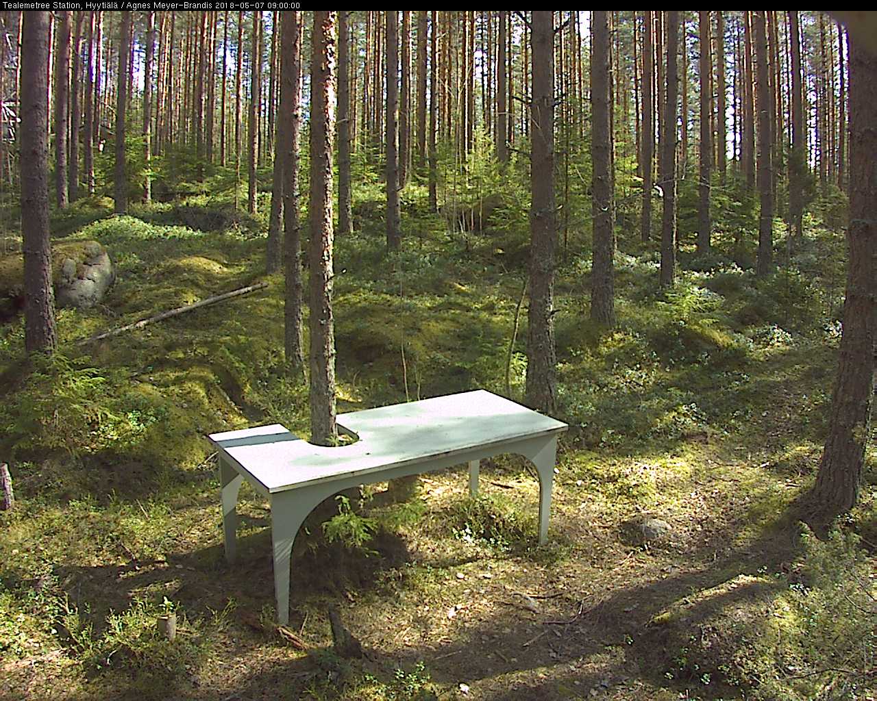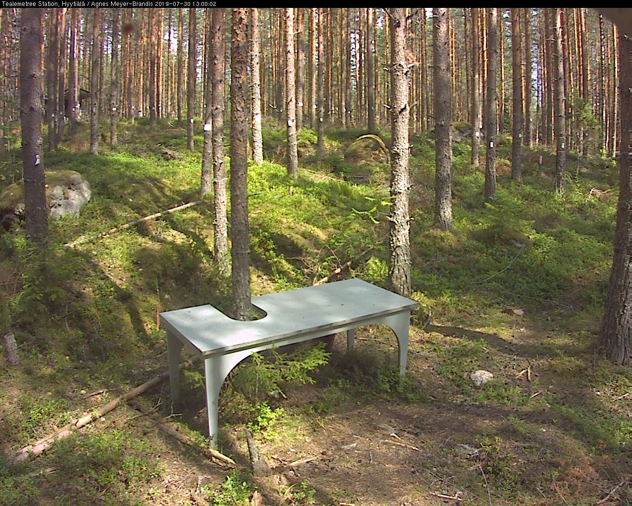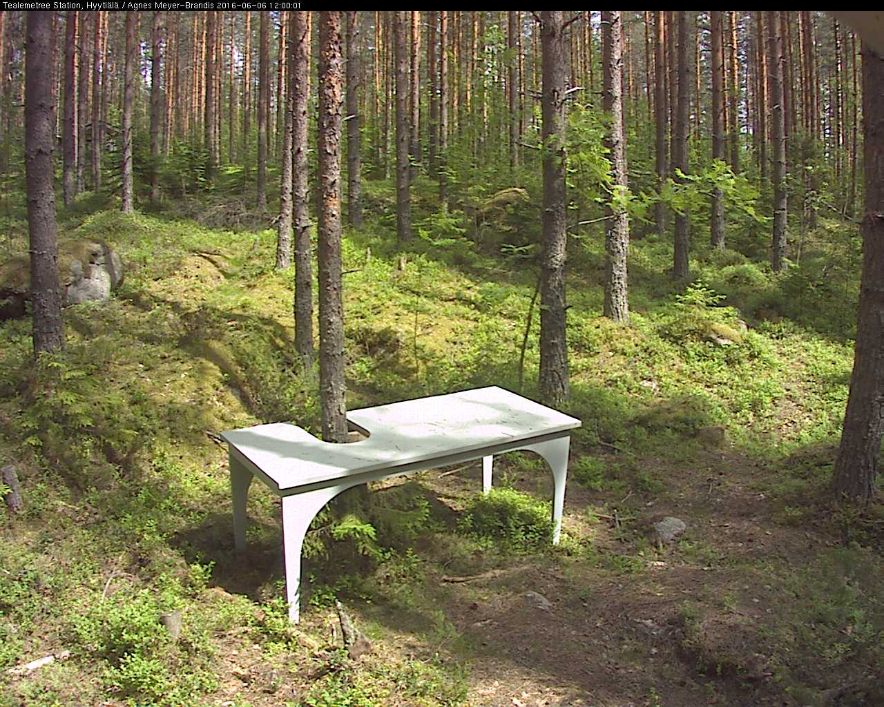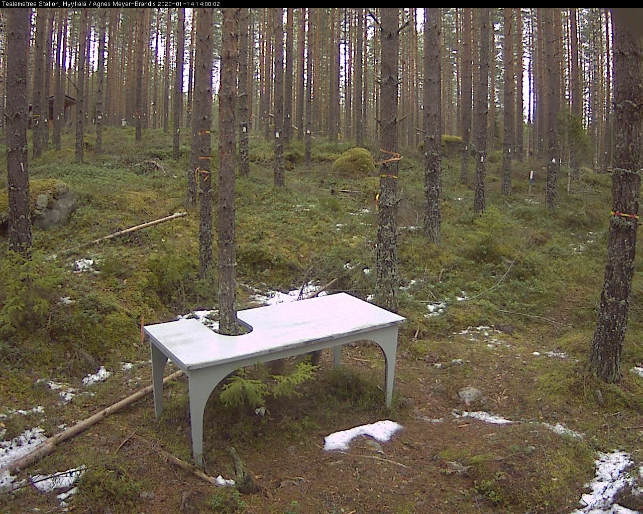 Agnes Meyer-Brandiksen työ Hyytiälässä alkoi tutustumalla aseman muihin tutkijoihin. Pystyäkseen tapaamaan ihmisiä metsässä, hän rakensi pöydän, josta muodostui kohtauspiste ja paikka teehetkille Agneksen ja puun kanssa.