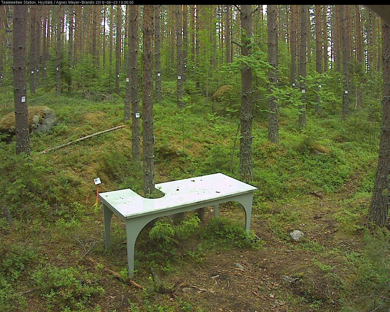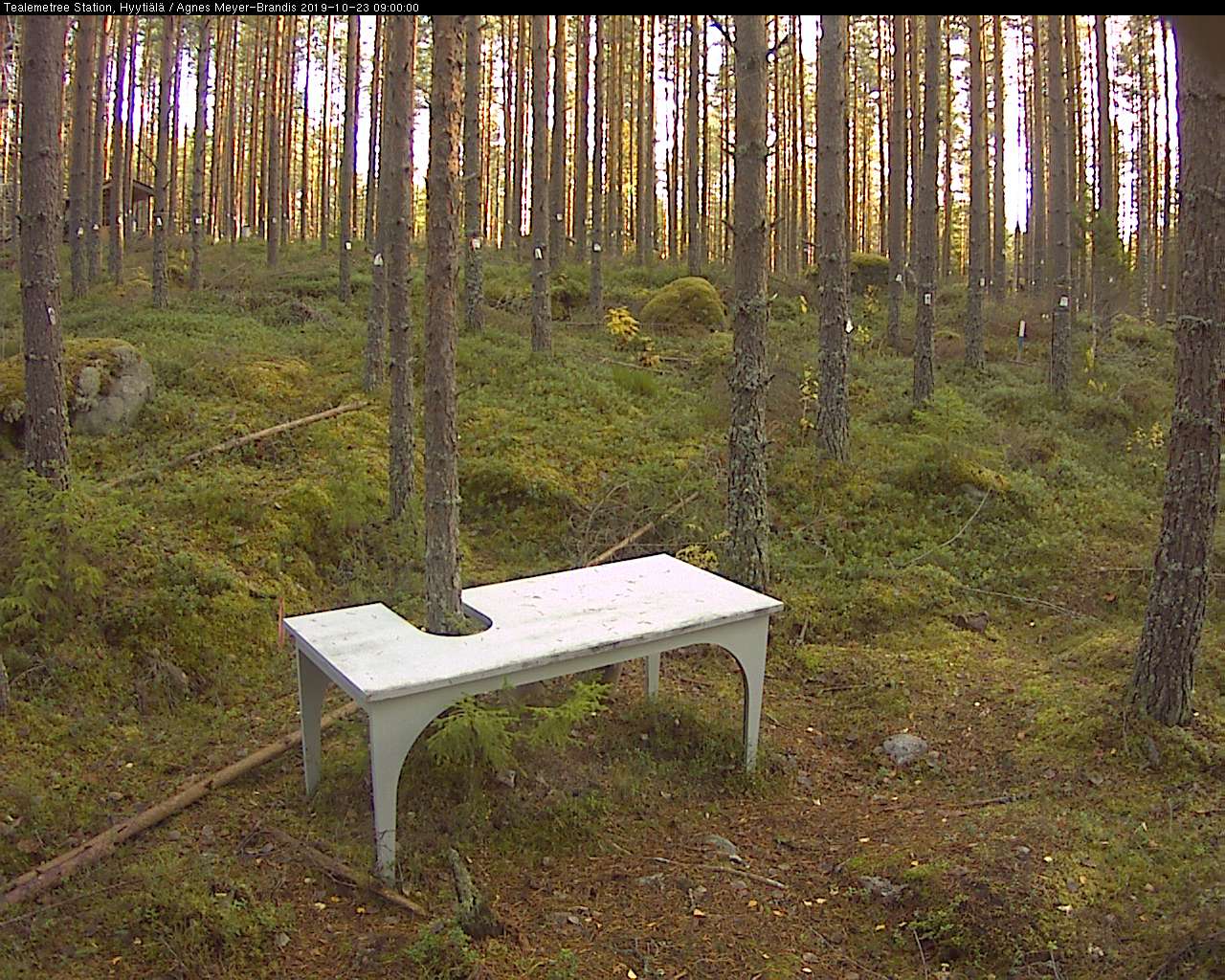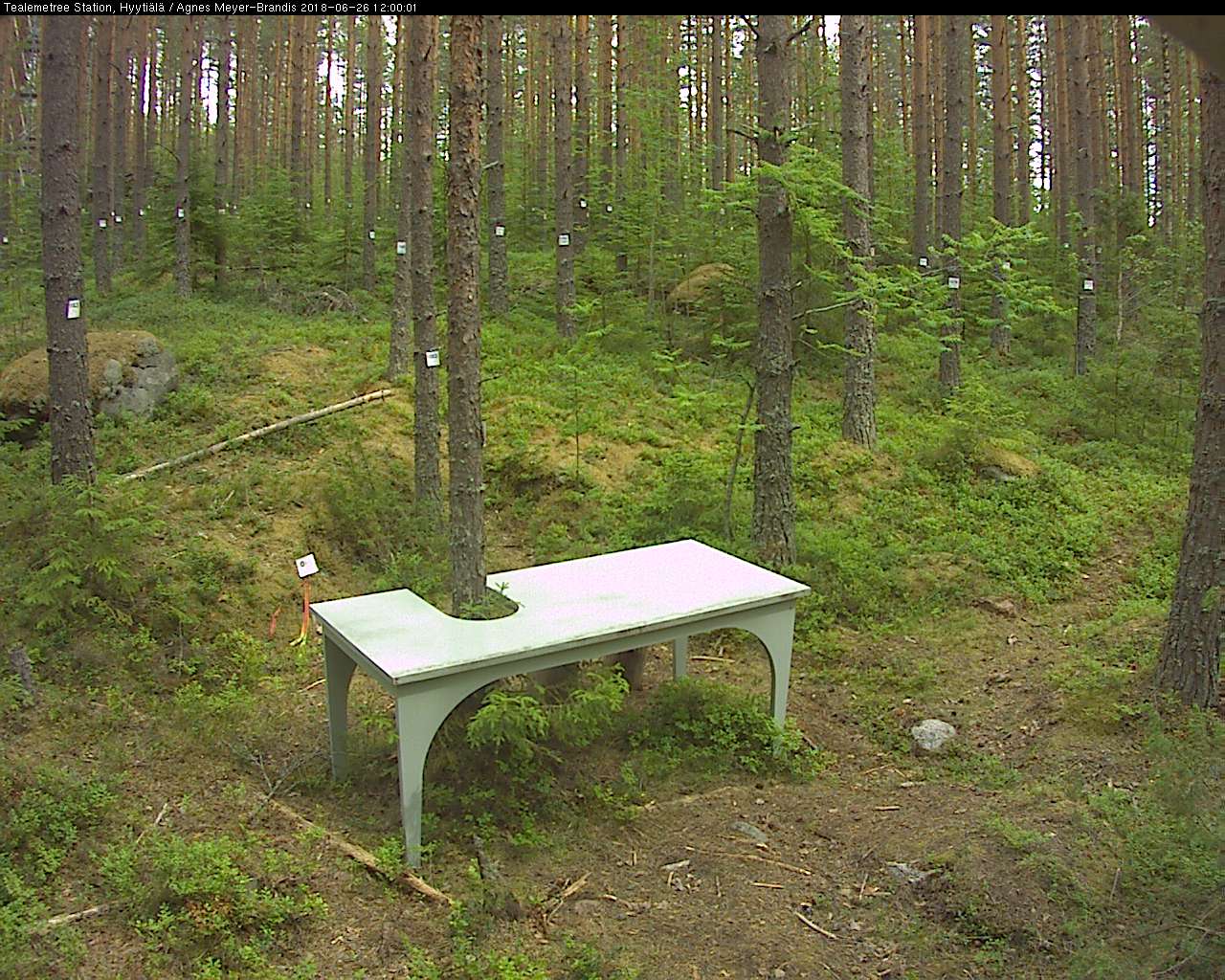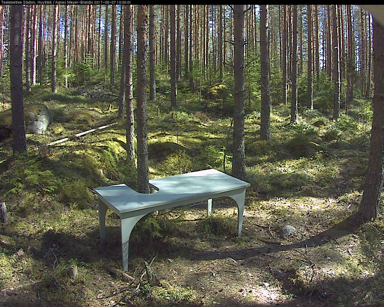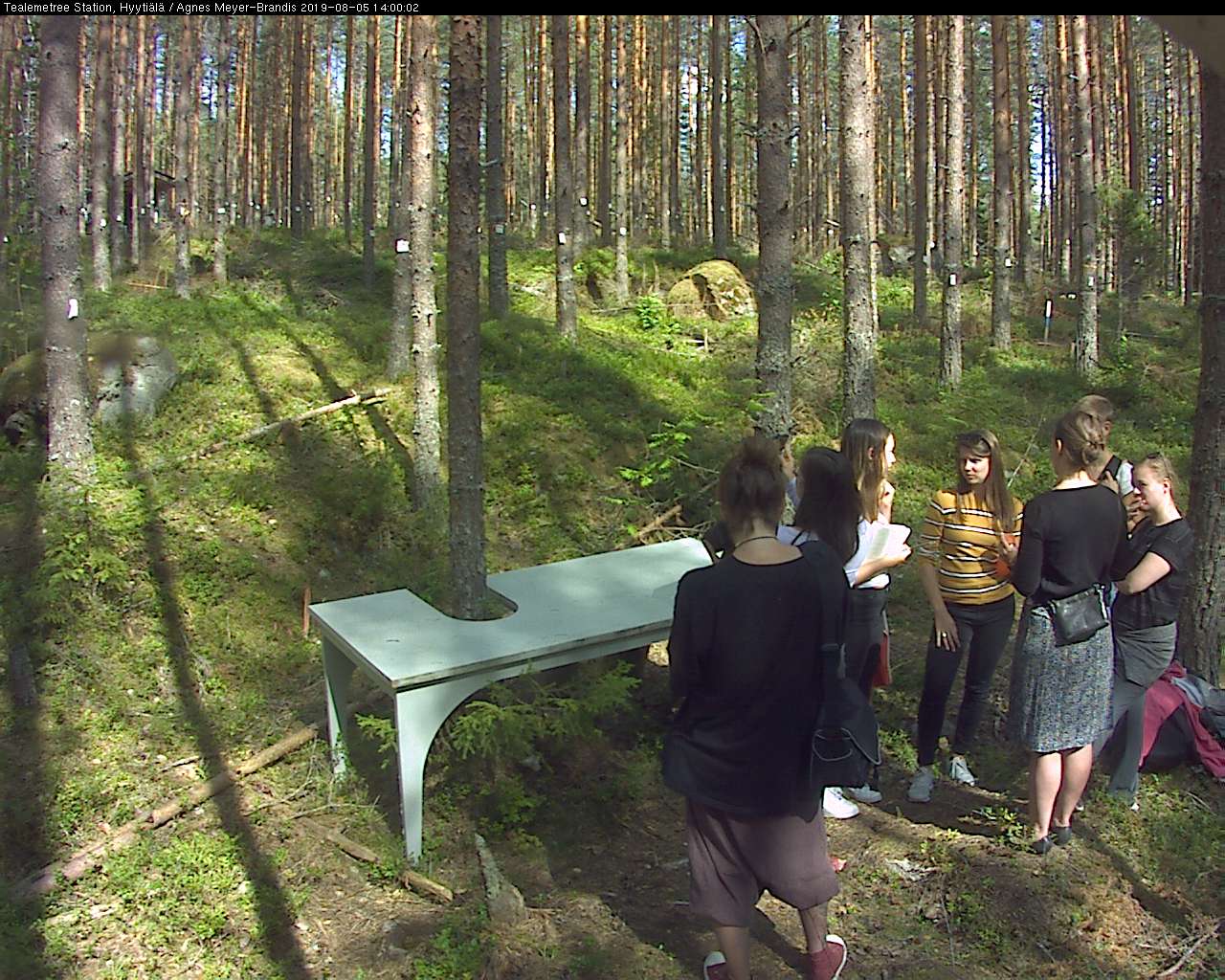 Agnes Meyer-Brandiksen työ Hyytiälässä alkoi tutustumalla aseman muihin tutkijoihin. Pystyäkseen tapaamaan ihmisiä metsässä, hän rakensi pöydän, josta muodostui kohtauspiste ja paikka teehetkille Agneksen ja puun kanssa.