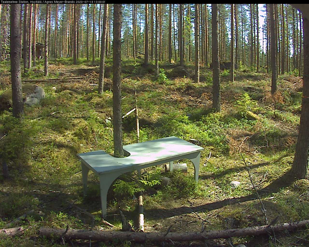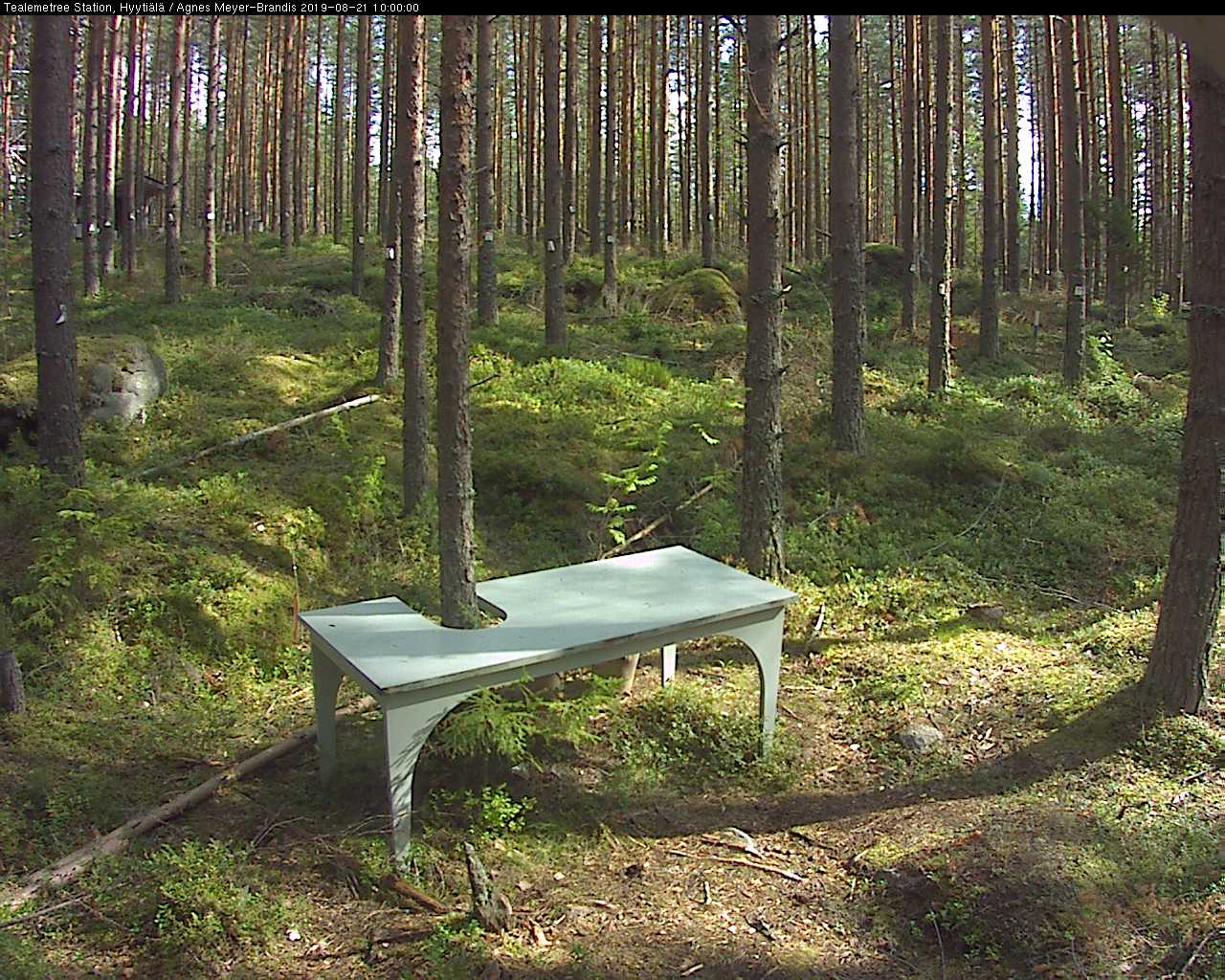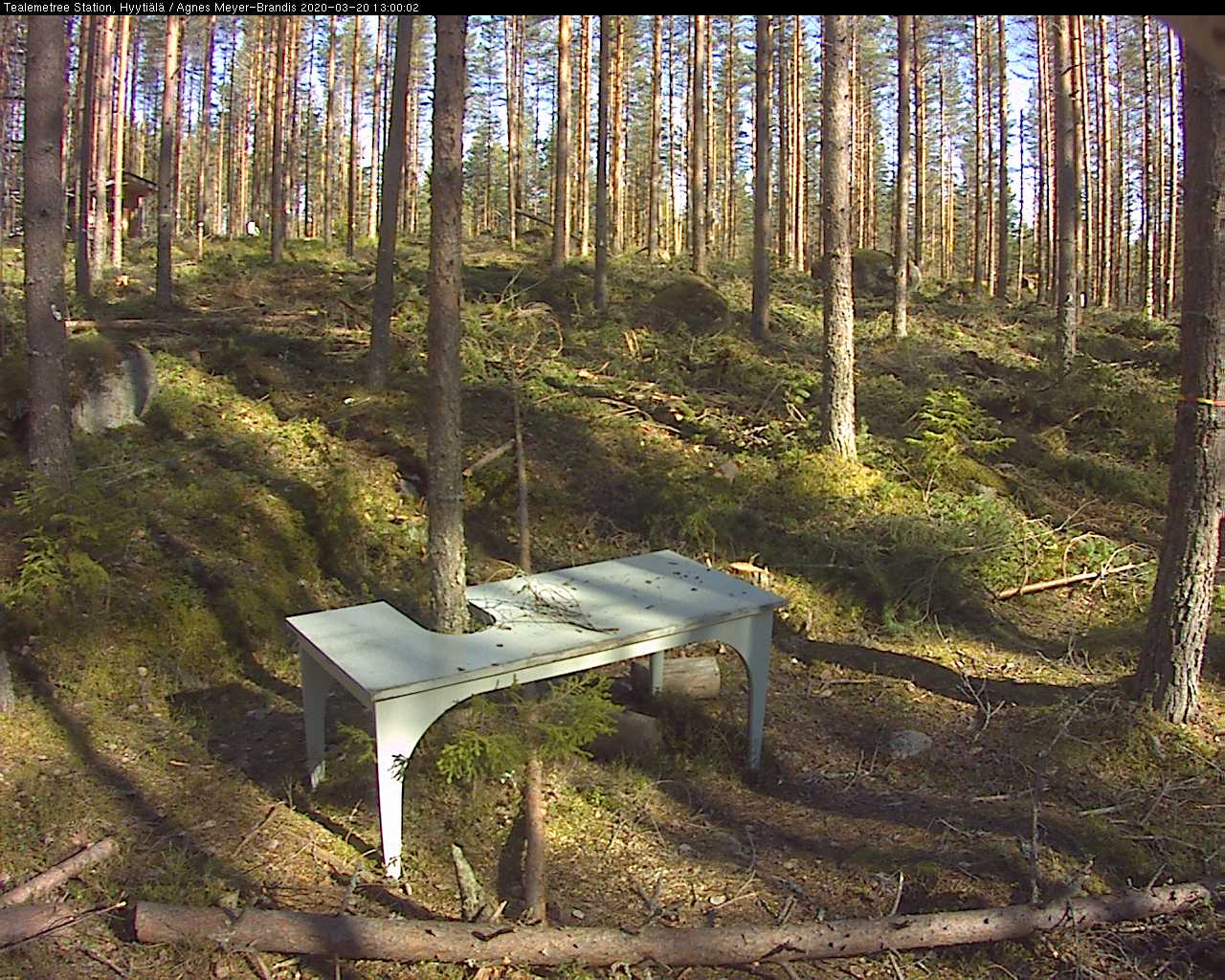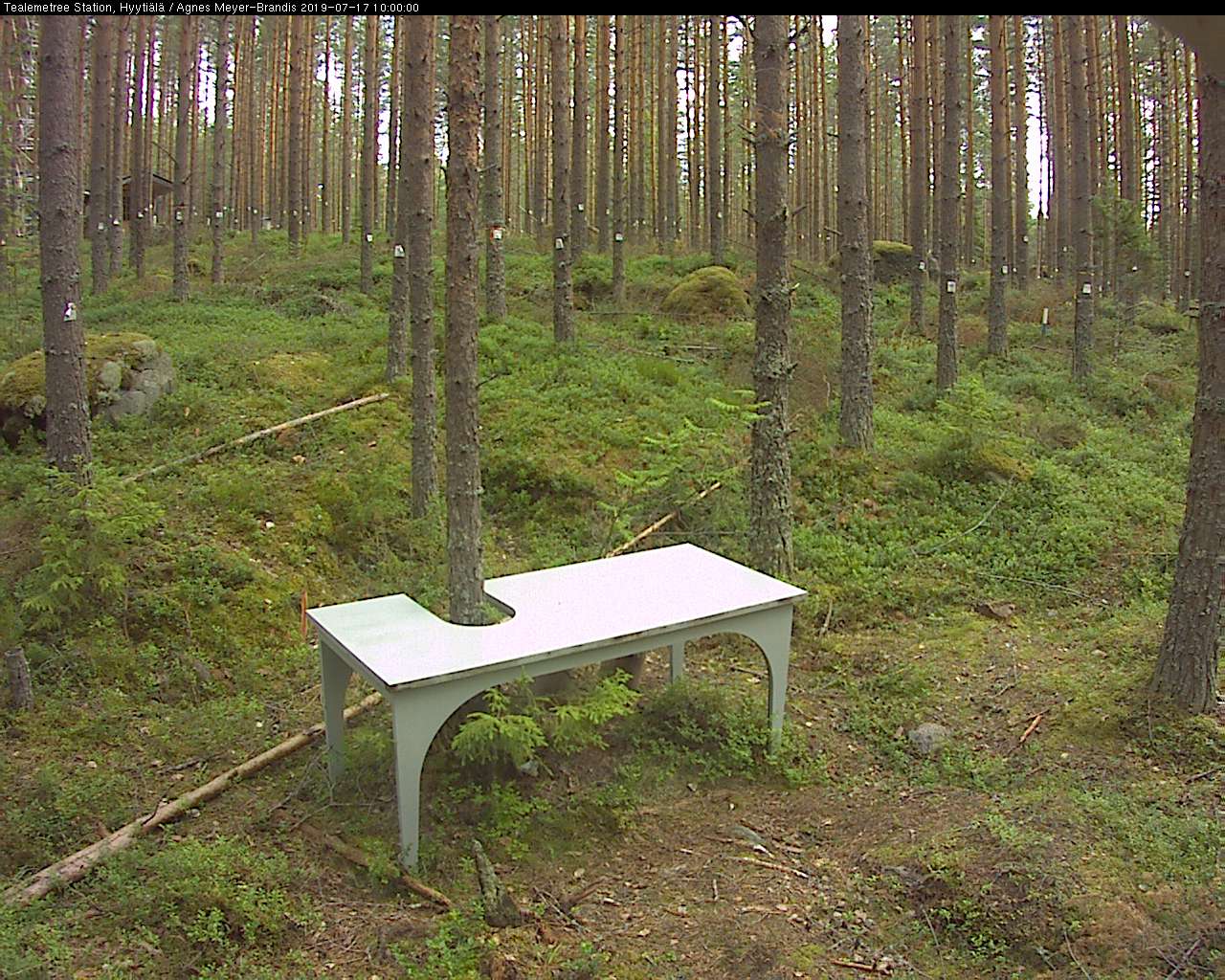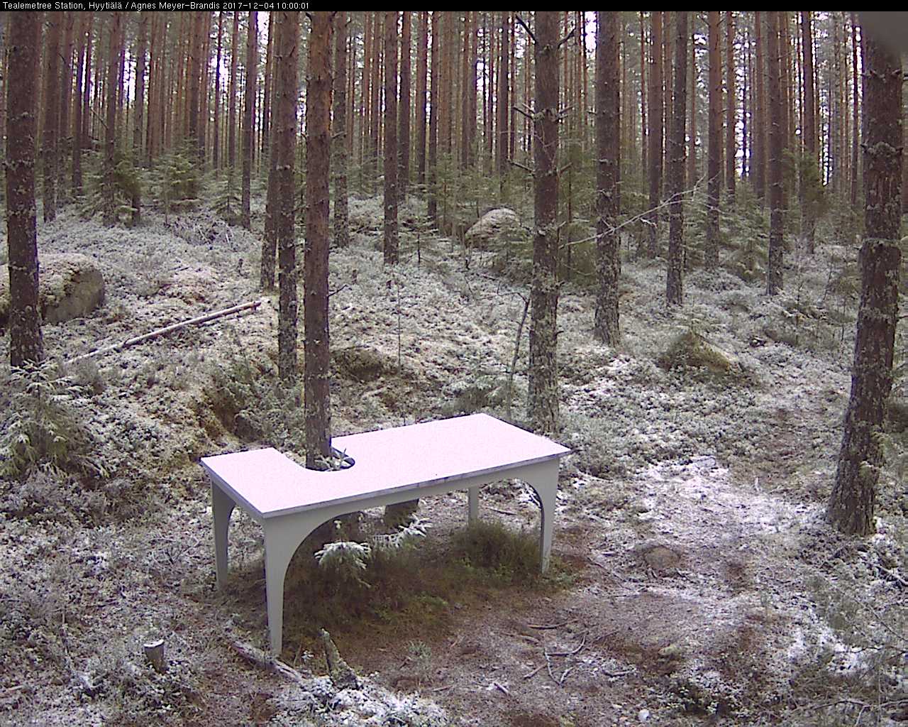 Agnes Meyer-Brandiksen työ Hyytiälässä alkoi tutustumalla aseman muihin tutkijoihin. Pystyäkseen tapaamaan ihmisiä metsässä, hän rakensi pöydän, josta muodostui kohtauspiste ja paikka teehetkille Agneksen ja puun kanssa.