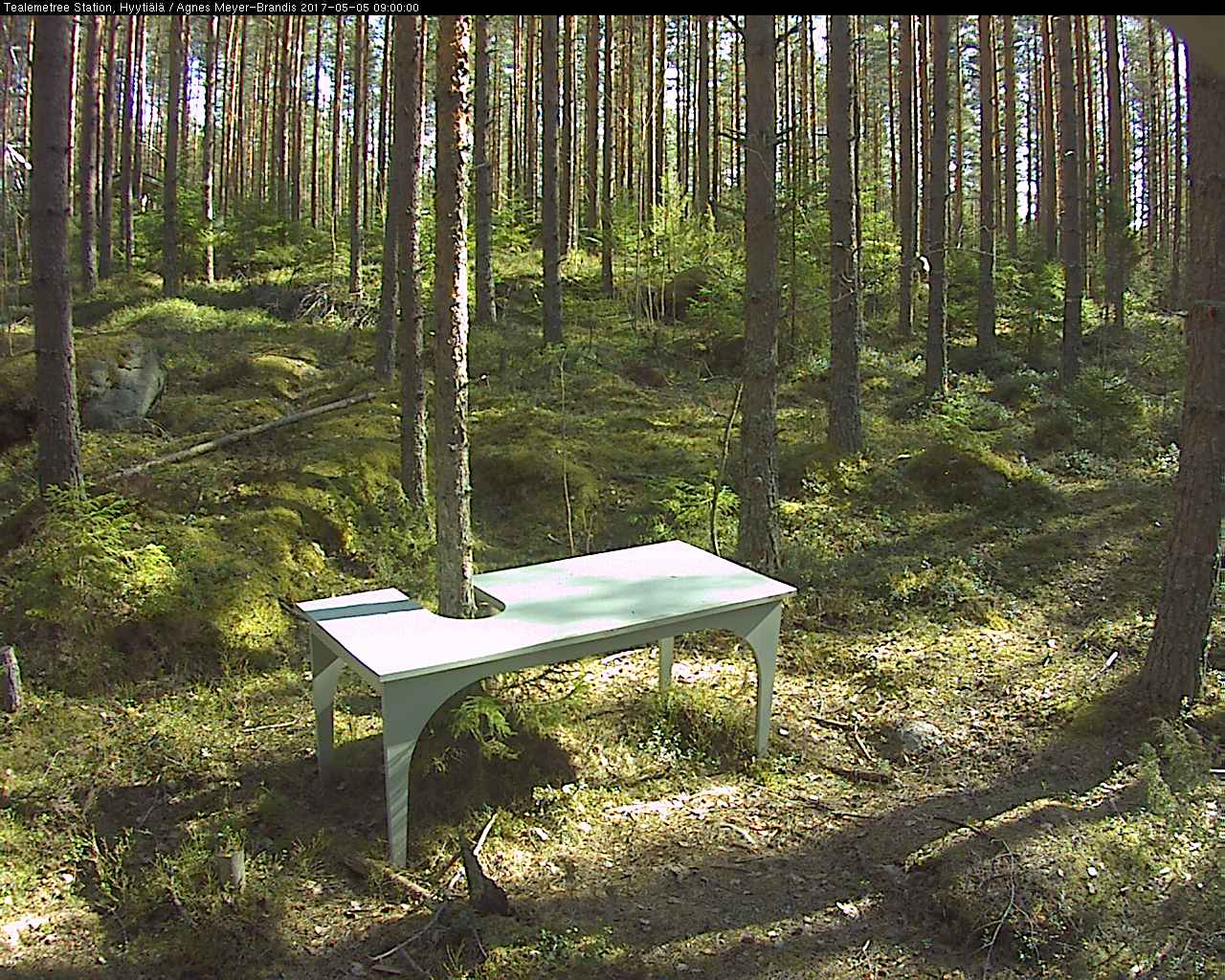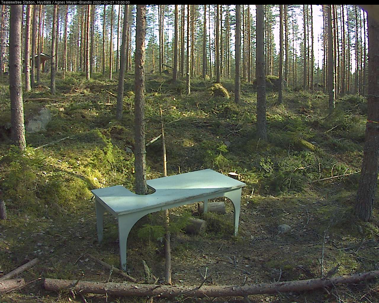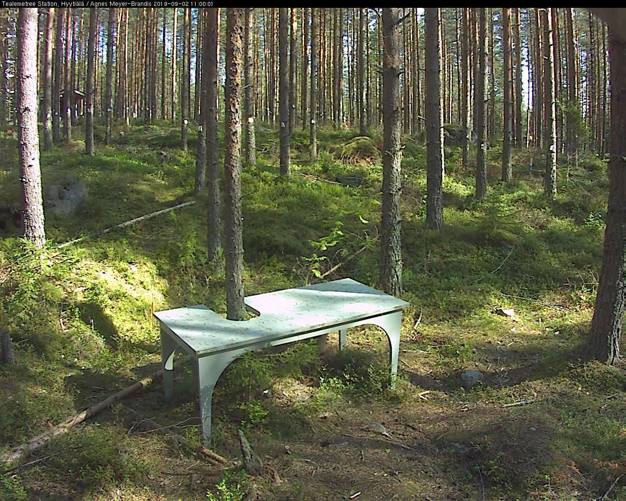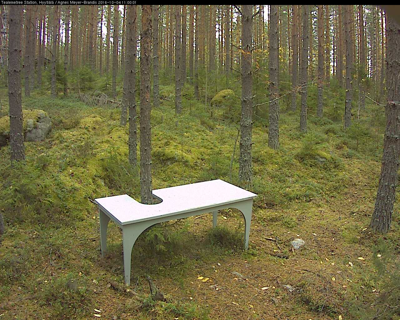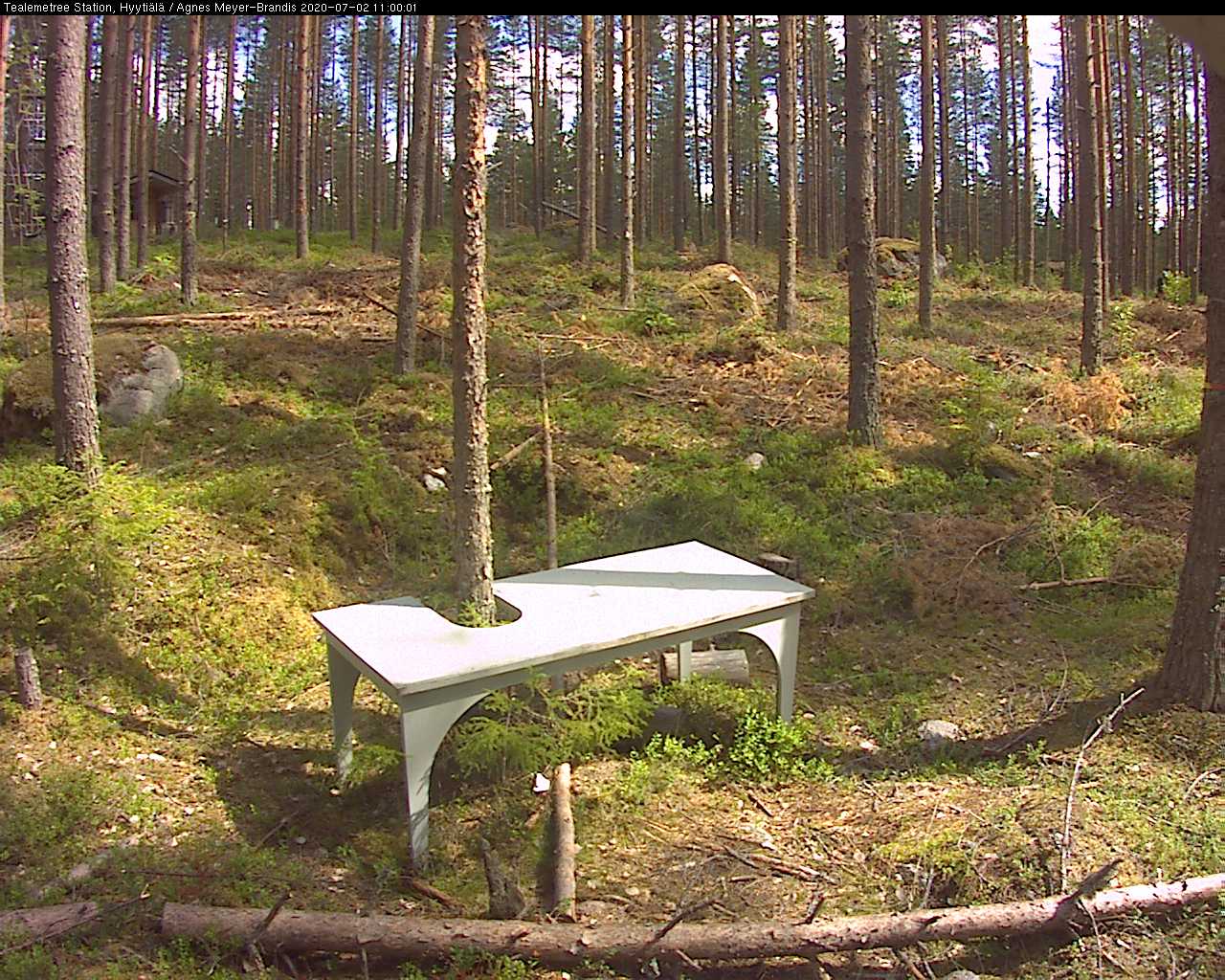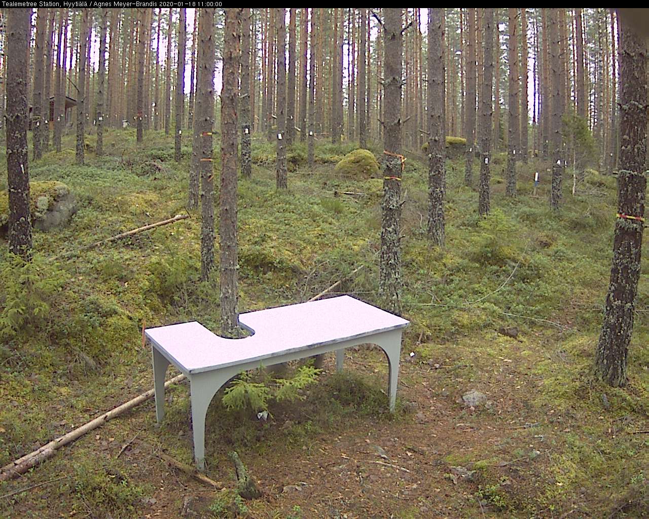 Agnes Meyer-Brandiksen työ Hyytiälässä alkoi tutustumalla aseman muihin tutkijoihin. Pystyäkseen tapaamaan ihmisiä metsässä, hän rakensi pöydän, josta muodostui kohtauspiste ja paikka teehetkille Agneksen ja puun kanssa.