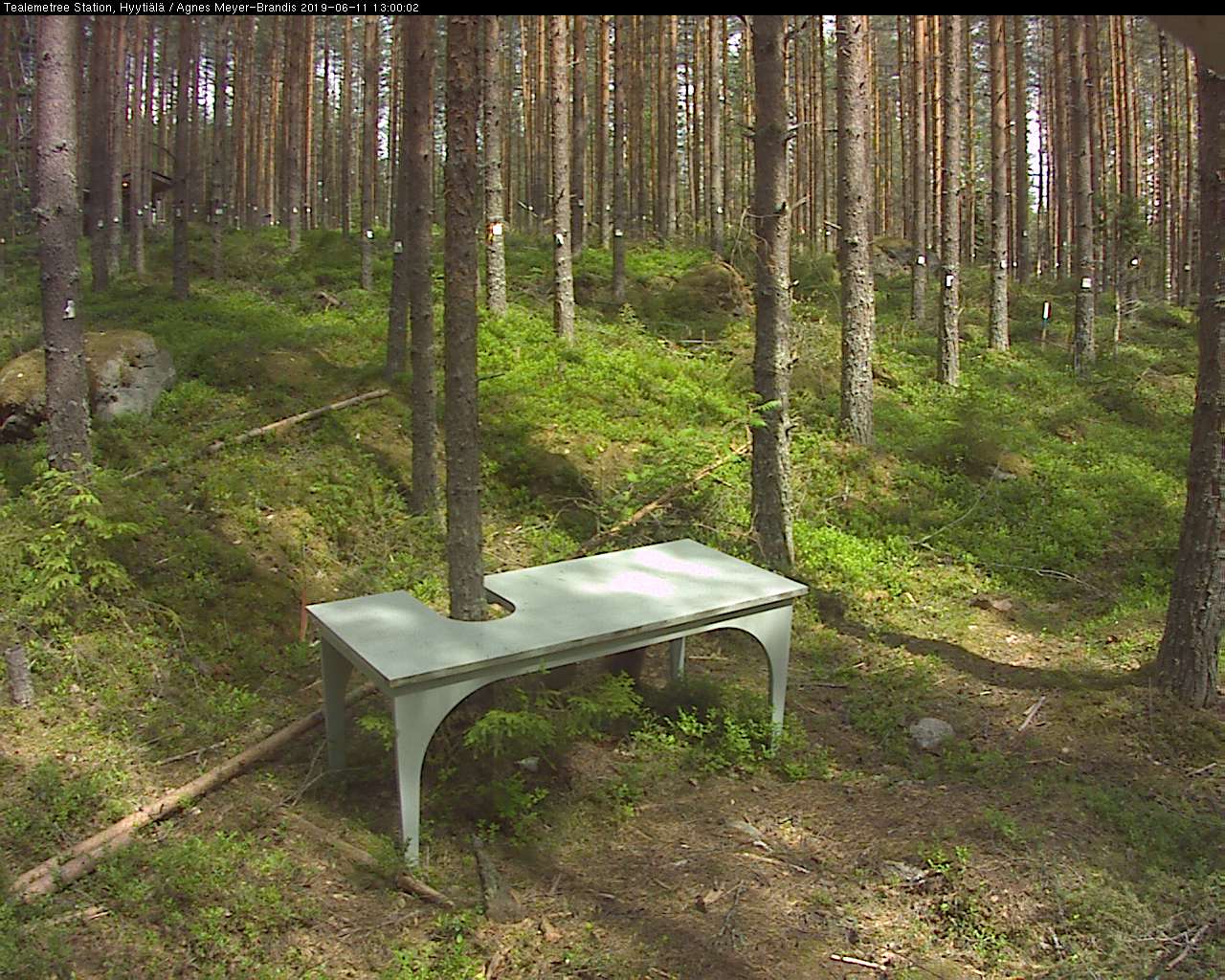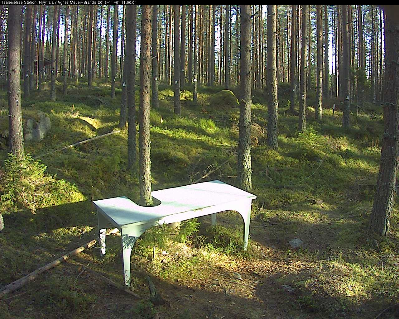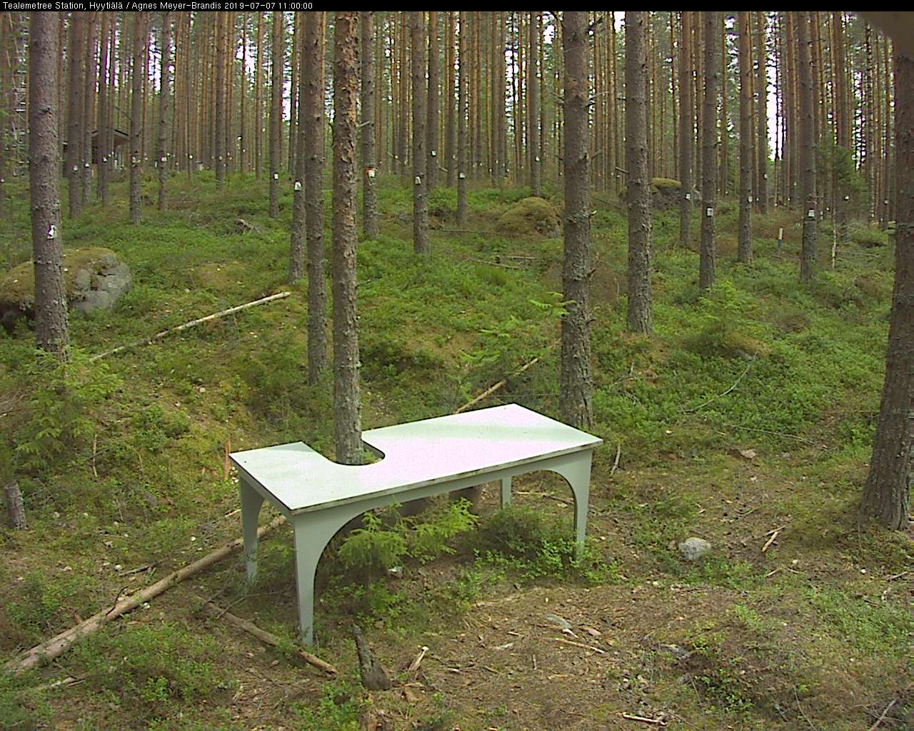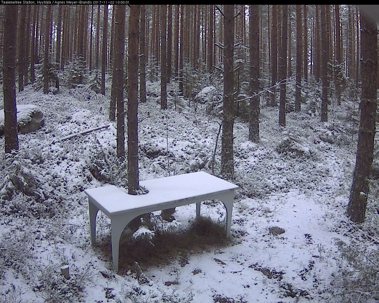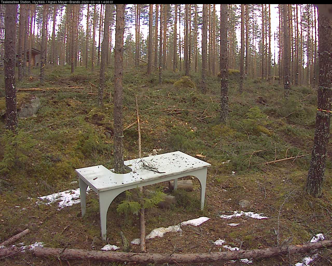 Agnes Meyer-Brandiksen työ Hyytiälässä alkoi tutustumalla aseman muihin tutkijoihin. Pystyäkseen tapaamaan ihmisiä metsässä, hän rakensi pöydän, josta muodostui kohtauspiste ja paikka teehetkille Agneksen ja puun kanssa.