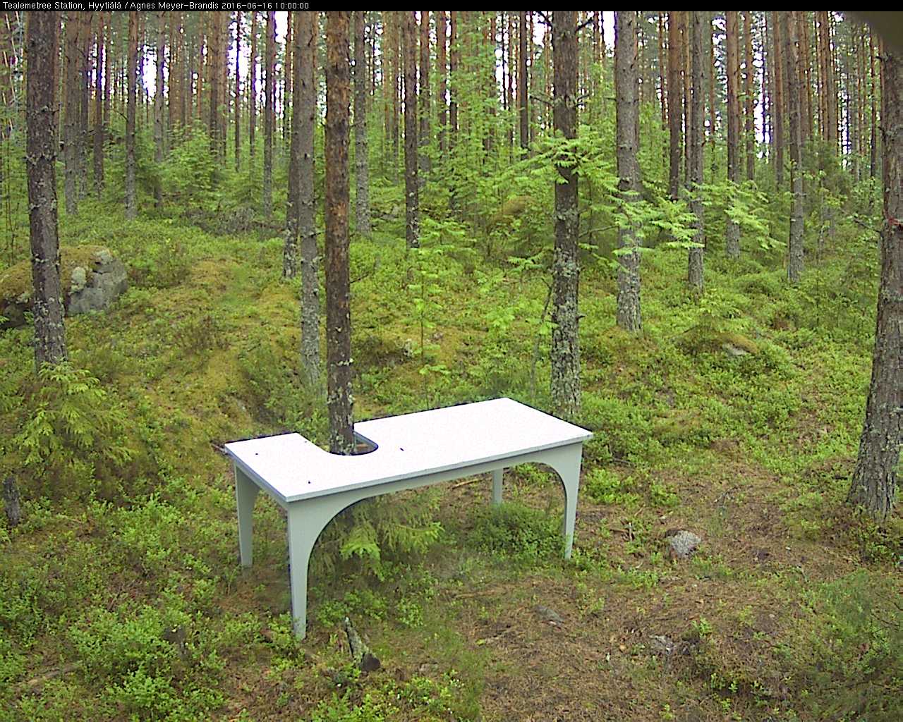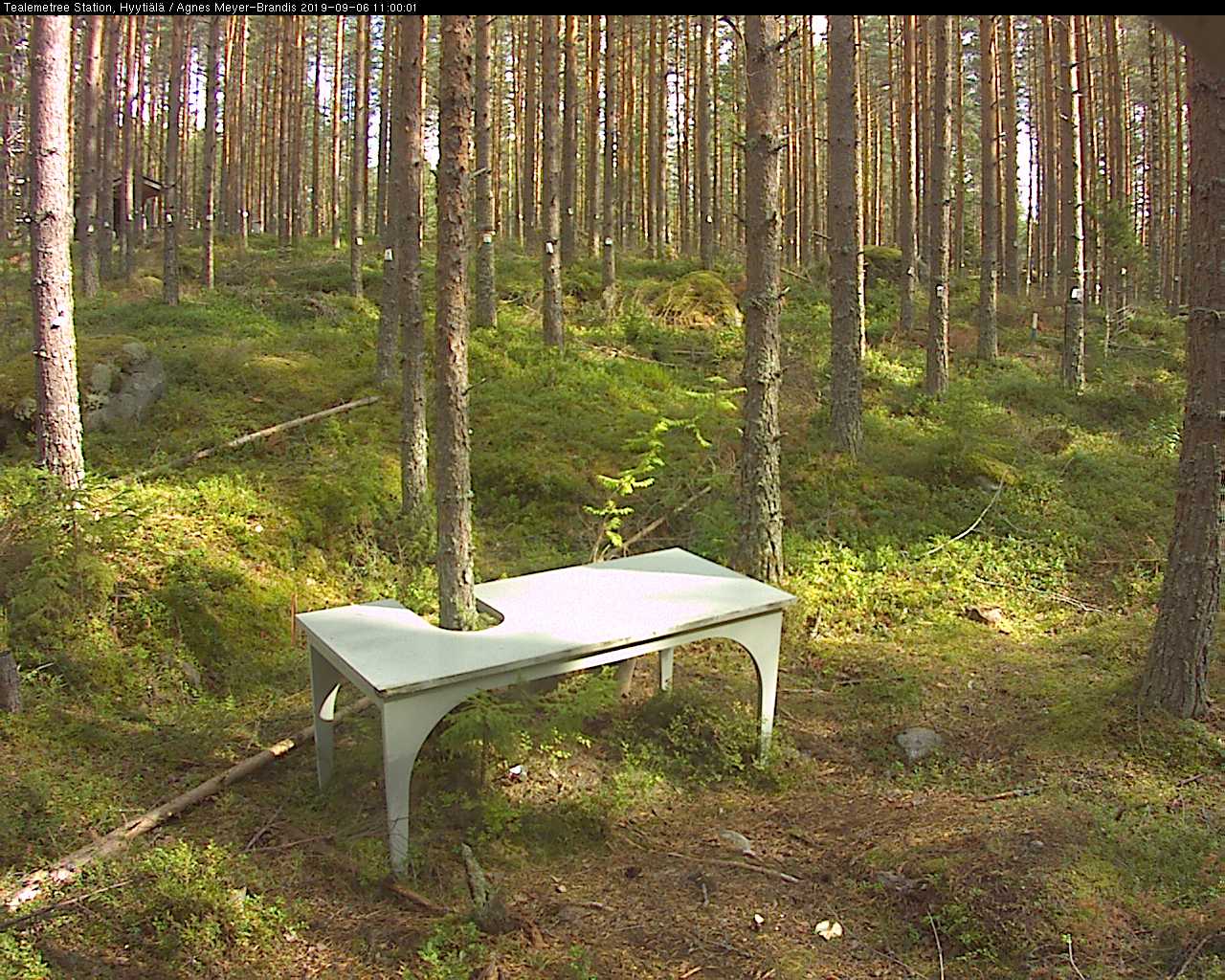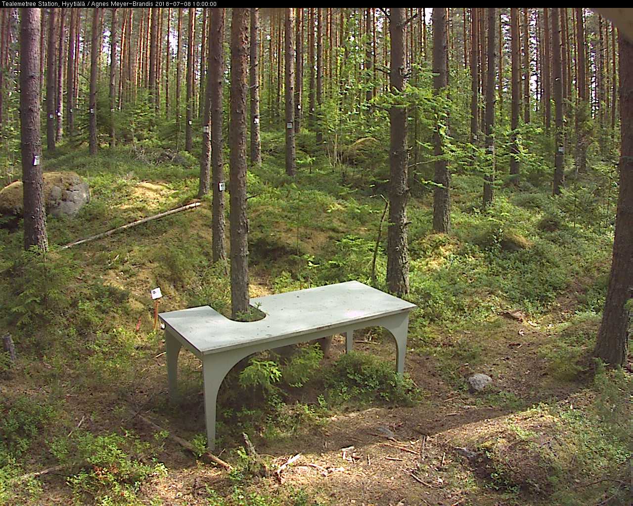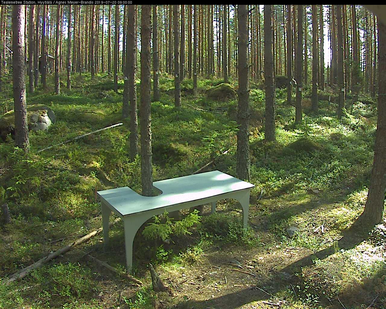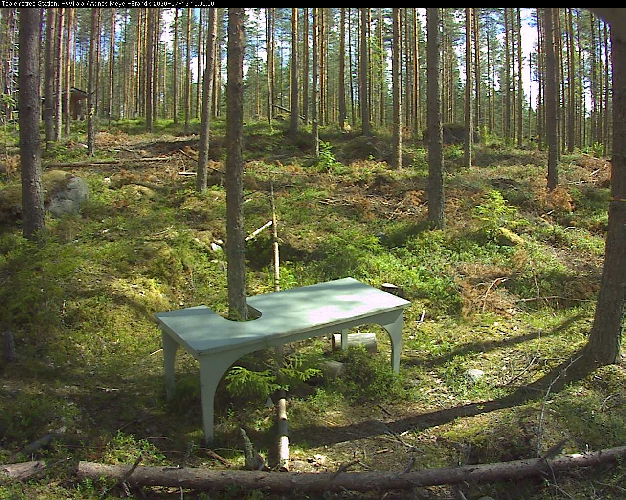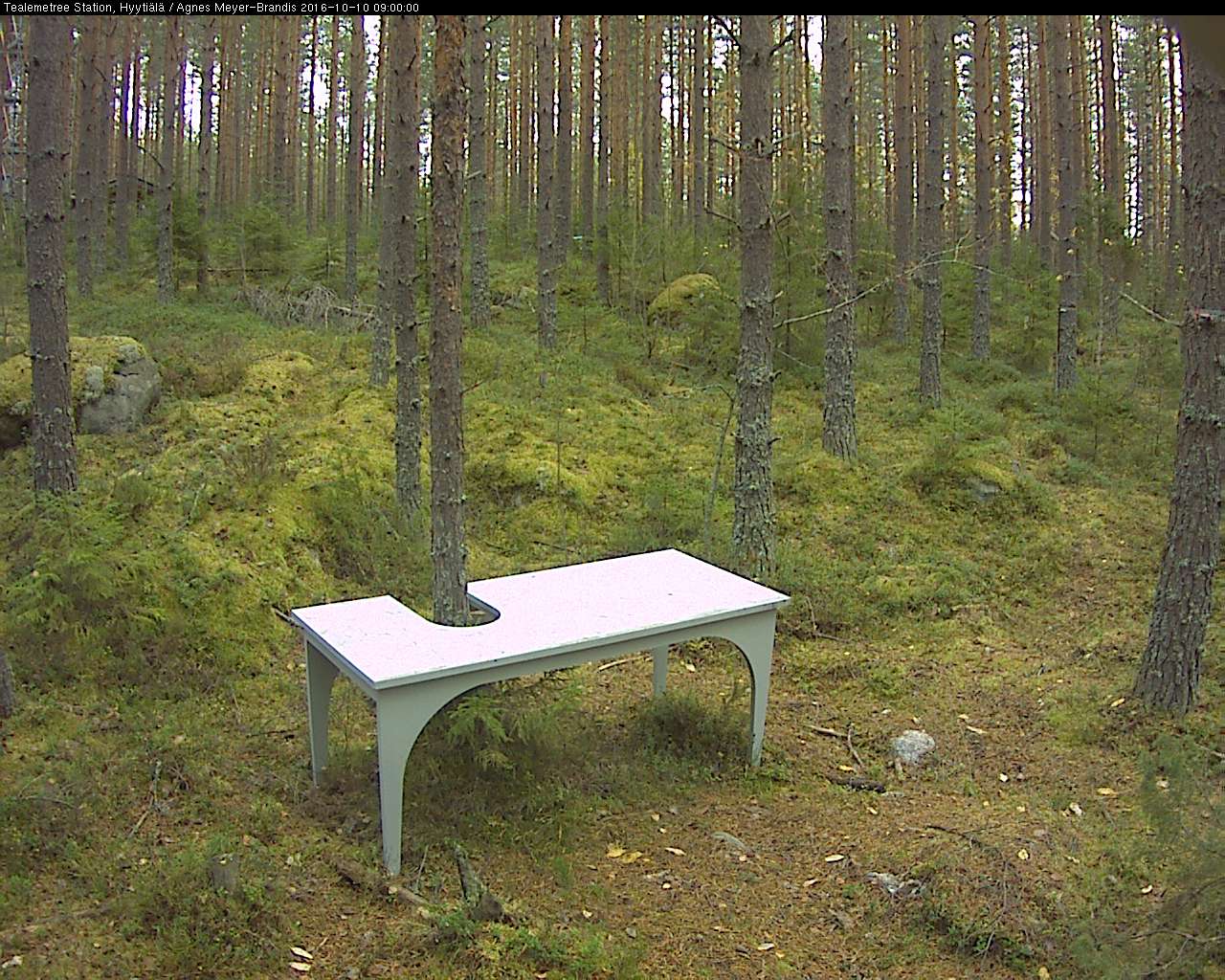 Agnes Meyer-Brandiksen työ Hyytiälässä alkoi tutustumalla aseman muihin tutkijoihin. Pystyäkseen tapaamaan ihmisiä metsässä, hän rakensi pöydän, josta muodostui kohtauspiste ja paikka teehetkille Agneksen ja puun kanssa.