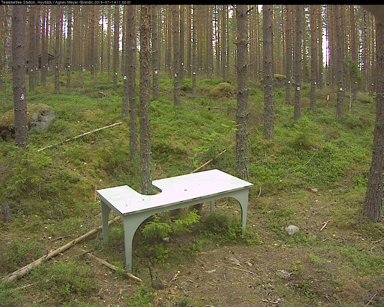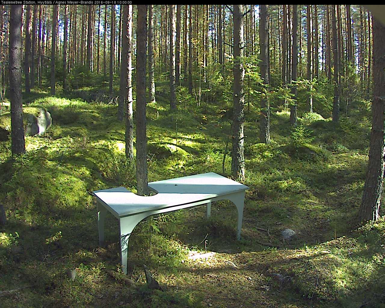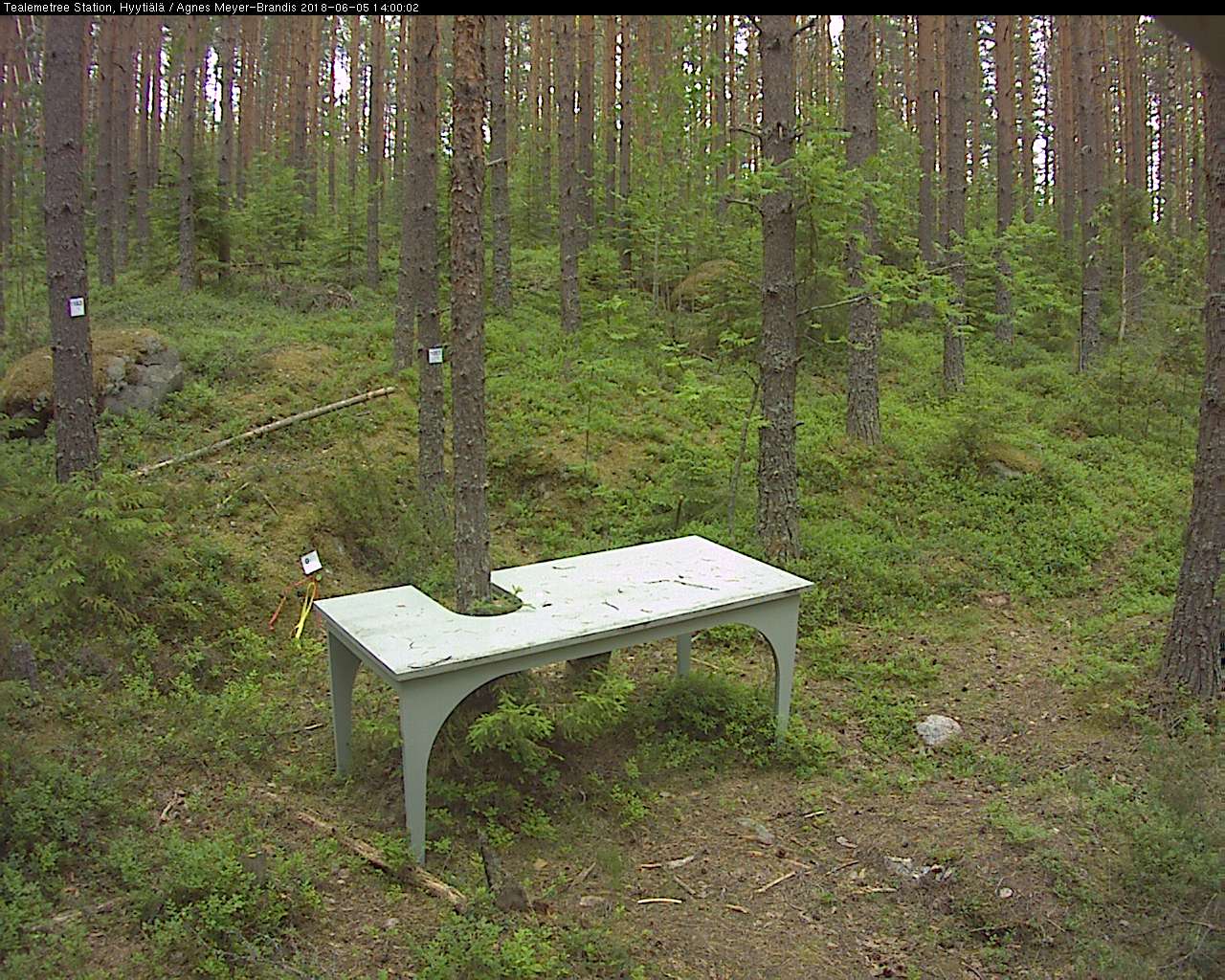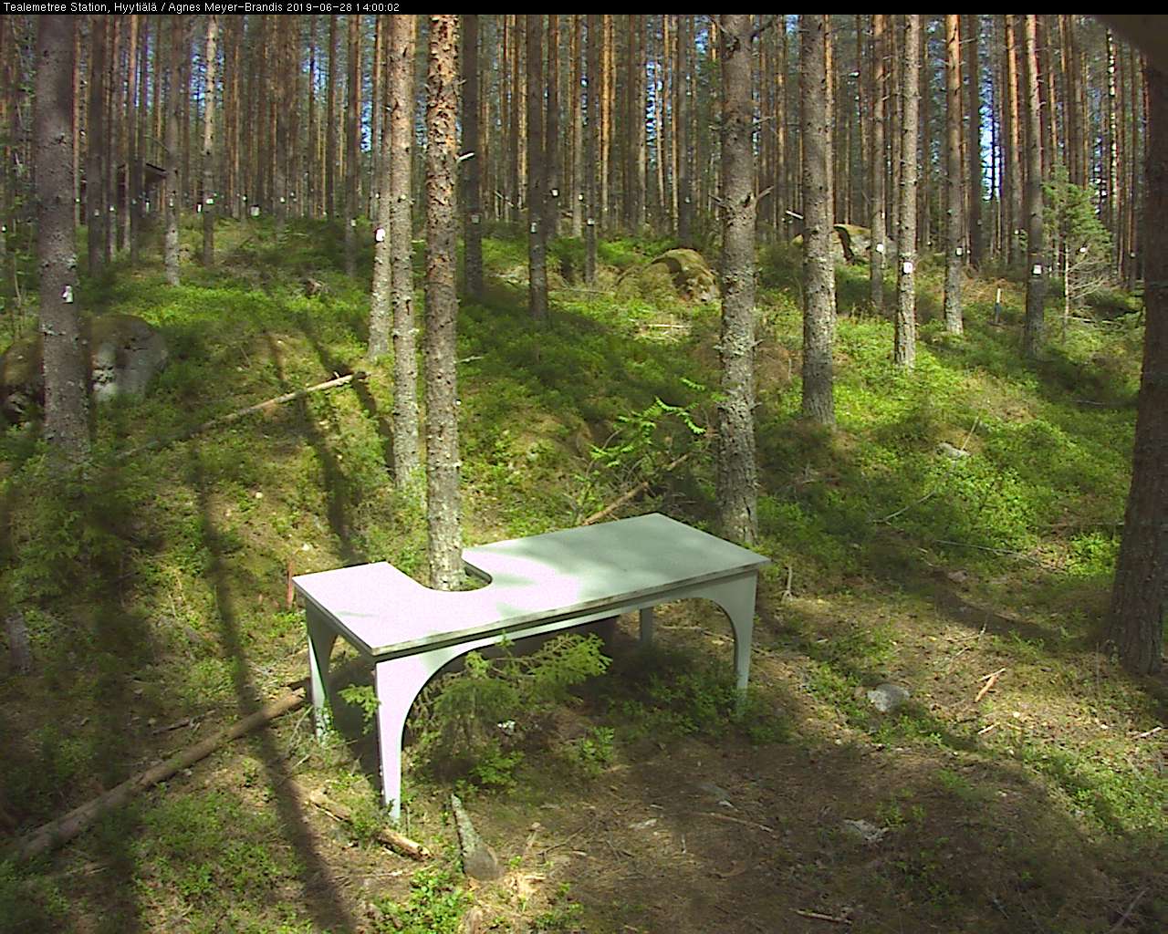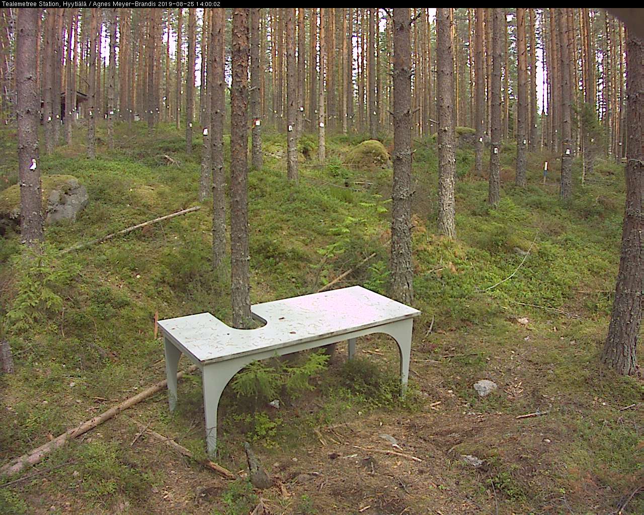 Agnes Meyer-Brandiksen työ Hyytiälässä alkoi tutustumalla aseman muihin tutkijoihin. Pystyäkseen tapaamaan ihmisiä metsässä, hän rakensi pöydän, josta muodostui kohtauspiste ja paikka teehetkille Agneksen ja puun kanssa.