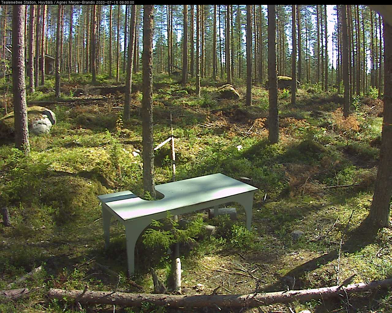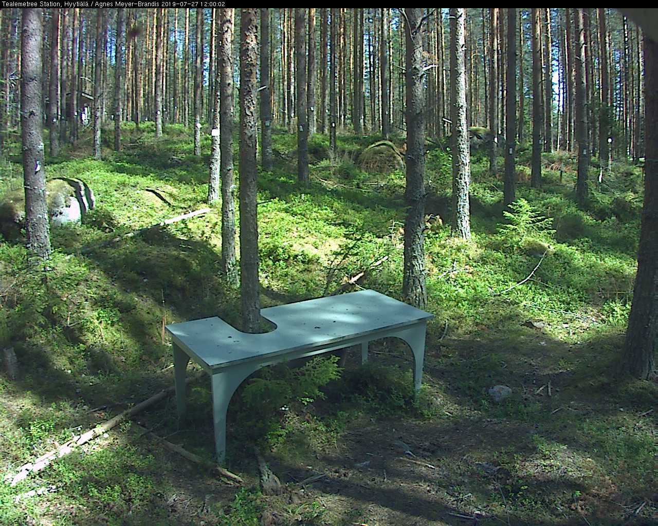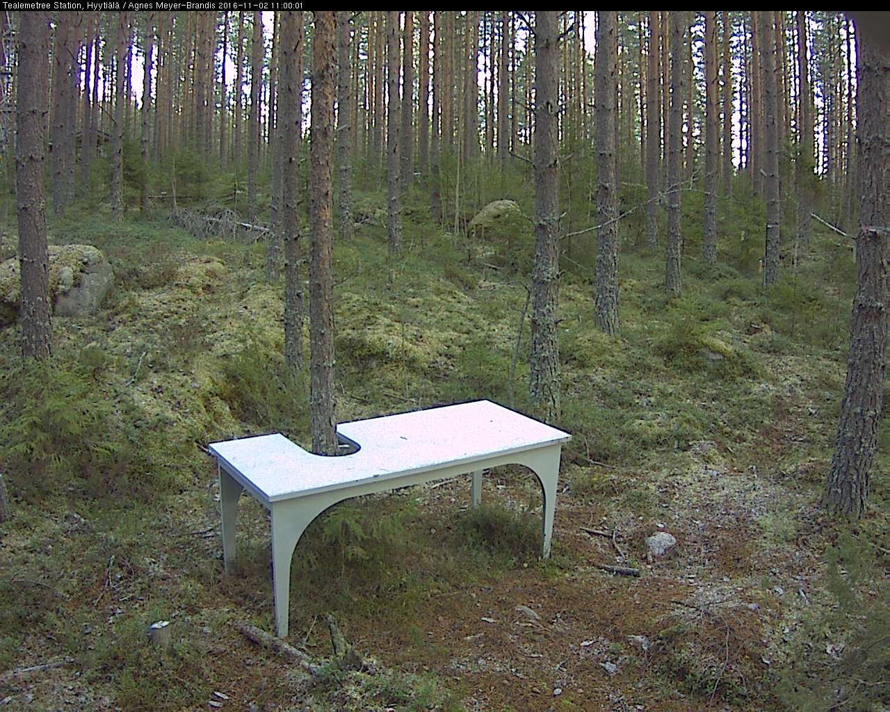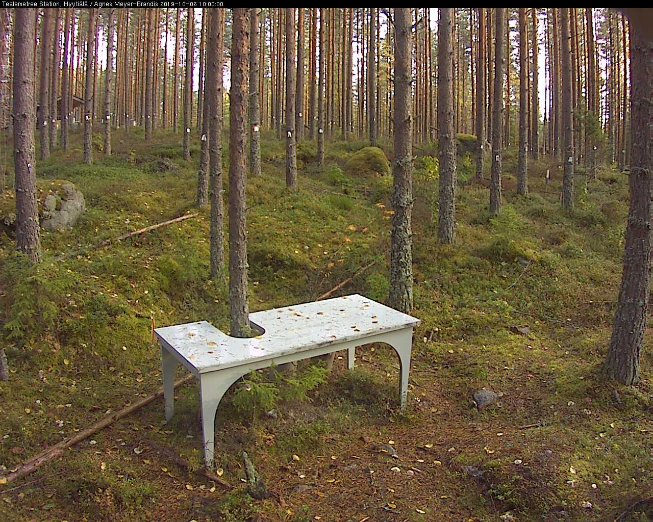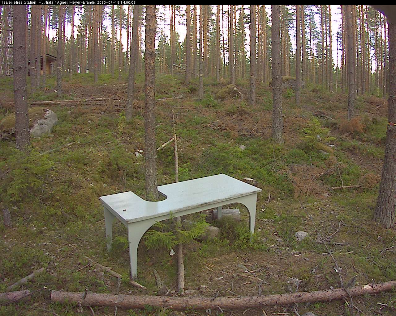 Agnes Meyer-Brandiksen työ Hyytiälässä alkoi tutustumalla aseman muihin tutkijoihin. Pystyäkseen tapaamaan ihmisiä metsässä, hän rakensi pöydän, josta muodostui kohtauspiste ja paikka teehetkille Agneksen ja puun kanssa.