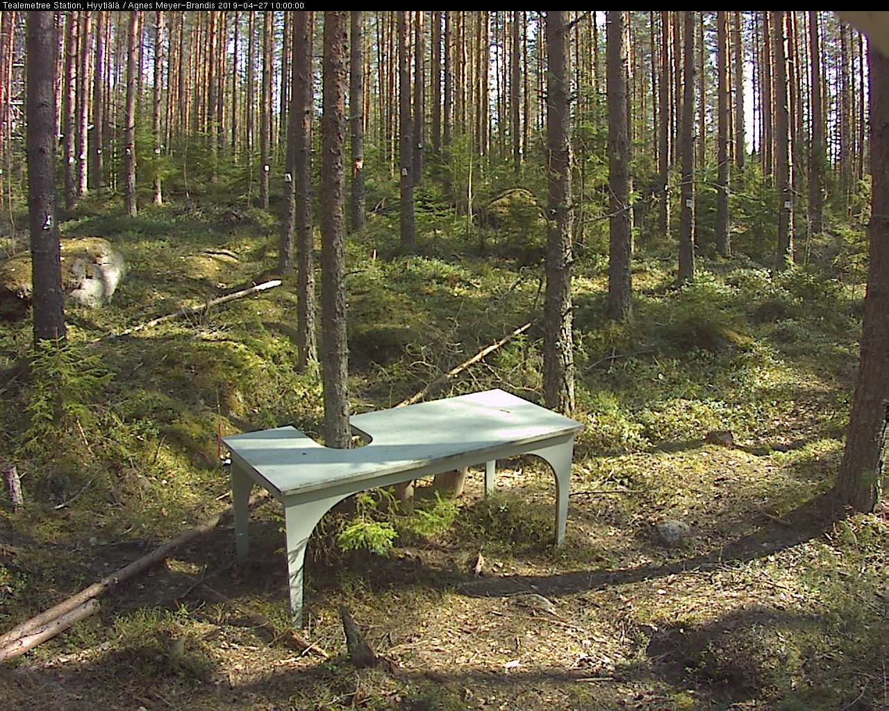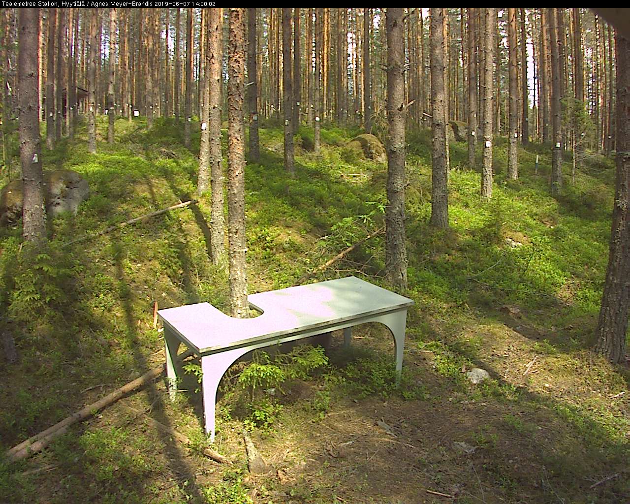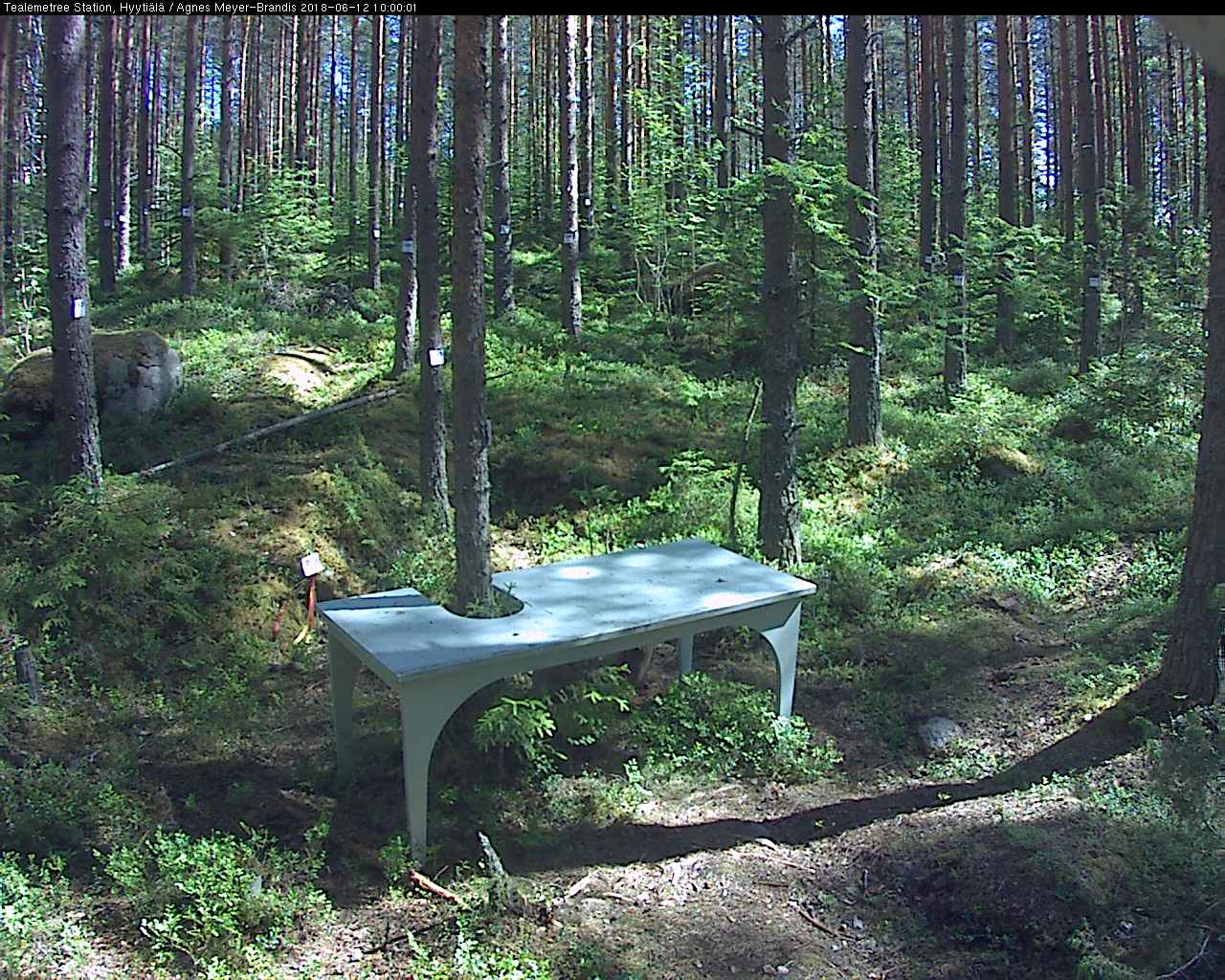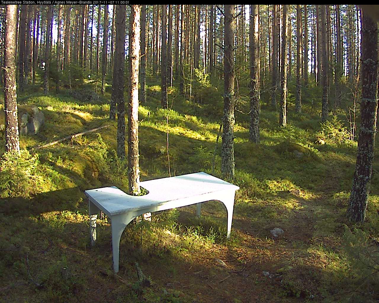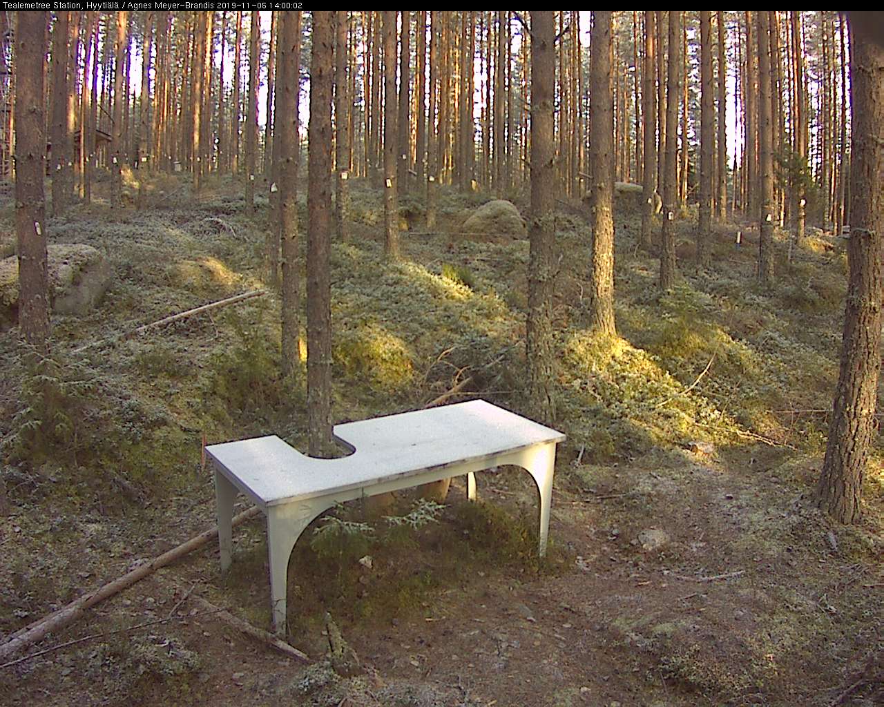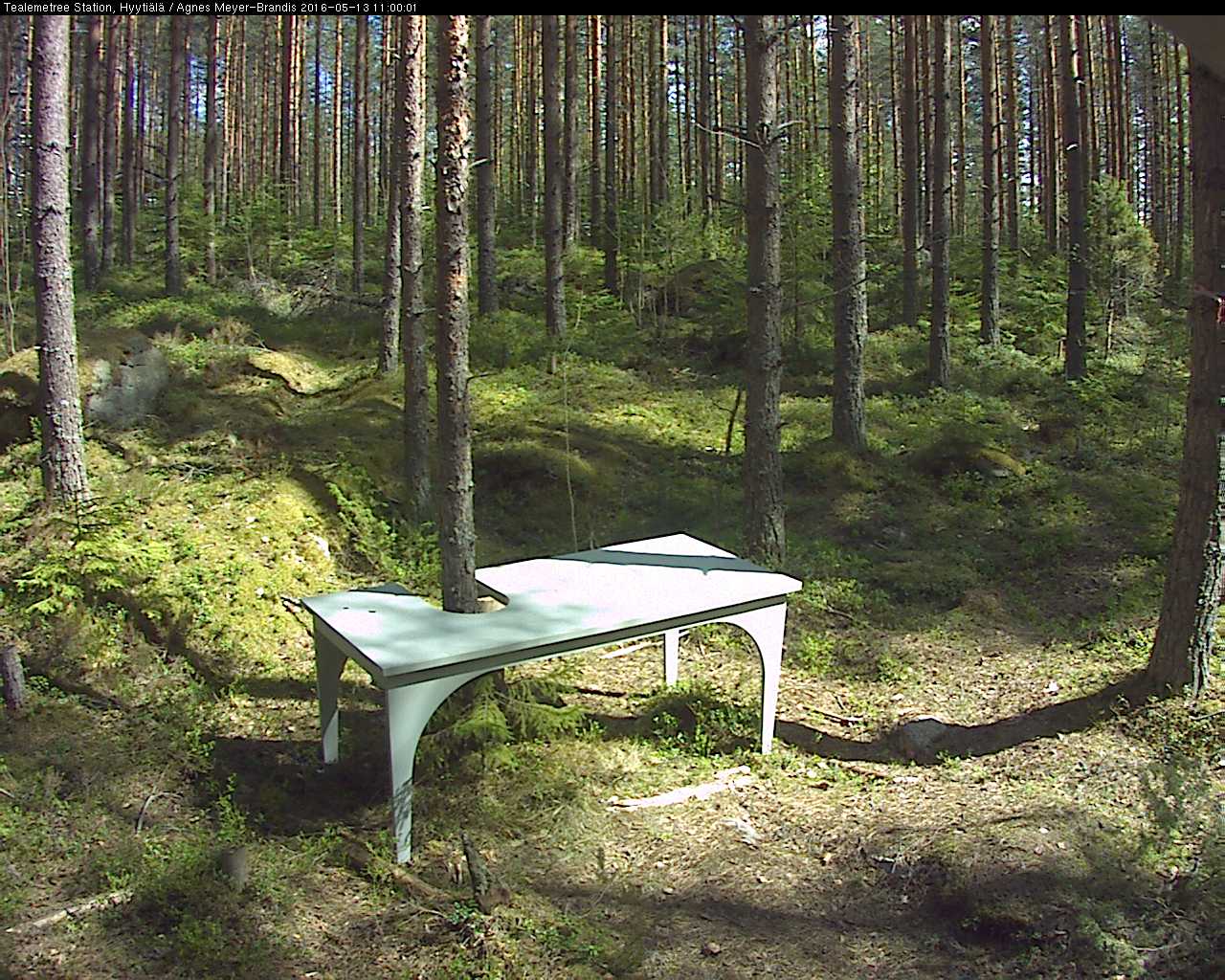 Agnes Meyer-Brandiksen työ Hyytiälässä alkoi tutustumalla aseman muihin tutkijoihin. Pystyäkseen tapaamaan ihmisiä metsässä, hän rakensi pöydän, josta muodostui kohtauspiste ja paikka teehetkille Agneksen ja puun kanssa.