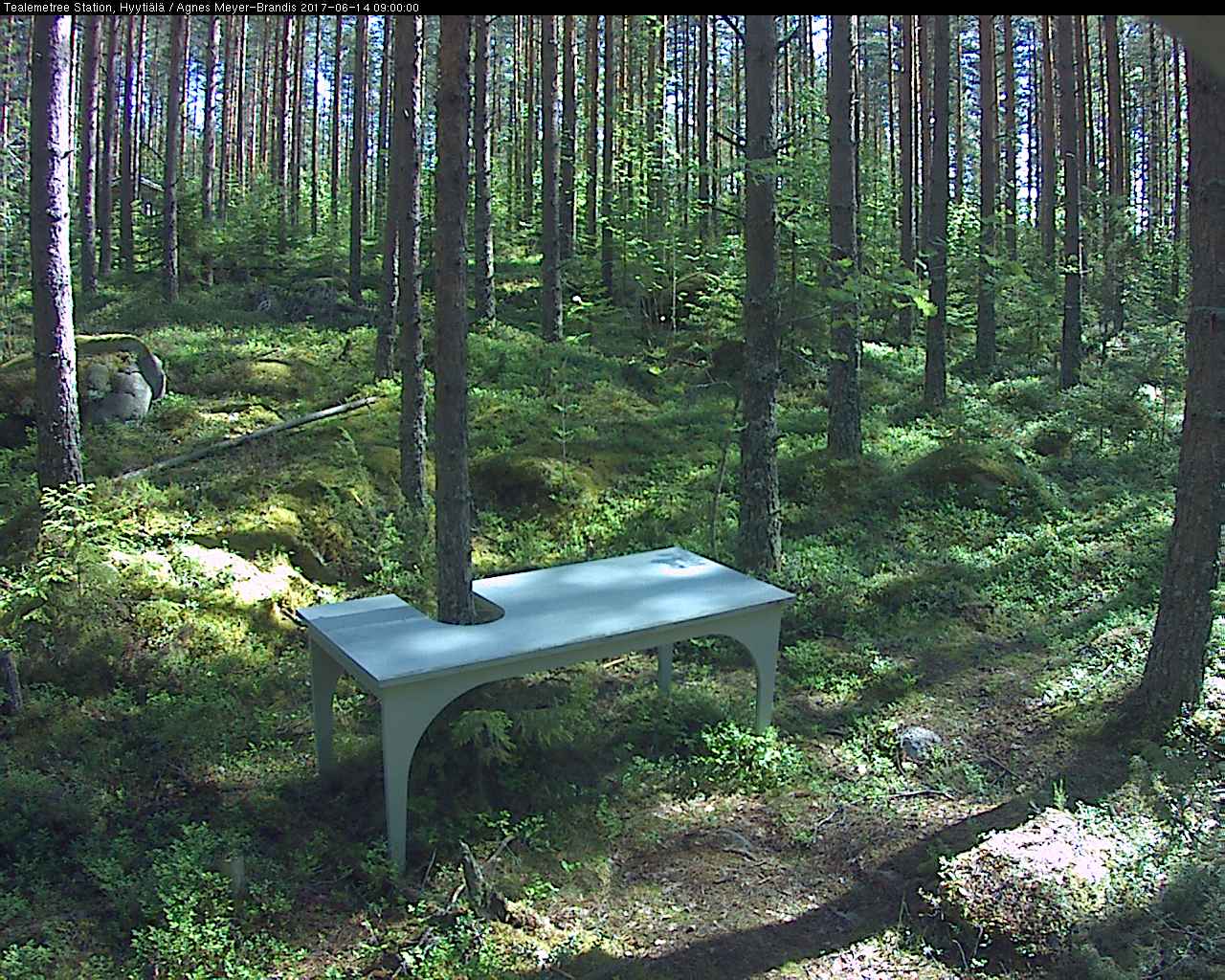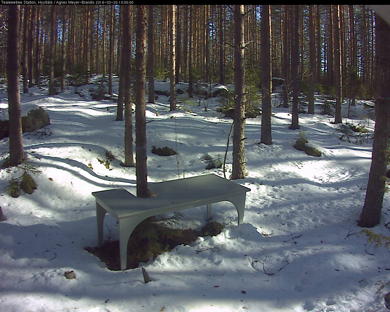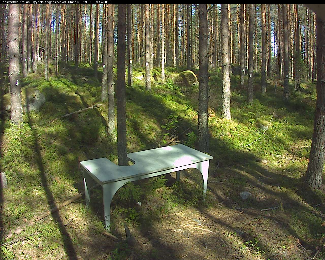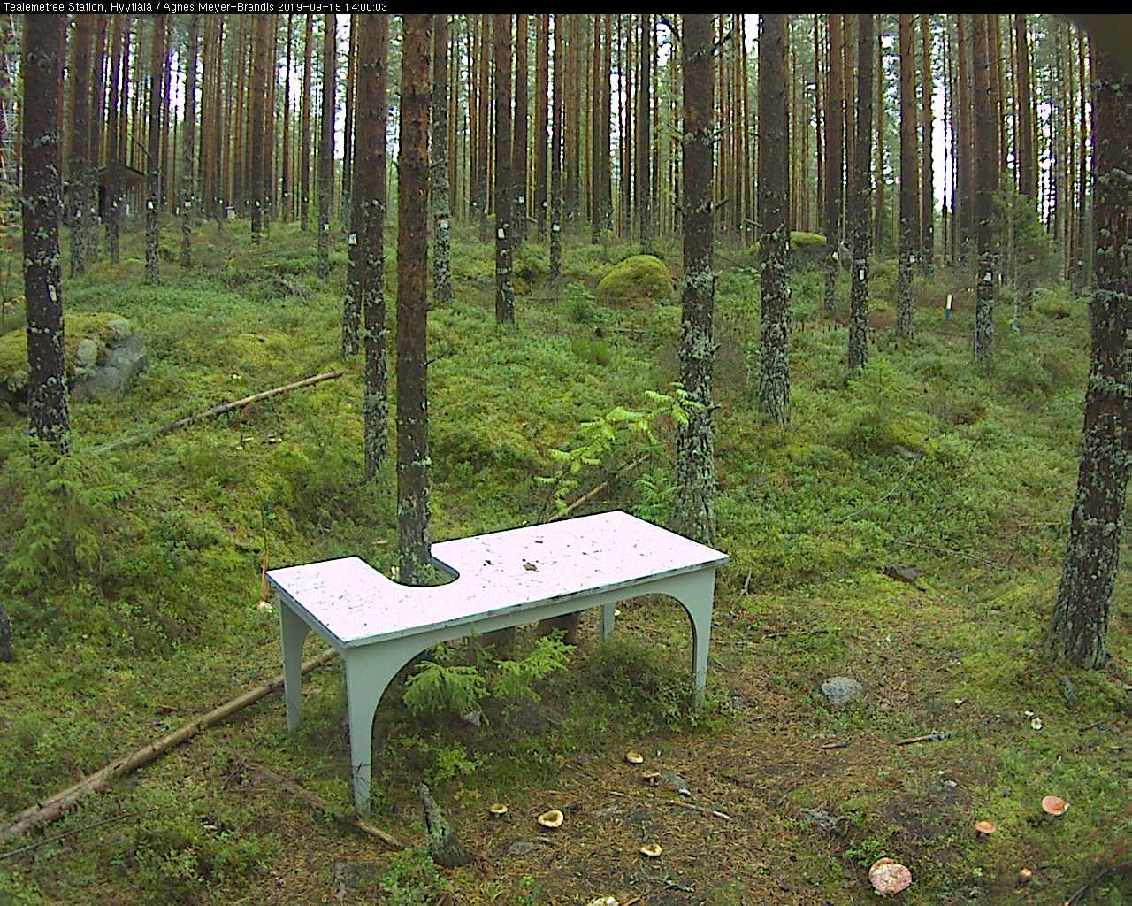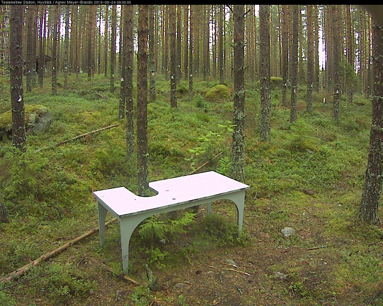 Agnes Meyer-Brandiksen työ Hyytiälässä alkoi tutustumalla aseman muihin tutkijoihin. Pystyäkseen tapaamaan ihmisiä metsässä, hän rakensi pöydän, josta muodostui kohtauspiste ja paikka teehetkille Agneksen ja puun kanssa.
