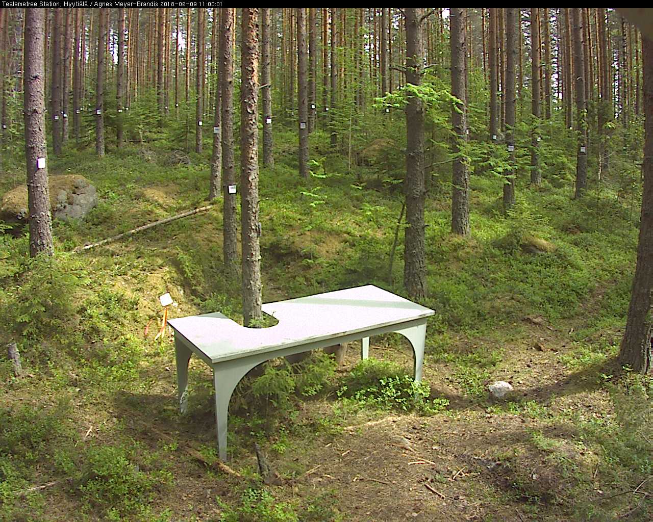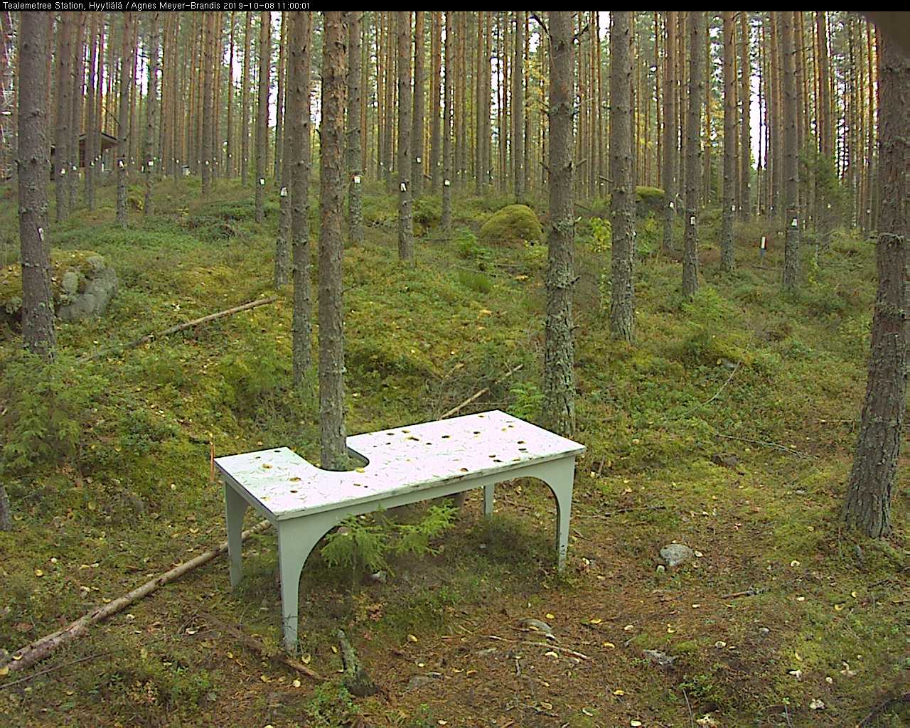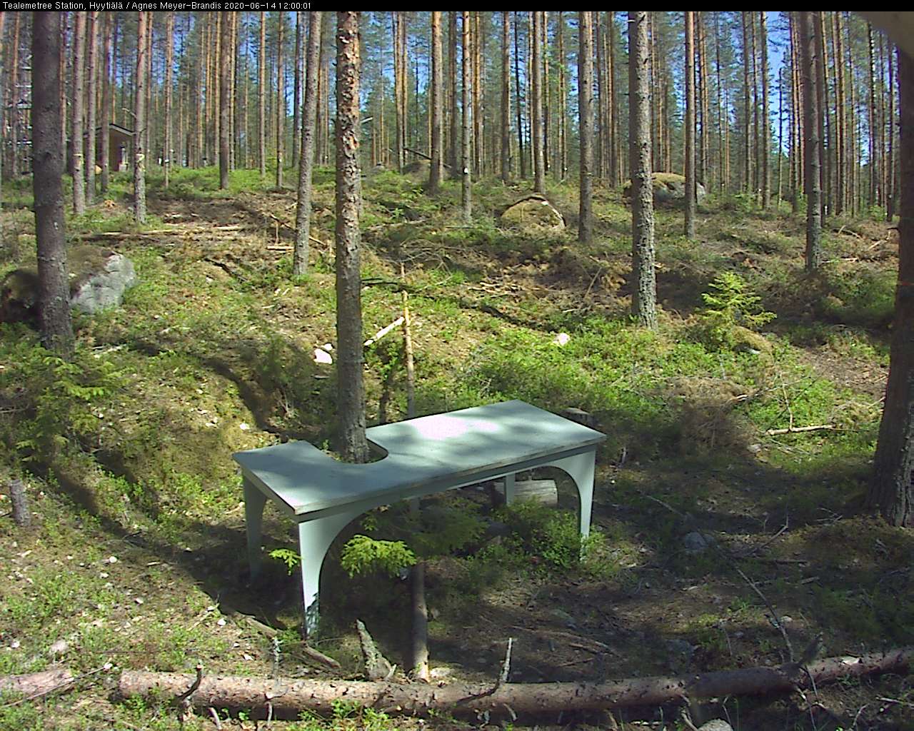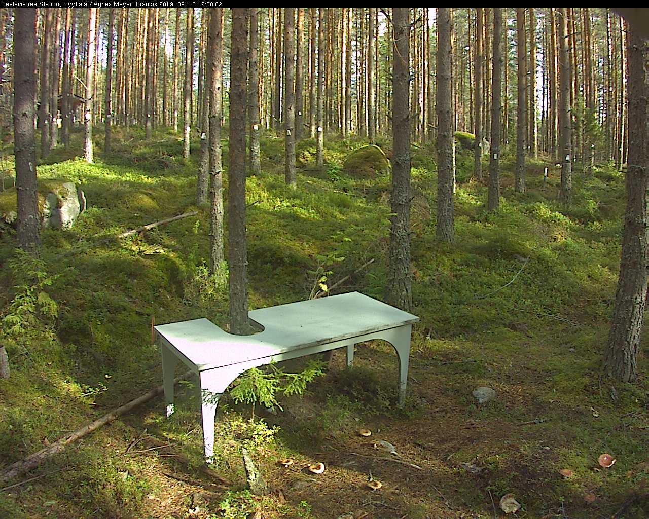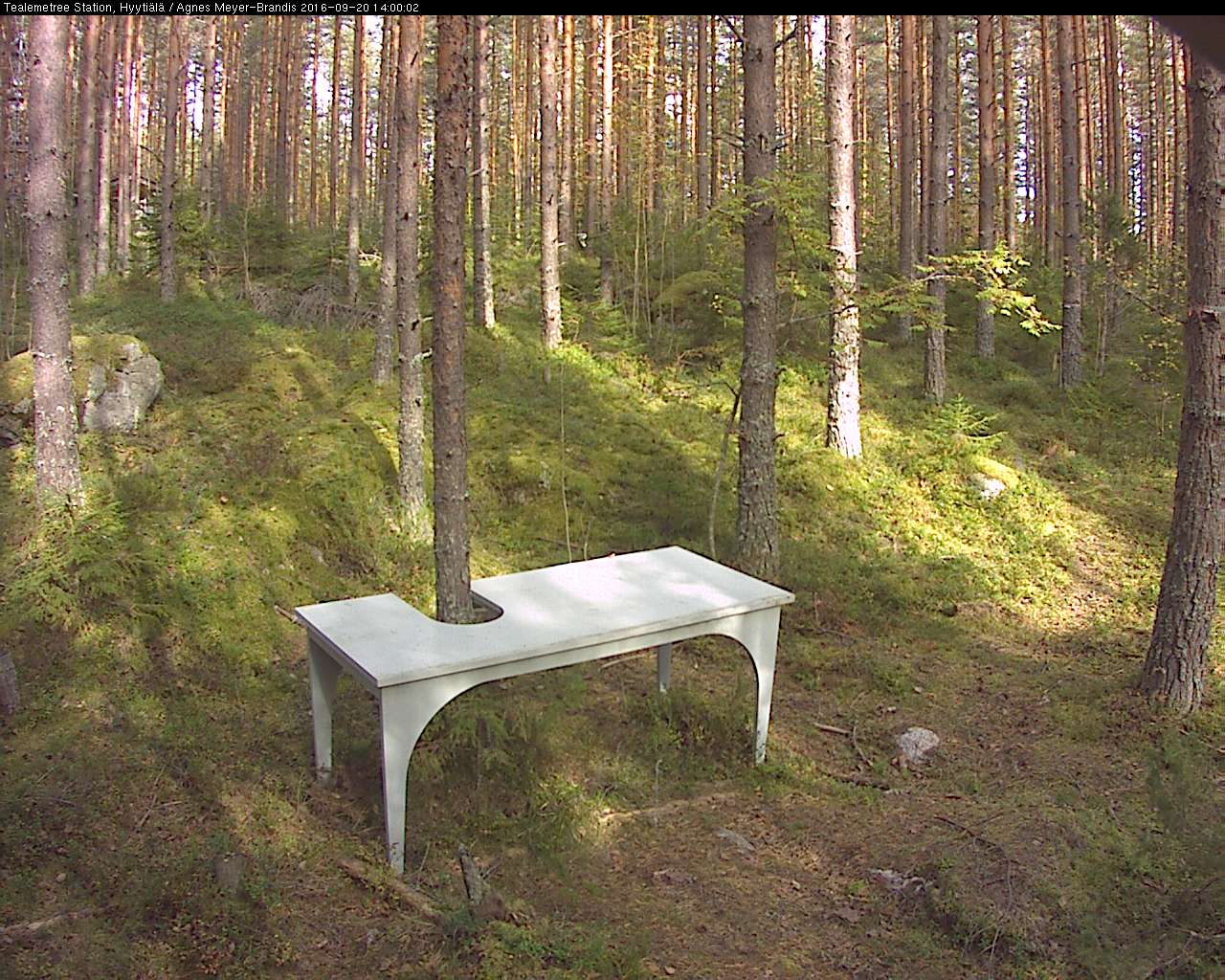 Agnes Meyer-Brandiksen työ Hyytiälässä alkoi tutustumalla aseman muihin tutkijoihin. Pystyäkseen tapaamaan ihmisiä metsässä, hän rakensi pöydän, josta muodostui kohtauspiste ja paikka teehetkille Agneksen ja puun kanssa.