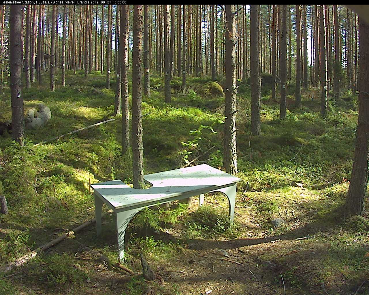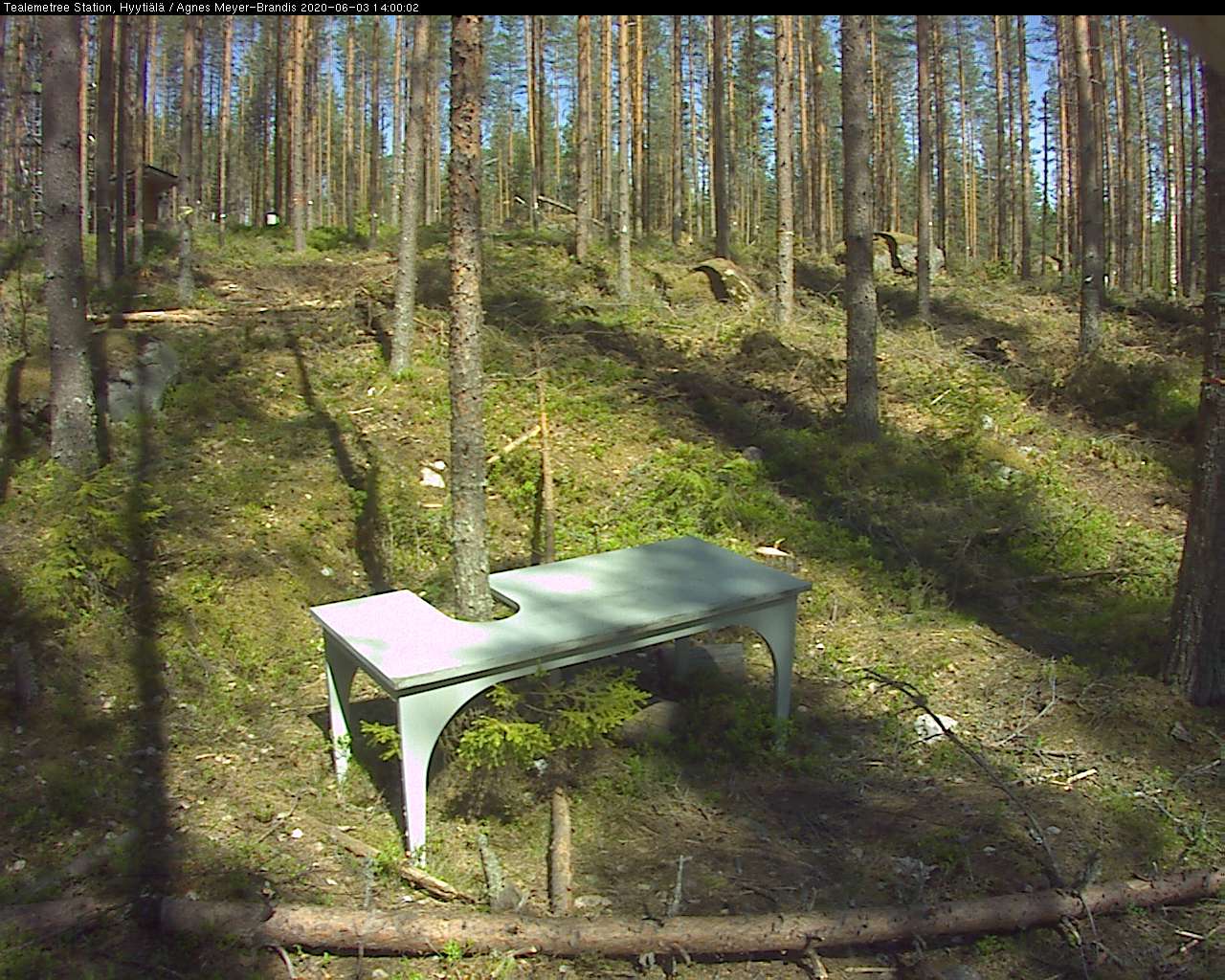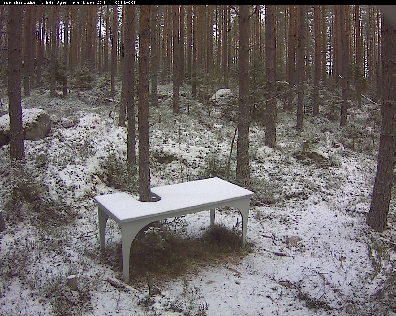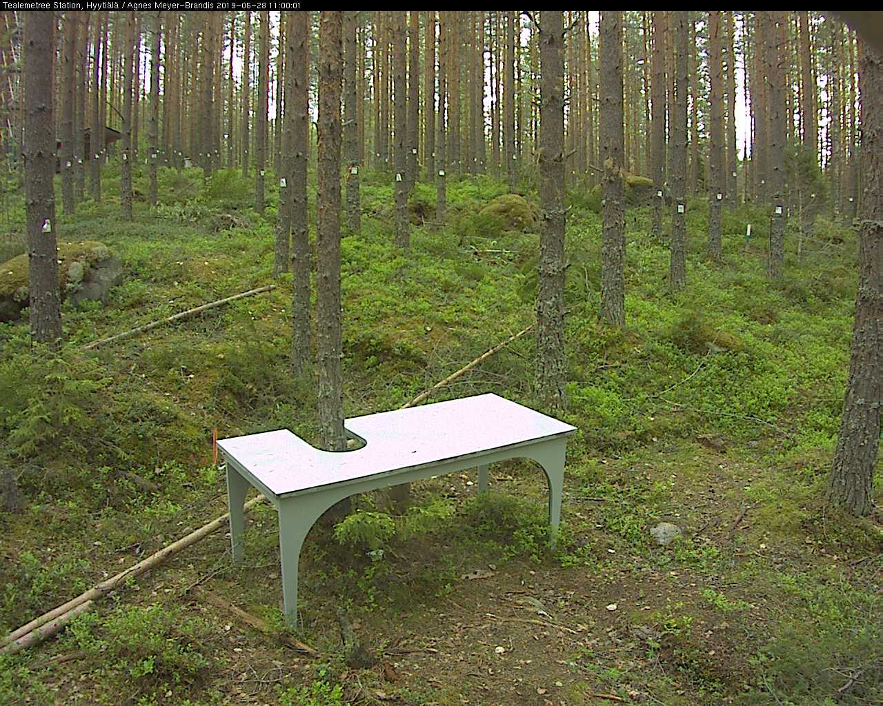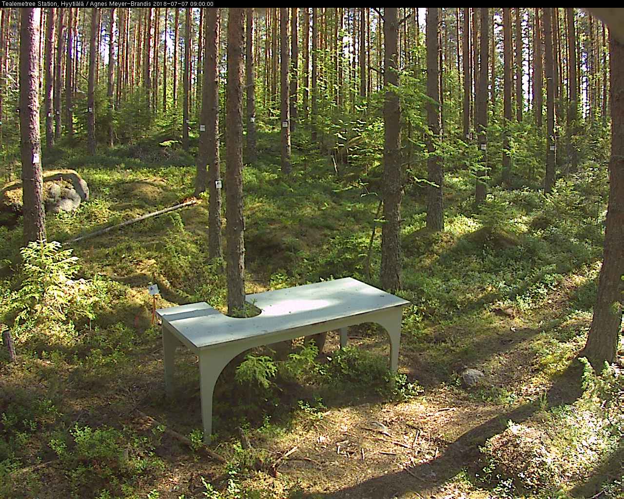 Agnes Meyer-Brandiksen työ Hyytiälässä alkoi tutustumalla aseman muihin tutkijoihin. Pystyäkseen tapaamaan ihmisiä metsässä, hän rakensi pöydän, josta muodostui kohtauspiste ja paikka teehetkille Agneksen ja puun kanssa.