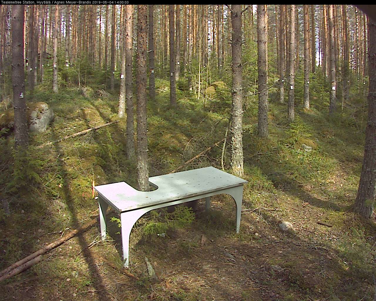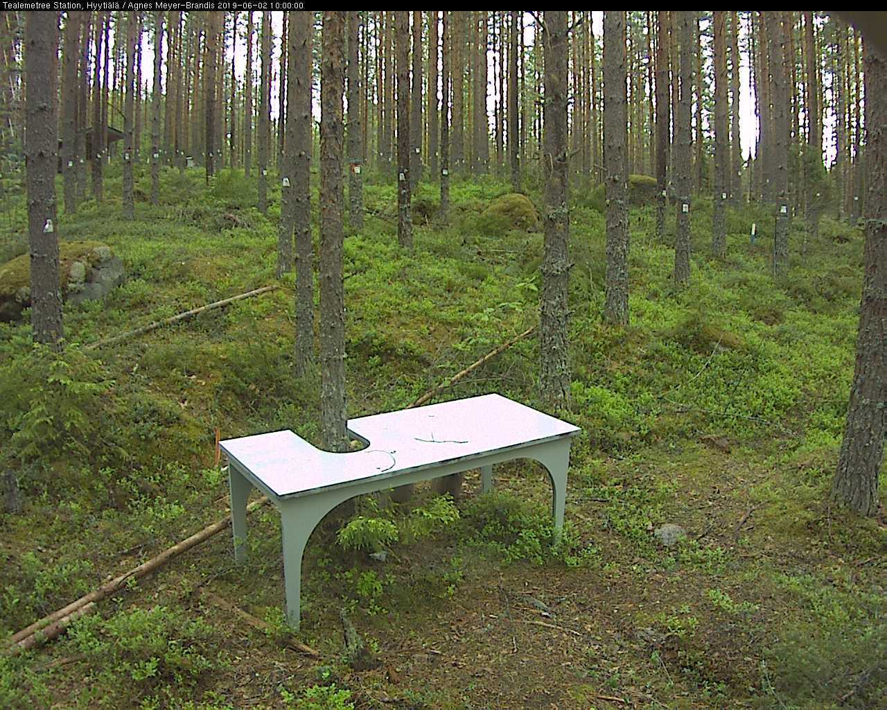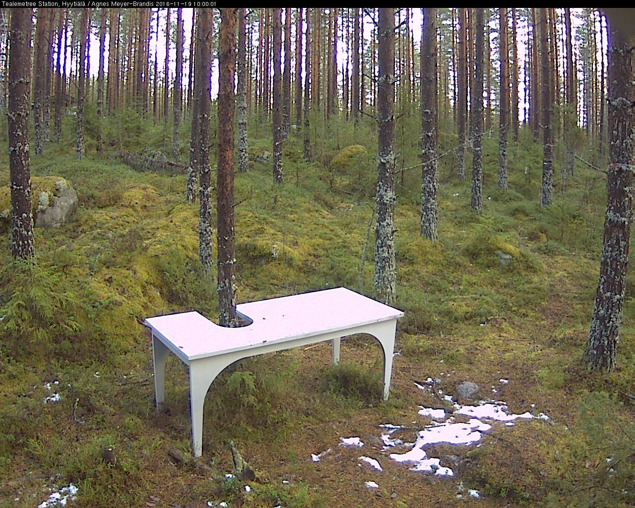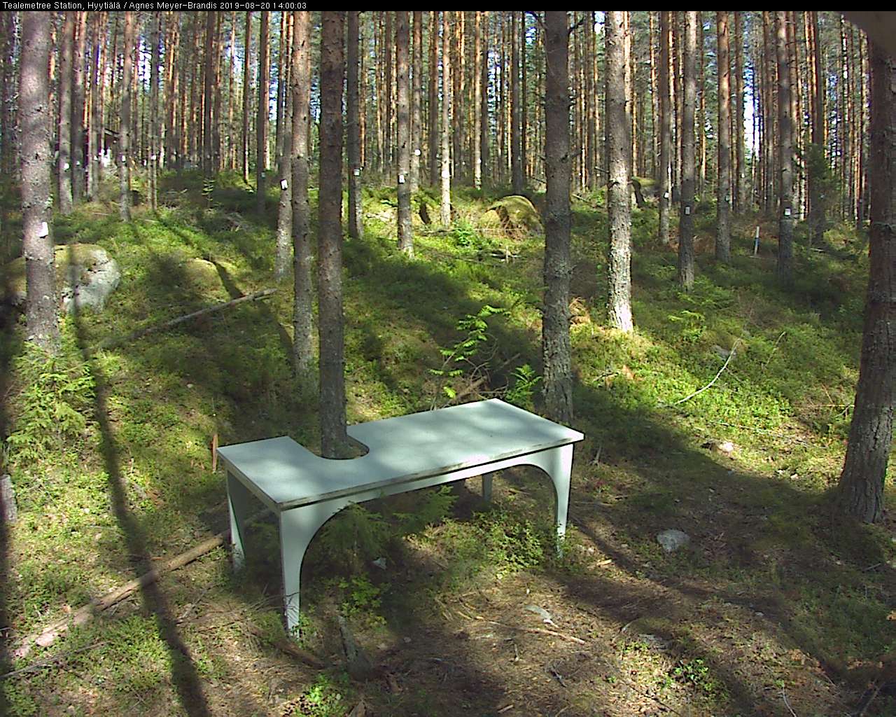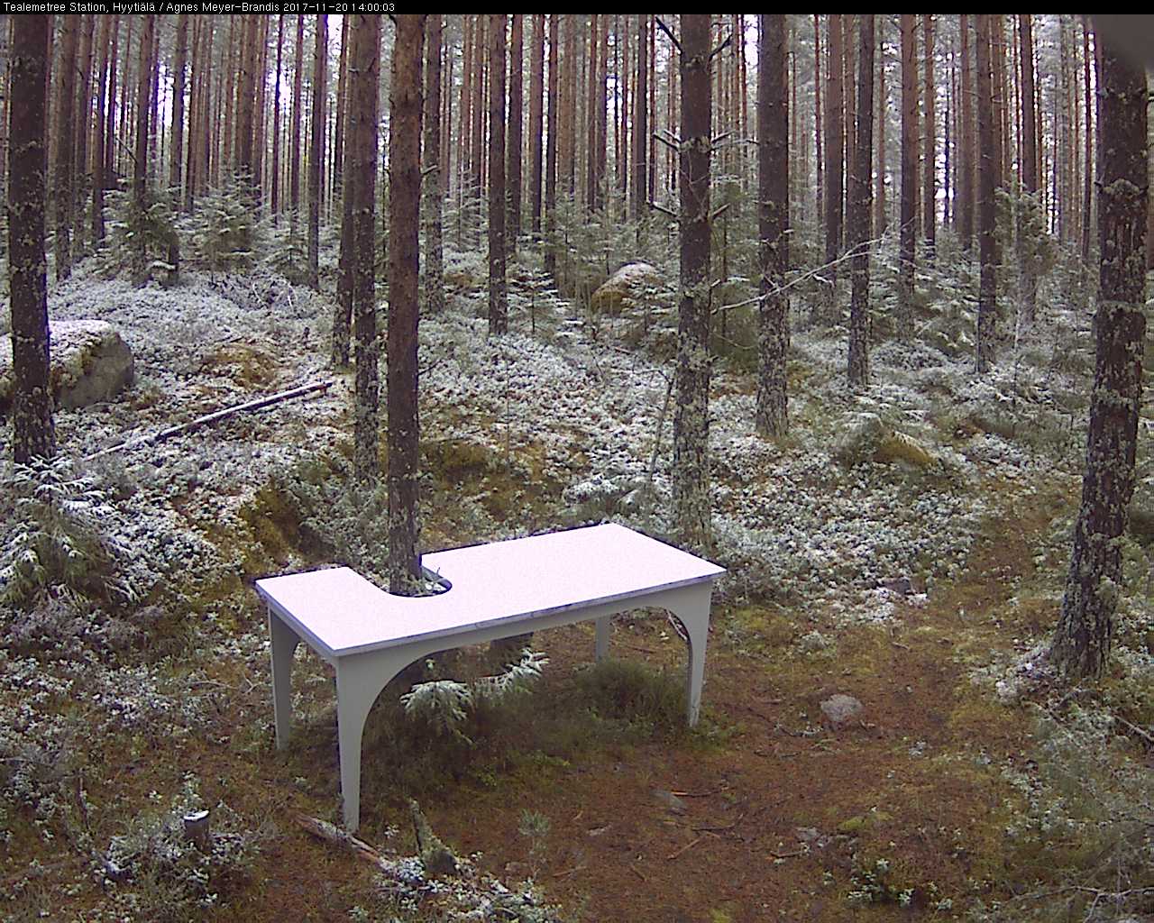Agnes Meyer-Brandiksen työ Hyytiälässä alkoi tutustumalla aseman muihin tutkijoihin. Pystyäkseen tapaamaan ihmisiä metsässä, hän rakensi pöydän, josta muodostui kohtauspiste ja paikka teehetkille Agneksen ja puun kanssa.