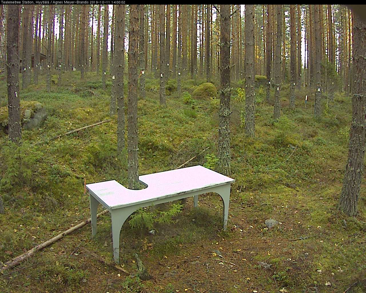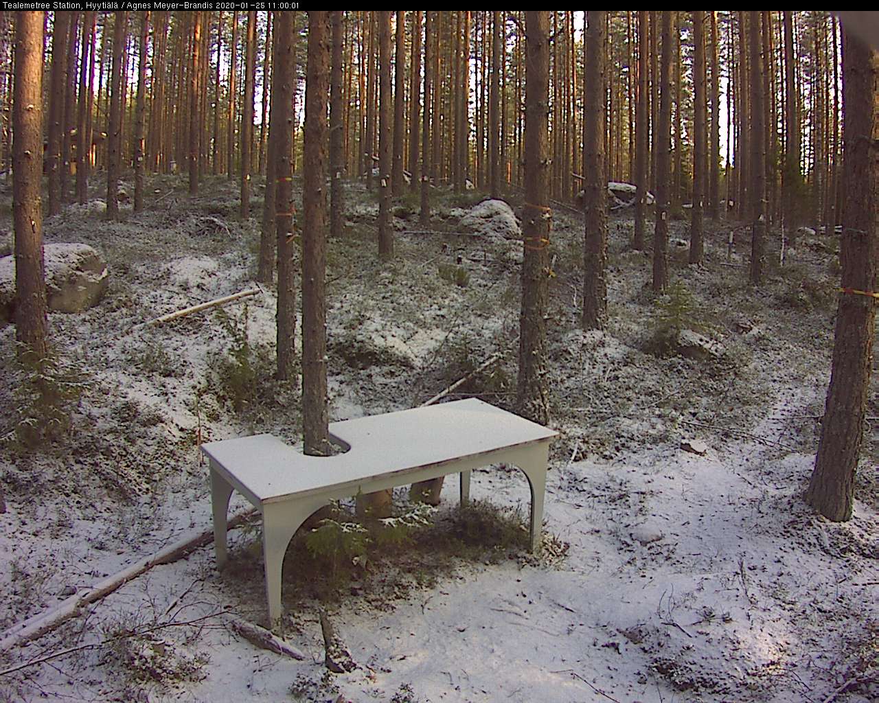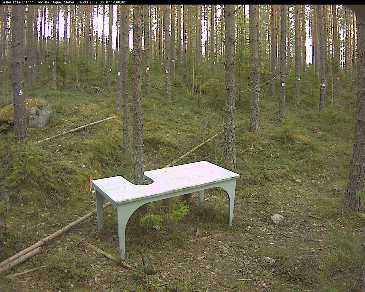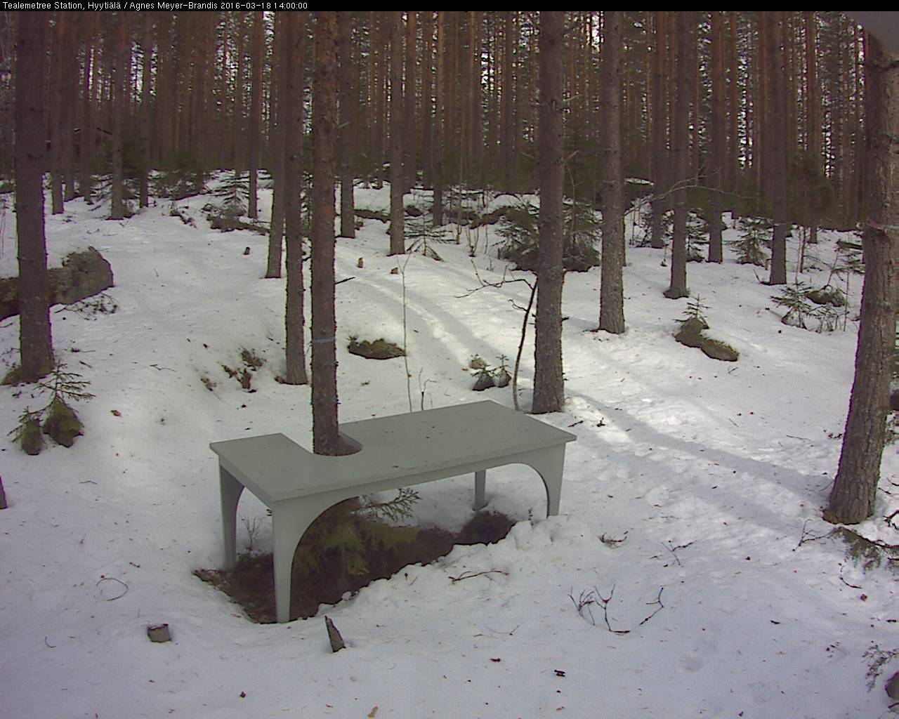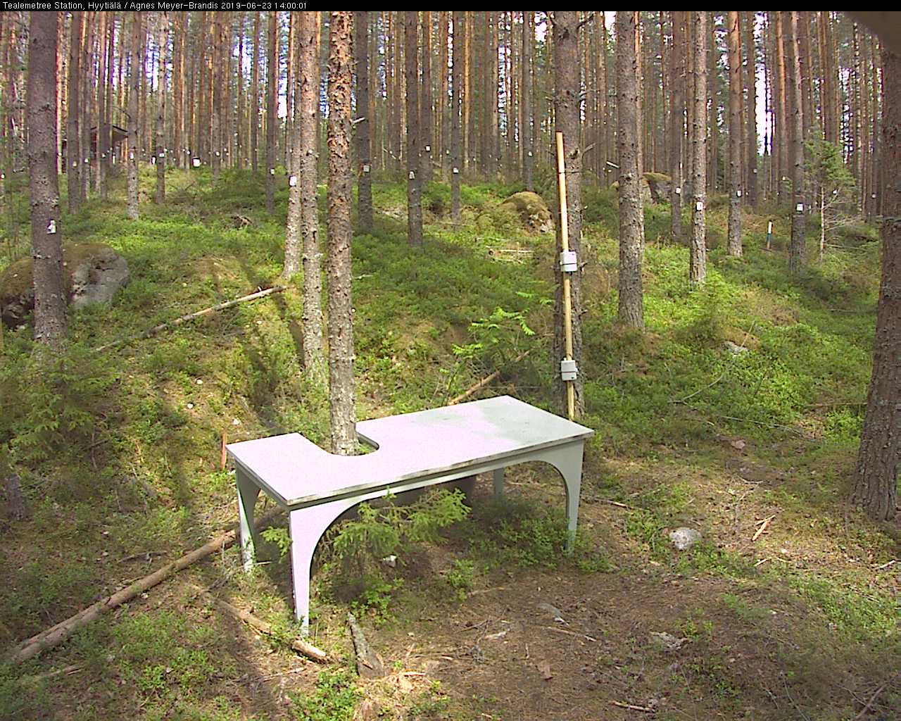 Agnes Meyer-Brandiksen työ Hyytiälässä alkoi tutustumalla aseman muihin tutkijoihin. Pystyäkseen tapaamaan ihmisiä metsässä, hän rakensi pöydän, josta muodostui kohtauspiste ja paikka teehetkille Agneksen ja puun kanssa.