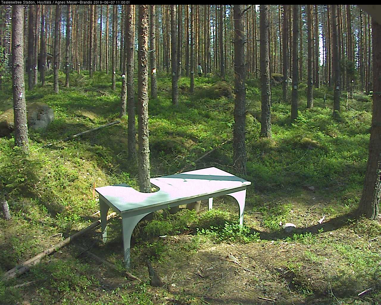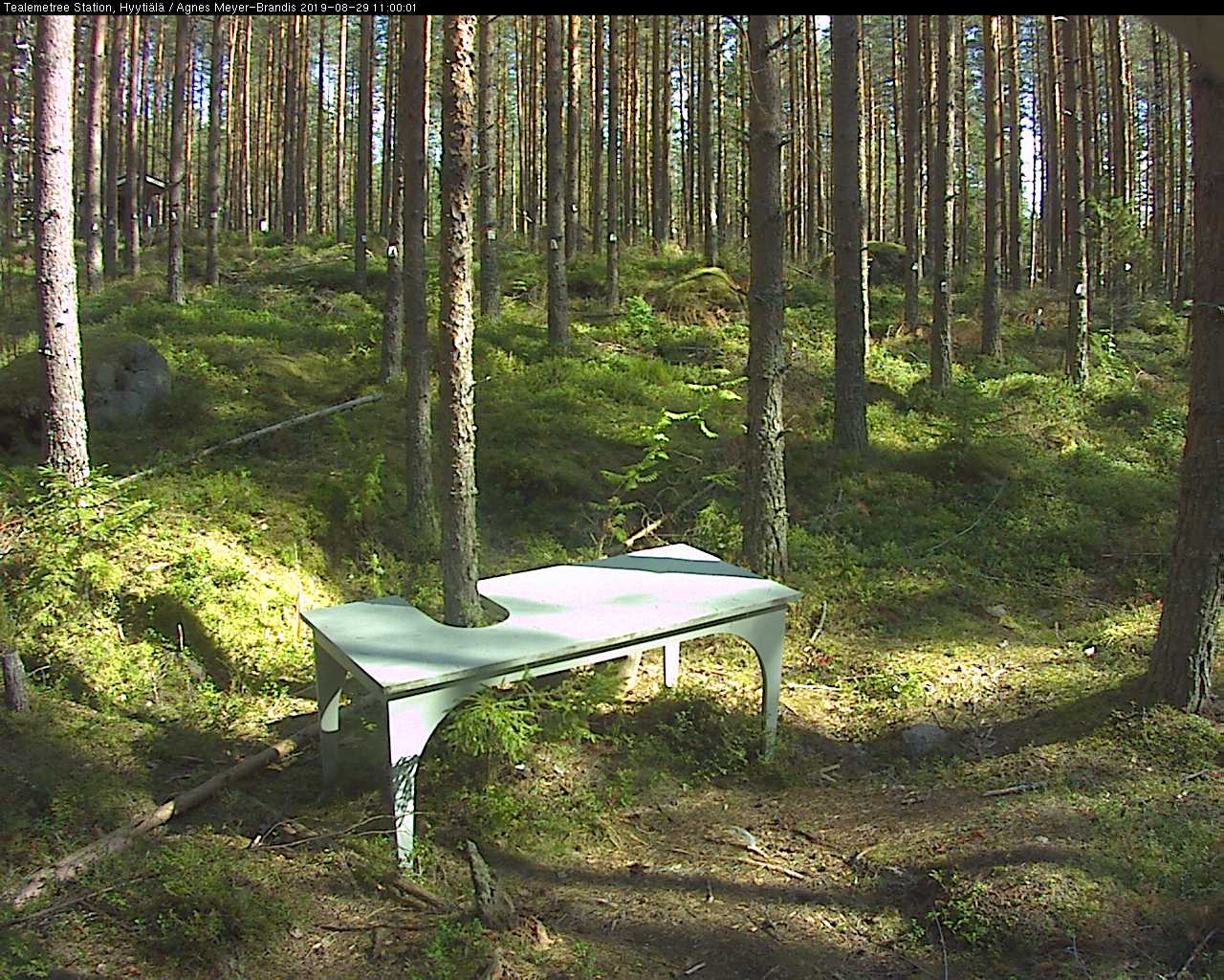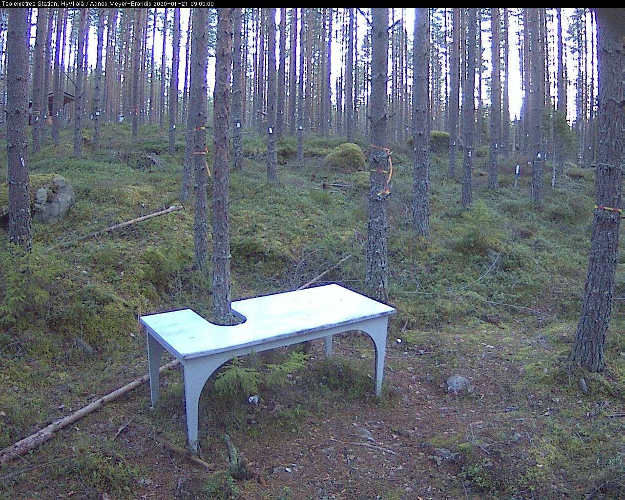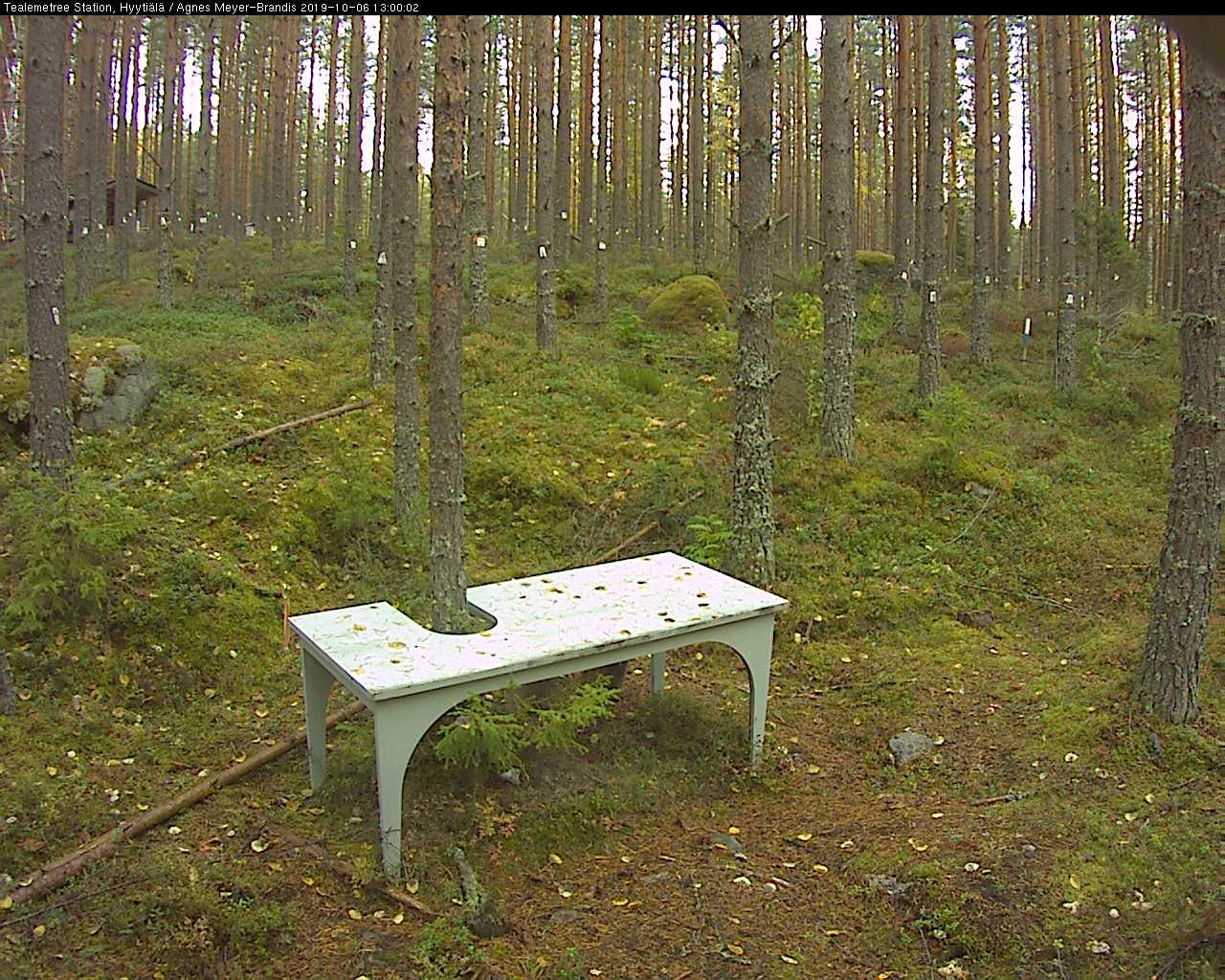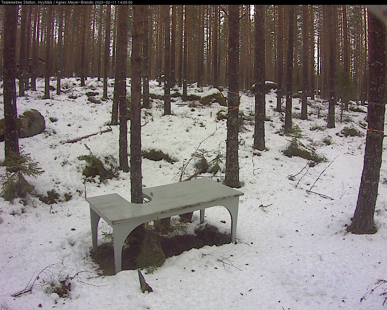 Agnes Meyer-Brandiksen työ Hyytiälässä alkoi tutustumalla aseman muihin tutkijoihin. Pystyäkseen tapaamaan ihmisiä metsässä, hän rakensi pöydän, josta muodostui kohtauspiste ja paikka teehetkille Agneksen ja puun kanssa.