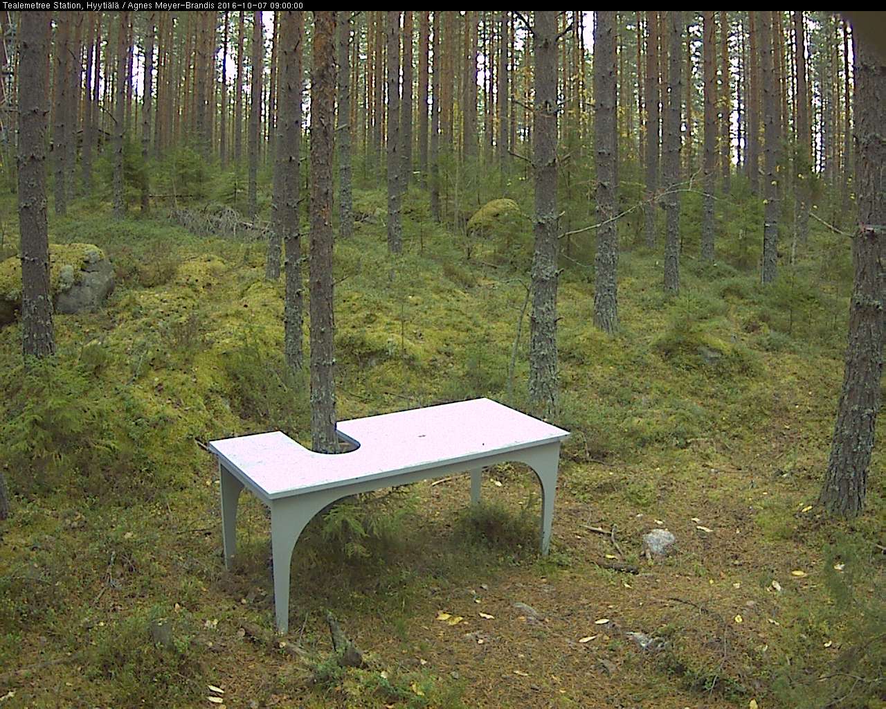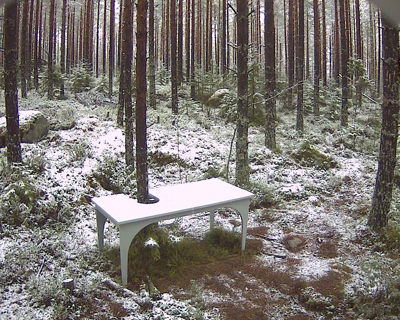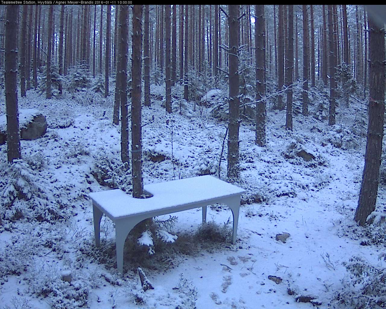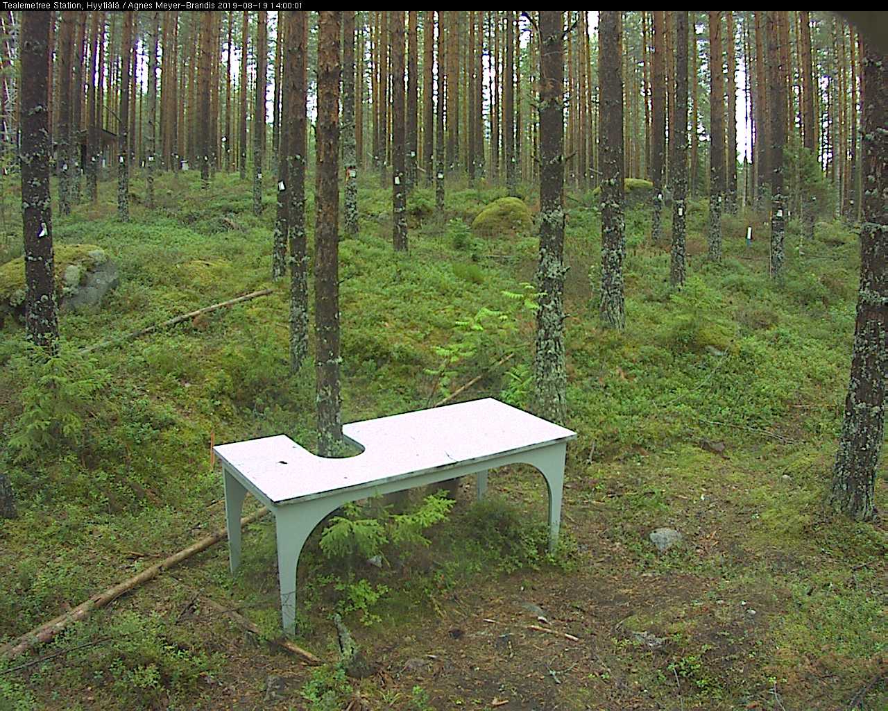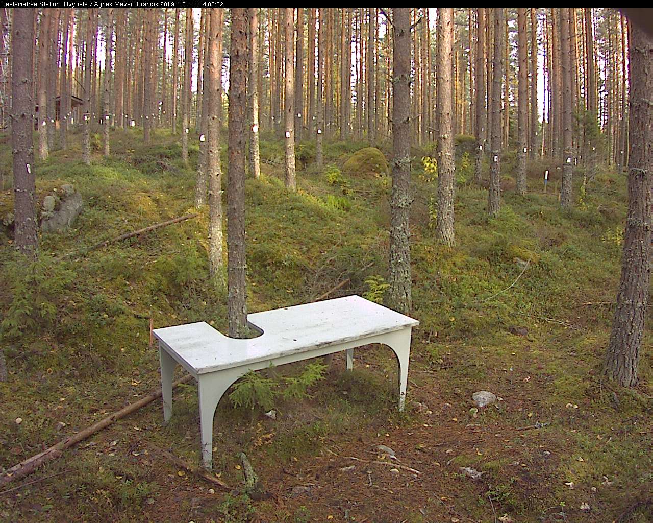 Agnes Meyer-Brandiksen työ Hyytiälässä alkoi tutustumalla aseman muihin tutkijoihin. Pystyäkseen tapaamaan ihmisiä metsässä, hän rakensi pöydän, josta muodostui kohtauspiste ja paikka teehetkille Agneksen ja puun kanssa.