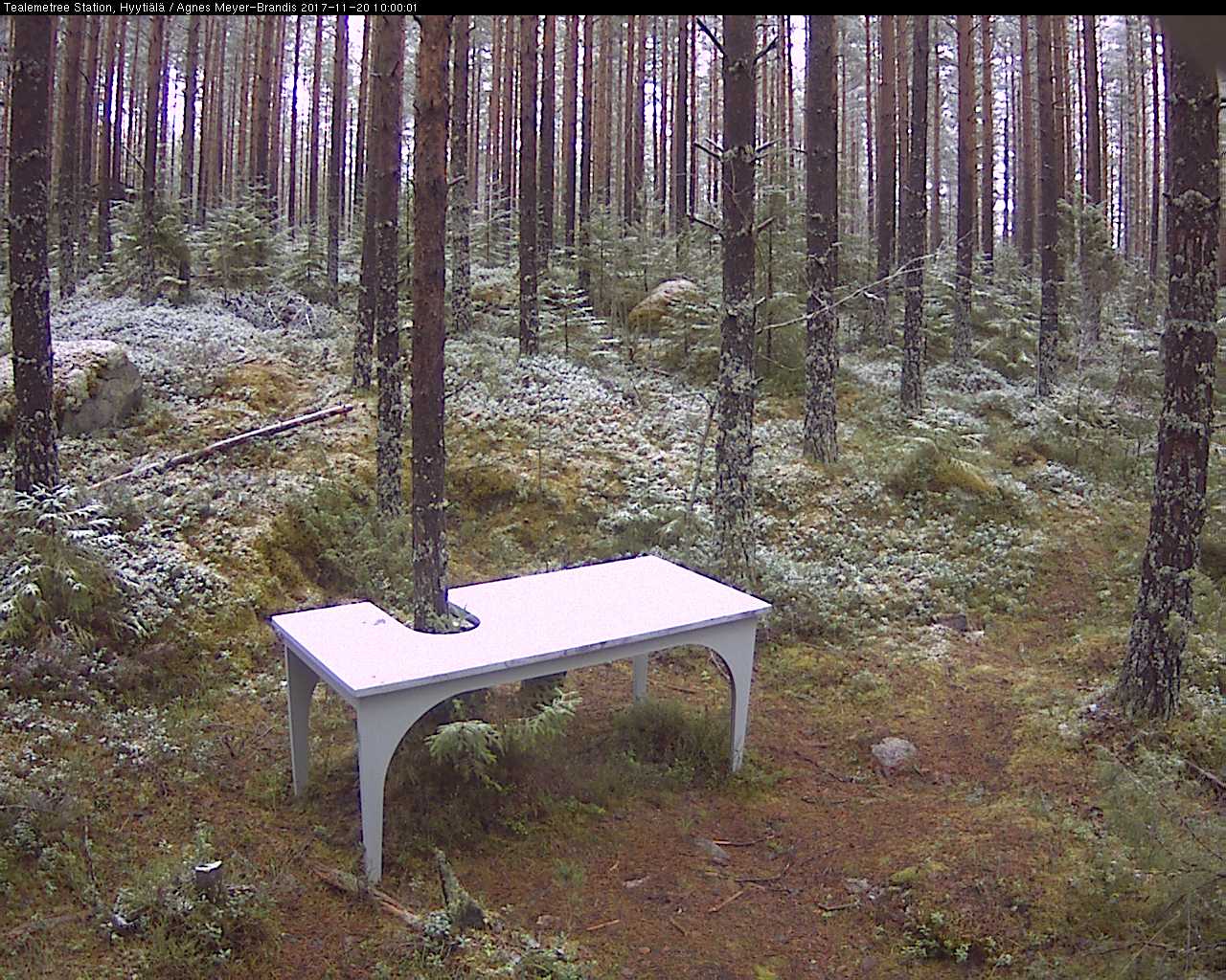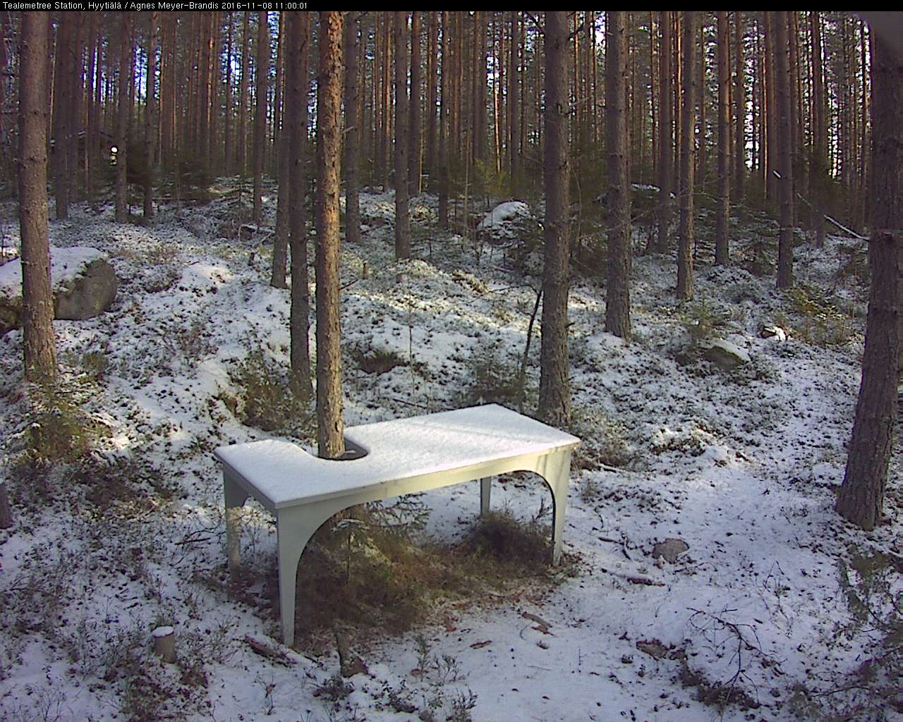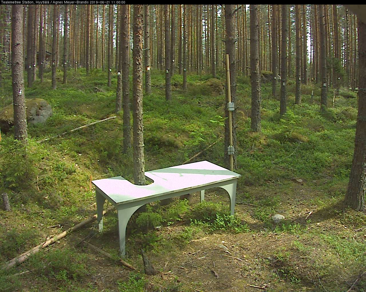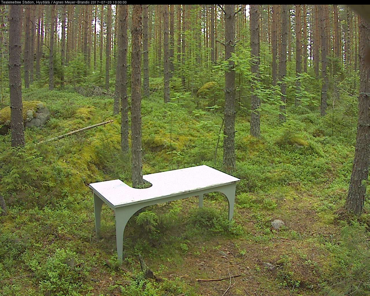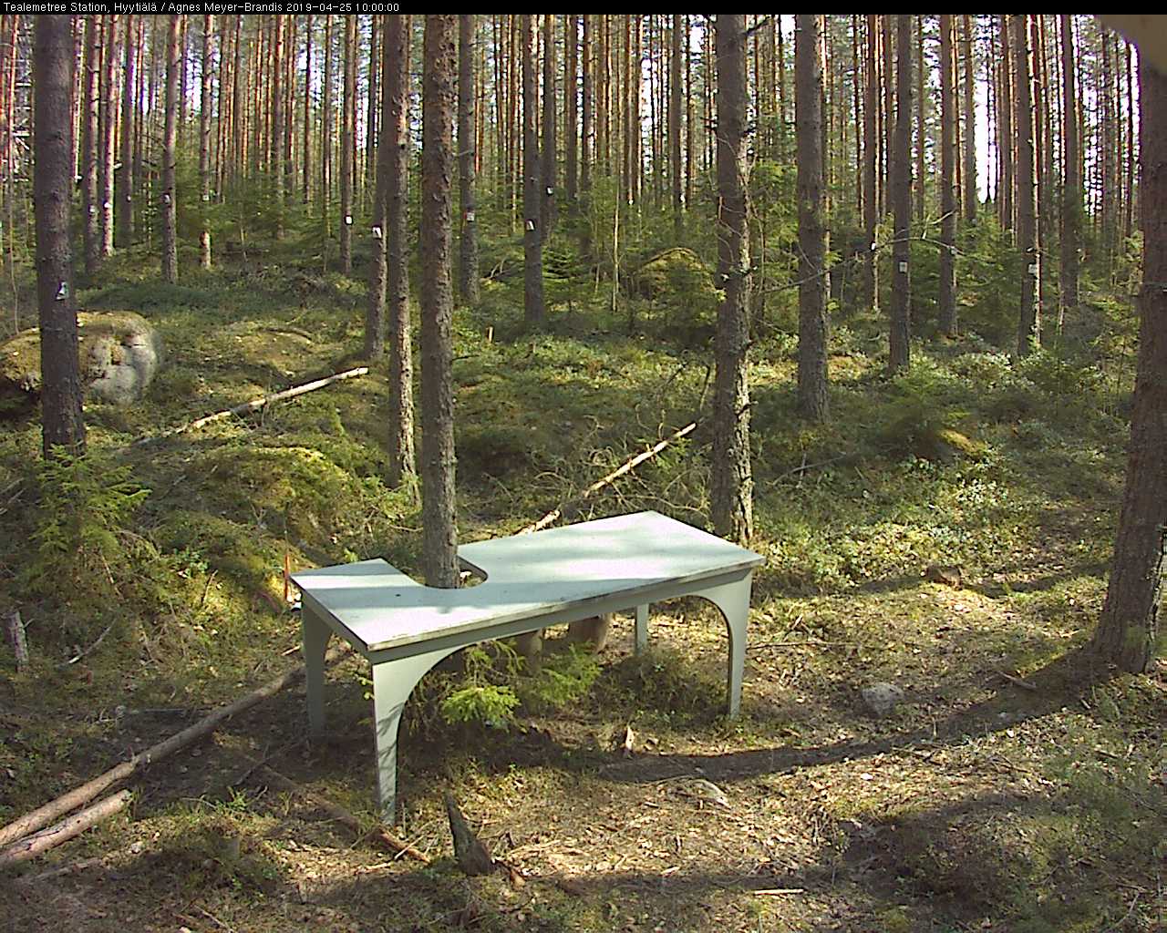 Agnes Meyer-Brandiksen työ Hyytiälässä alkoi tutustumalla aseman muihin tutkijoihin. Pystyäkseen tapaamaan ihmisiä metsässä, hän rakensi pöydän, josta muodostui kohtauspiste ja paikka teehetkille Agneksen ja puun kanssa.