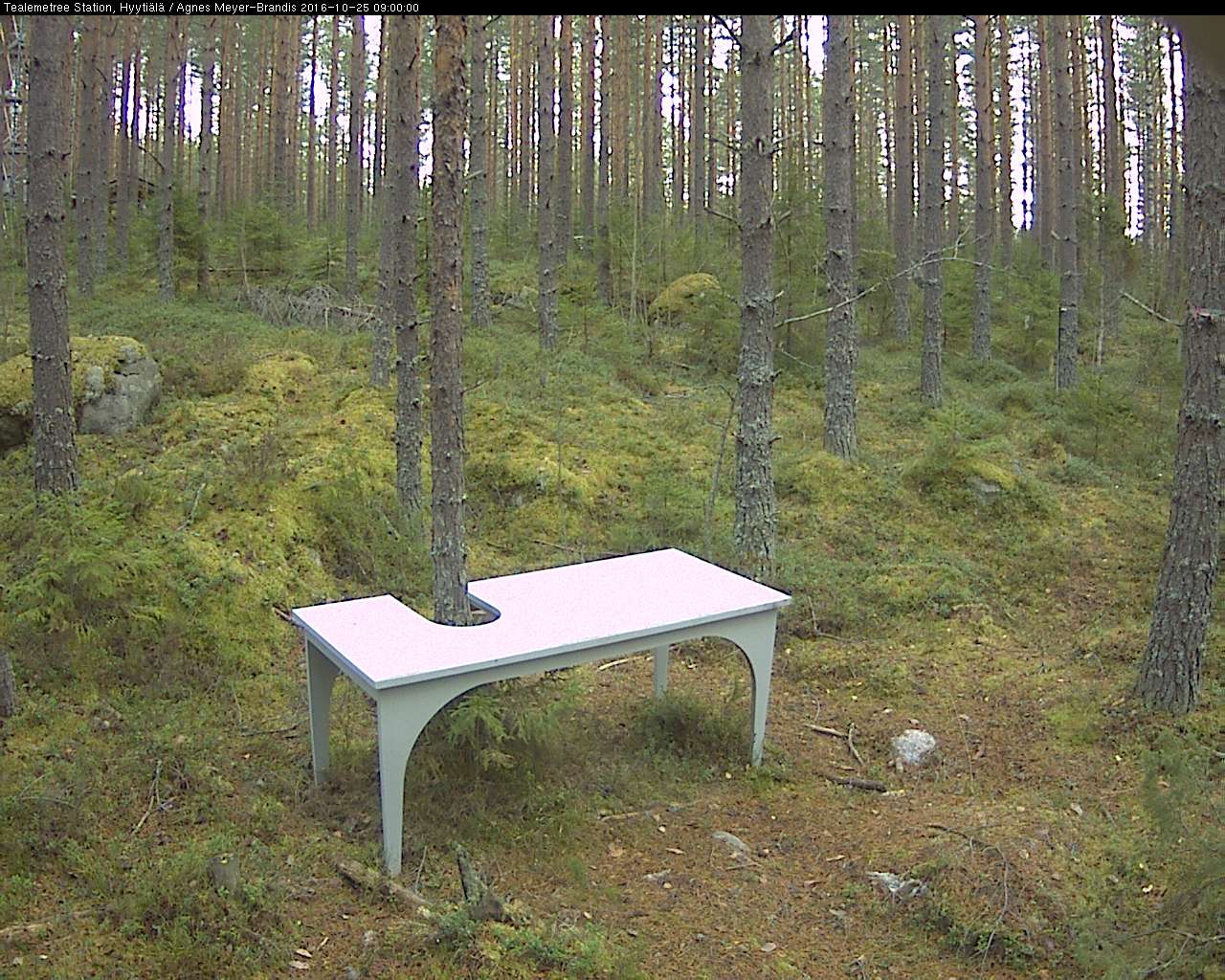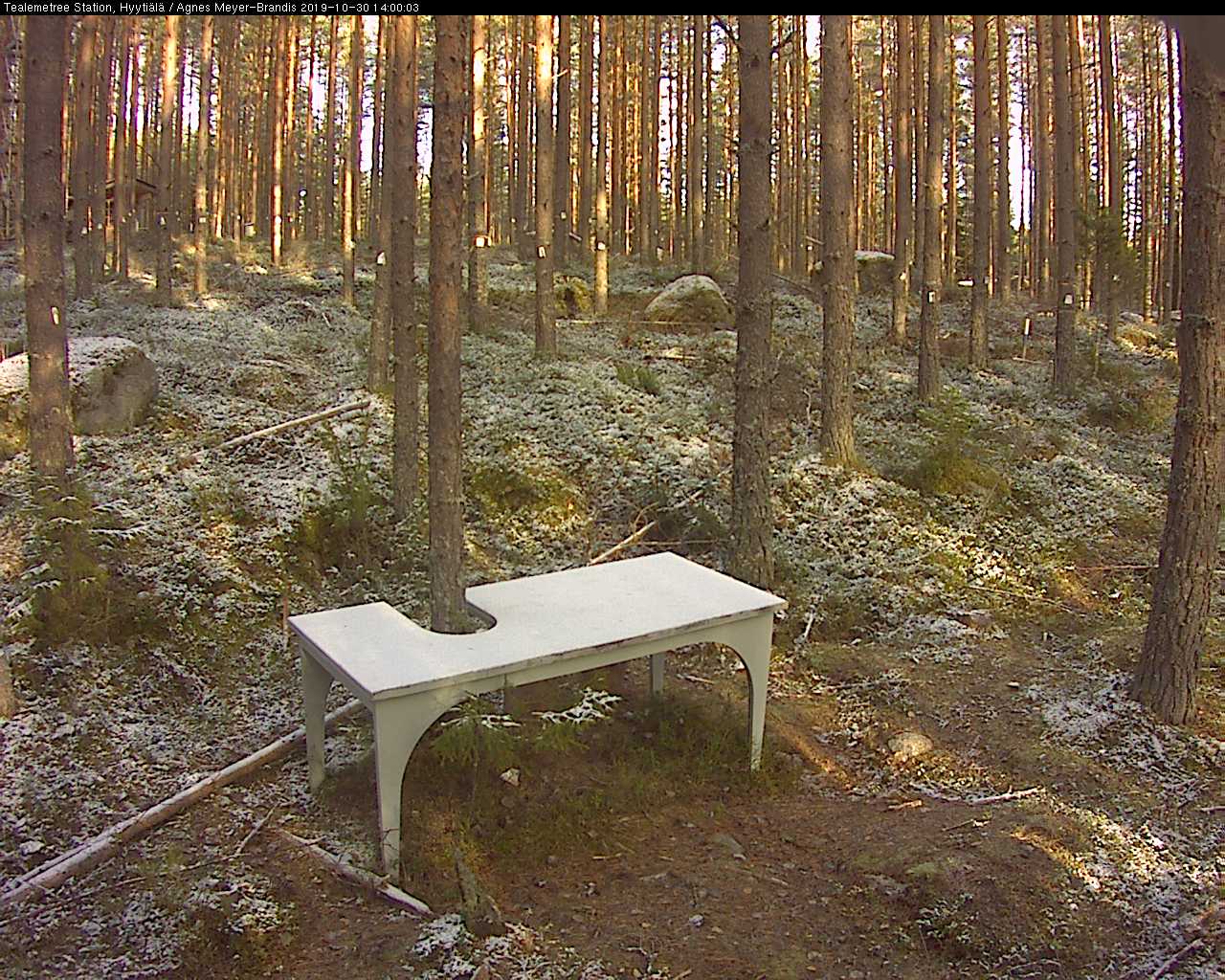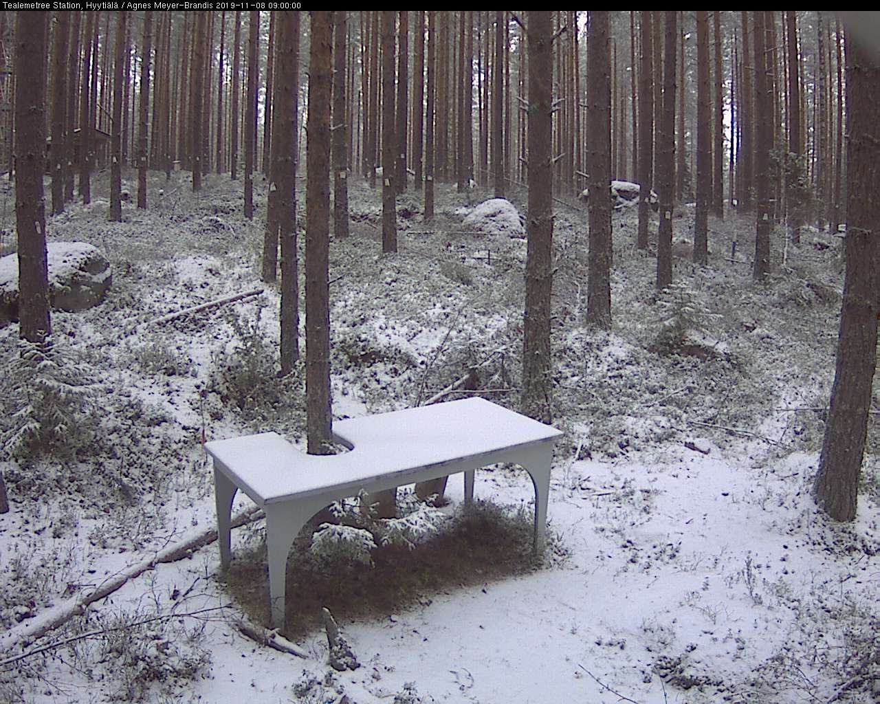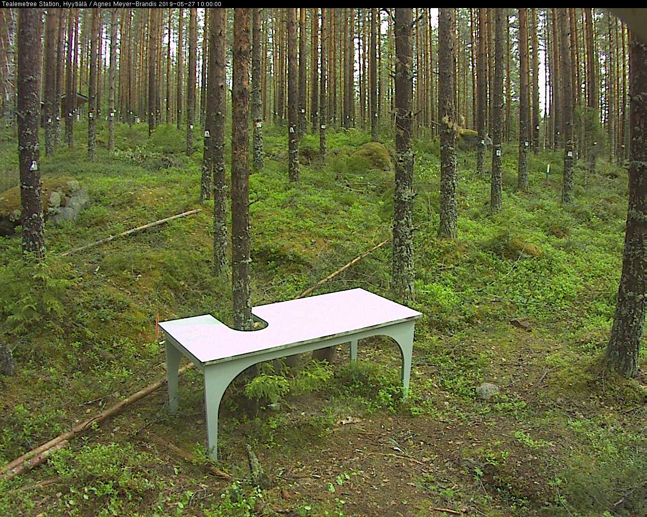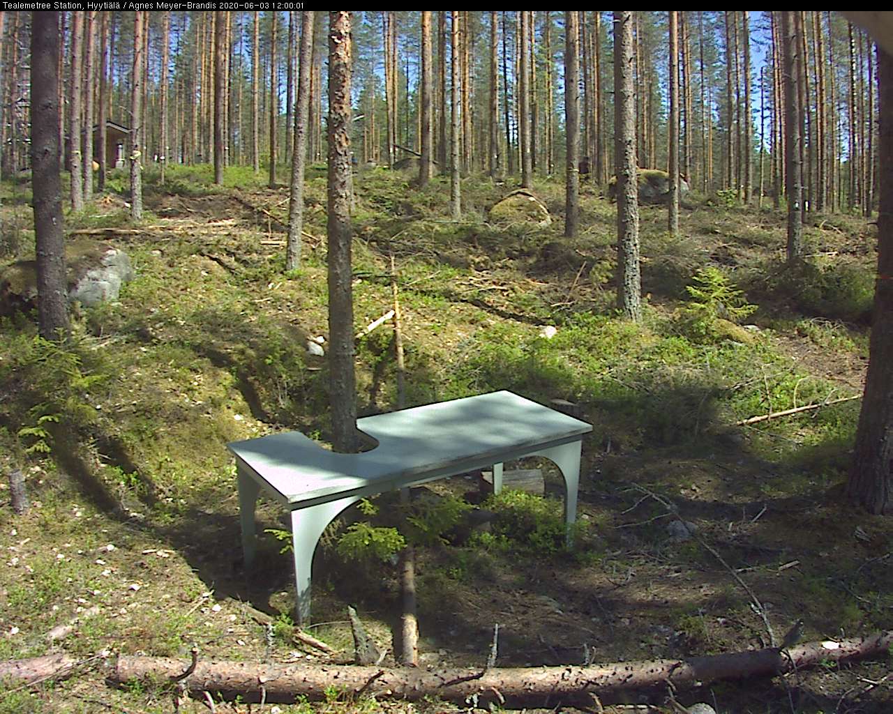Agnes Meyer-Brandiksen työ Hyytiälässä alkoi tutustumalla aseman muihin tutkijoihin. Pystyäkseen tapaamaan ihmisiä metsässä, hän rakensi pöydän, josta muodostui kohtauspiste ja paikka teehetkille Agneksen ja puun kanssa.