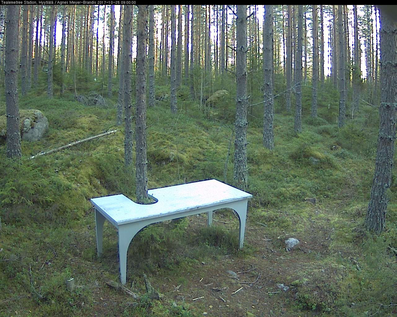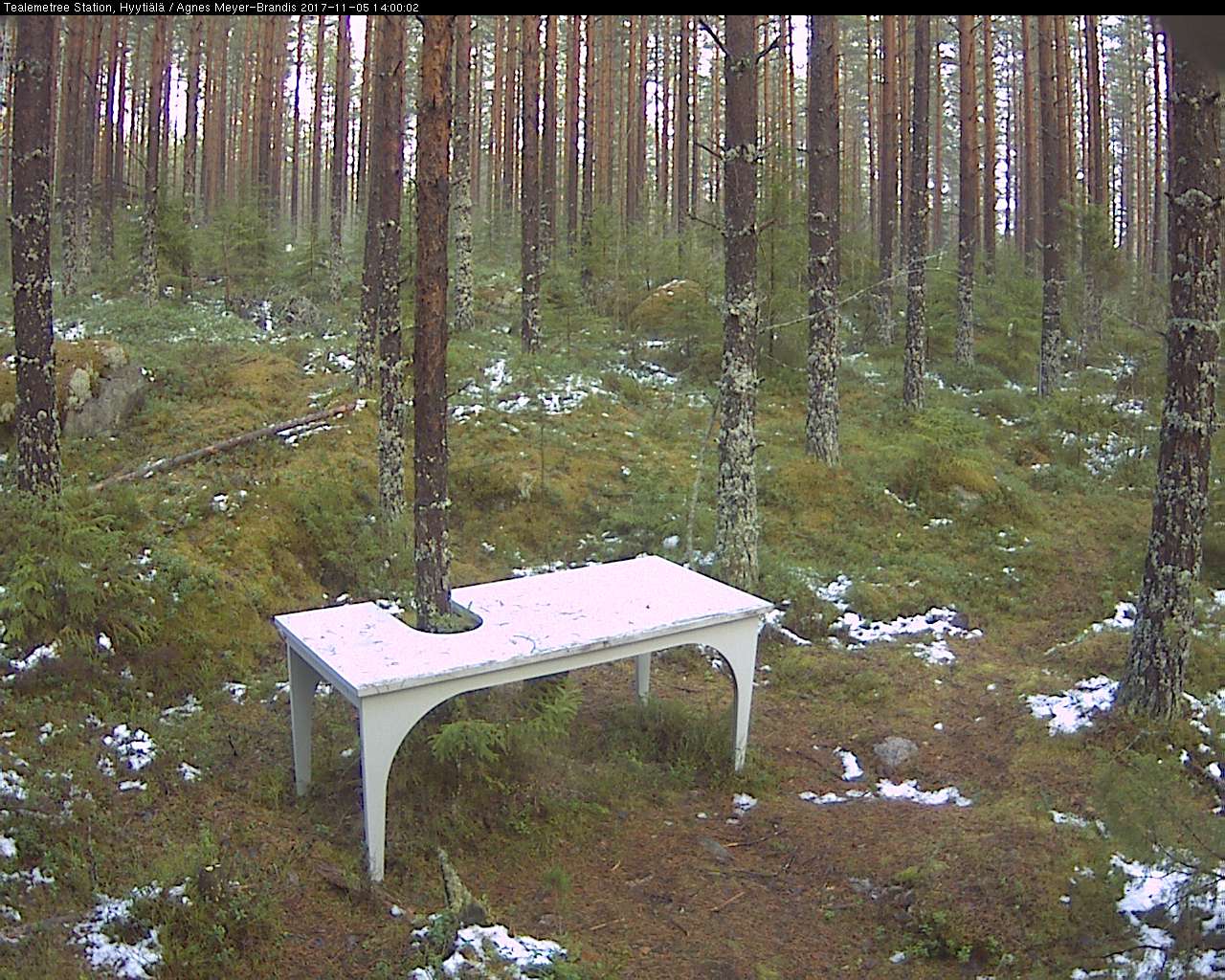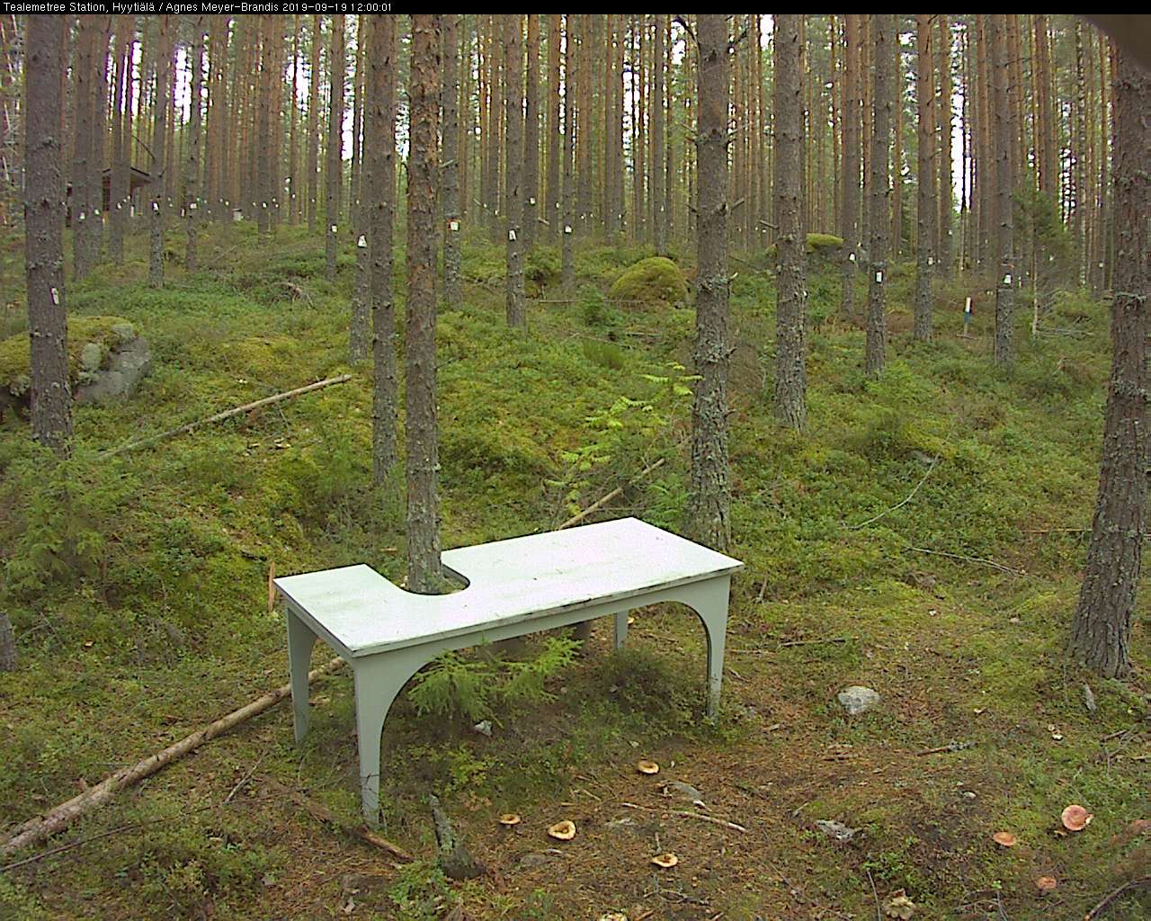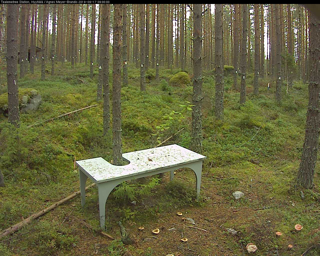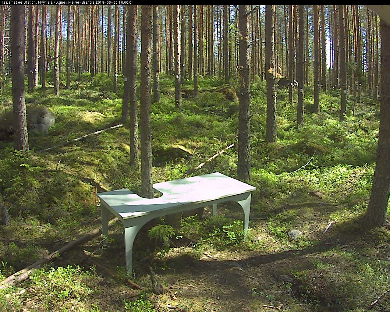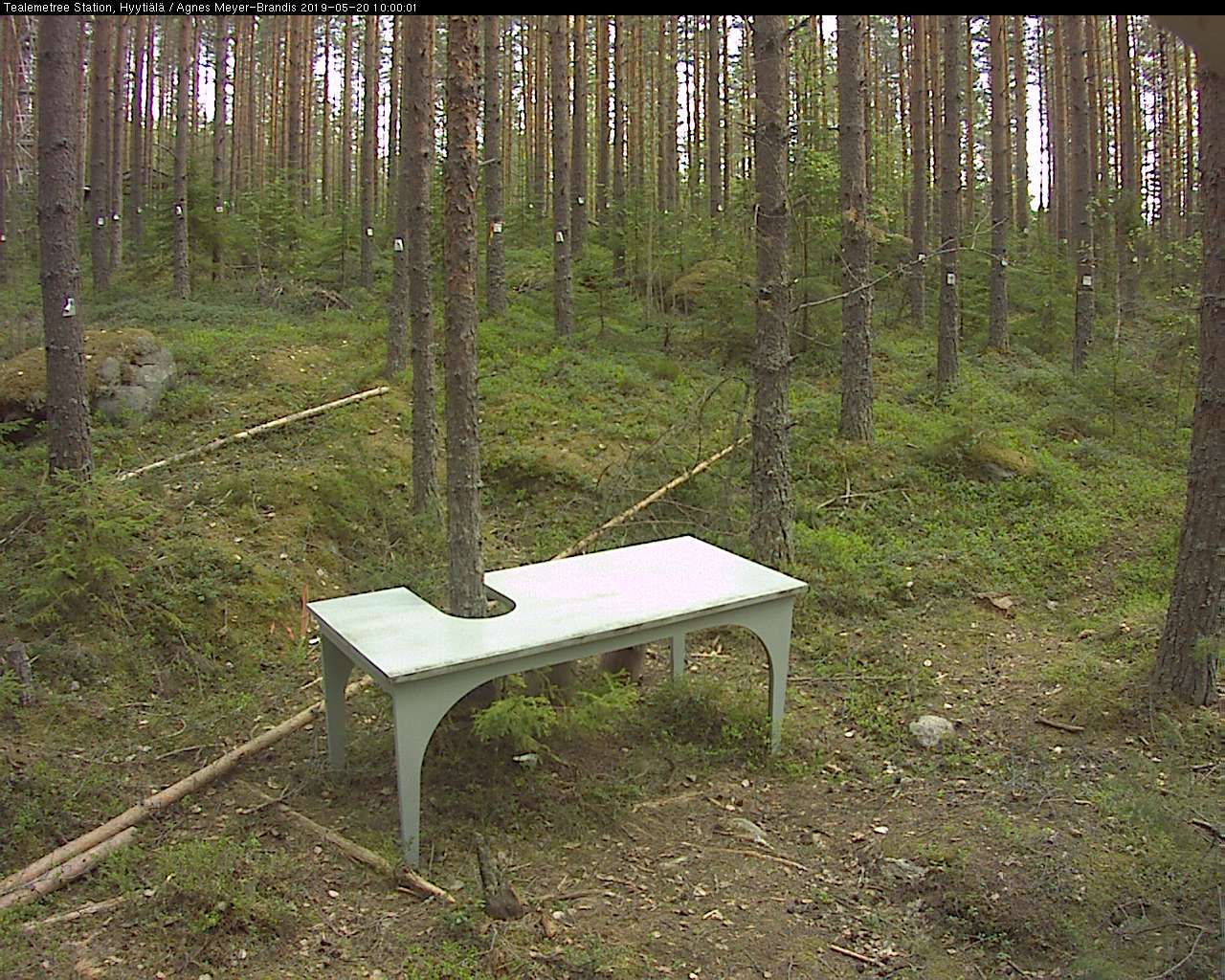 Agnes Meyer-Brandiksen työ Hyytiälässä alkoi tutustumalla aseman muihin tutkijoihin. Pystyäkseen tapaamaan ihmisiä metsässä, hän rakensi pöydän, josta muodostui kohtauspiste ja paikka teehetkille Agneksen ja puun kanssa.
