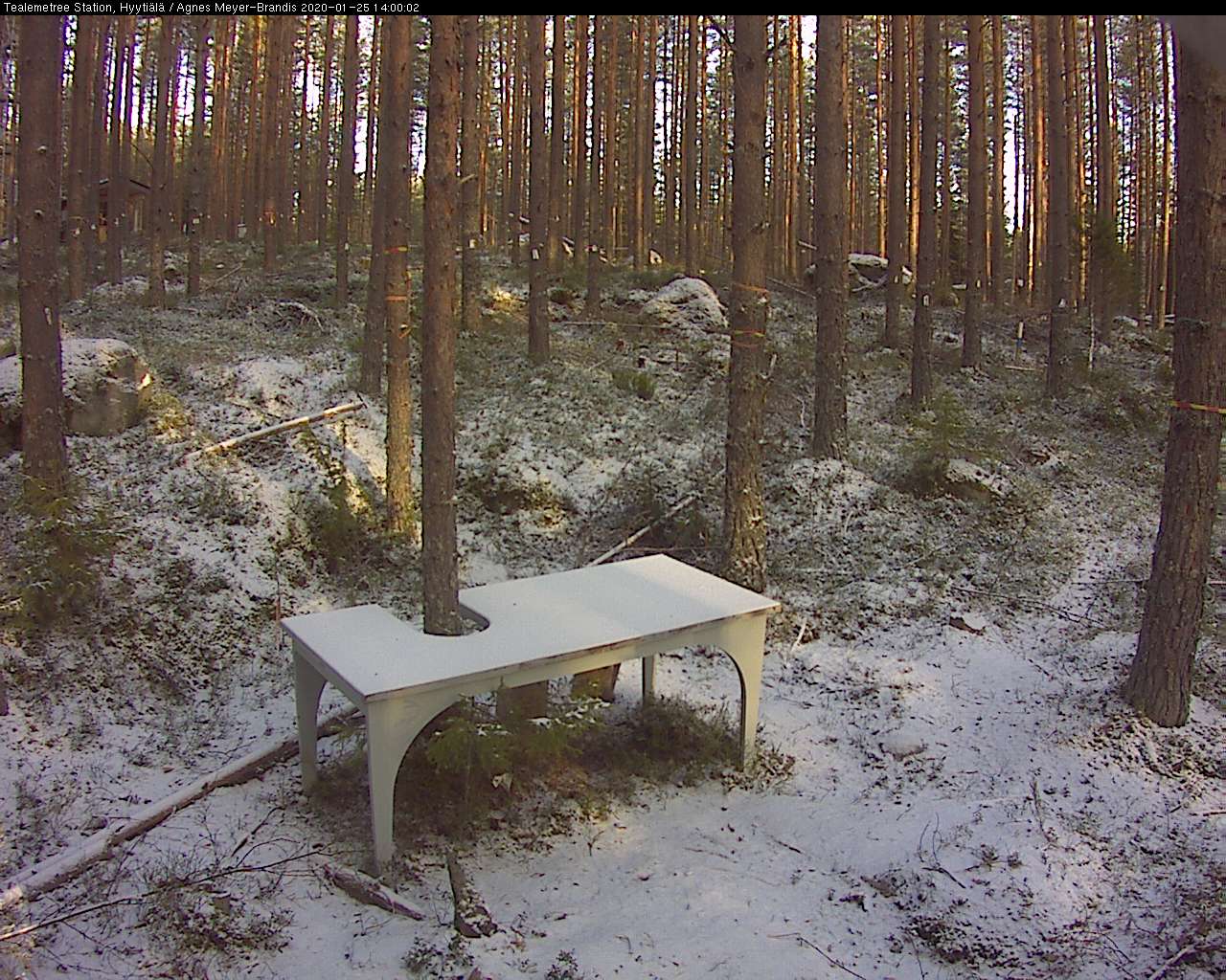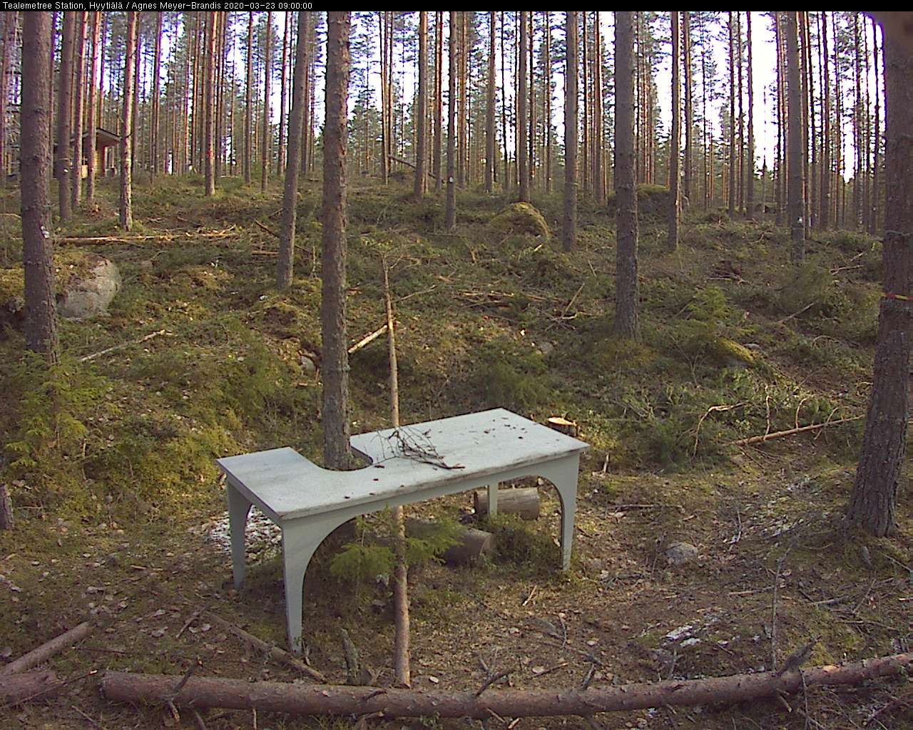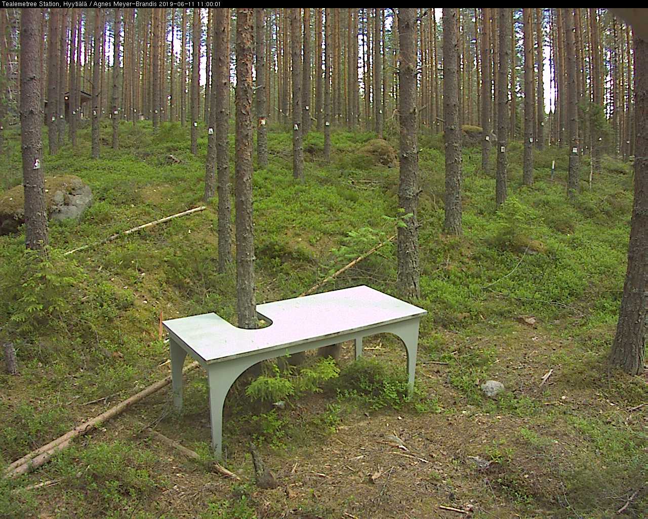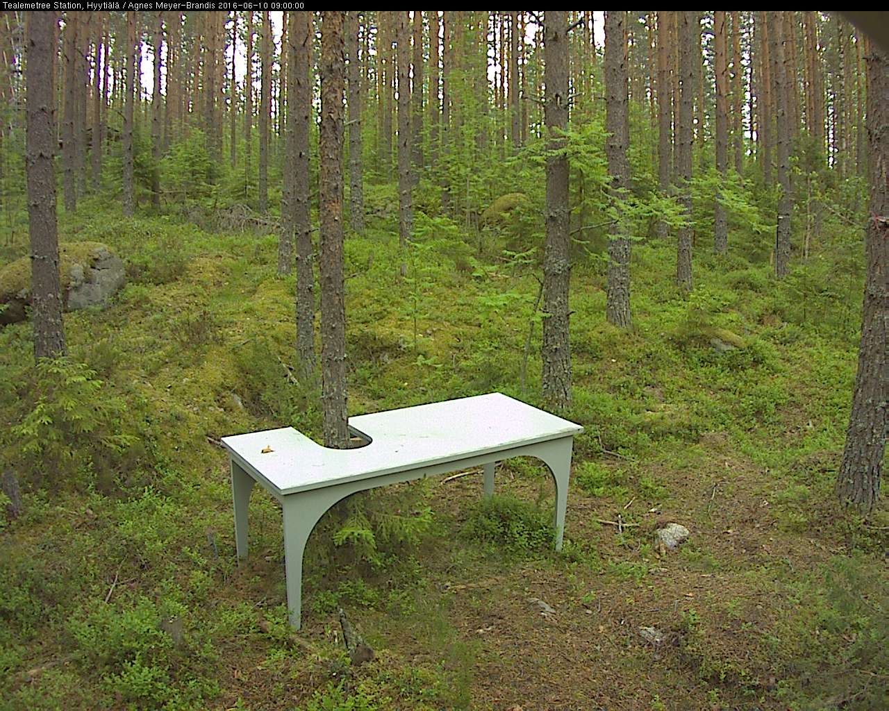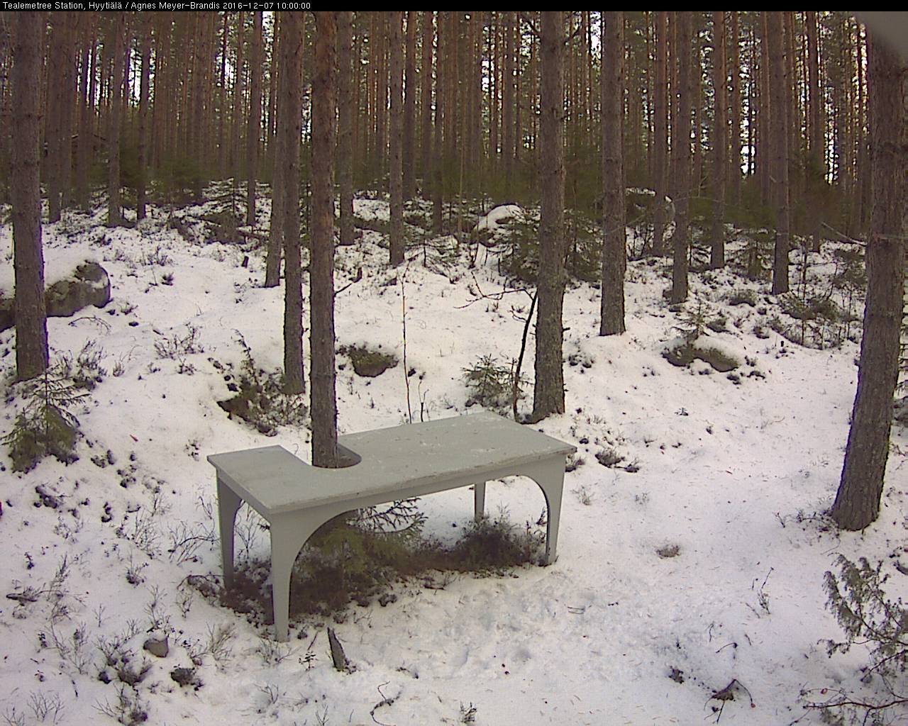 Agnes Meyer-Brandiksen työ Hyytiälässä alkoi tutustumalla aseman muihin tutkijoihin. Pystyäkseen tapaamaan ihmisiä metsässä, hän rakensi pöydän, josta muodostui kohtauspiste ja paikka teehetkille Agneksen ja puun kanssa.