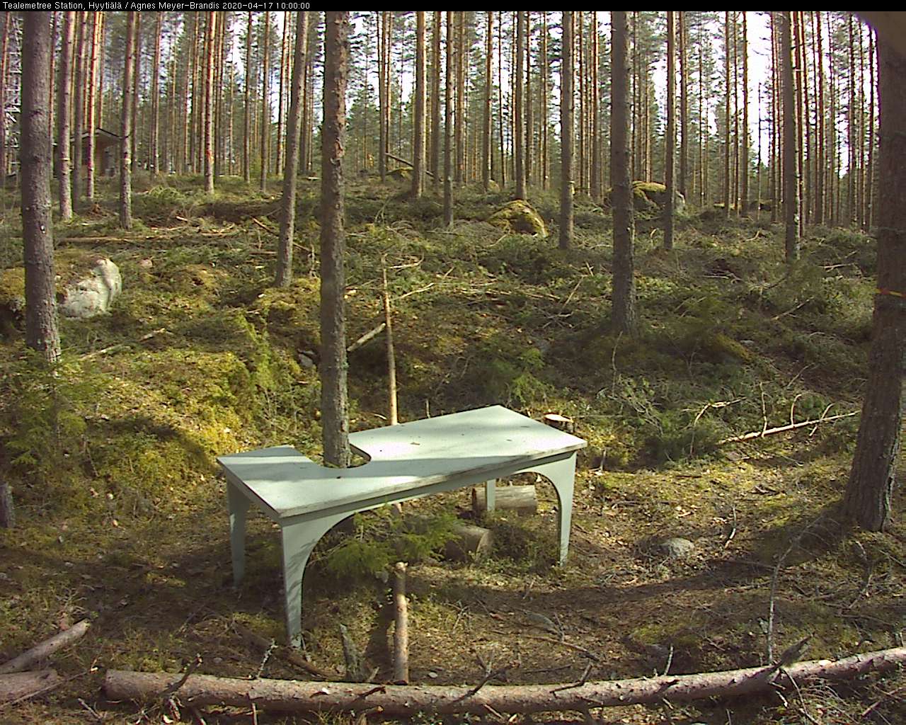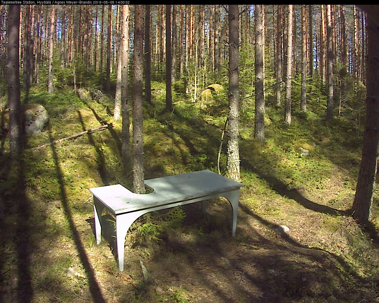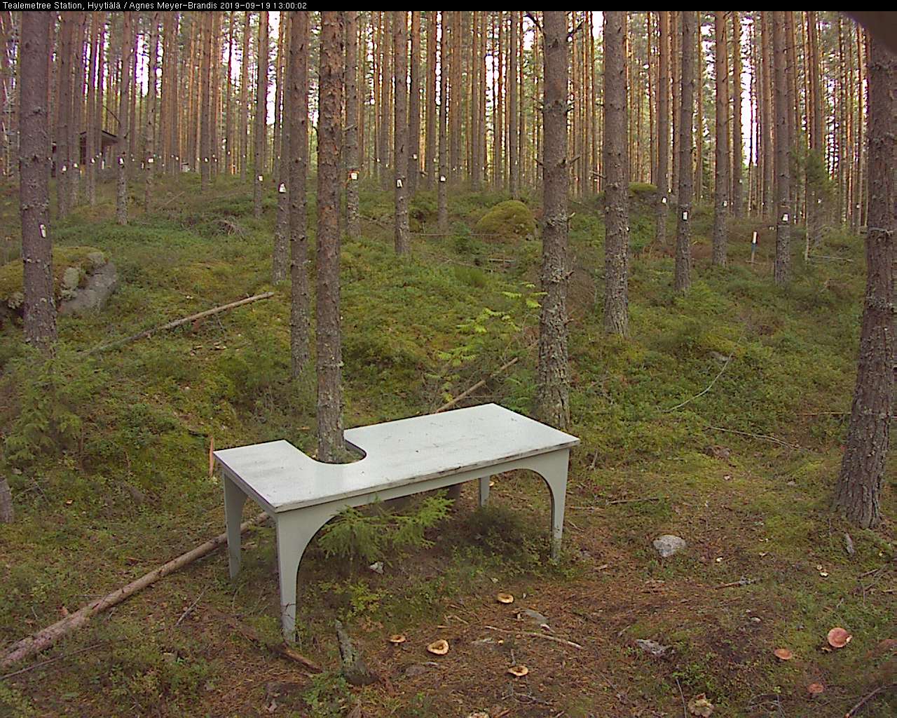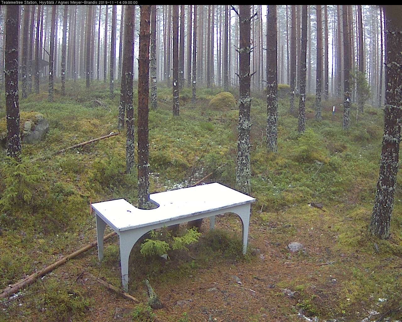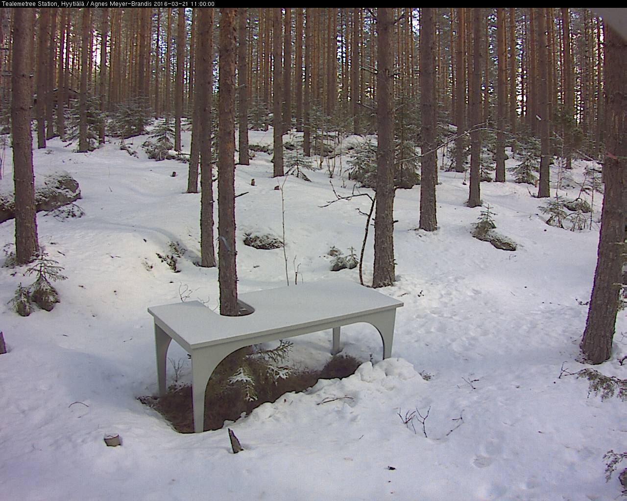 Agnes Meyer-Brandiksen työ Hyytiälässä alkoi tutustumalla aseman muihin tutkijoihin. Pystyäkseen tapaamaan ihmisiä metsässä, hän rakensi pöydän, josta muodostui kohtauspiste ja paikka teehetkille Agneksen ja puun kanssa.