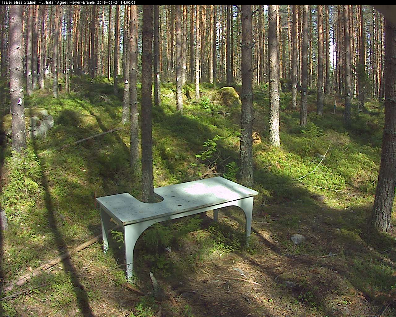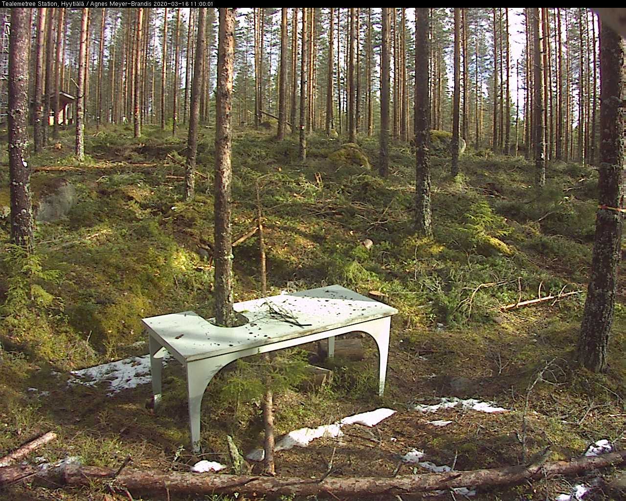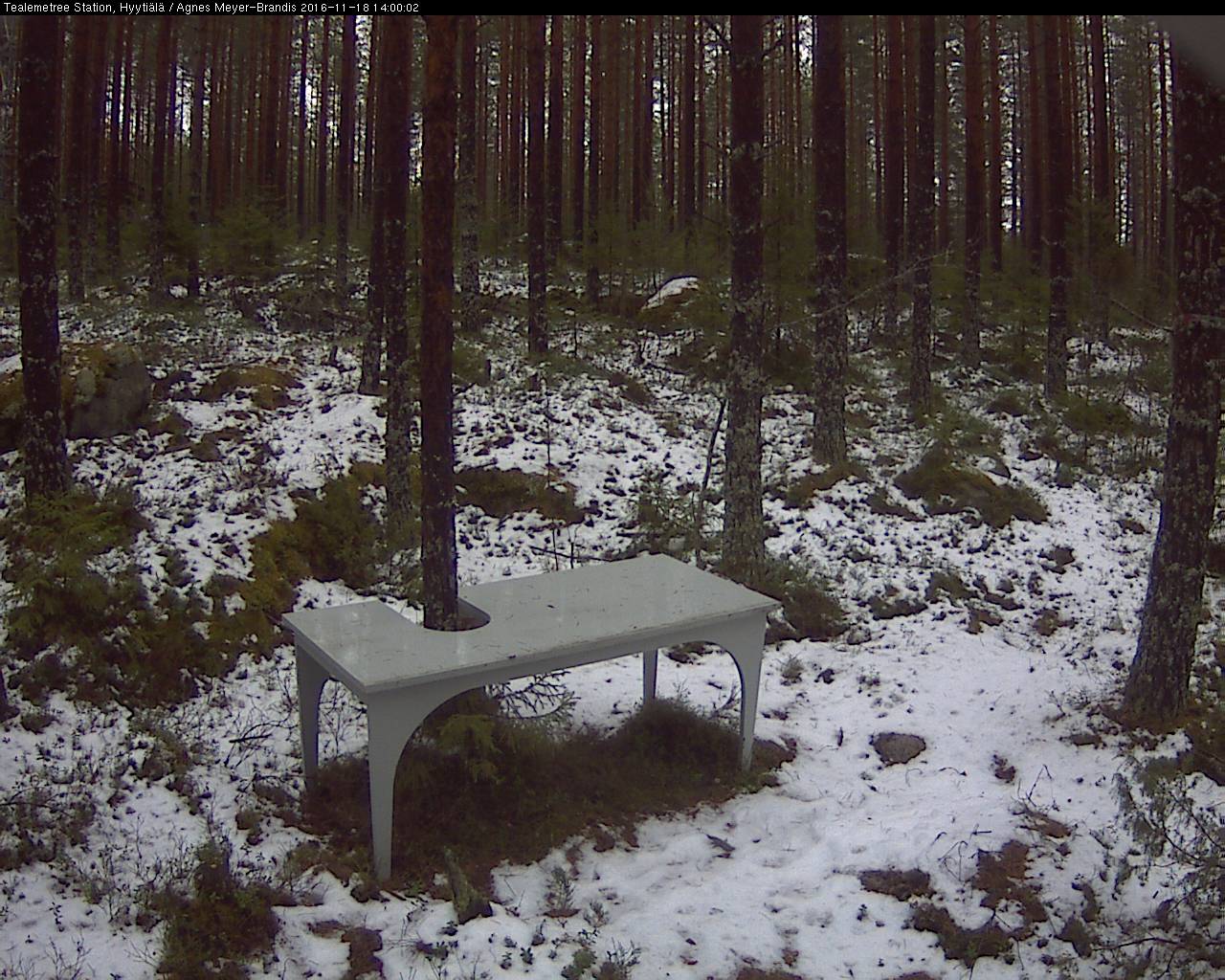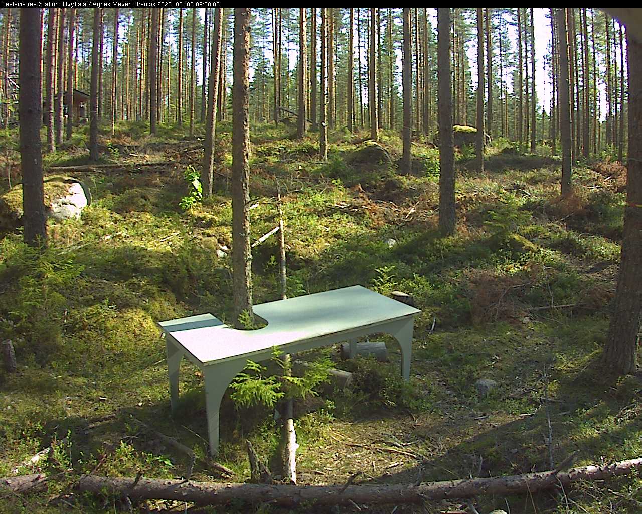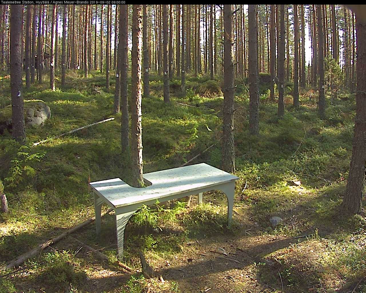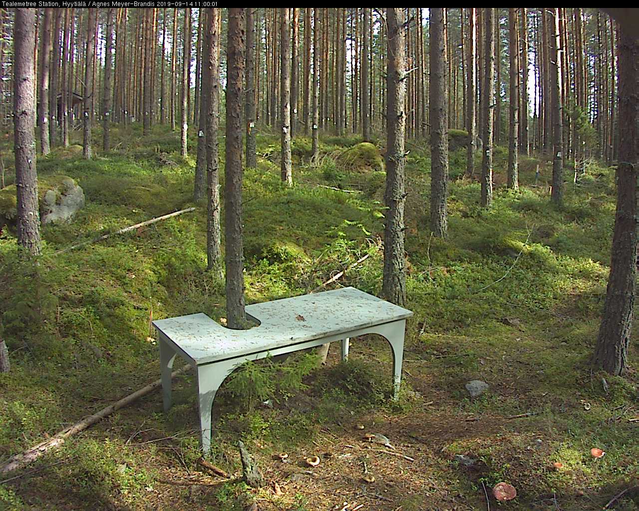 Agnes Meyer-Brandiksen työ Hyytiälässä alkoi tutustumalla aseman muihin tutkijoihin. Pystyäkseen tapaamaan ihmisiä metsässä, hän rakensi pöydän, josta muodostui kohtauspiste ja paikka teehetkille Agneksen ja puun kanssa.