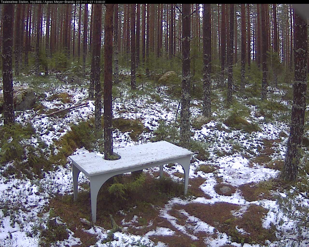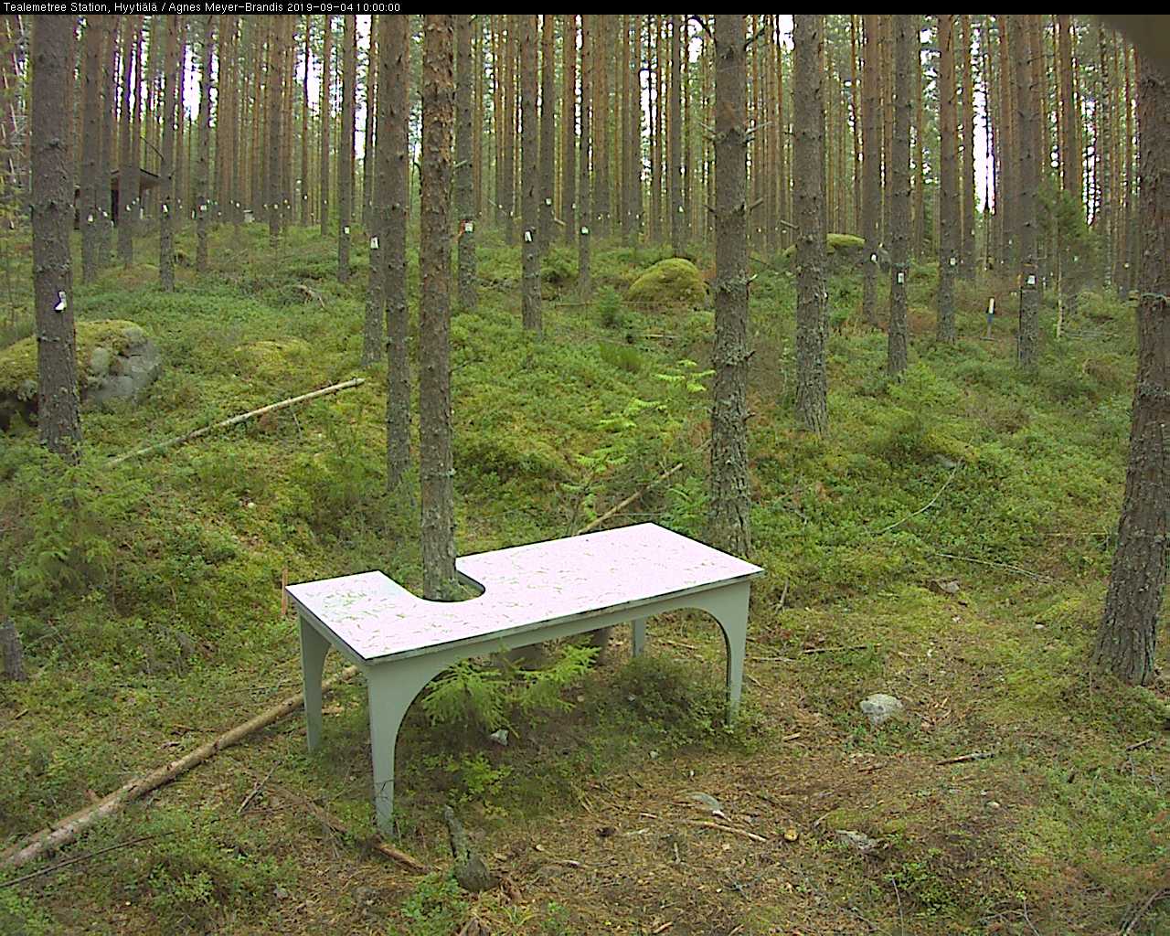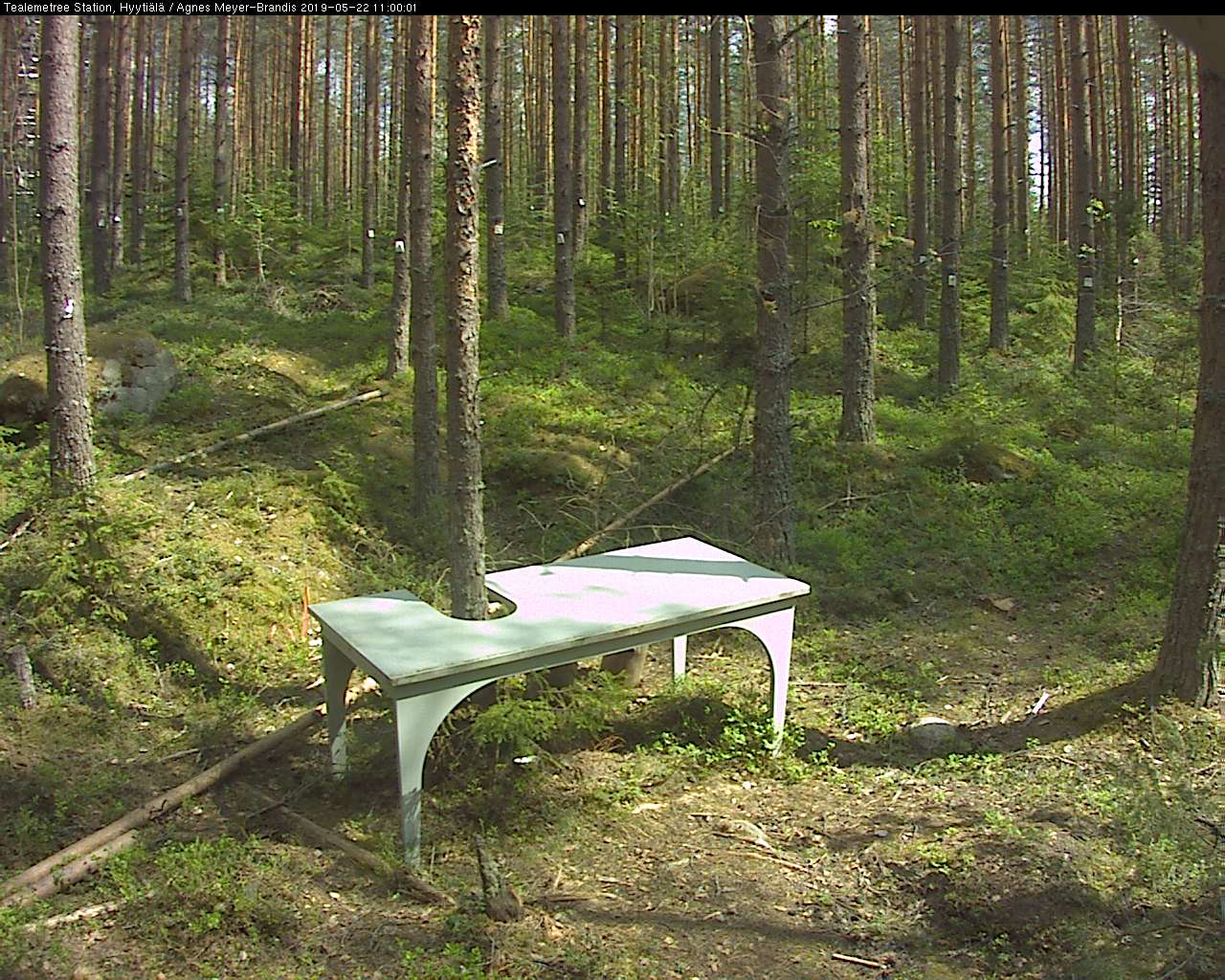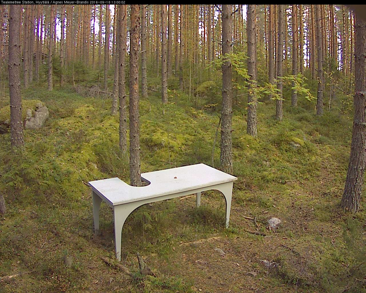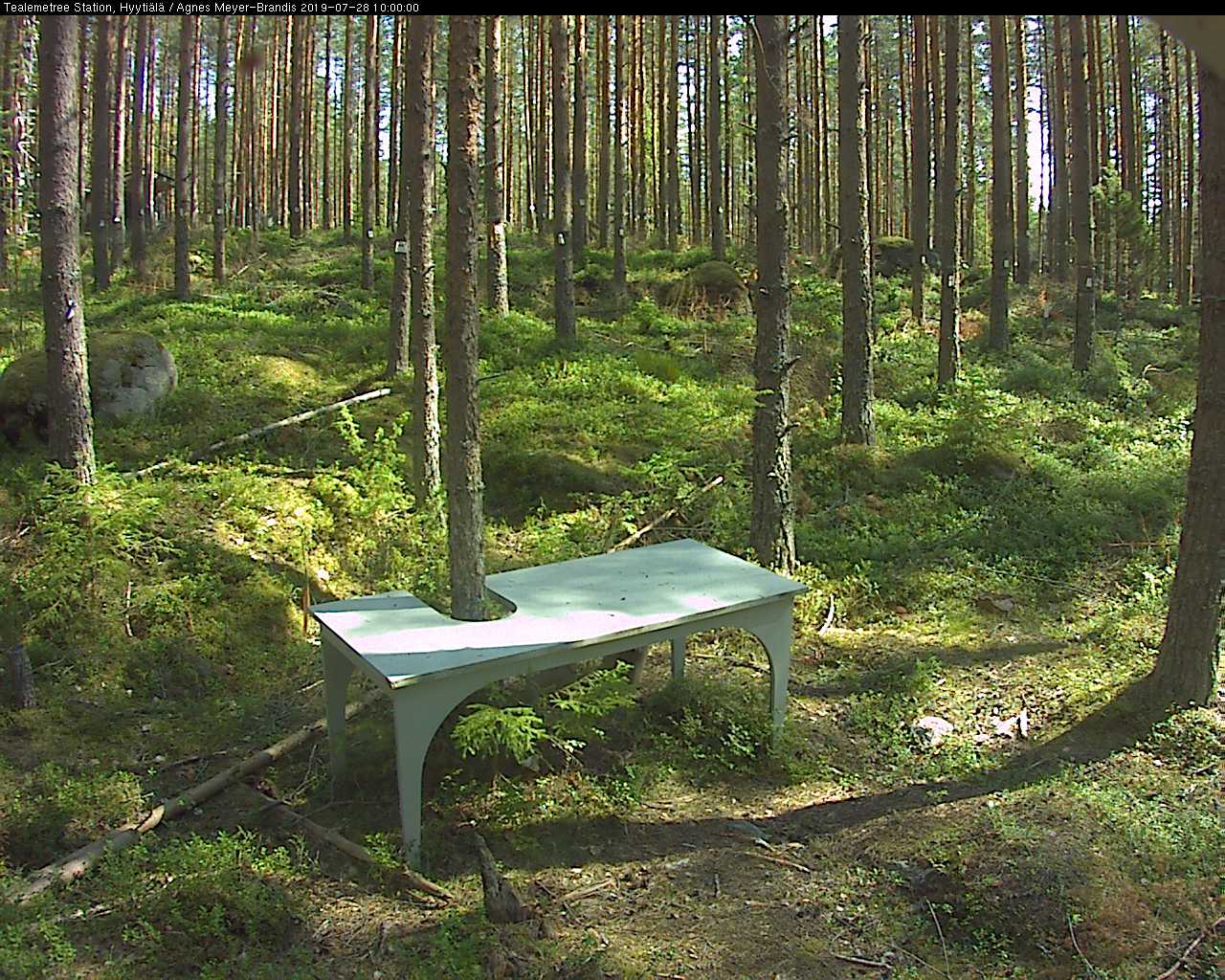 Agnes Meyer-Brandiksen työ Hyytiälässä alkoi tutustumalla aseman muihin tutkijoihin. Pystyäkseen tapaamaan ihmisiä metsässä, hän rakensi pöydän, josta muodostui kohtauspiste ja paikka teehetkille Agneksen ja puun kanssa.