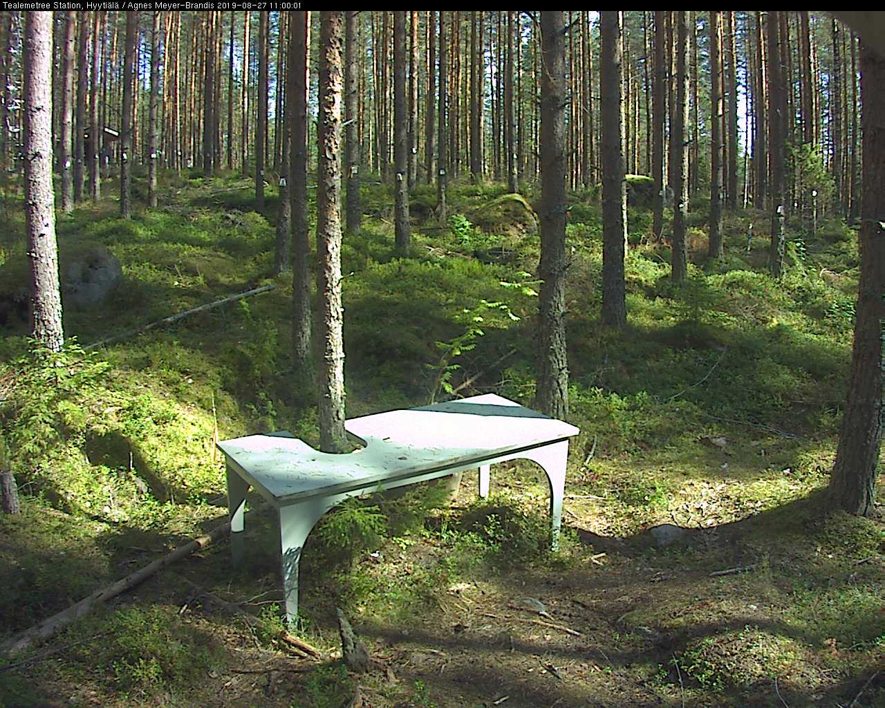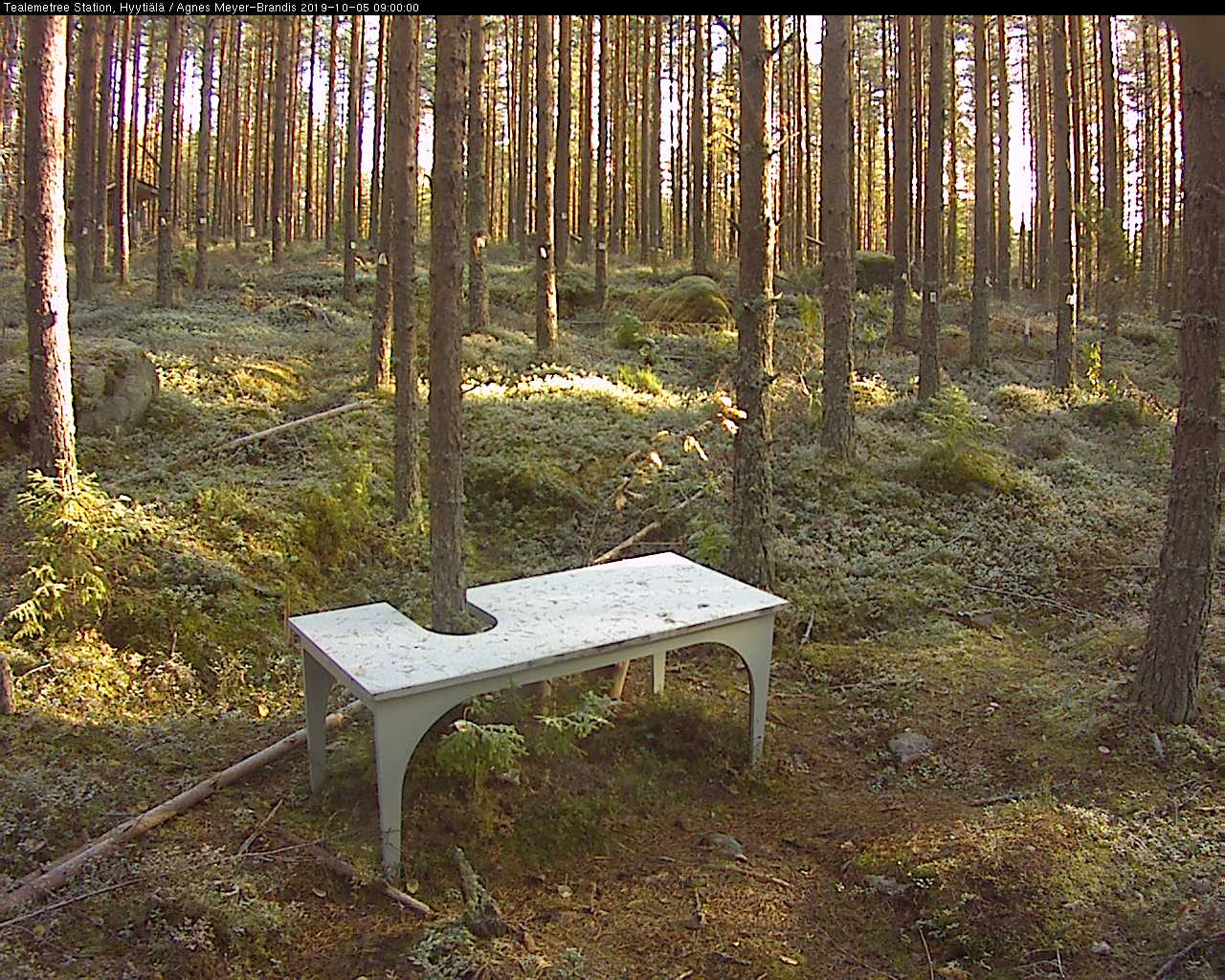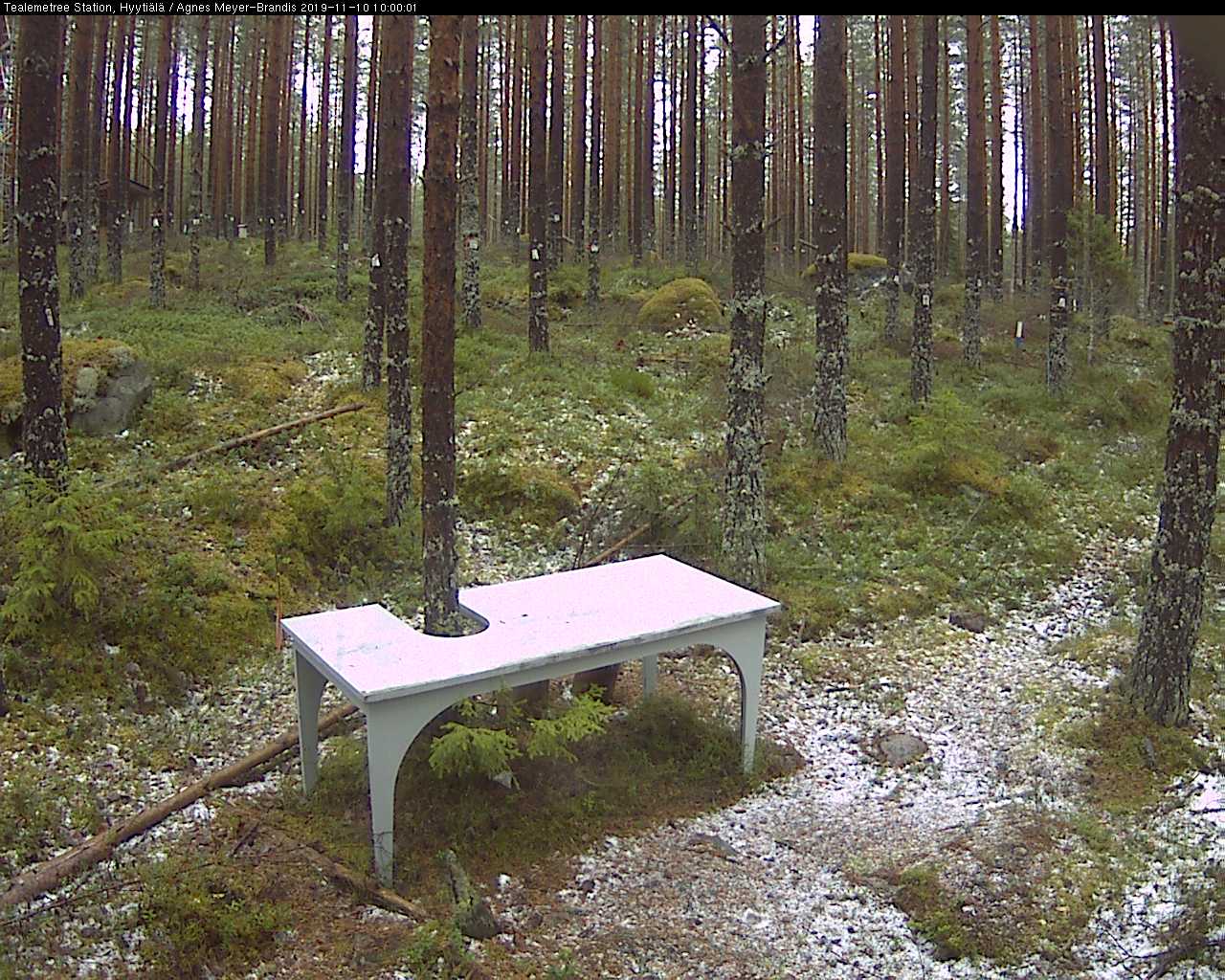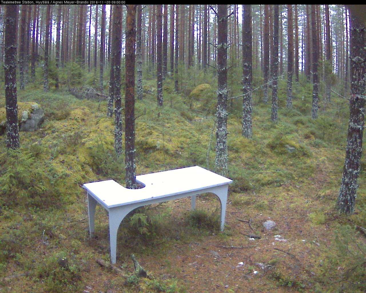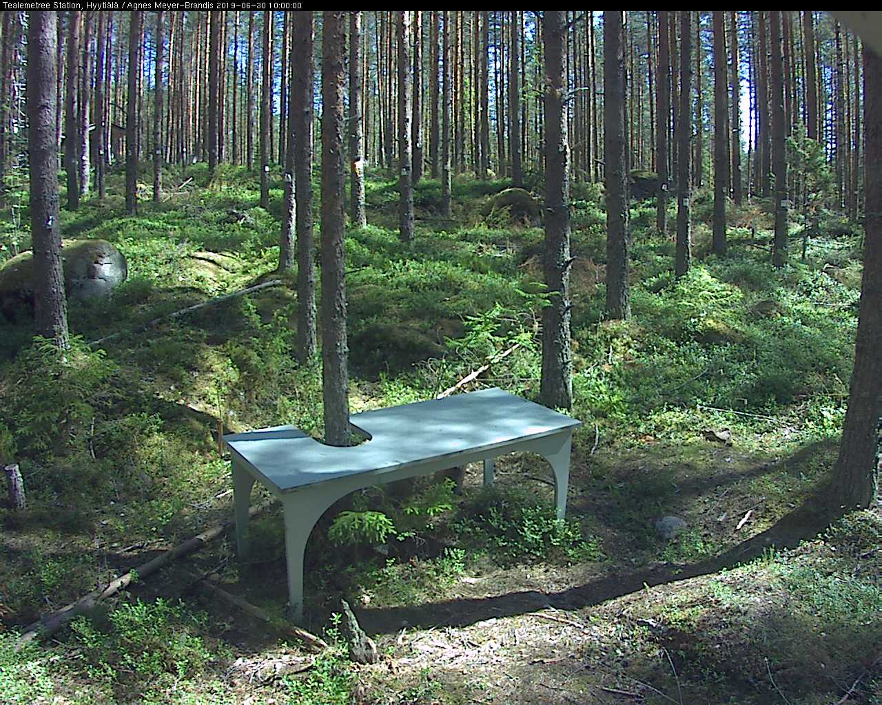 Agnes Meyer-Brandiksen työ Hyytiälässä alkoi tutustumalla aseman muihin tutkijoihin. Pystyäkseen tapaamaan ihmisiä metsässä, hän rakensi pöydän, josta muodostui kohtauspiste ja paikka teehetkille Agneksen ja puun kanssa.