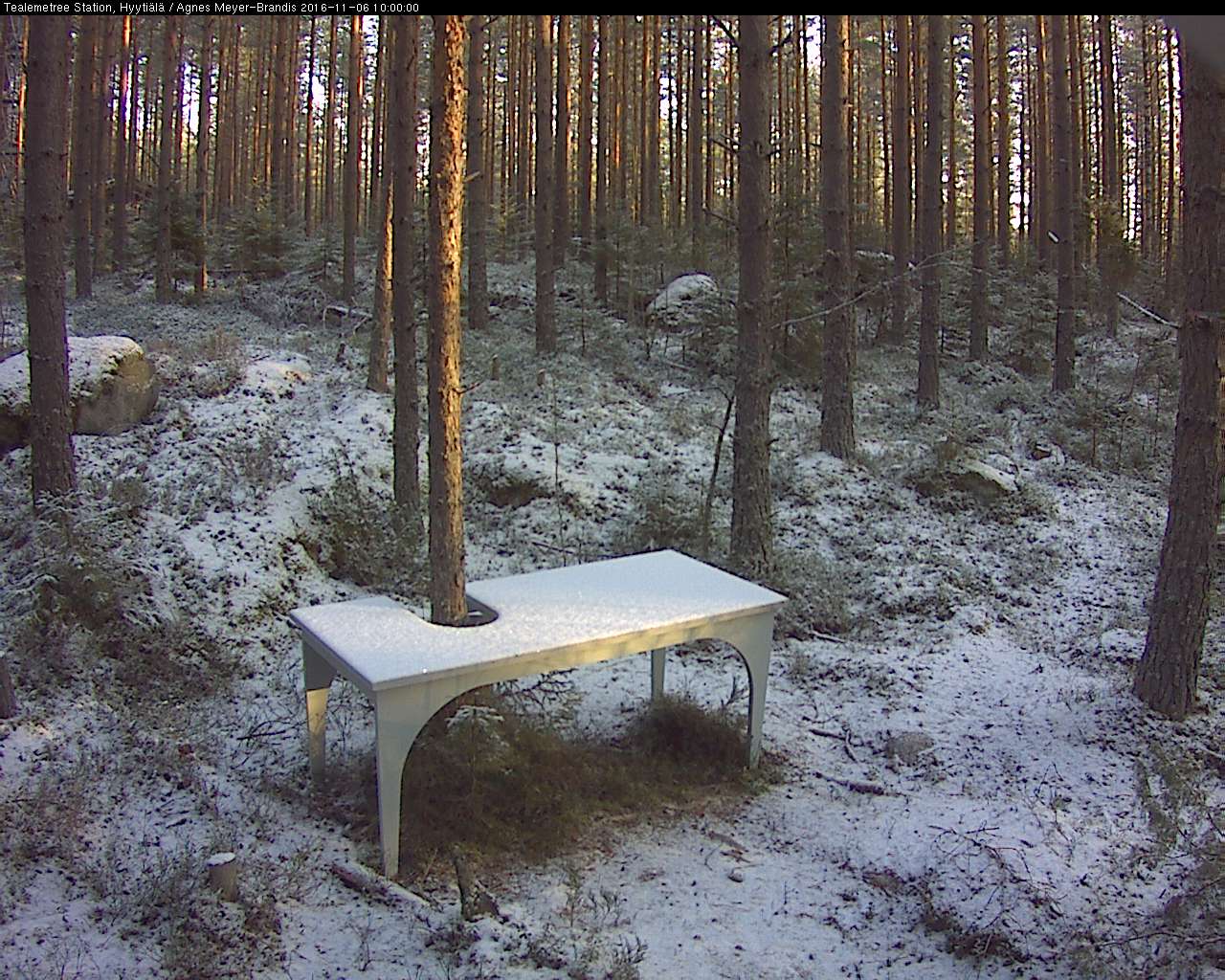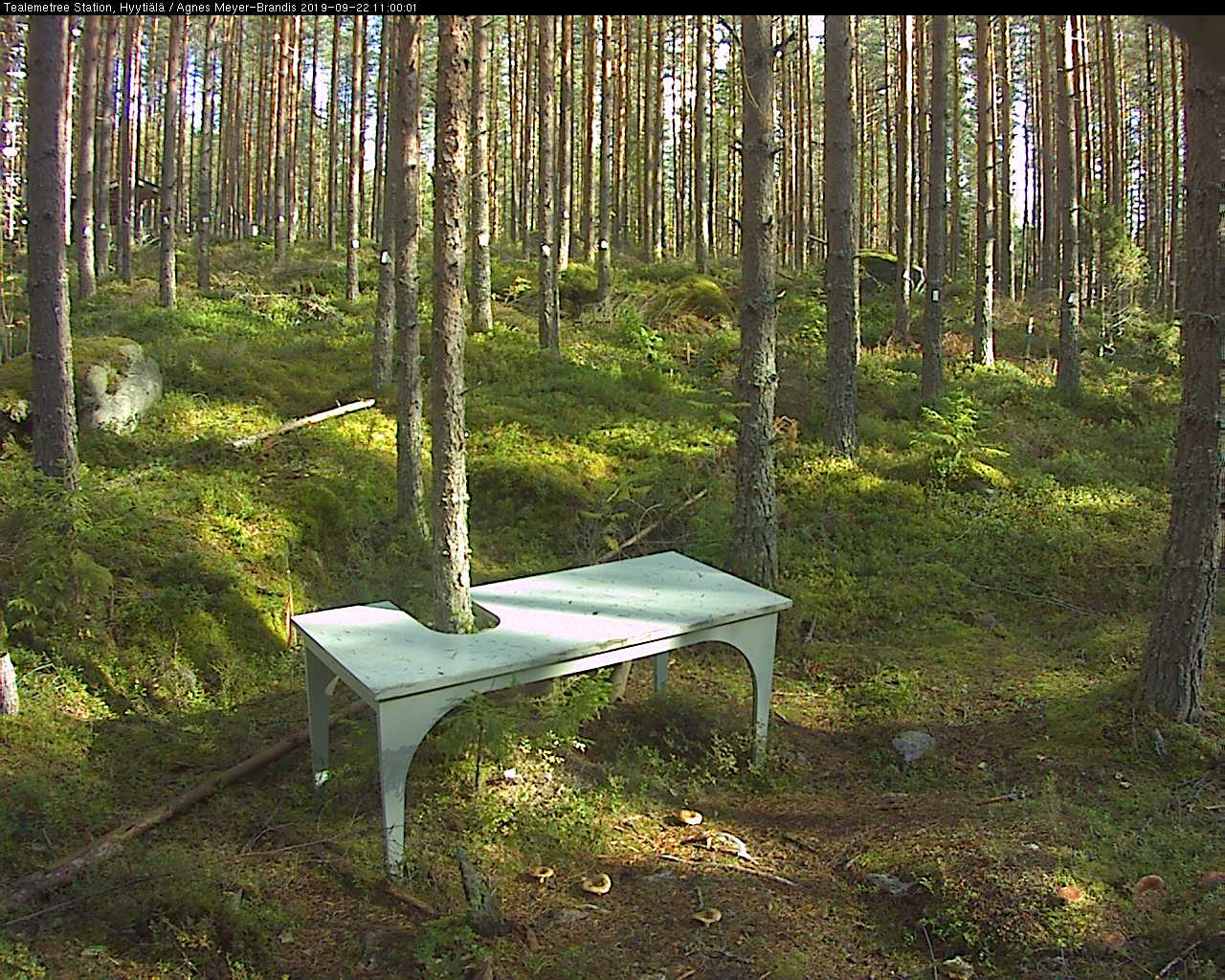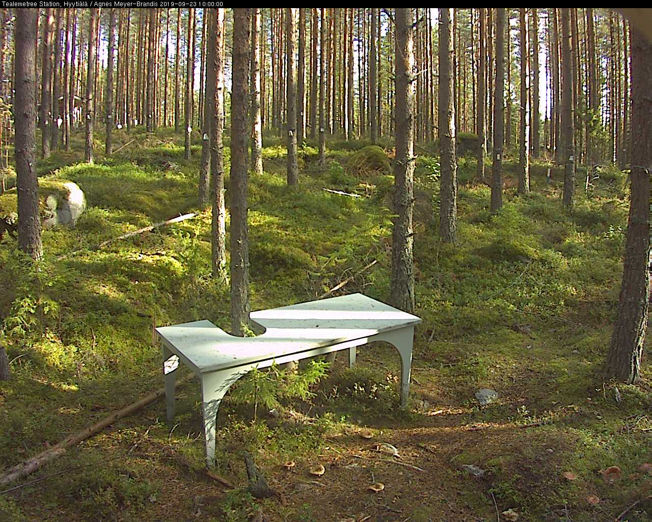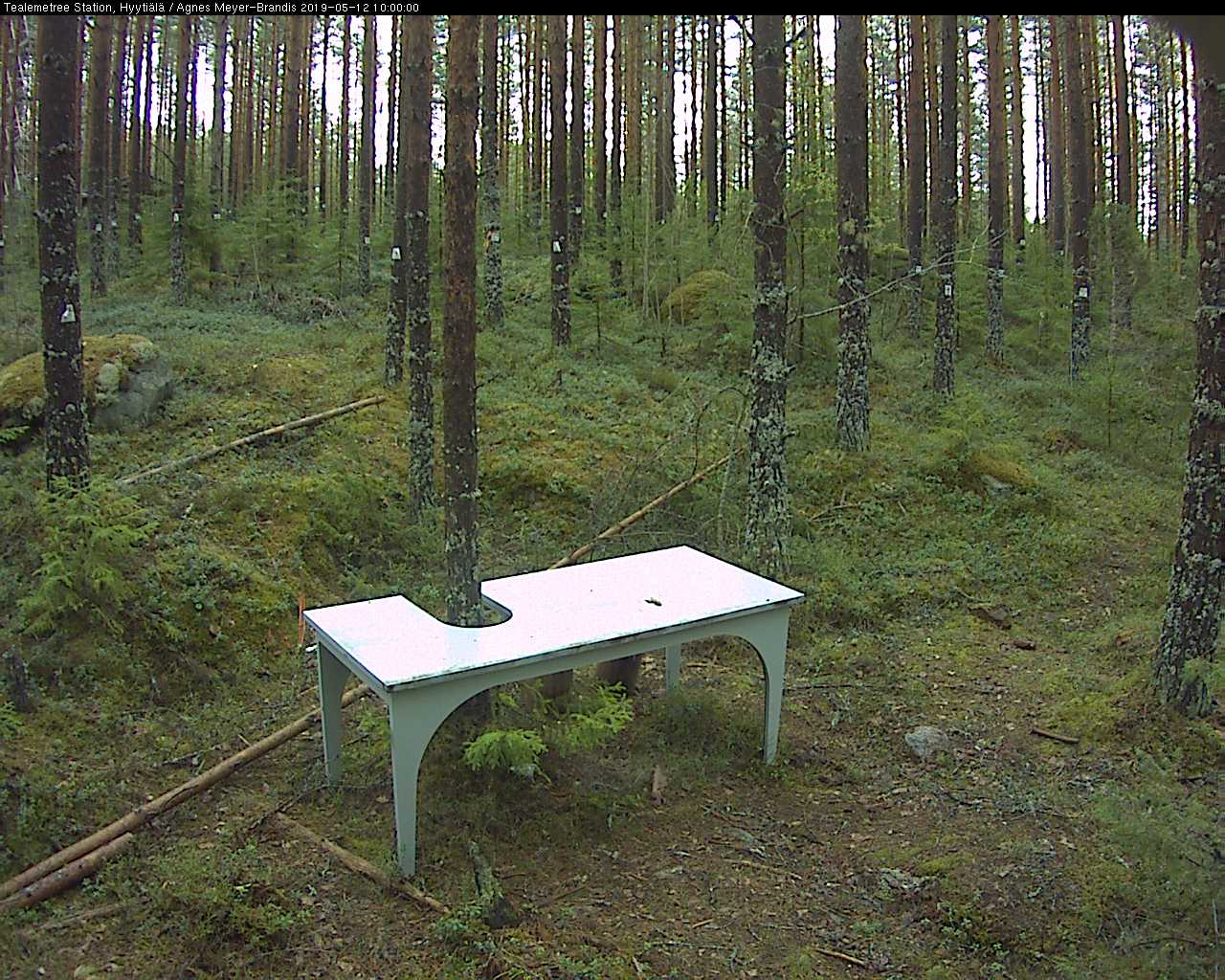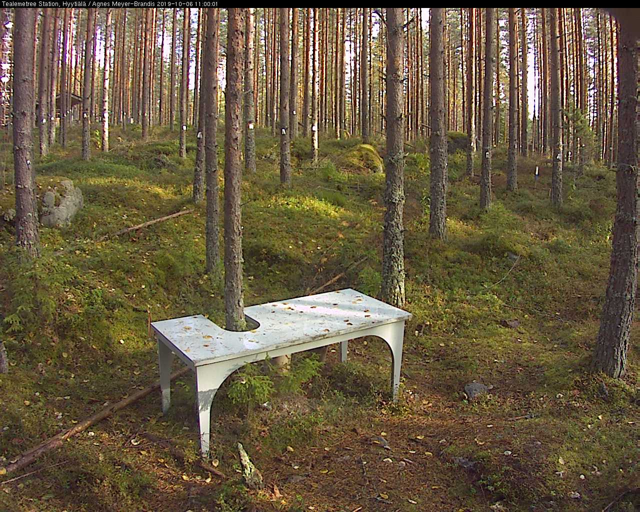 Agnes Meyer-Brandiksen työ Hyytiälässä alkoi tutustumalla aseman muihin tutkijoihin. Pystyäkseen tapaamaan ihmisiä metsässä, hän rakensi pöydän, josta muodostui kohtauspiste ja paikka teehetkille Agneksen ja puun kanssa.
