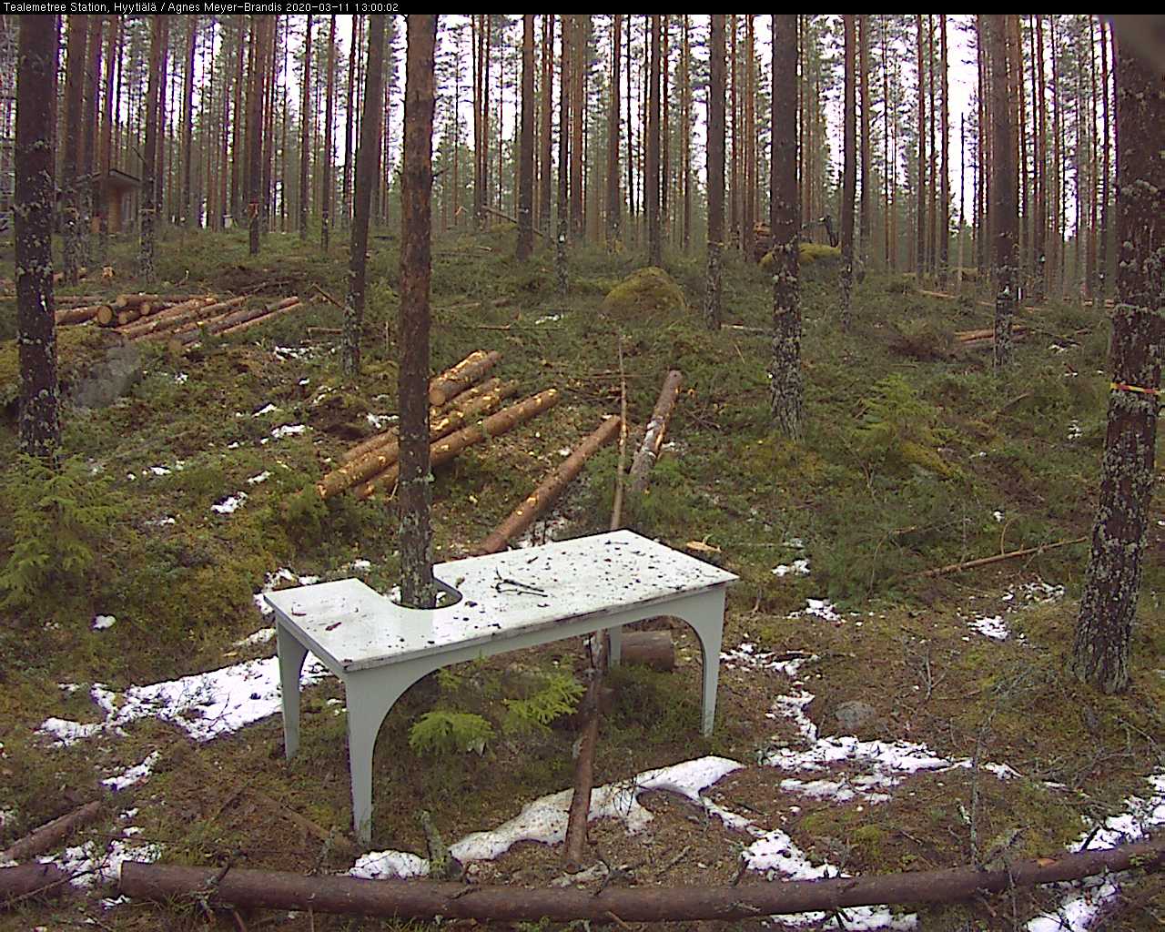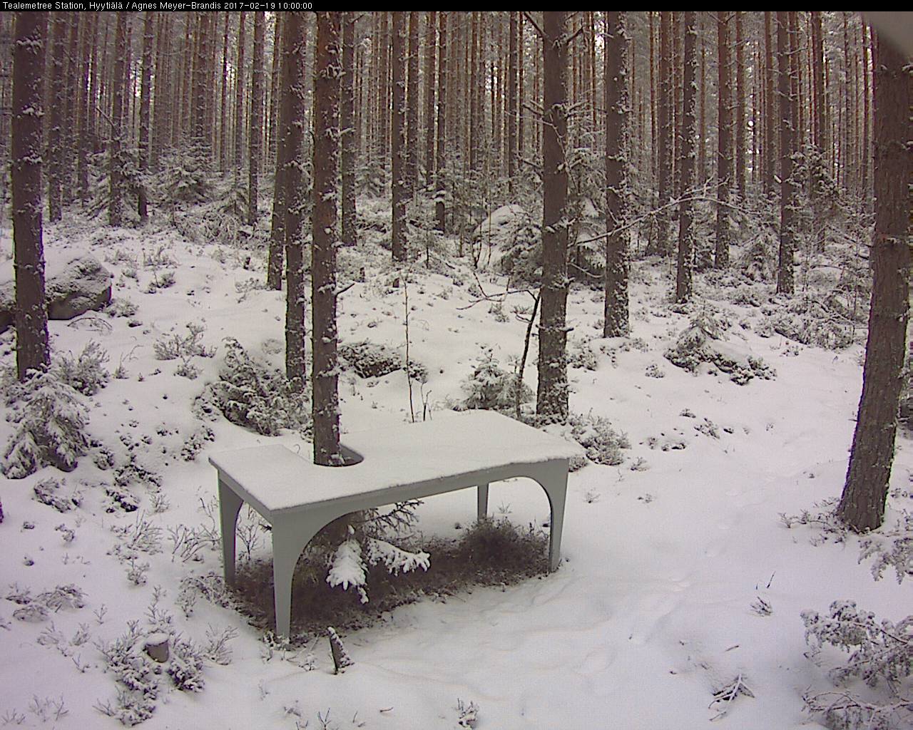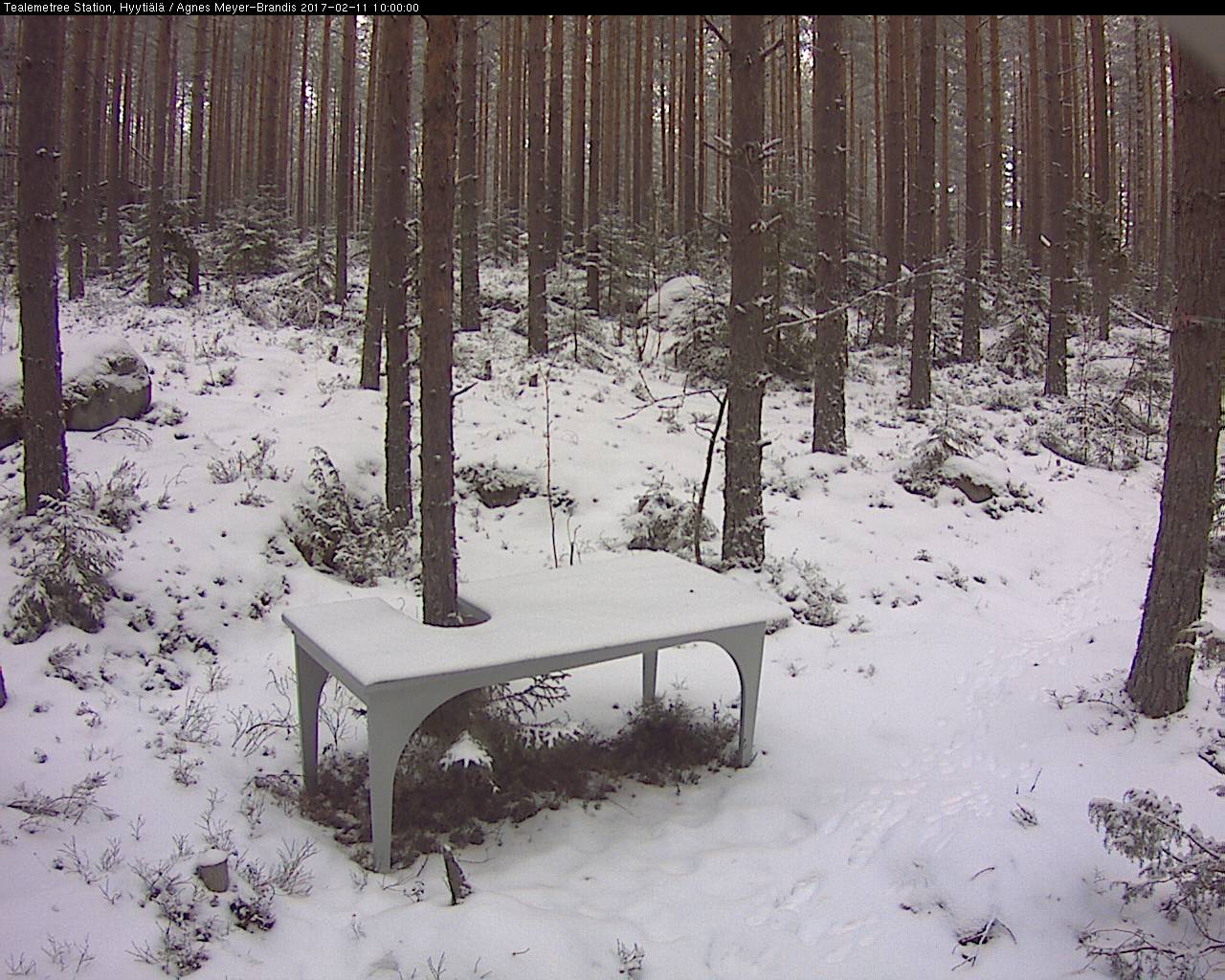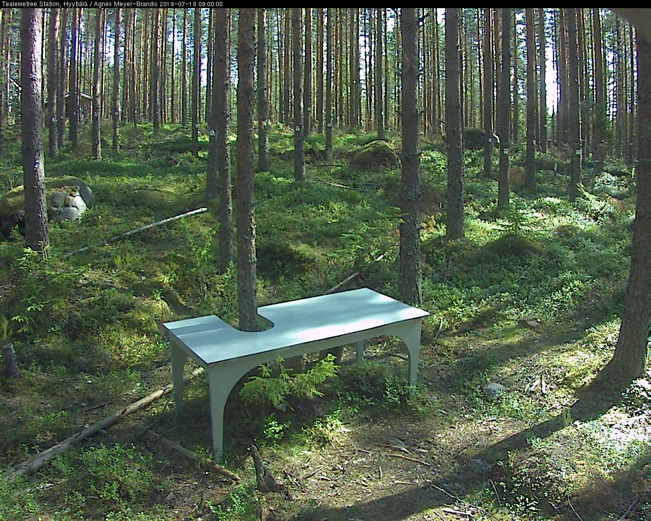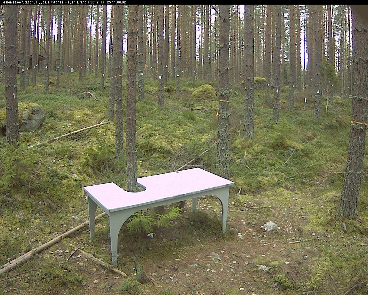 Agnes Meyer-Brandiksen työ Hyytiälässä alkoi tutustumalla aseman muihin tutkijoihin. Pystyäkseen tapaamaan ihmisiä metsässä, hän rakensi pöydän, josta muodostui kohtauspiste ja paikka teehetkille Agneksen ja puun kanssa.