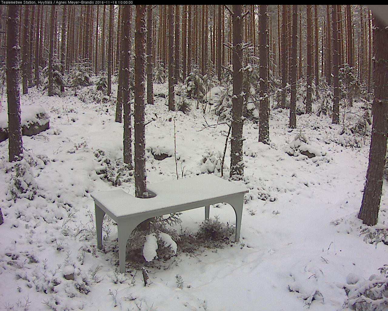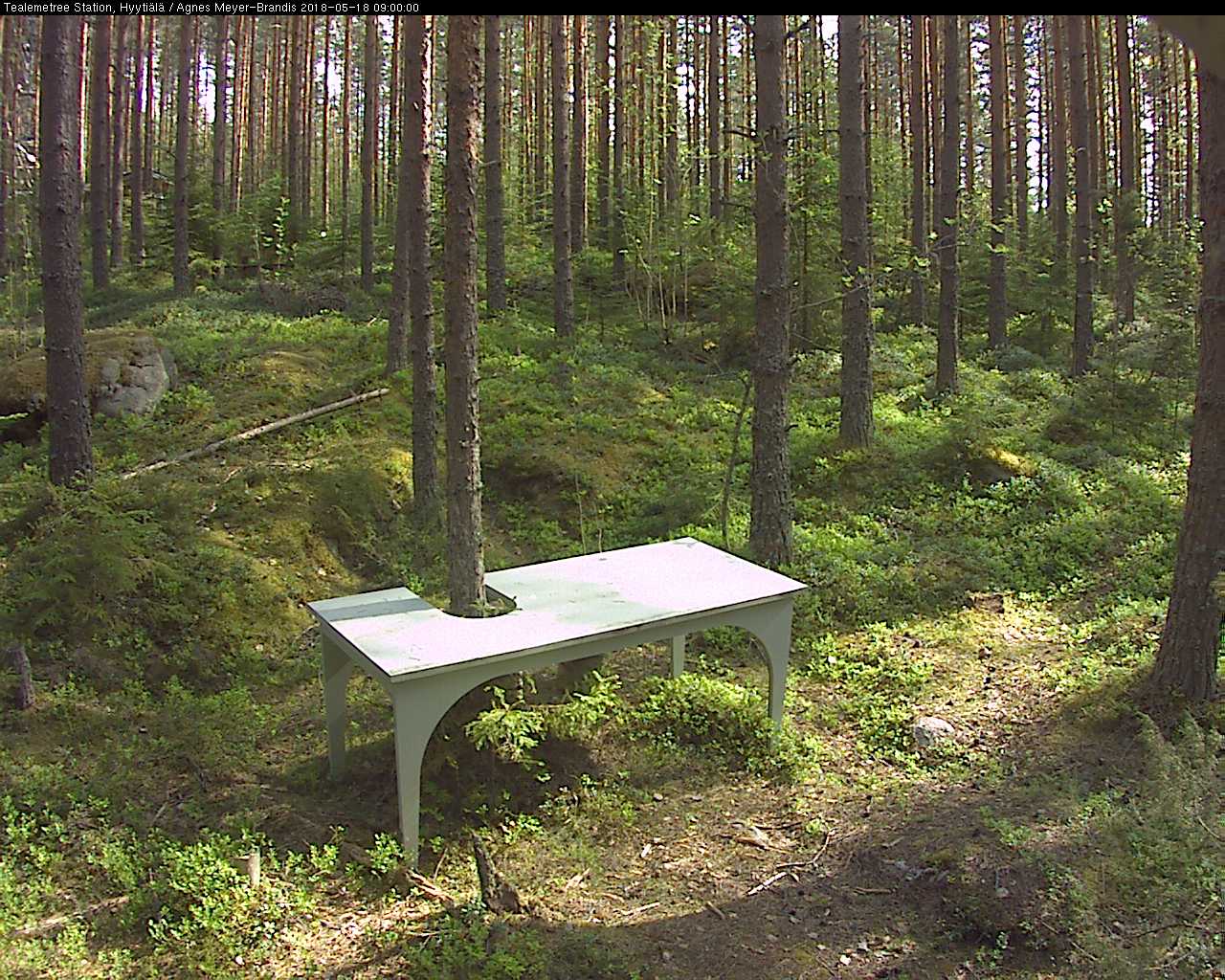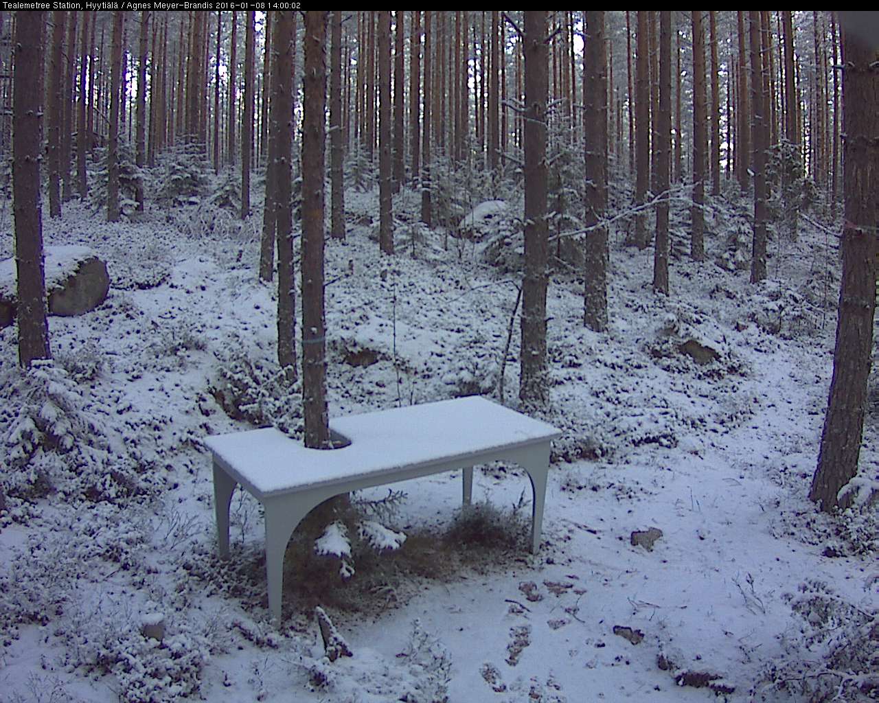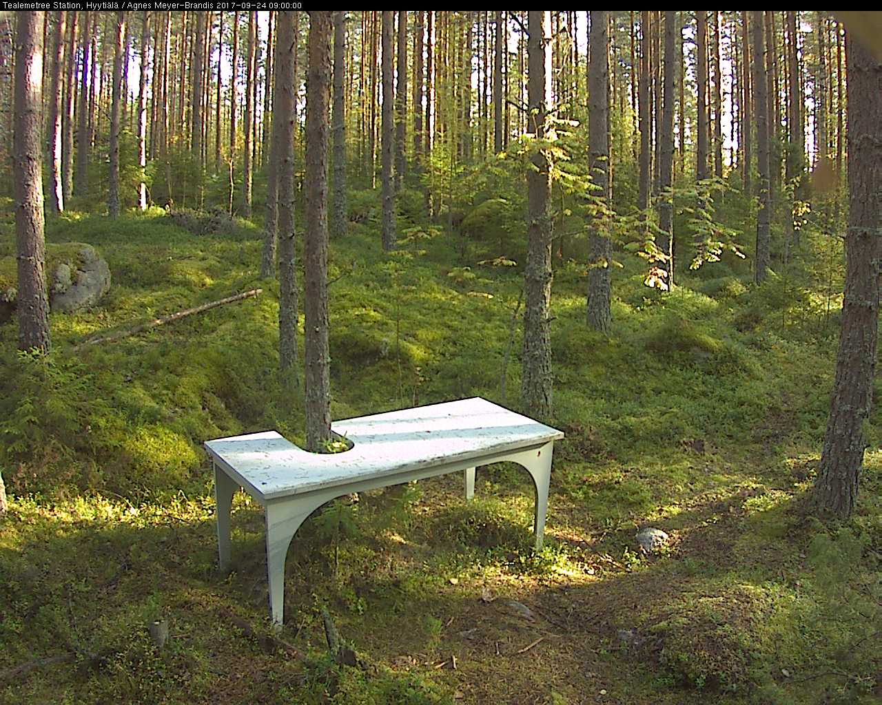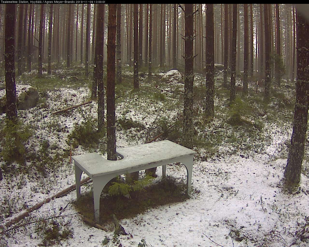Agnes Meyer-Brandiksen työ Hyytiälässä alkoi tutustumalla aseman muihin tutkijoihin. Pystyäkseen tapaamaan ihmisiä metsässä, hän rakensi pöydän, josta muodostui kohtauspiste ja paikka teehetkille Agneksen ja puun kanssa.