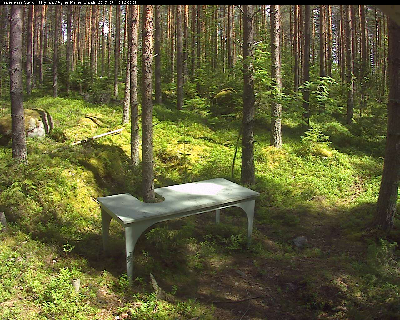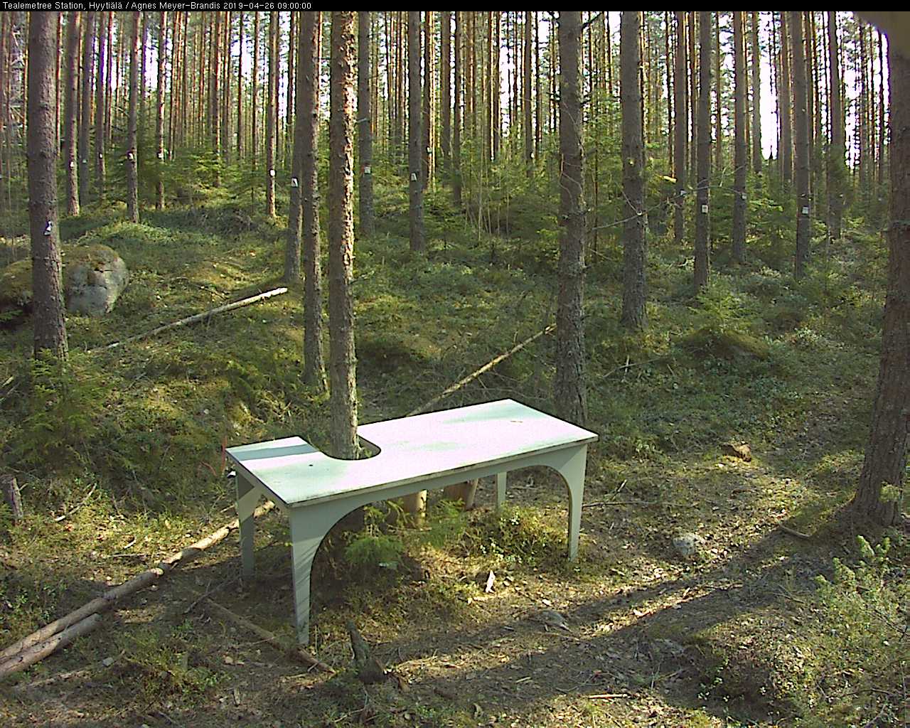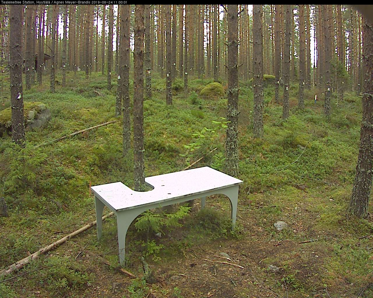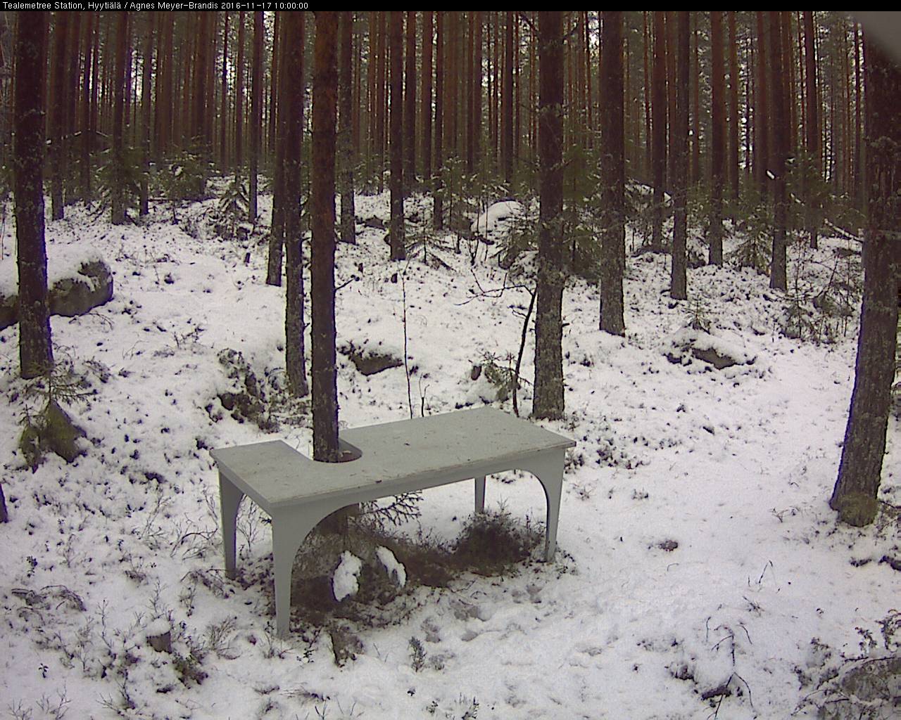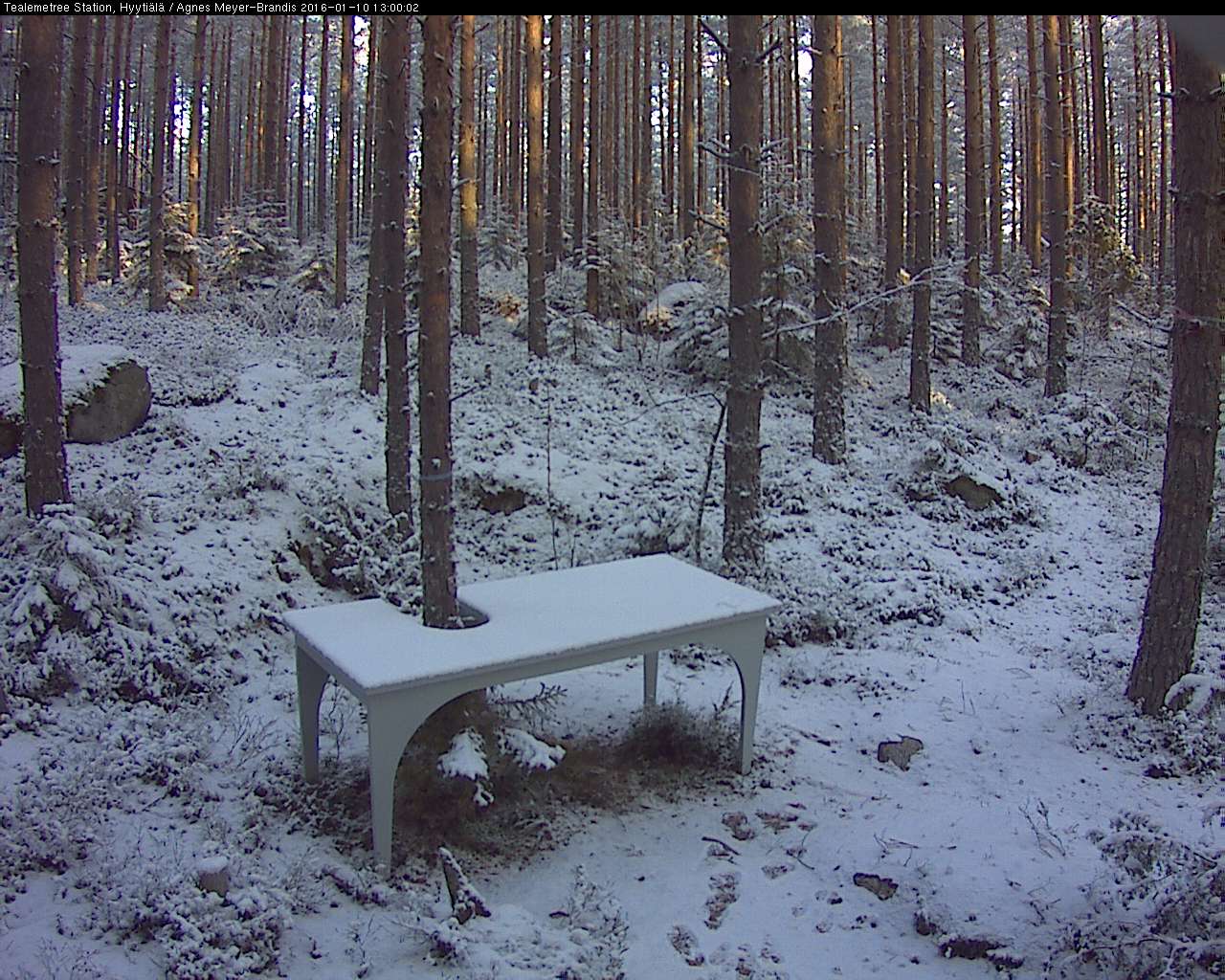 Agnes Meyer-Brandiksen työ Hyytiälässä alkoi tutustumalla aseman muihin tutkijoihin. Pystyäkseen tapaamaan ihmisiä metsässä, hän rakensi pöydän, josta muodostui kohtauspiste ja paikka teehetkille Agneksen ja puun kanssa.