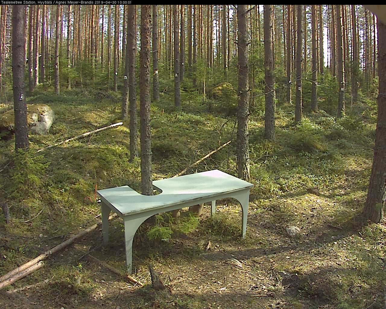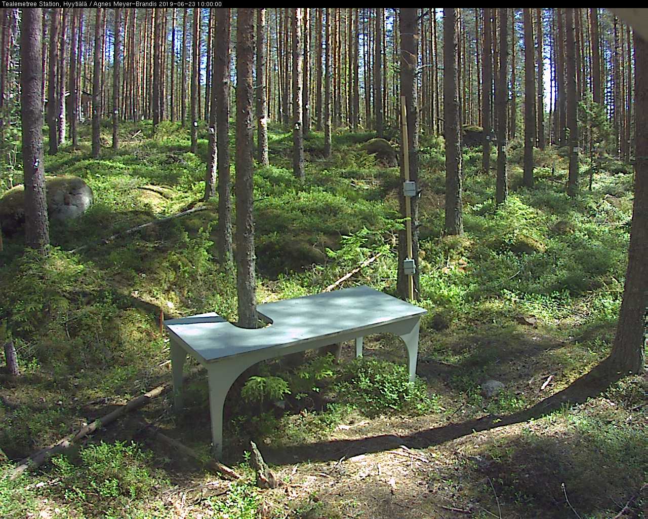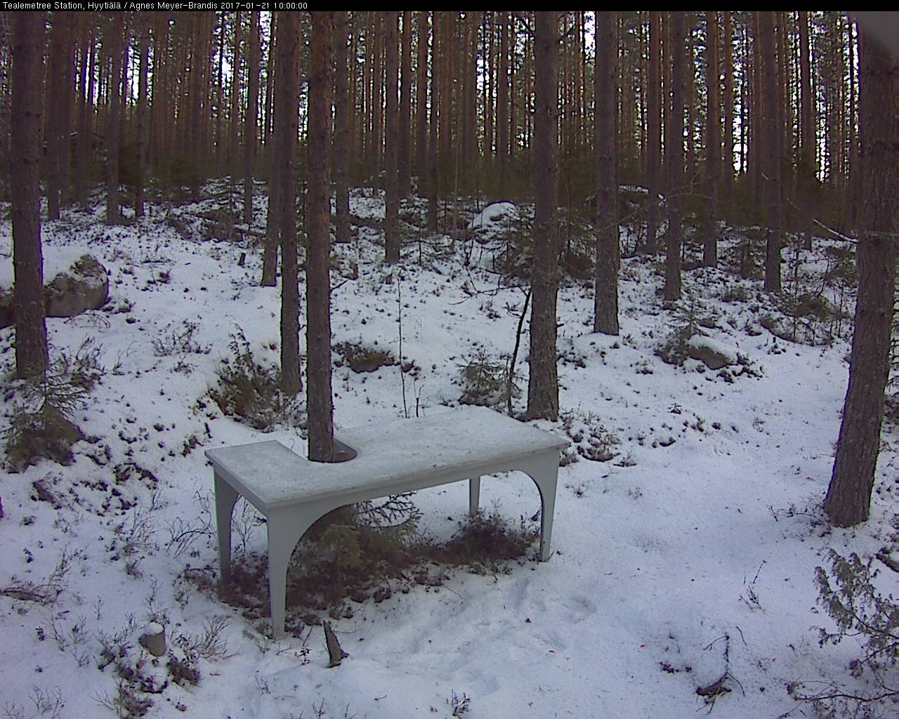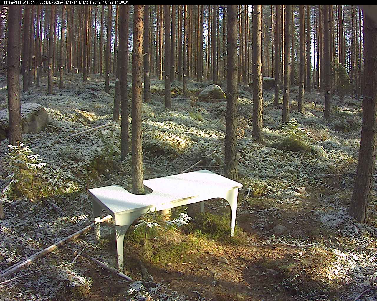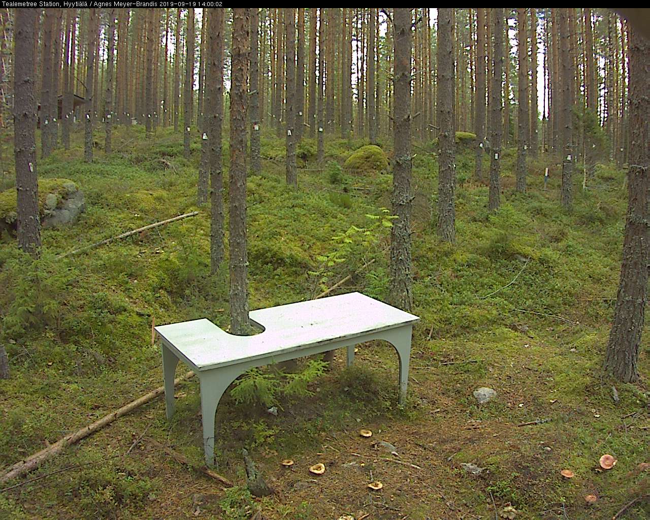 Agnes Meyer-Brandiksen työ Hyytiälässä alkoi tutustumalla aseman muihin tutkijoihin. Pystyäkseen tapaamaan ihmisiä metsässä, hän rakensi pöydän, josta muodostui kohtauspiste ja paikka teehetkille Agneksen ja puun kanssa.