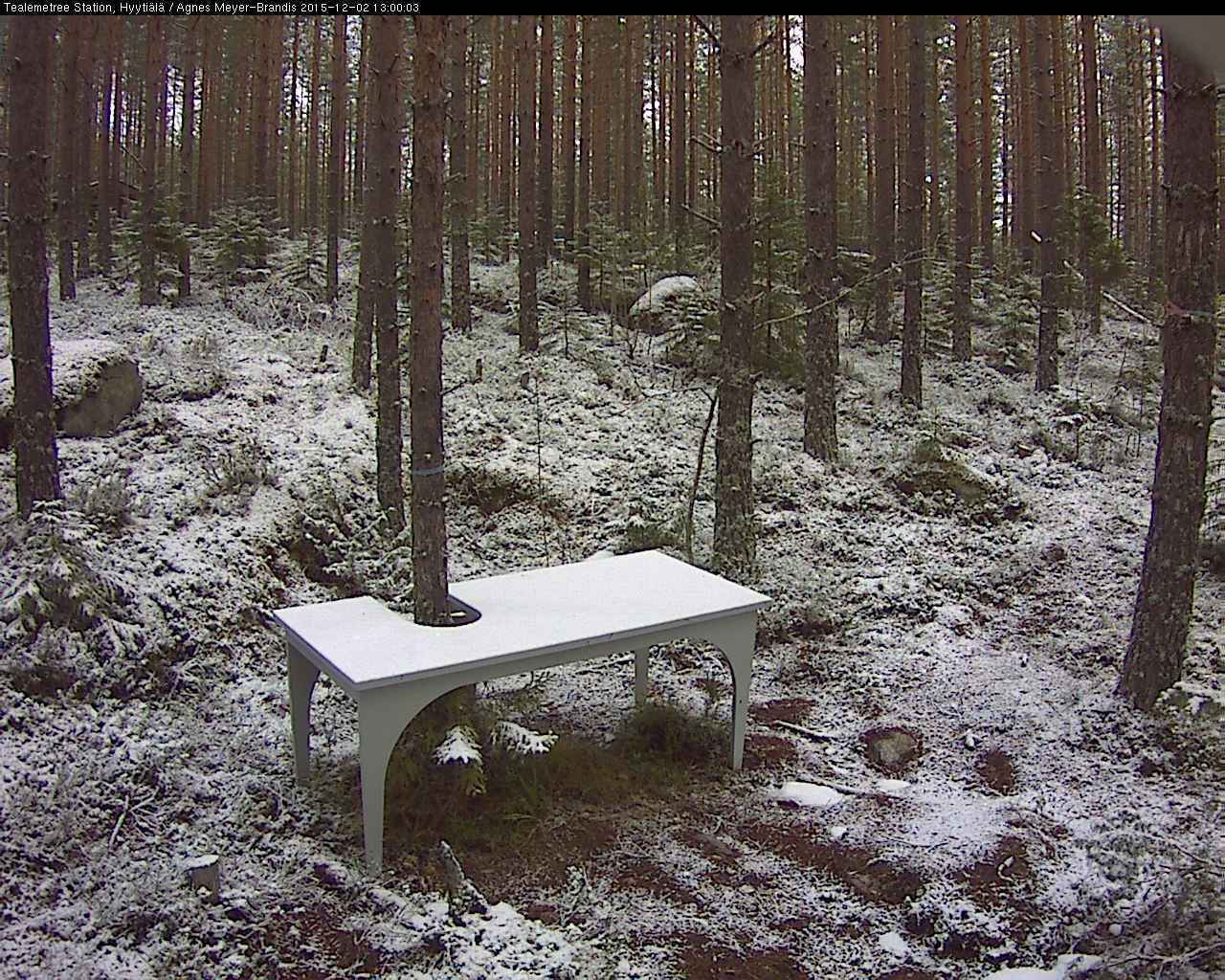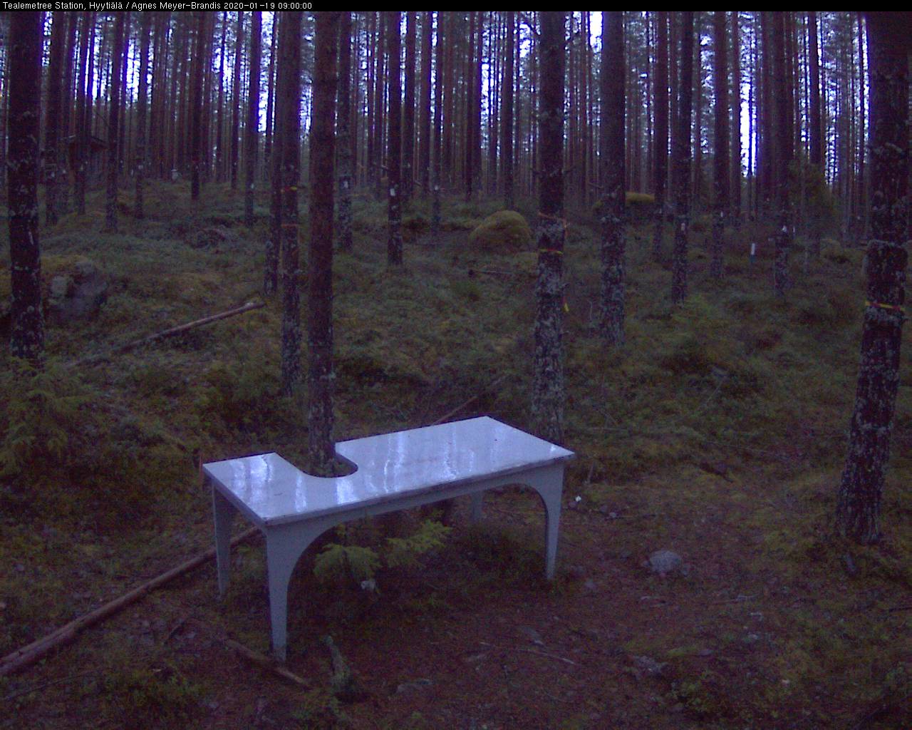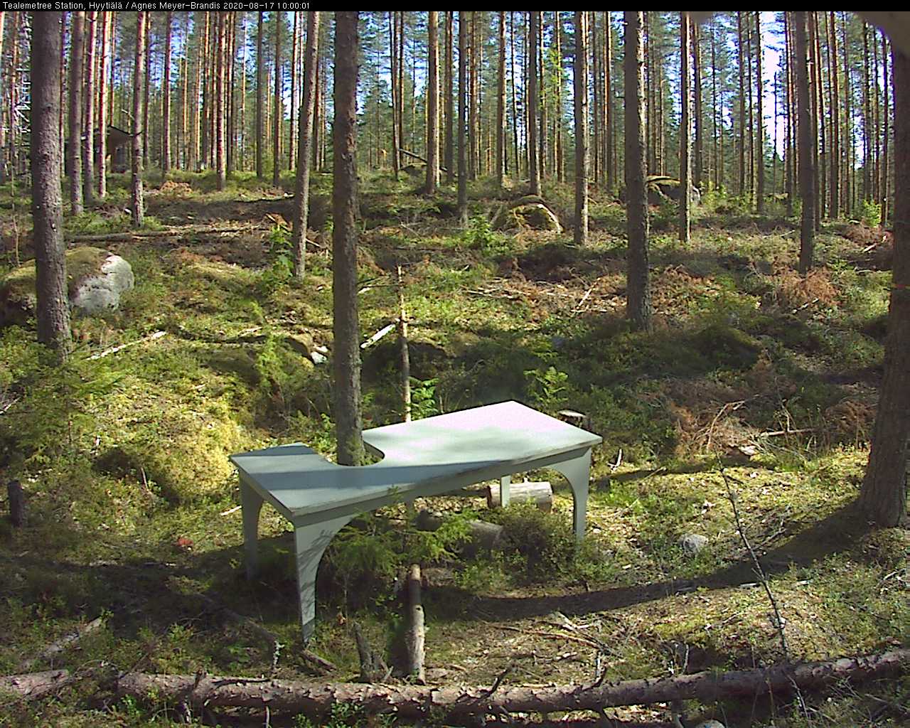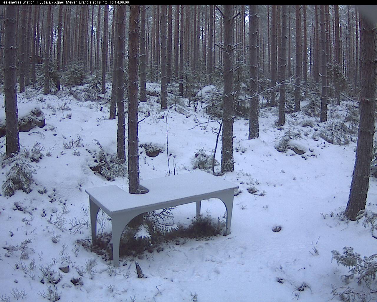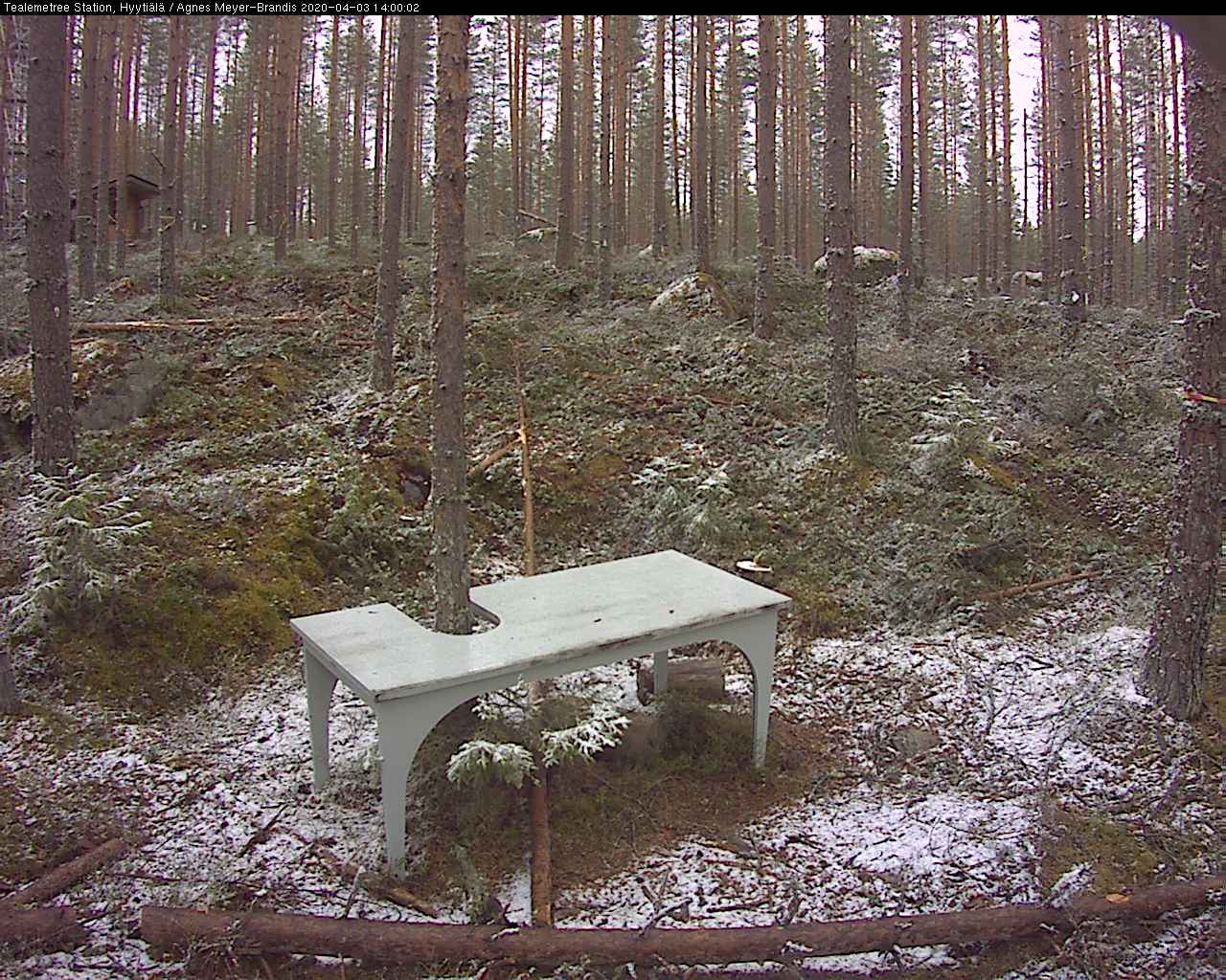 Agnes Meyer-Brandiksen työ Hyytiälässä alkoi tutustumalla aseman muihin tutkijoihin. Pystyäkseen tapaamaan ihmisiä metsässä, hän rakensi pöydän, josta muodostui kohtauspiste ja paikka teehetkille Agneksen ja puun kanssa.