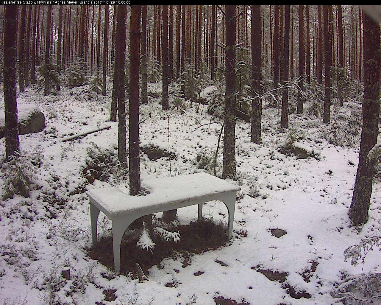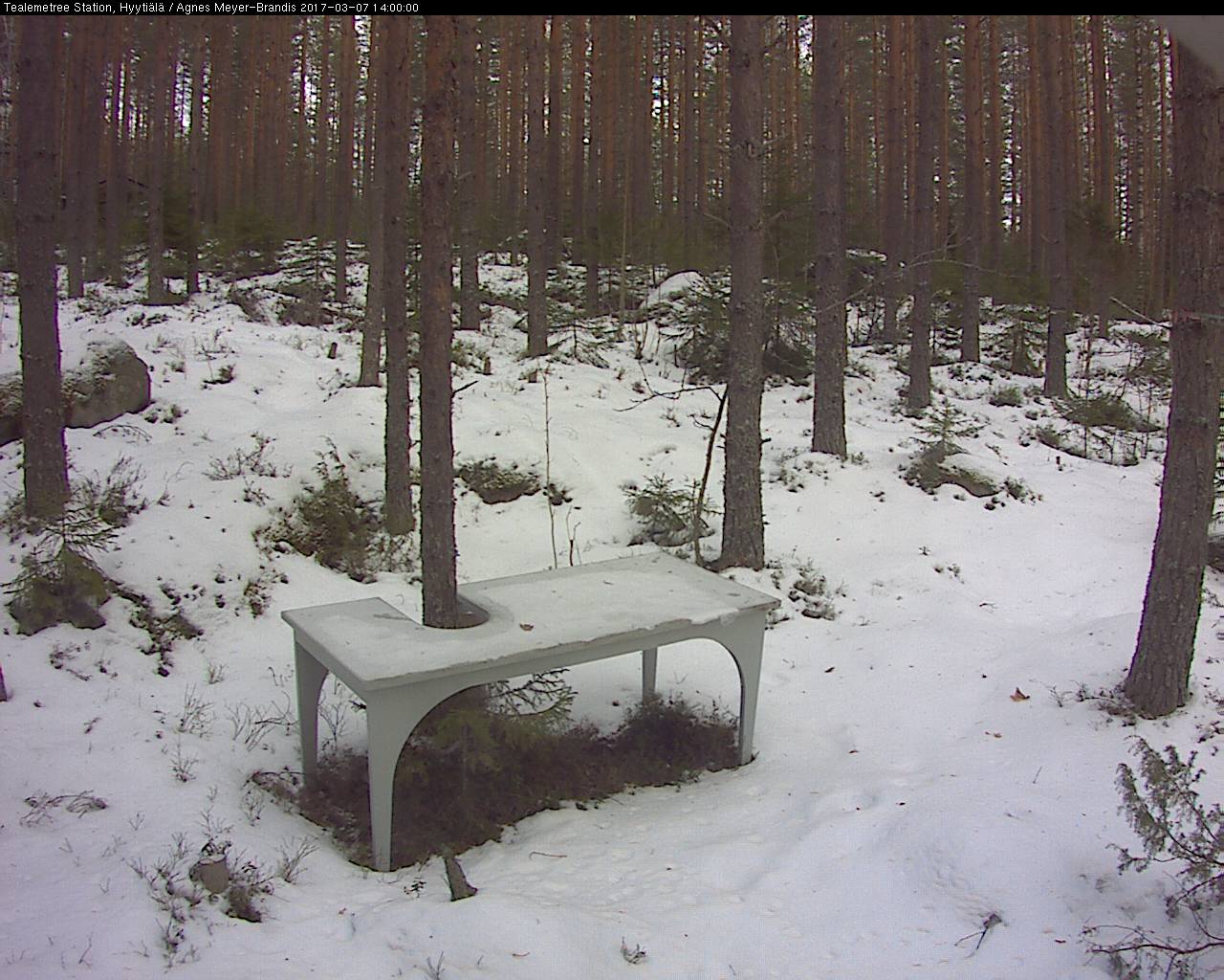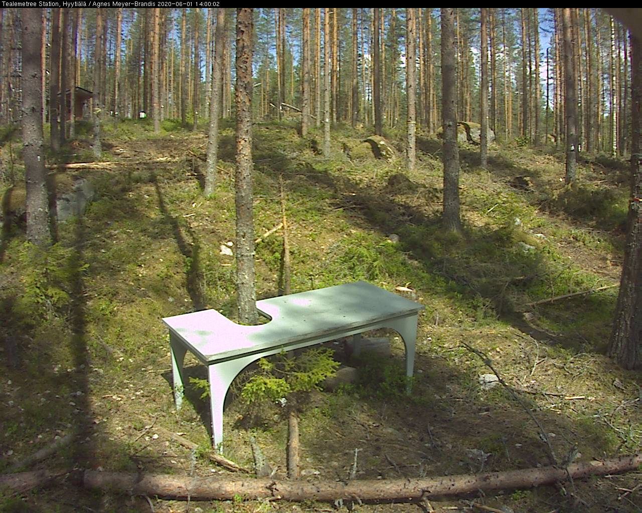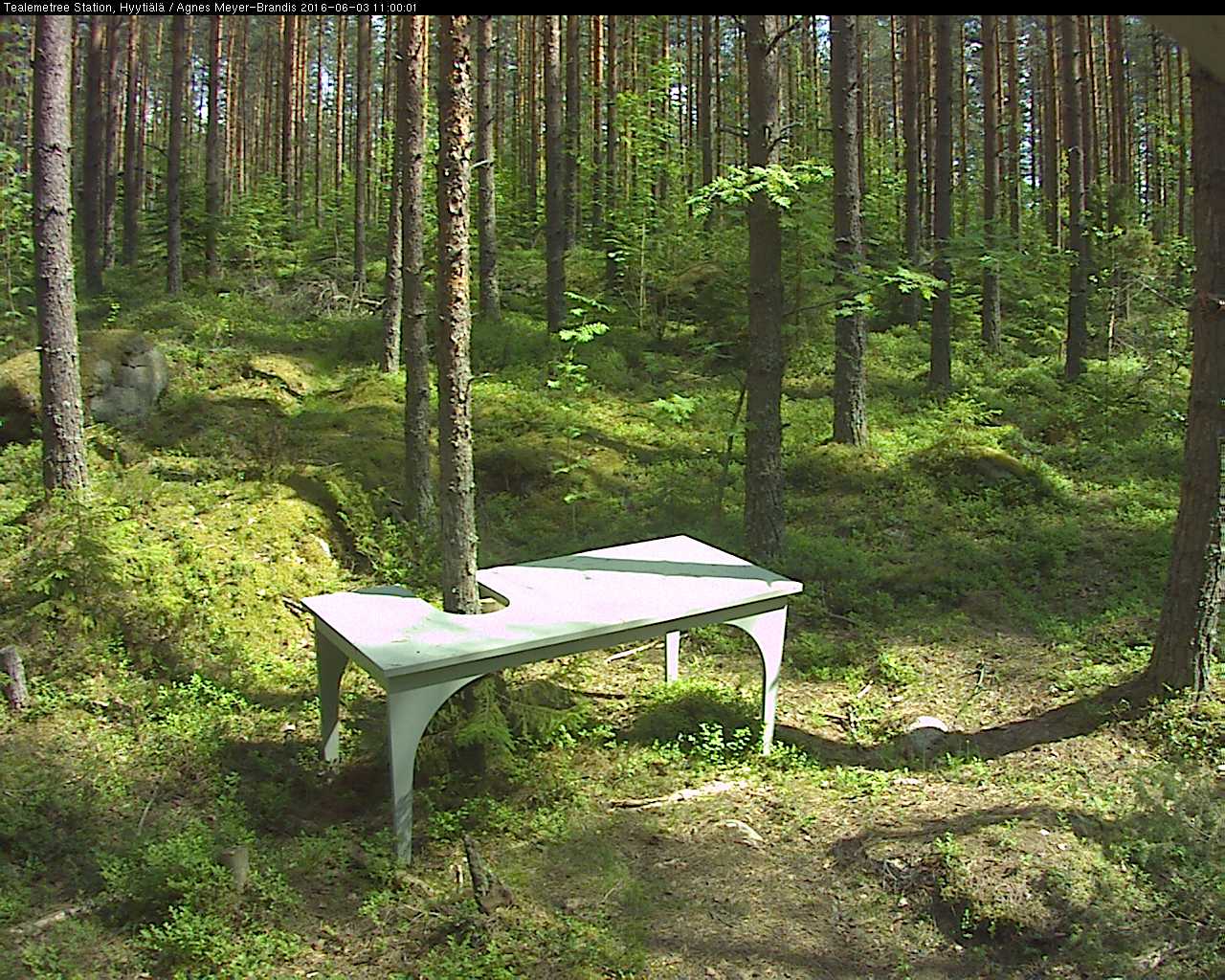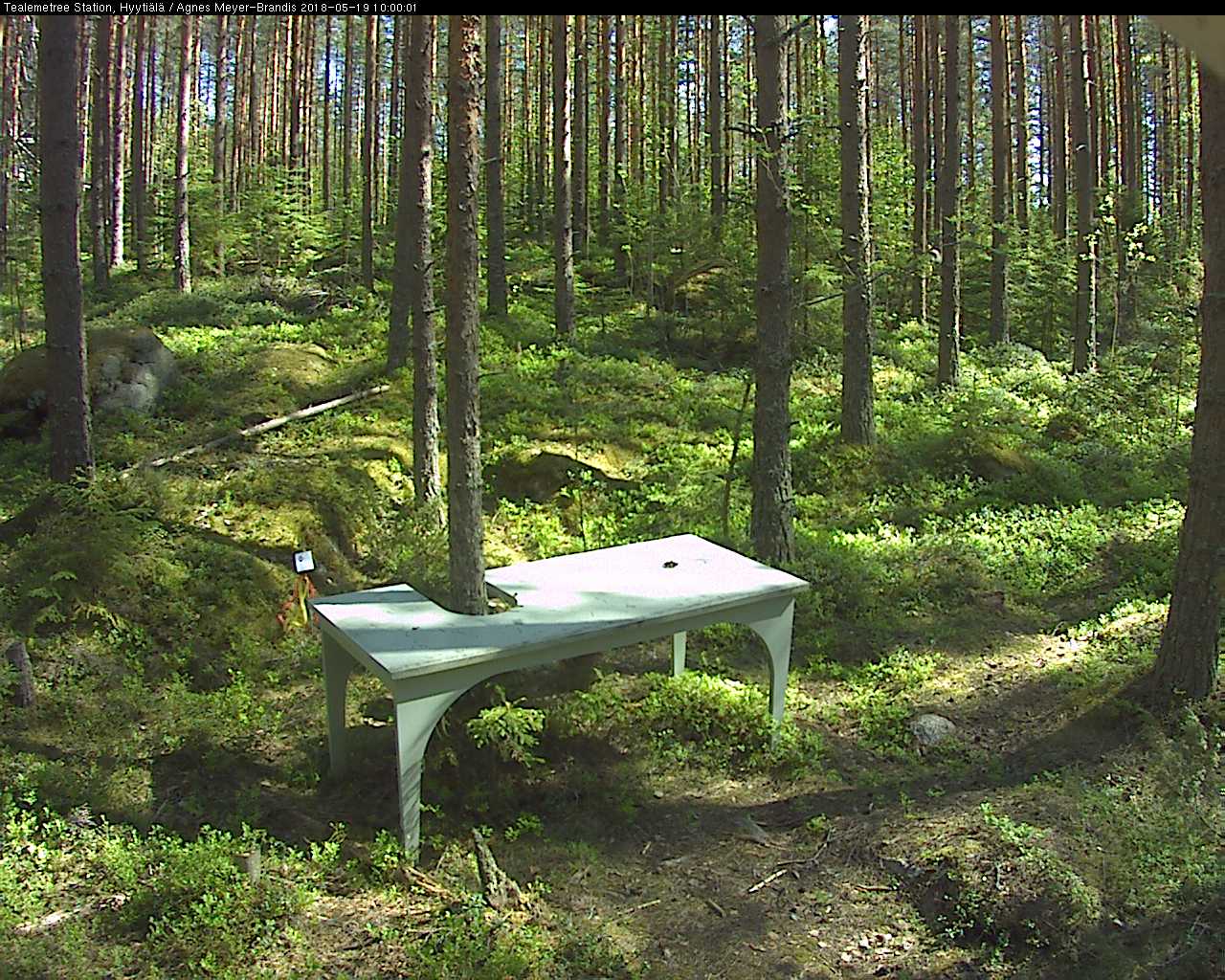 Agnes Meyer-Brandiksen työ Hyytiälässä alkoi tutustumalla aseman muihin tutkijoihin. Pystyäkseen tapaamaan ihmisiä metsässä, hän rakensi pöydän, josta muodostui kohtauspiste ja paikka teehetkille Agneksen ja puun kanssa.