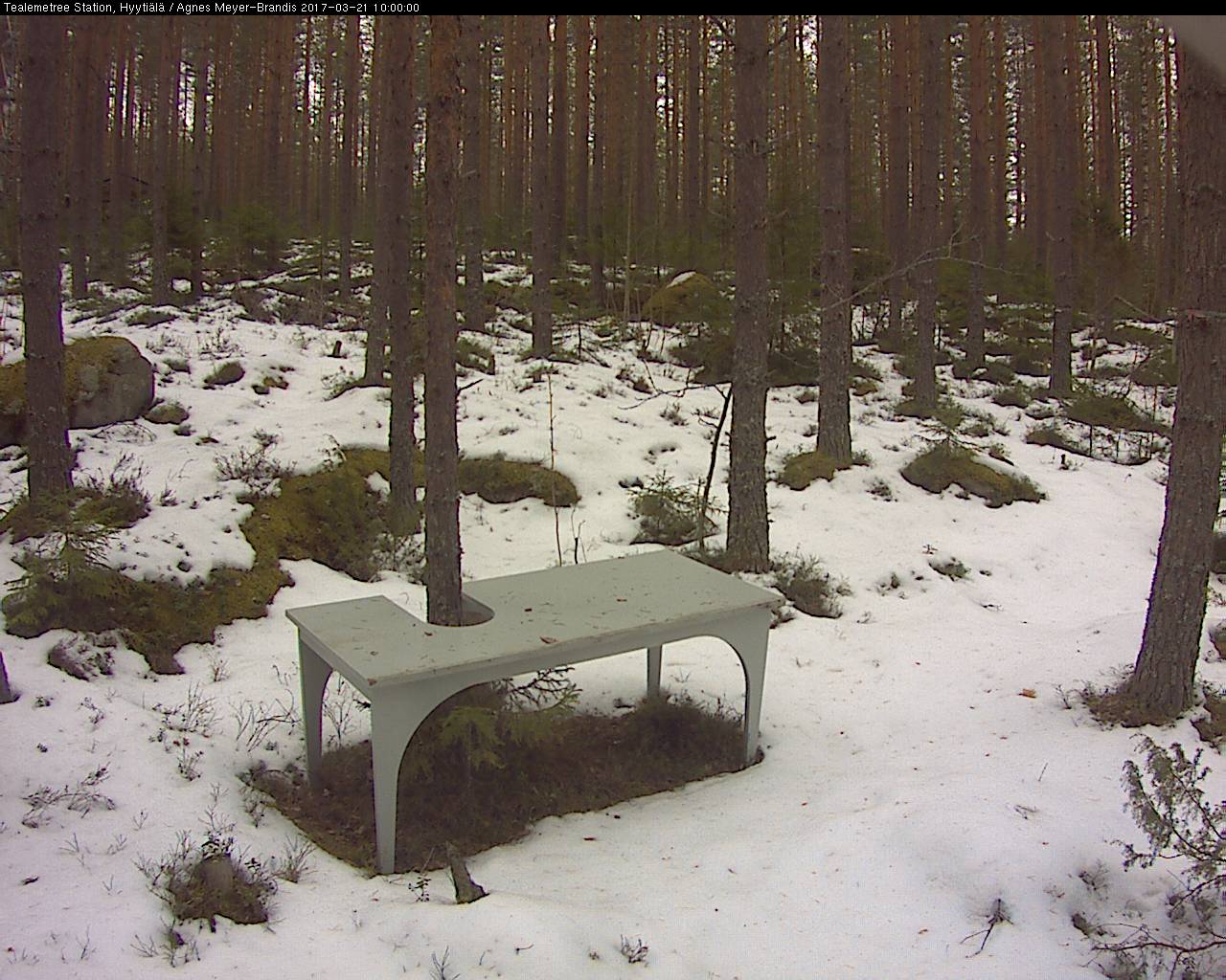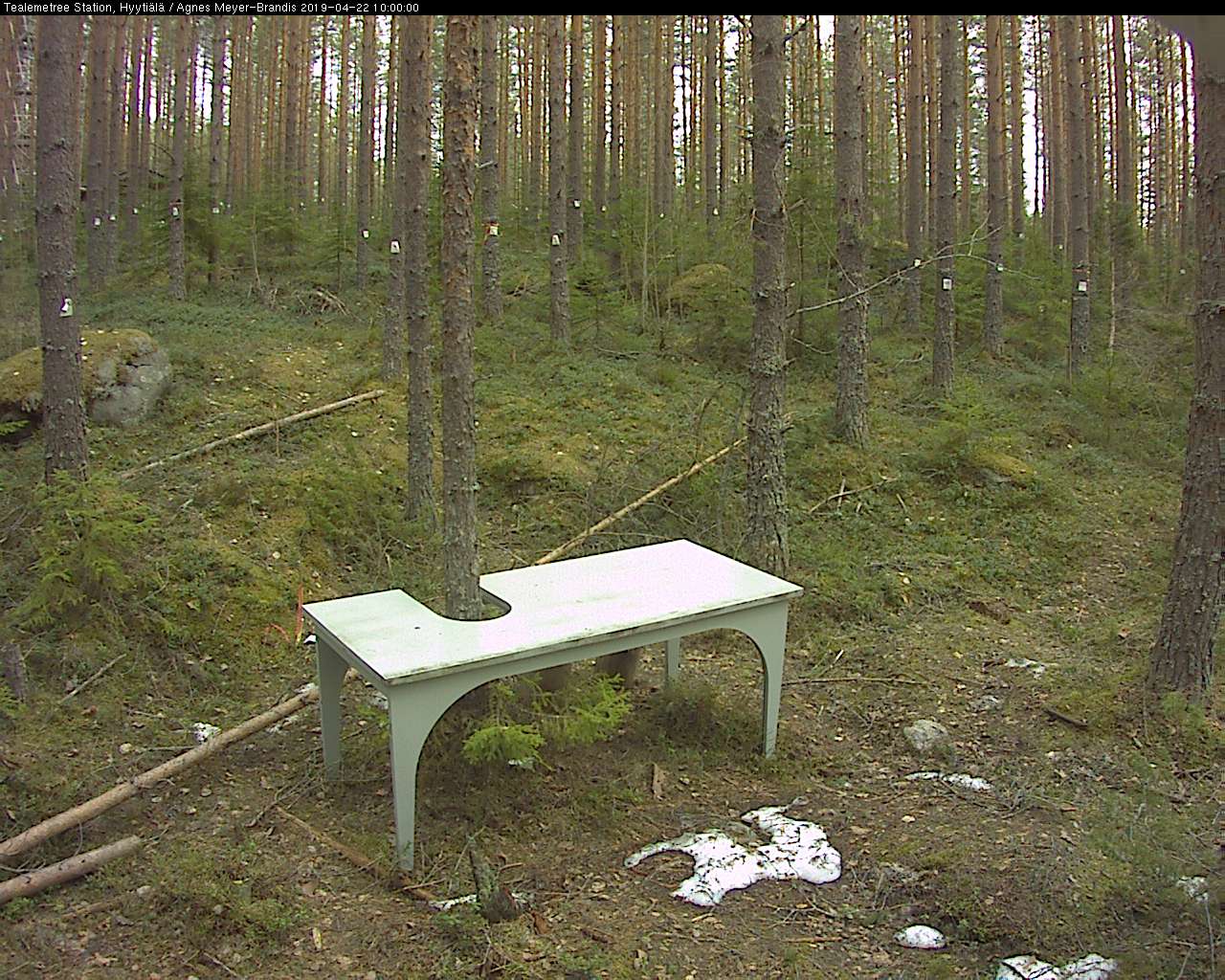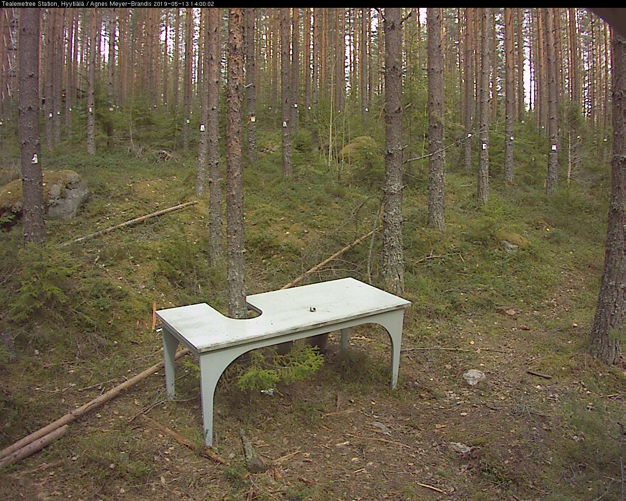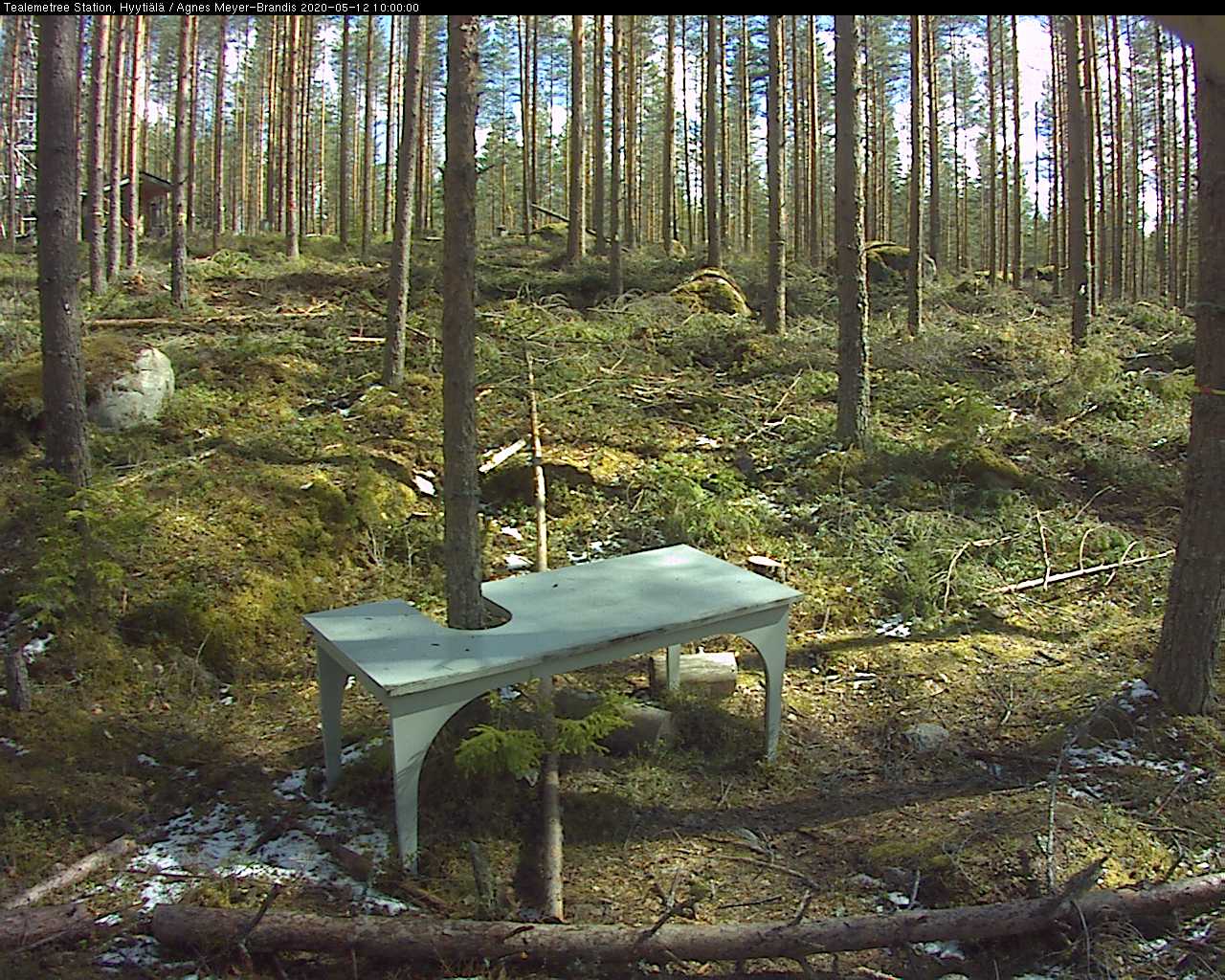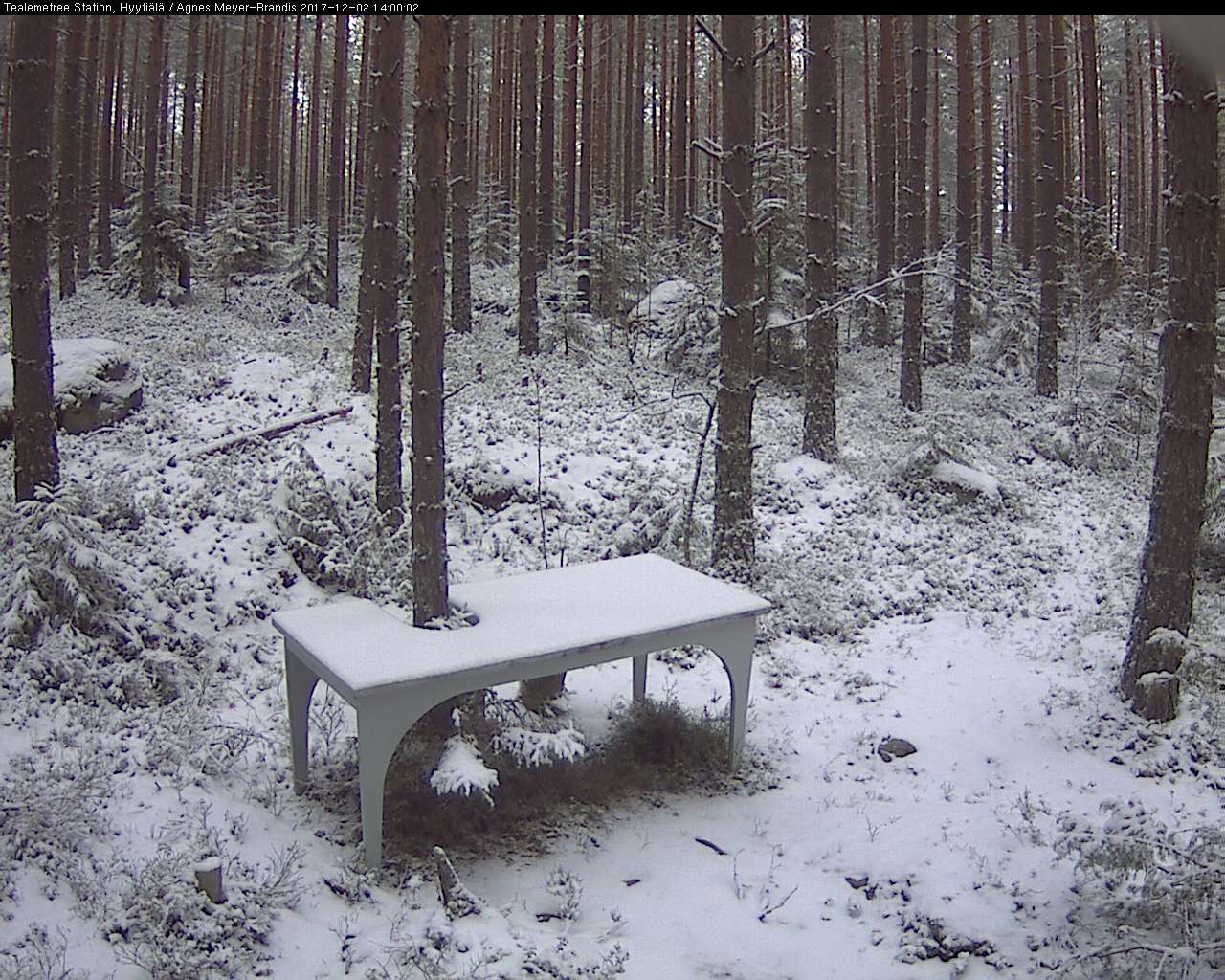 Agnes Meyer-Brandiksen työ Hyytiälässä alkoi tutustumalla aseman muihin tutkijoihin. Pystyäkseen tapaamaan ihmisiä metsässä, hän rakensi pöydän, josta muodostui kohtauspiste ja paikka teehetkille Agneksen ja puun kanssa.