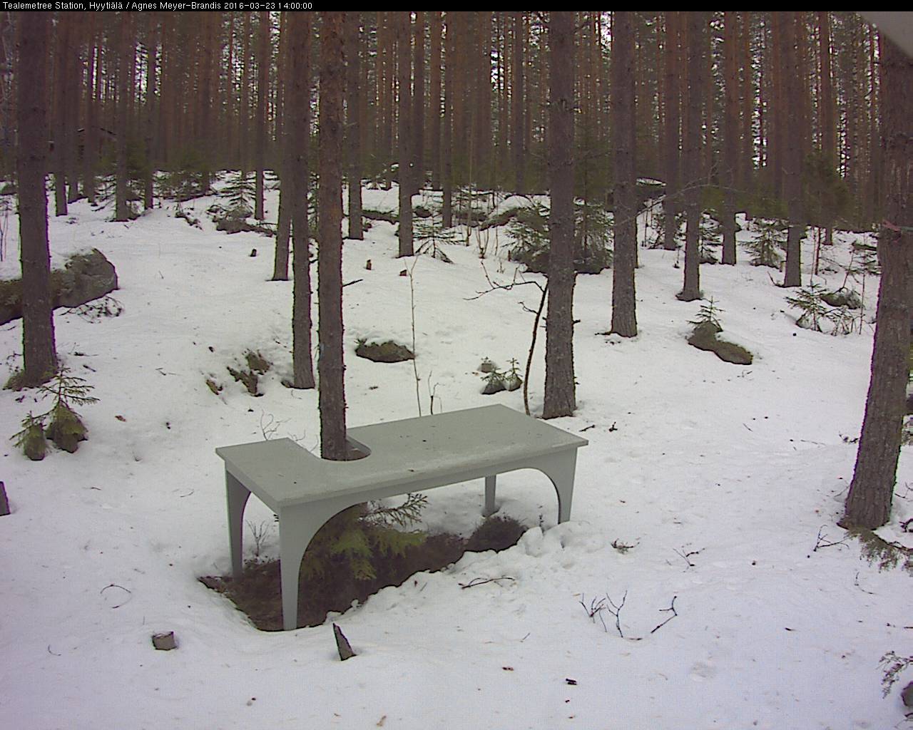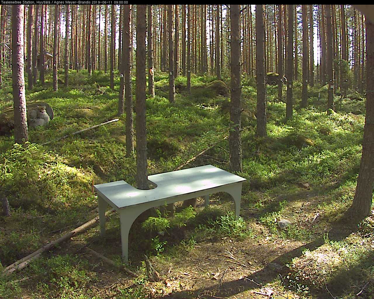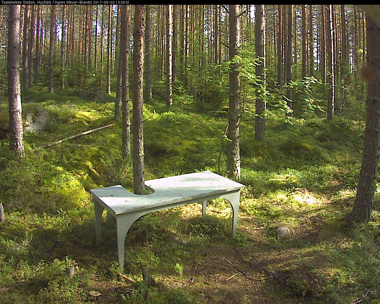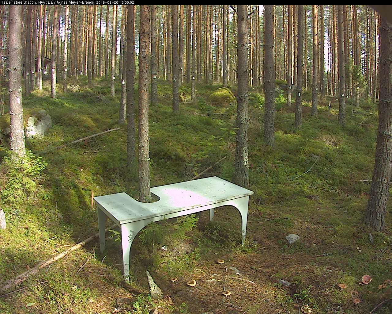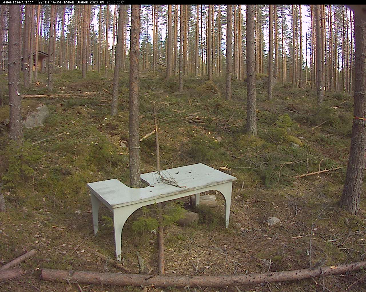Agnes Meyer-Brandiksen työ Hyytiälässä alkoi tutustumalla aseman muihin tutkijoihin. Pystyäkseen tapaamaan ihmisiä metsässä, hän rakensi pöydän, josta muodostui kohtauspiste ja paikka teehetkille Agneksen ja puun kanssa.