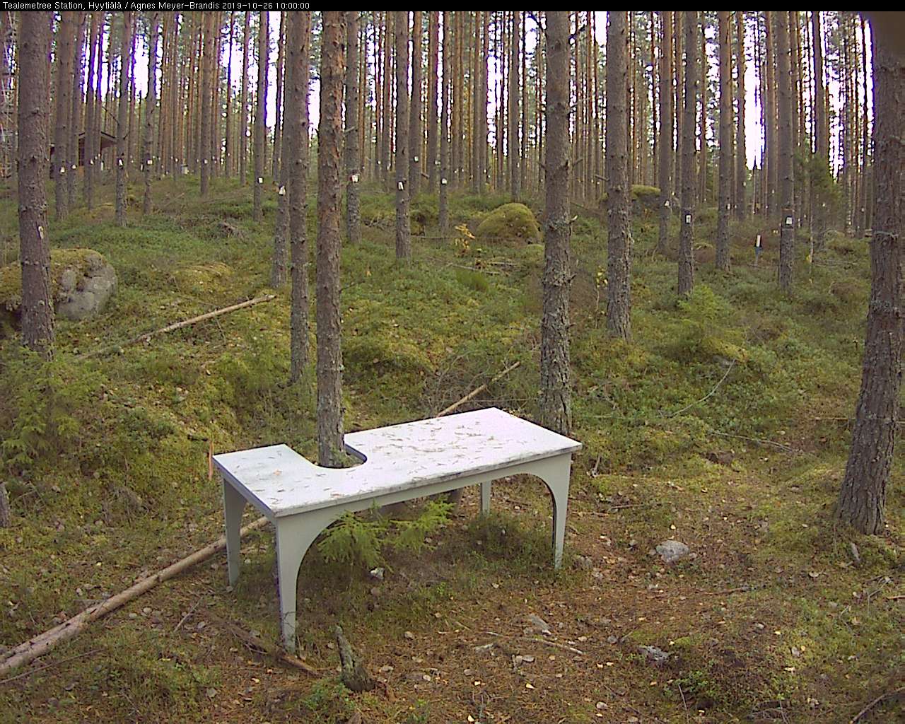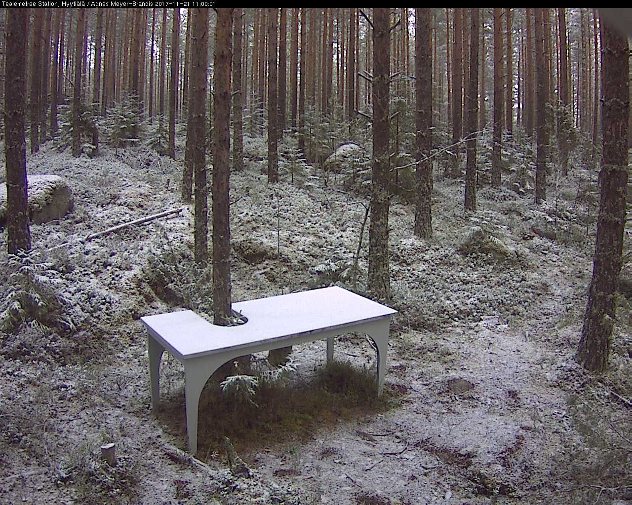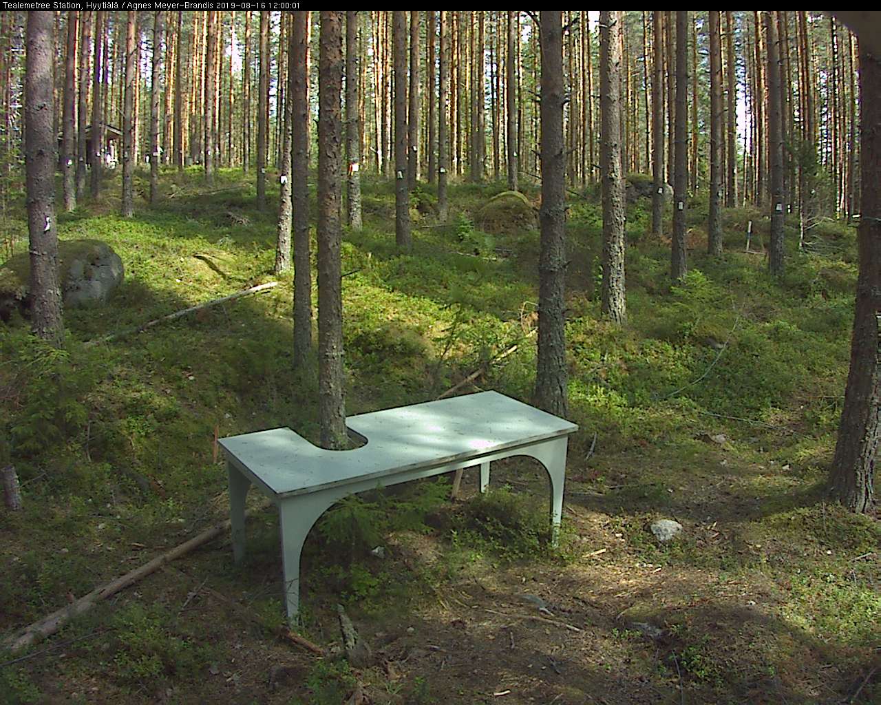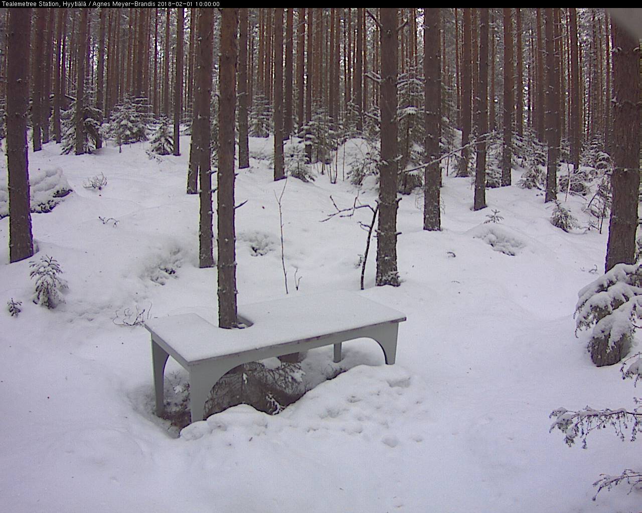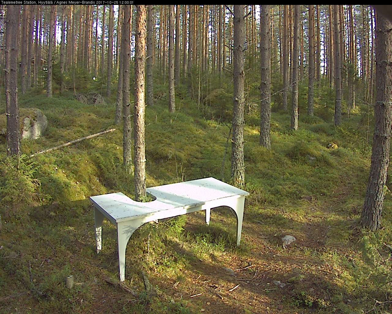 Agnes Meyer-Brandiksen työ Hyytiälässä alkoi tutustumalla aseman muihin tutkijoihin. Pystyäkseen tapaamaan ihmisiä metsässä, hän rakensi pöydän, josta muodostui kohtauspiste ja paikka teehetkille Agneksen ja puun kanssa.
