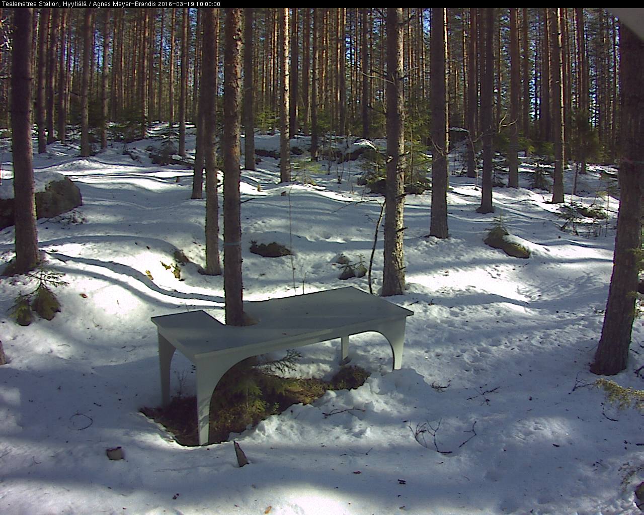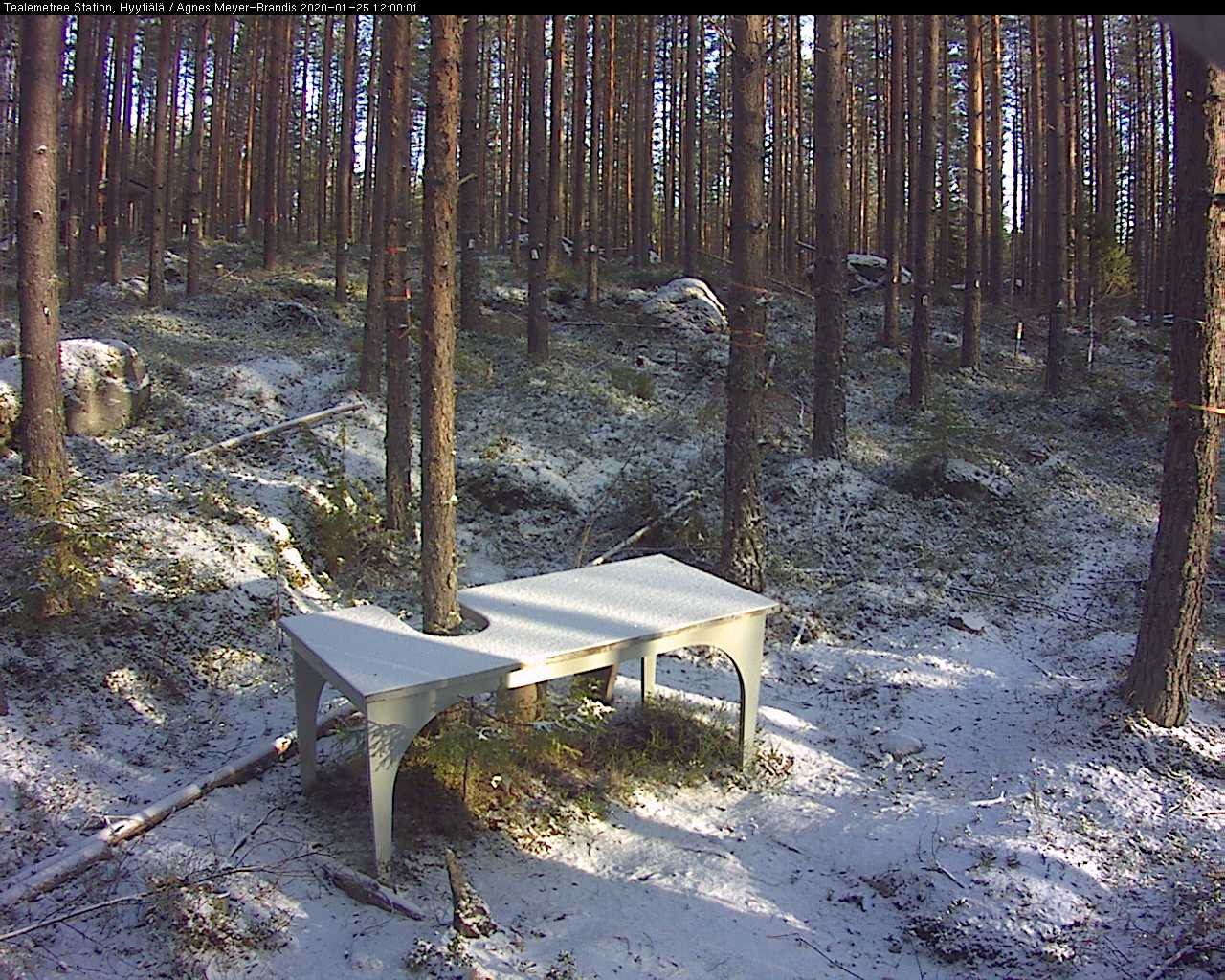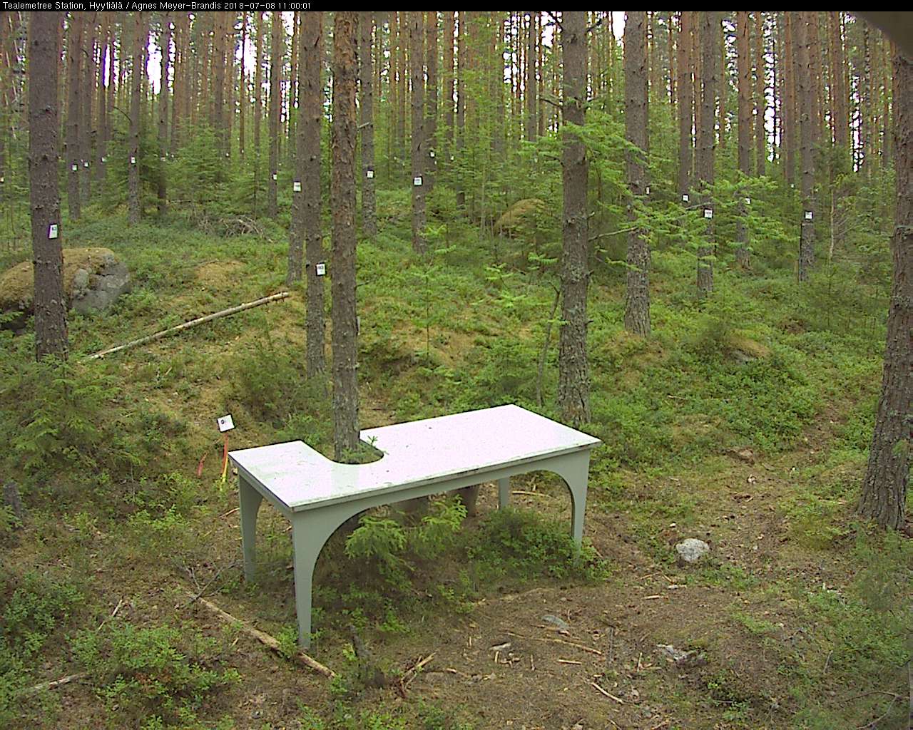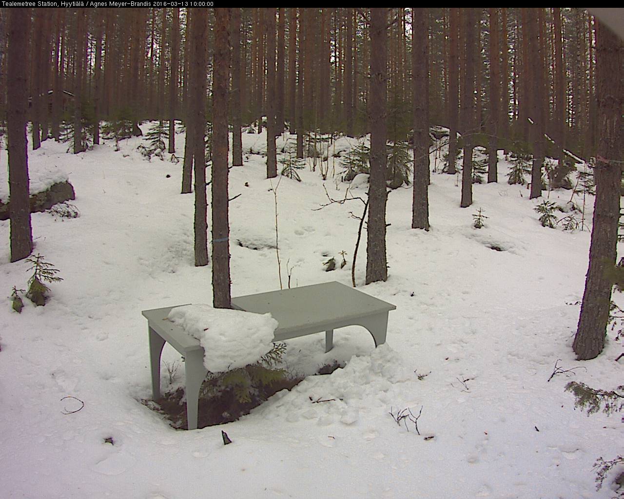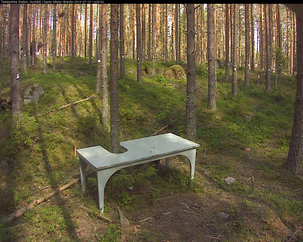 Agnes Meyer-Brandiksen työ Hyytiälässä alkoi tutustumalla aseman muihin tutkijoihin. Pystyäkseen tapaamaan ihmisiä metsässä, hän rakensi pöydän, josta muodostui kohtauspiste ja paikka teehetkille Agneksen ja puun kanssa.