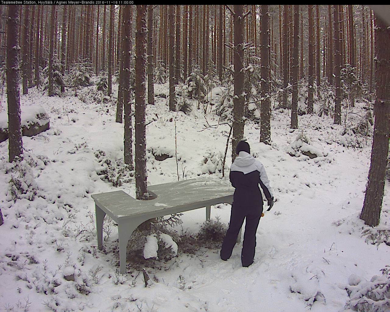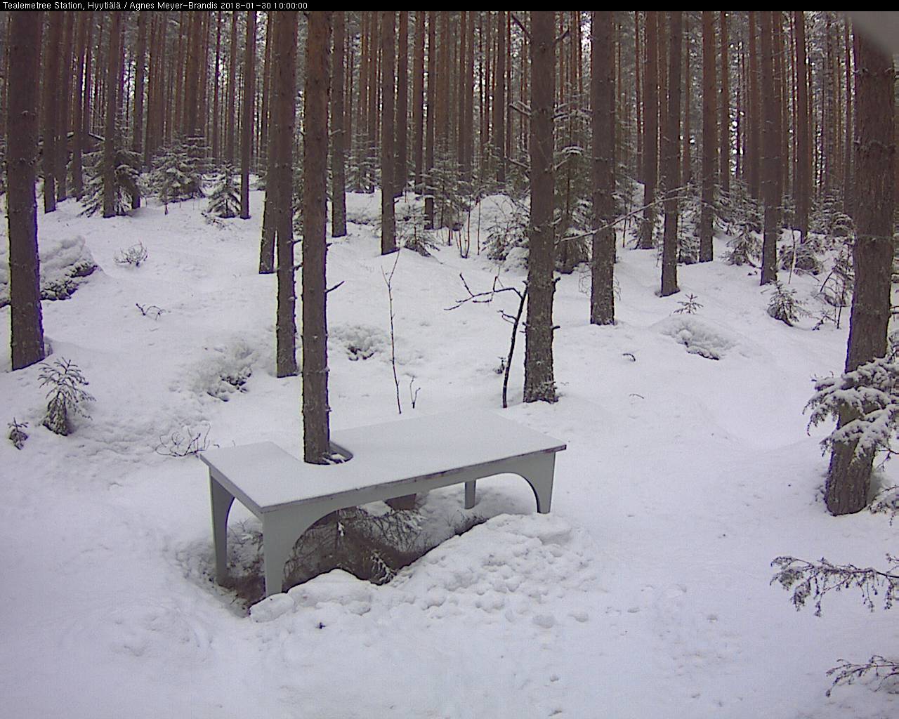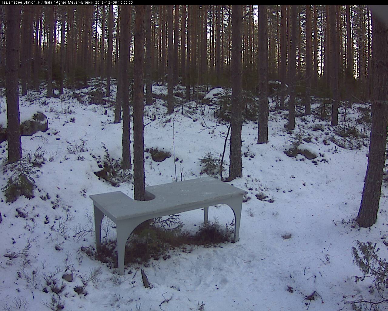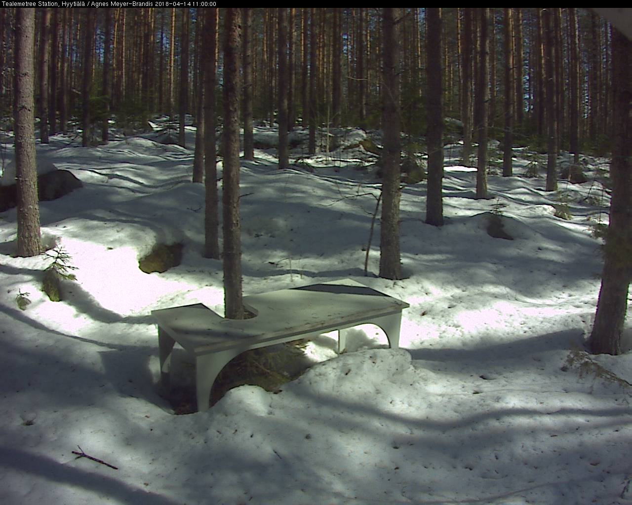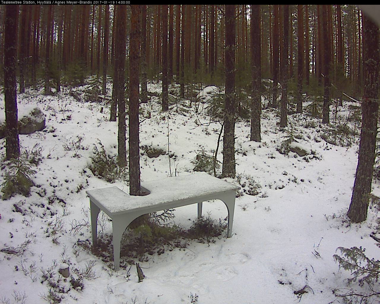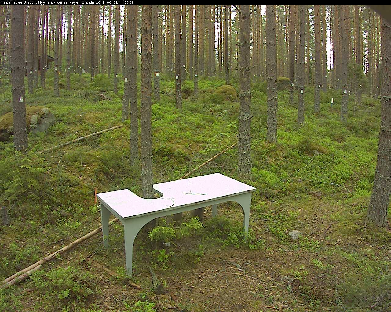 Agnes Meyer-Brandiksen työ Hyytiälässä alkoi tutustumalla aseman muihin tutkijoihin. Pystyäkseen tapaamaan ihmisiä metsässä, hän rakensi pöydän, josta muodostui kohtauspiste ja paikka teehetkille Agneksen ja puun kanssa.
